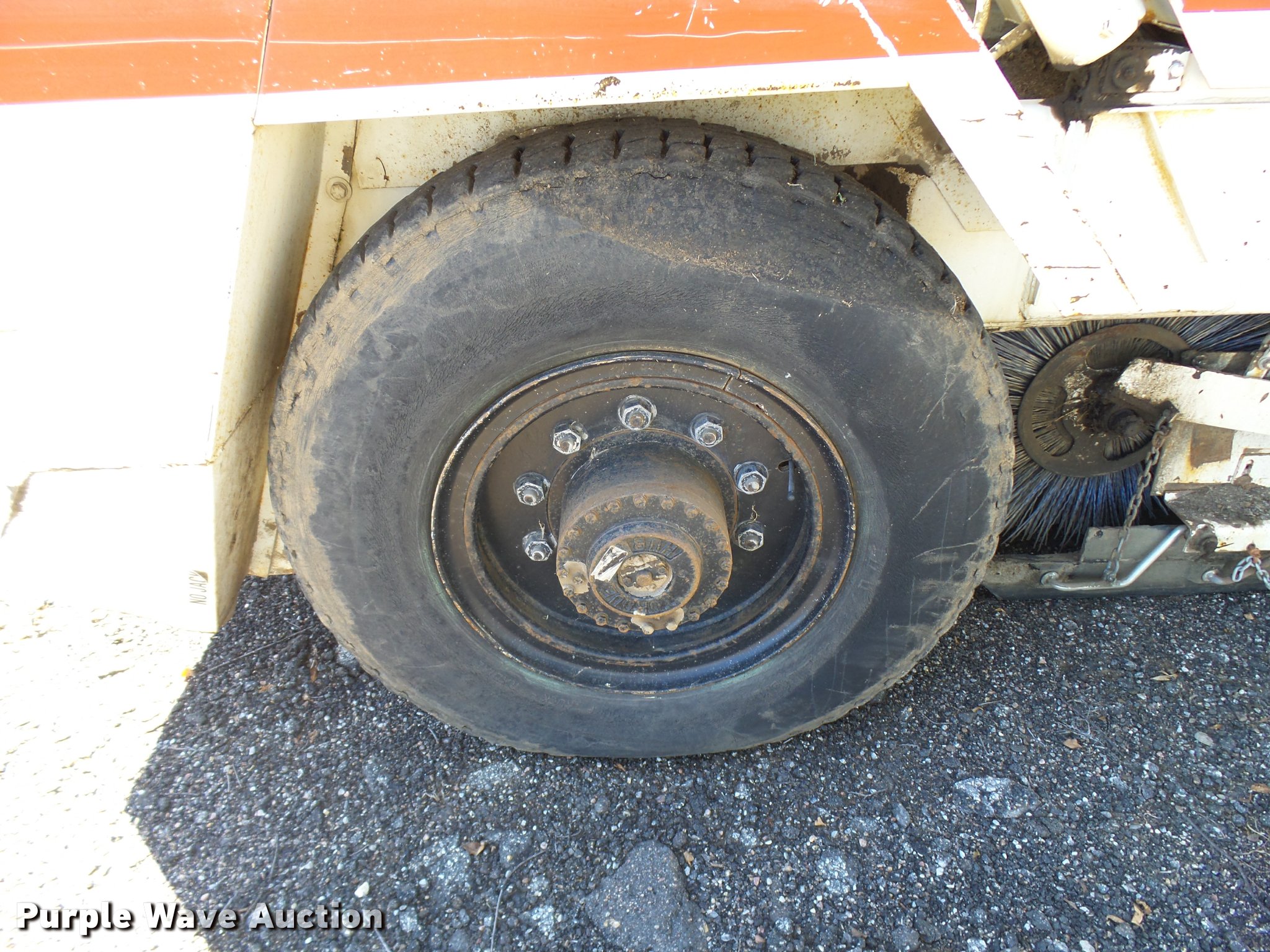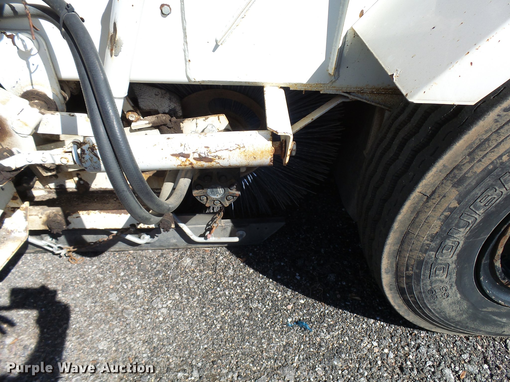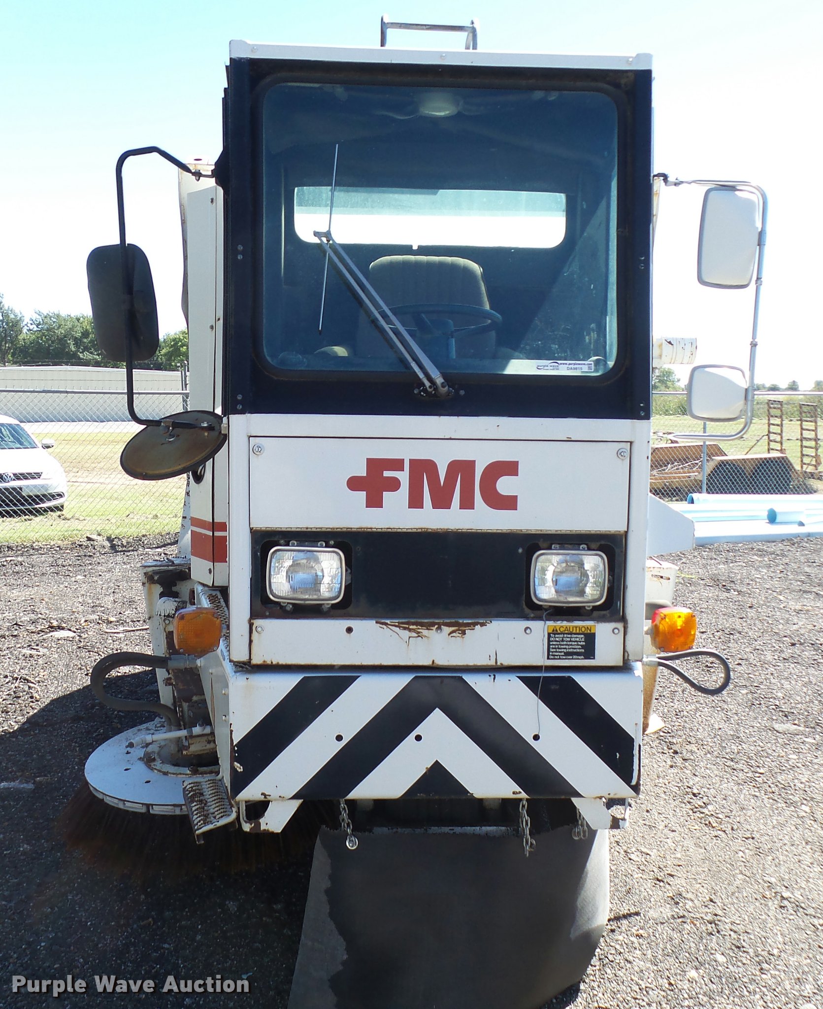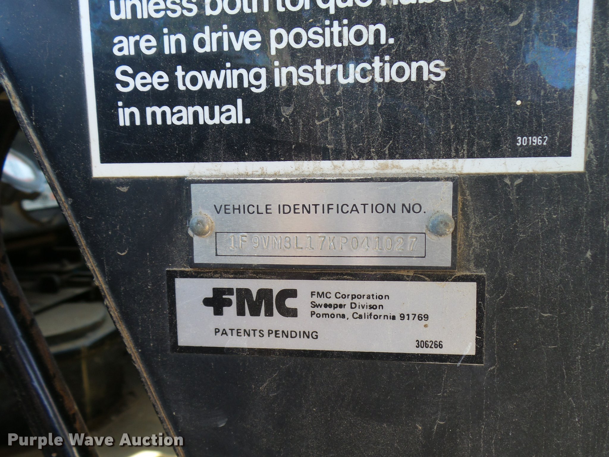 Purple Wave is selling a used Street Sweeper Truck in Kansas. This item is a 1989 FMC Vanguard V3000SP street sweeper with the following: 7,584 miles on odometer, 2,559 hours on meter, General Motors four cylinder diesel engine, Automatic transmission, Main broom, Right gutter broom, Water application, Hydraulic hopper, 10.00R20 tires, Left gutter broom missing, One conveyor paddle missing