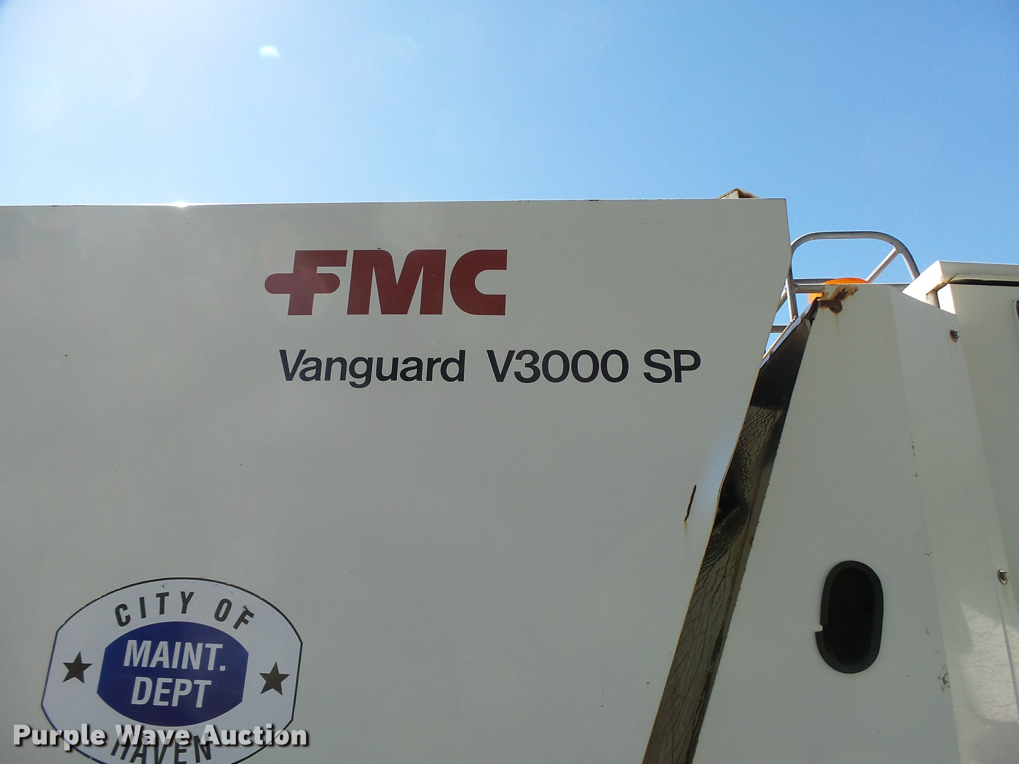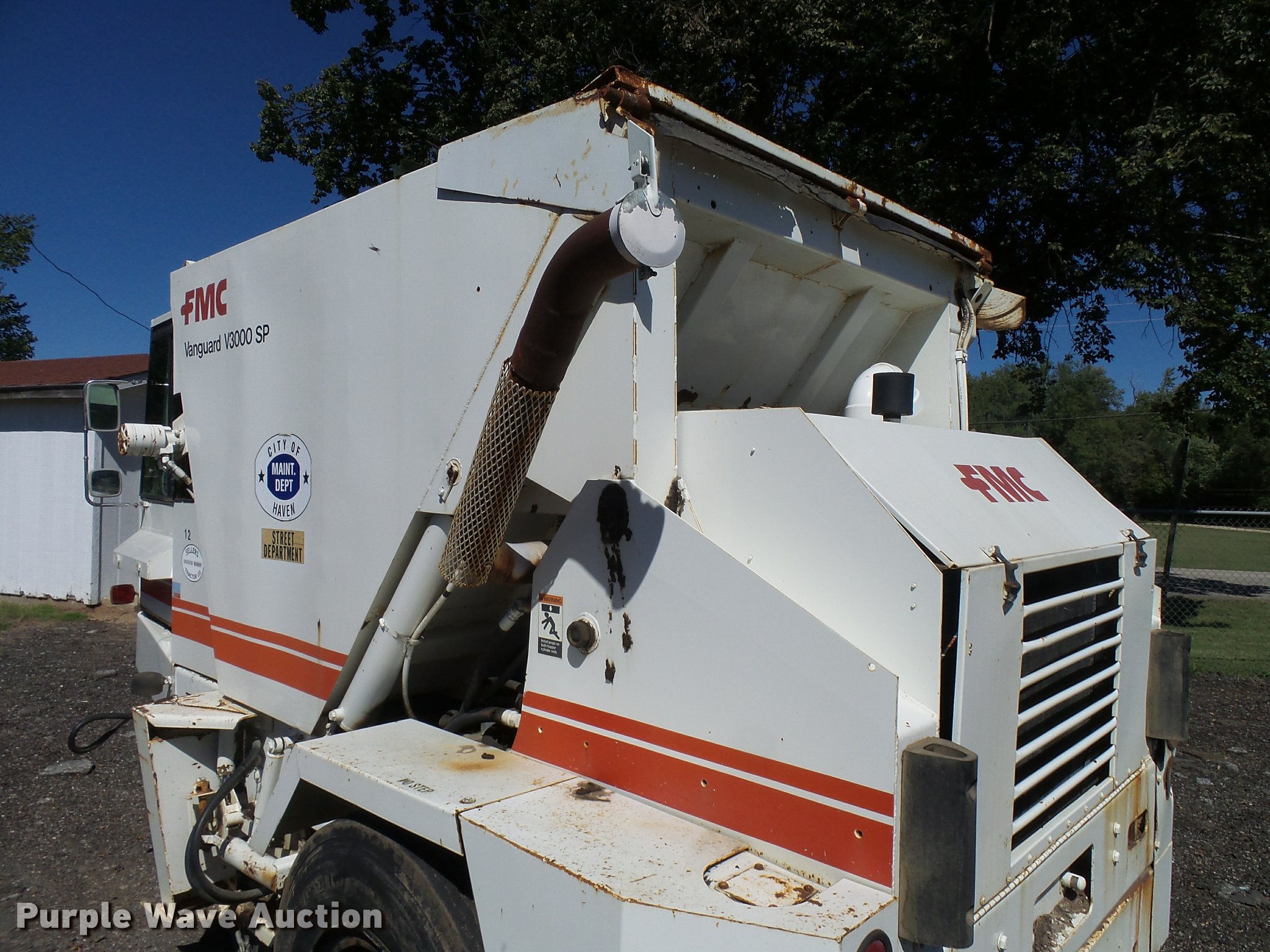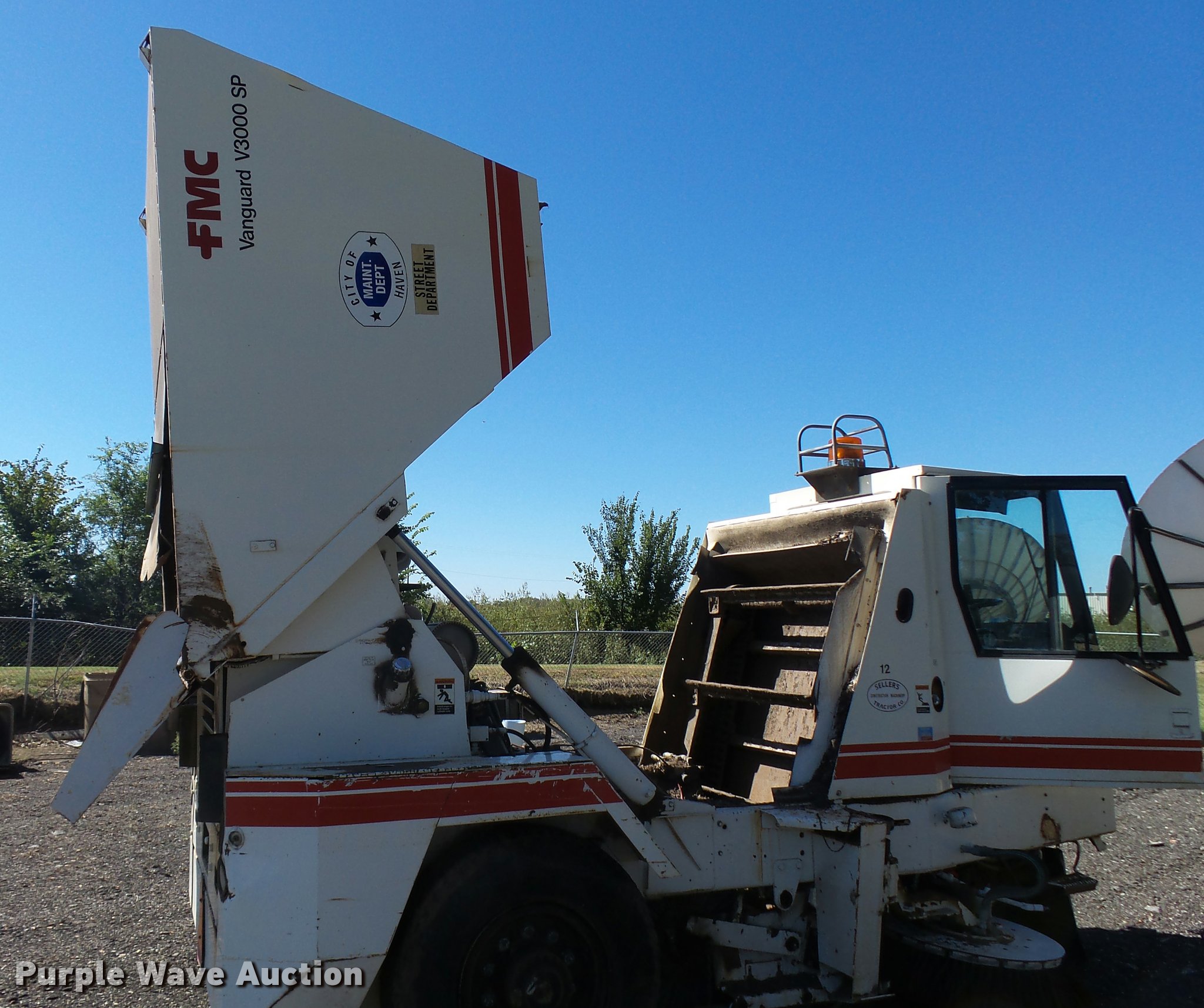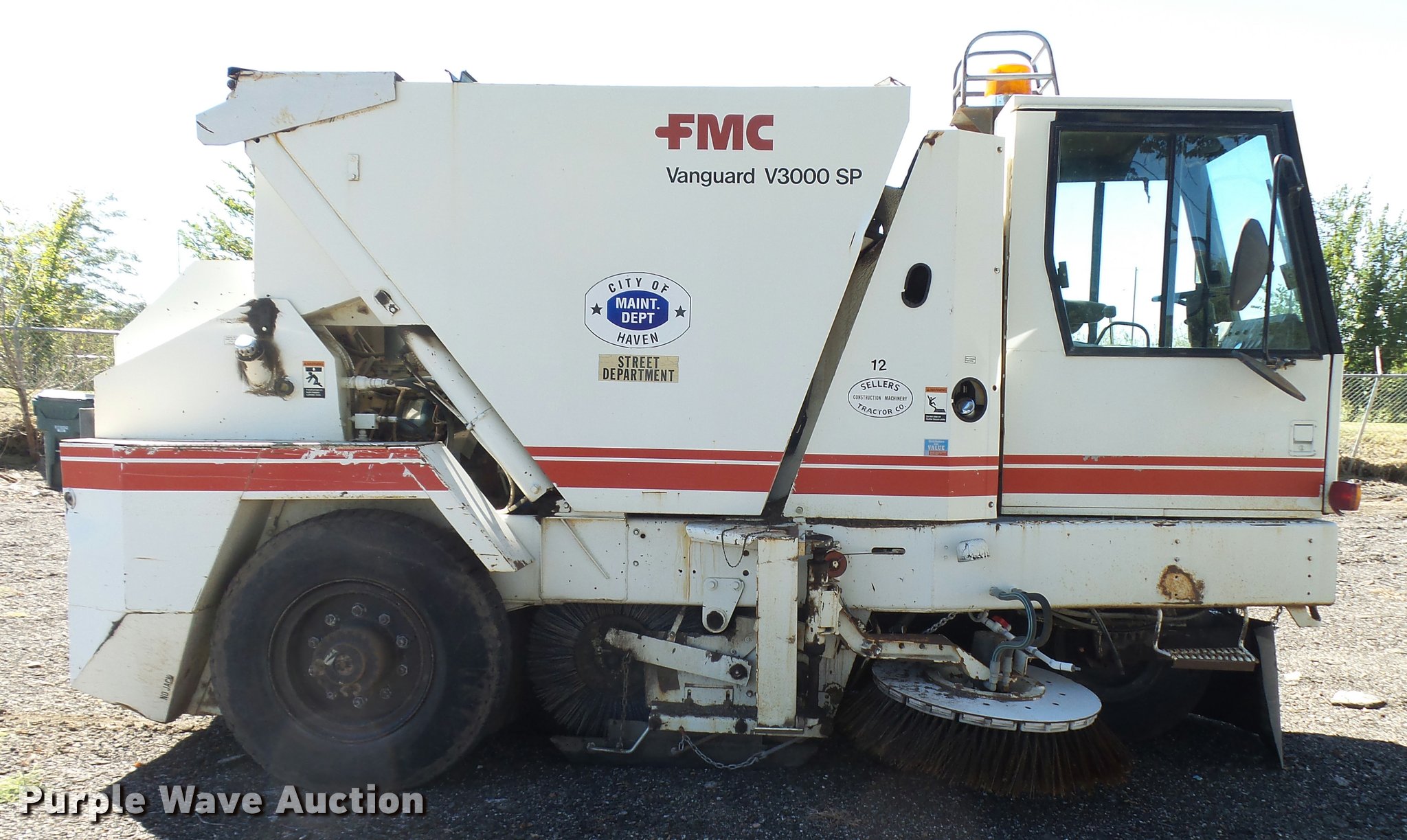 1989 FMC Vanguard V3000SP street sweeper. 7,584 miles on odometer, 2,559 hours on meter, General Motors four cylinder diesel engine, Automatic transmission, Main broom, Right gutter broom, Water application, Hydraulic hopper, 10.00R20 tires, Left gutter broom missing, One conveyor paddle missing. 1F9VM3L17KP041027. City of Haven. 120 S. Kansas. Haven, KS 67543