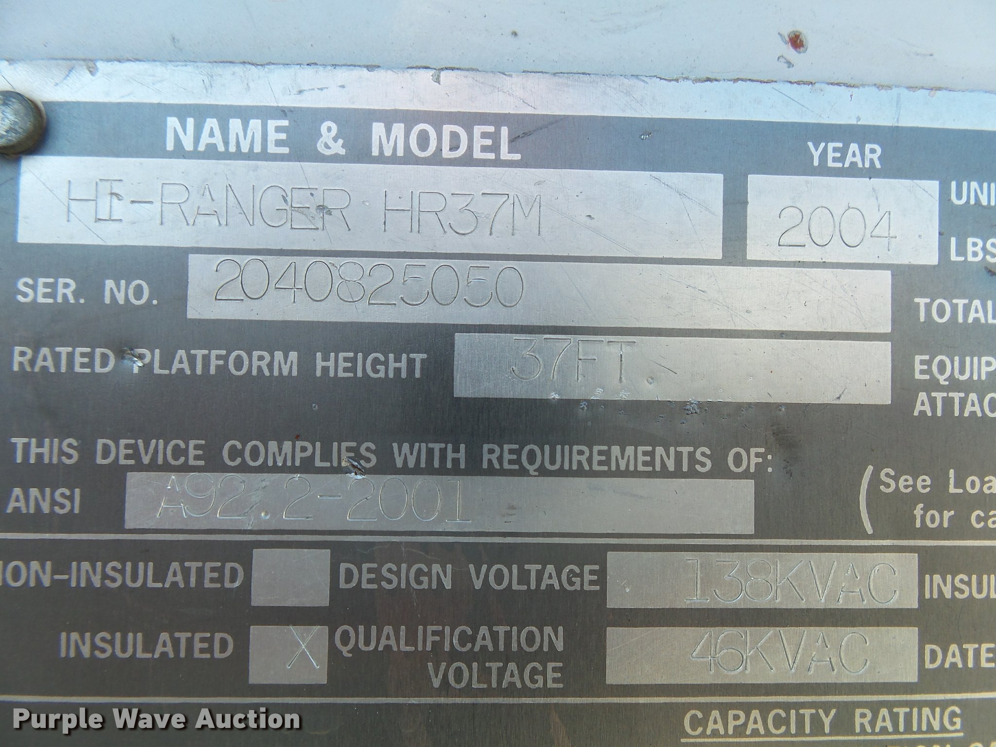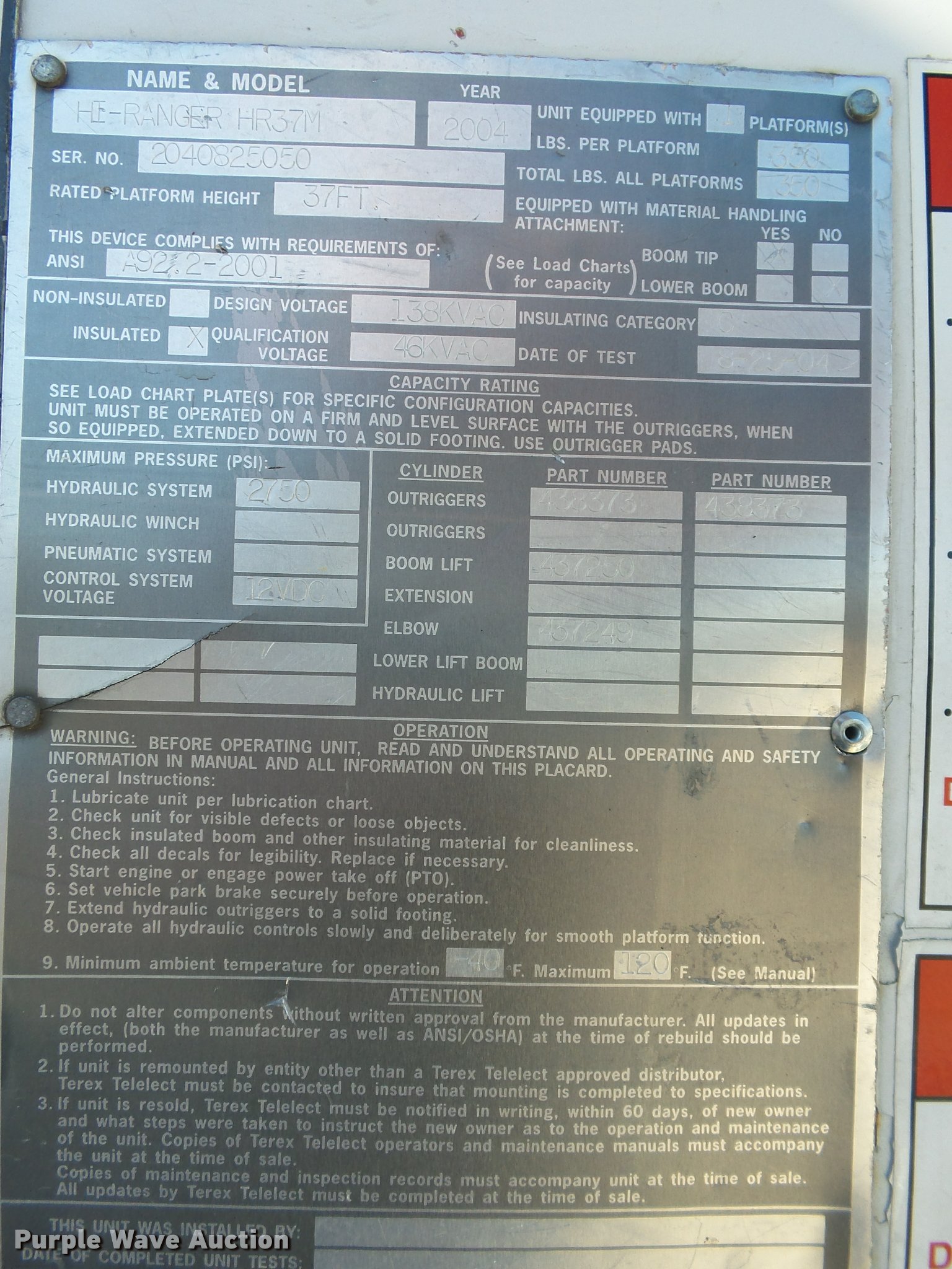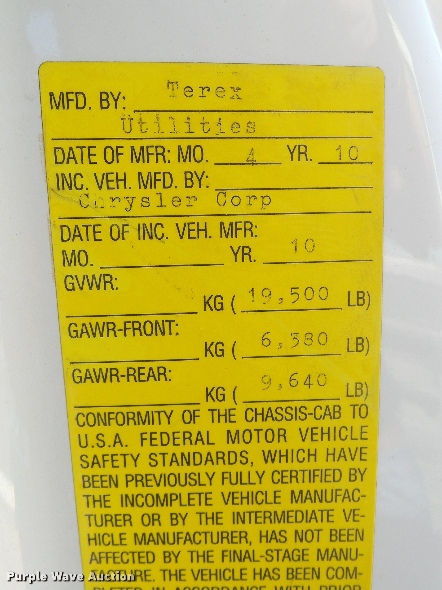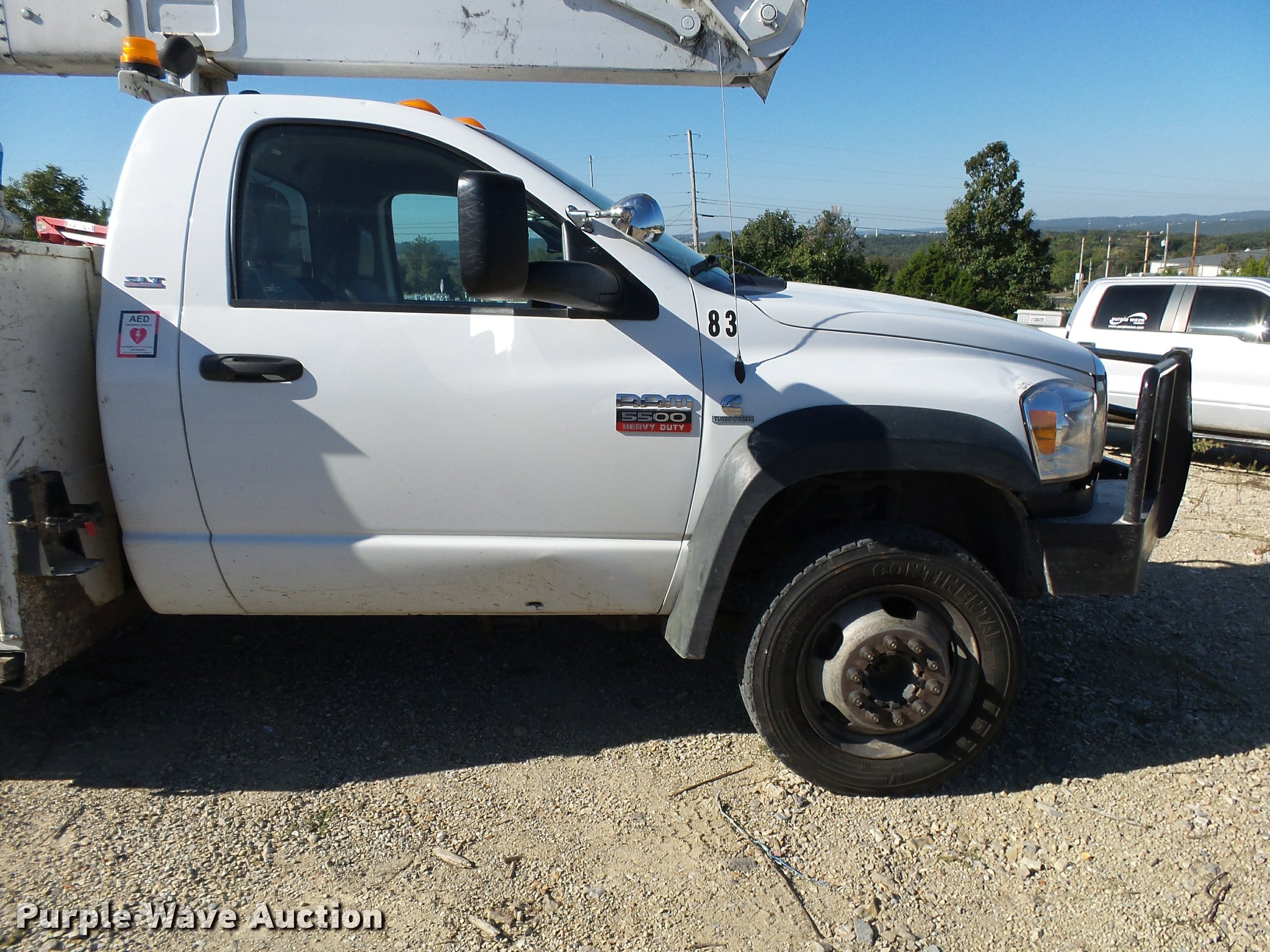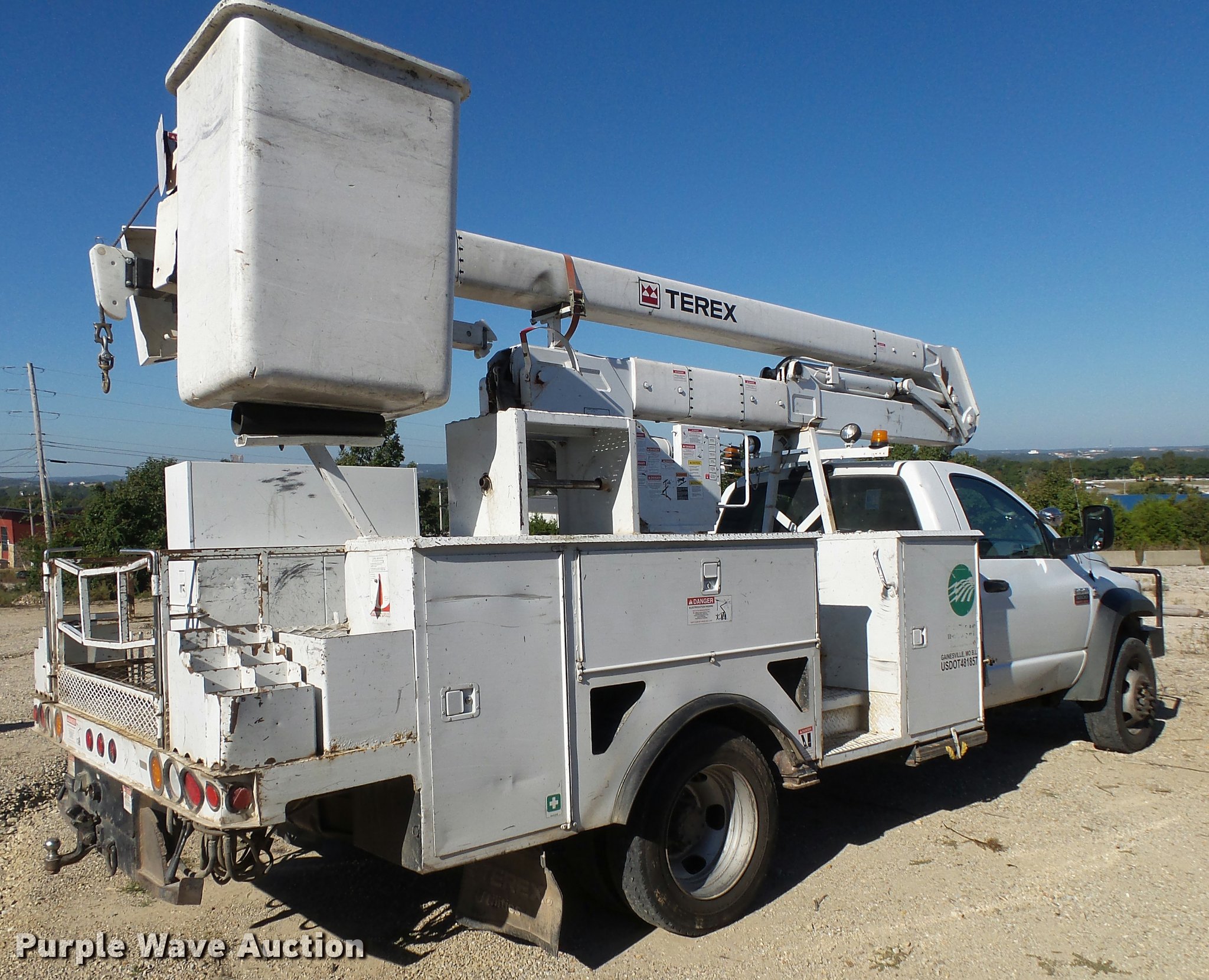Purple Wave is selling a used Bucket Truck in Missouri. This item is a 2010 Dodge Ram 5500 HD bucket truck with the following: 155,697 miles on odometer, Cummins 6.7L L6 turbo diesel engine, Automatic transmission, Four wheel drive, Single axle, AC and heat, AM/FM, Power windows and locks, Spring suspension seat, Trailer brake controller, Beacon light, Backup alarm, Front tow hooks, PTO, Telelect service bed, 13'L, (9) storage compartments, Pintle hitch, Trailer wiring, Serial 1N09836, 2004 Terex Hi Ranger HR37M boom, 24' boom length, 350 lbs maximum lift capacity, 37' maximum lift height, Ground and platform controls, Articulating boom, (2) outriggers, Brush guard, Single fuel tank, Spring suspension, Hydraulic brakes, 225/70R19.5 front tires, Unit# 83