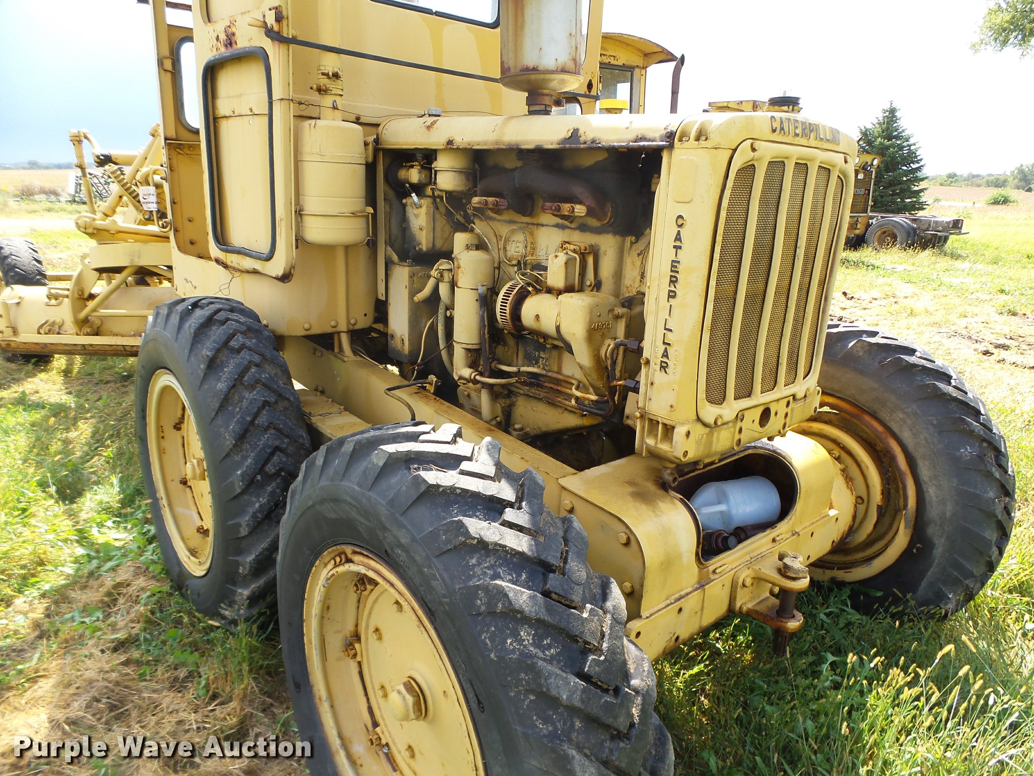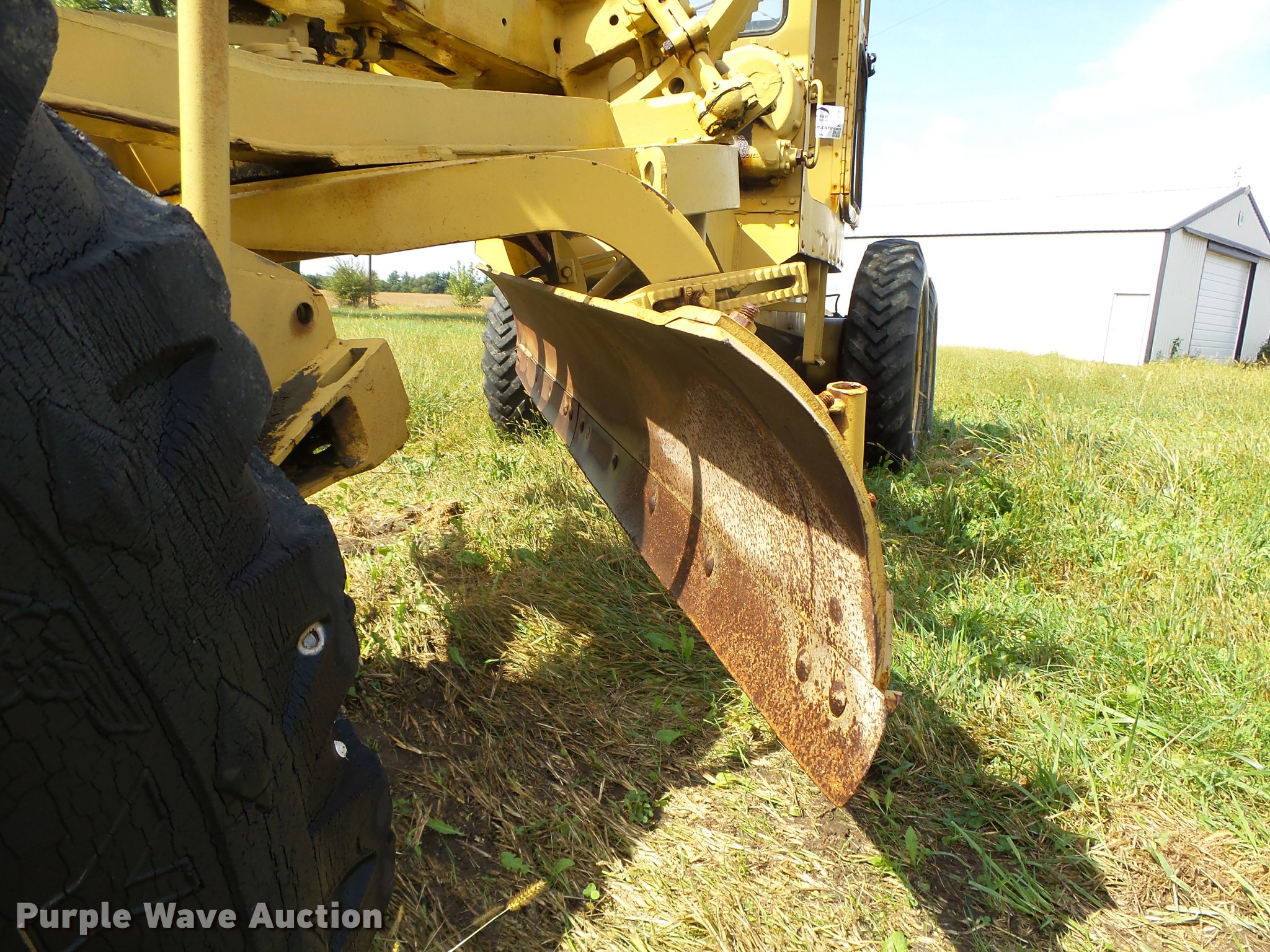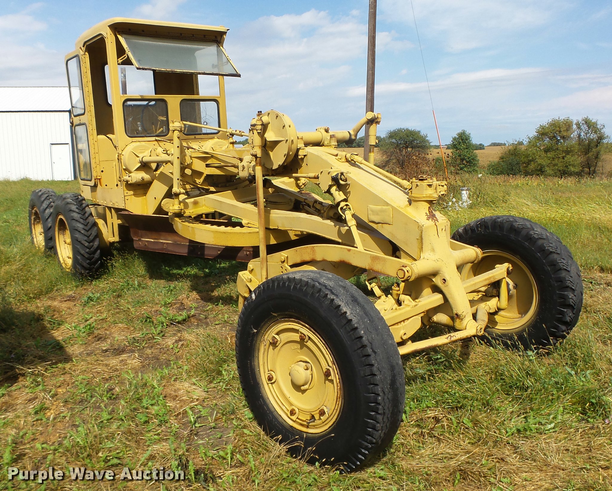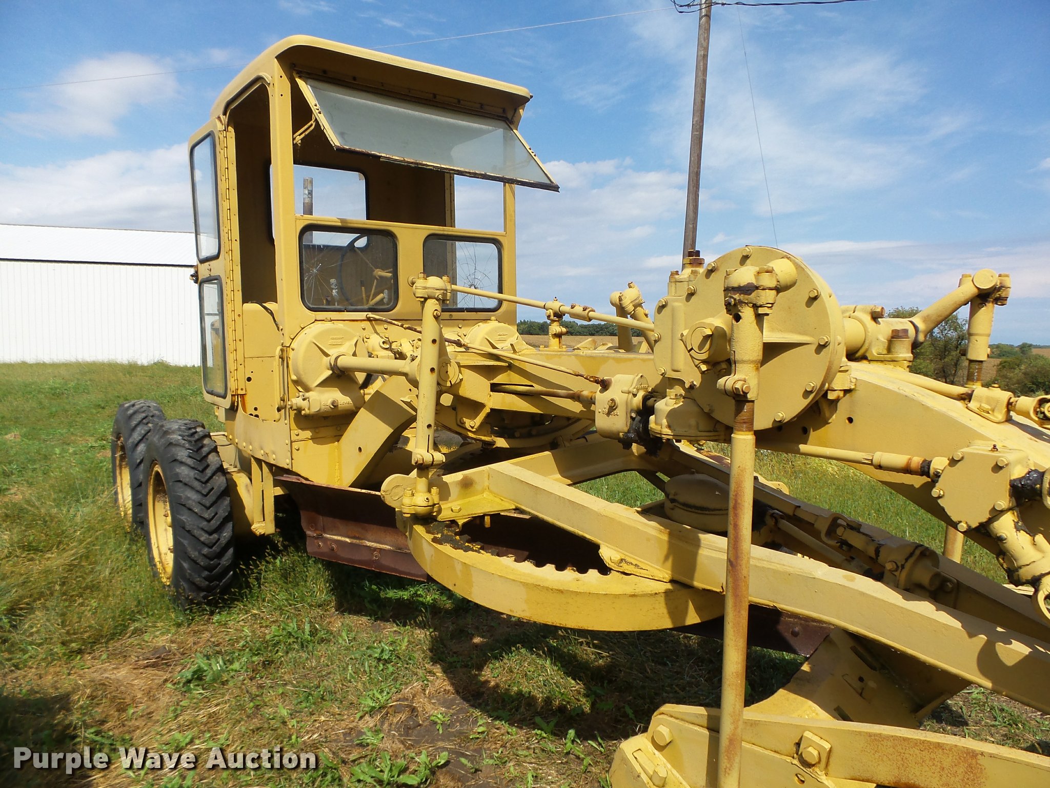 Purple Wave is selling a used Motor Grader in Iowa. This item is a Caterpillar 12 rigid frame motor grader with the following: Caterpillar four cylinder diesel engine, Serial 9T2858, Pony motor, Direct-drive transmission, 6F-2R gears, Enclosed cab, 10'W moldboard, Side shift, Caterpillar mid-mounted scarifier, (2) teeth, Rear draw bar, Two wheel brakes, 10.00-20 front tires, 10.00-24 rear tires, Left side cab door glass missing, Lower front cab glass needs replaced, Serial 9T2858