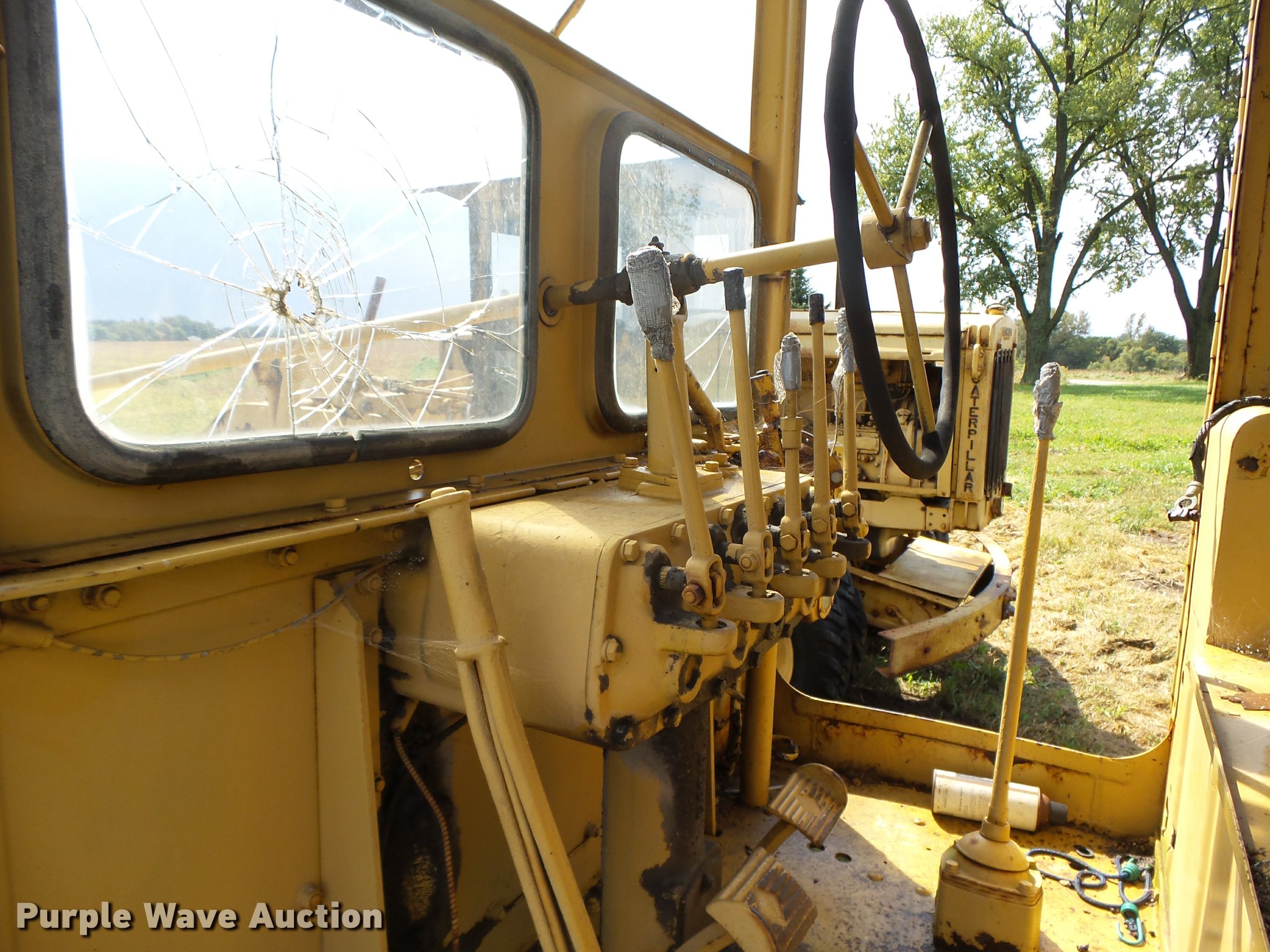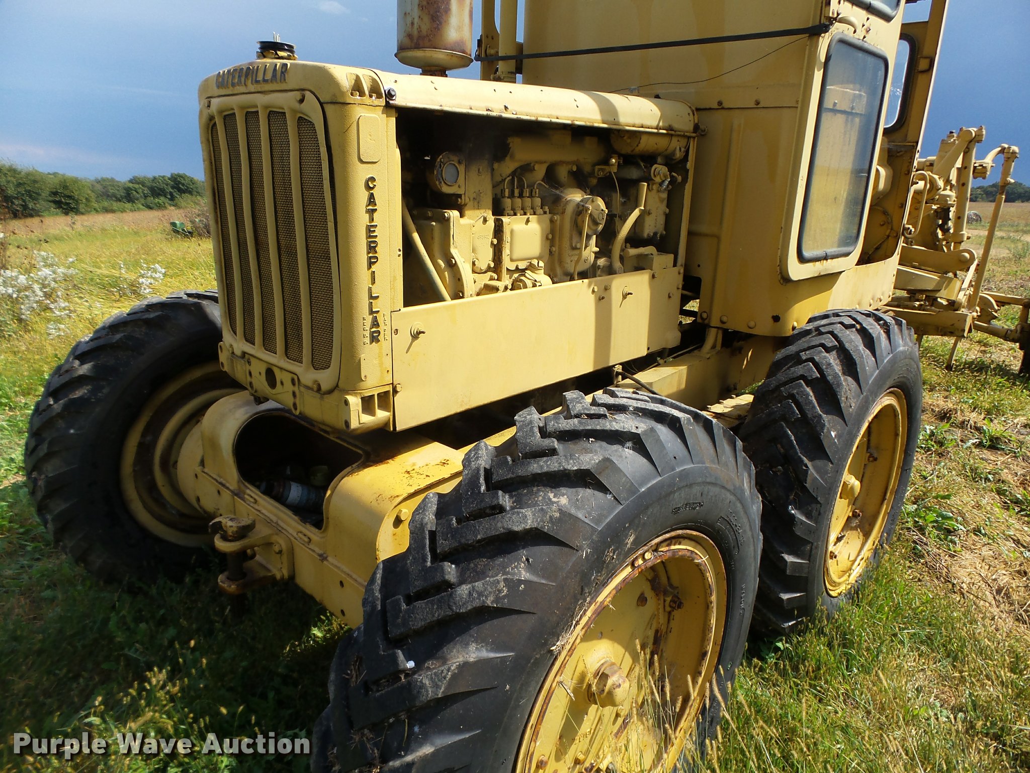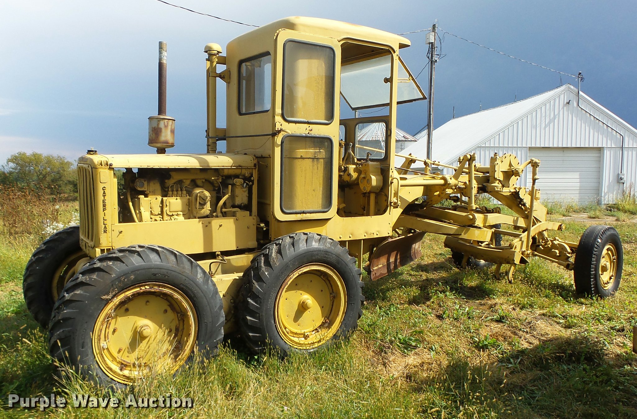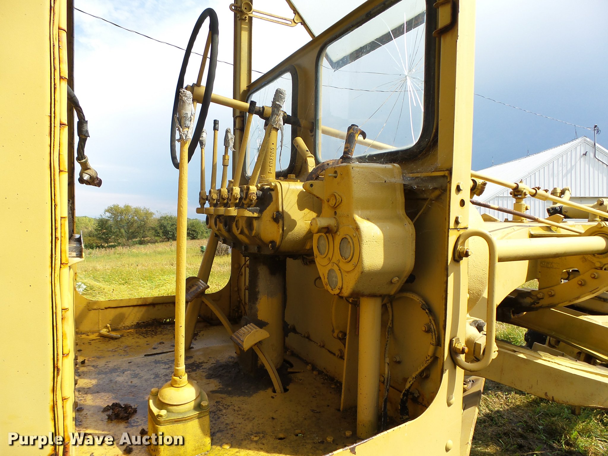 Purple Wave is selling a used Motor Grader in Iowa. This item is a Caterpillar 12 rigid frame motor grader with the following: Caterpillar four cylinder diesel engine, Serial 9T2858, Pony motor, Direct-drive transmission, 6F-2R gears, Enclosed cab, 10'W moldboard, Side shift, Caterpillar mid-mounted scarifier, (2) teeth, Rear draw bar, Two wheel brakes, 10.00-20 front tires, 10.00-24 rear tires, Left side cab door glass missing, Lower front cab glass needs replaced, Serial 9T2858