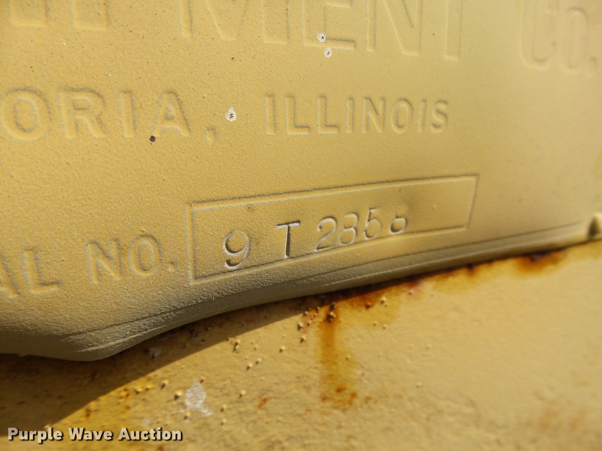 Caterpillar 12 rigid frame motor grader. Caterpillar four cylinder diesel engine Serial 9T2858, Pony motor, Direct-drive transmission 6F-2R gears, Enclosed cab, 10'W moldboard Side shift, Caterpillar mid-mounted scarifier (2) teeth, Rear draw bar, Two wheel brakes, 10.00-20 front tires, 10.00-24 rear tires, Left side cab door glass missing, Lower front cab glass needs replaced, Serial 9T2858. Clinton, IA 52732