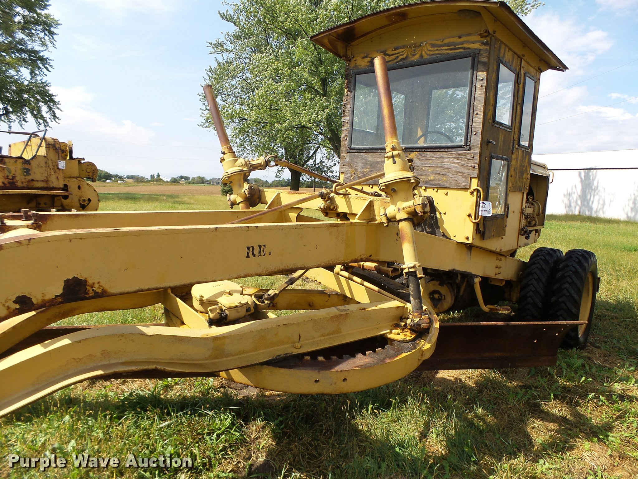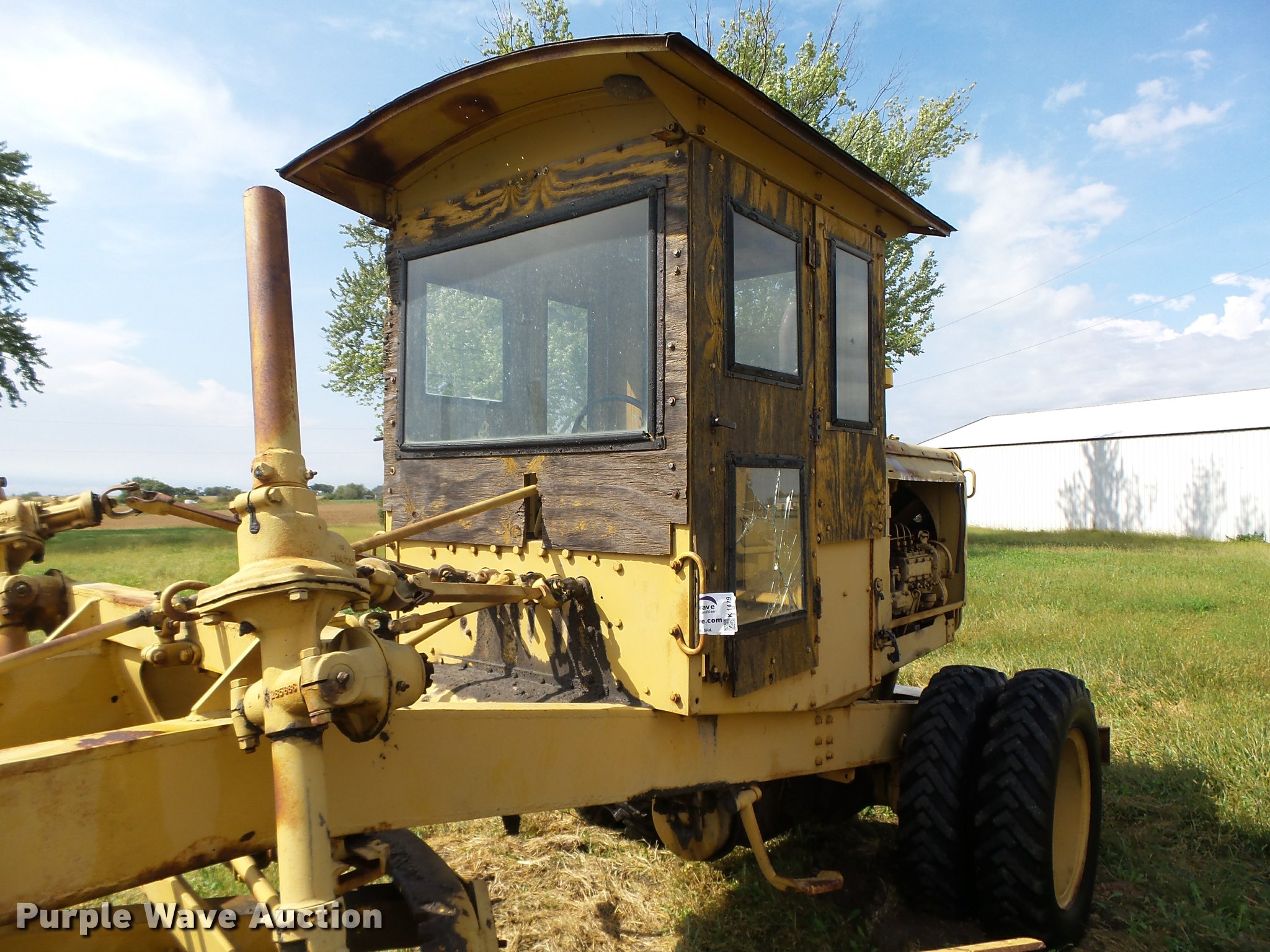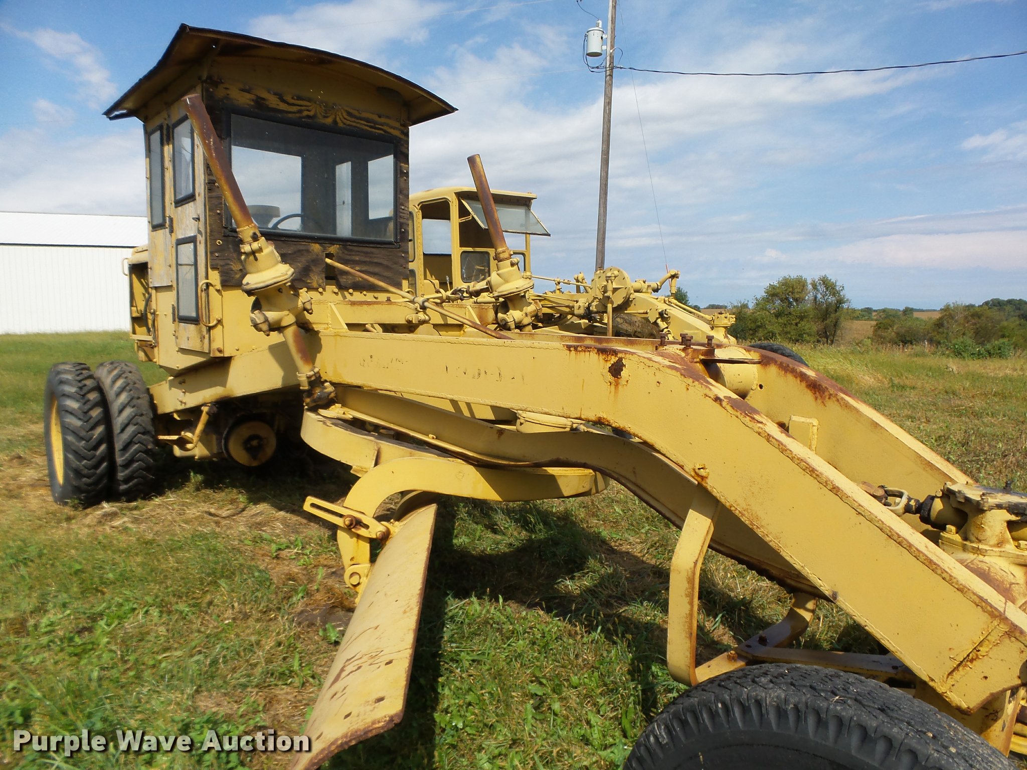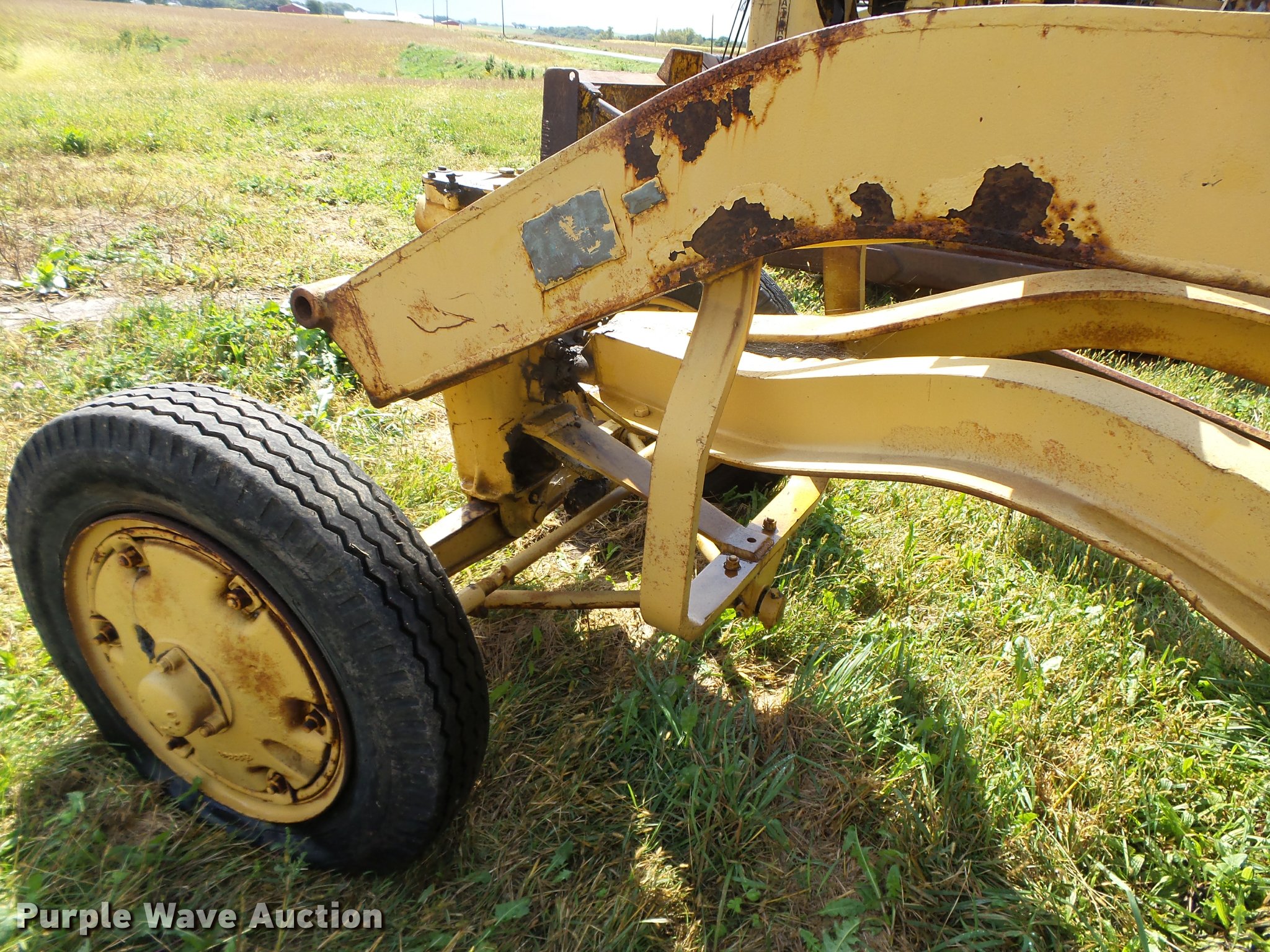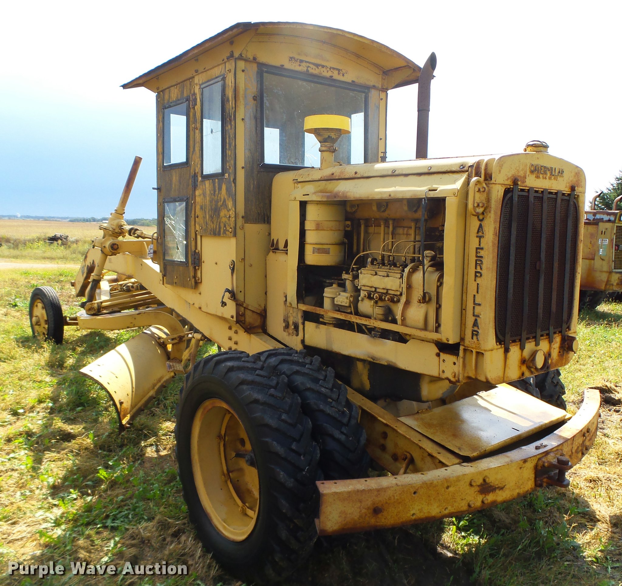 Purple Wave is selling a used Motor Grader in Iowa. This item is a Caterpillar rigid frame motor grader with the following: Caterpillar three cylinder diesel engine, Direct-drive transmission, 4F-1R gears, Enclosed cab, Steel frame with wood enclosure, 14'W moldboard, Side shift, 7.00-20 front tires, 10.00-24 dual rear tires, Left and right side cab door glass cracked, Must be pull started, Serial 78837