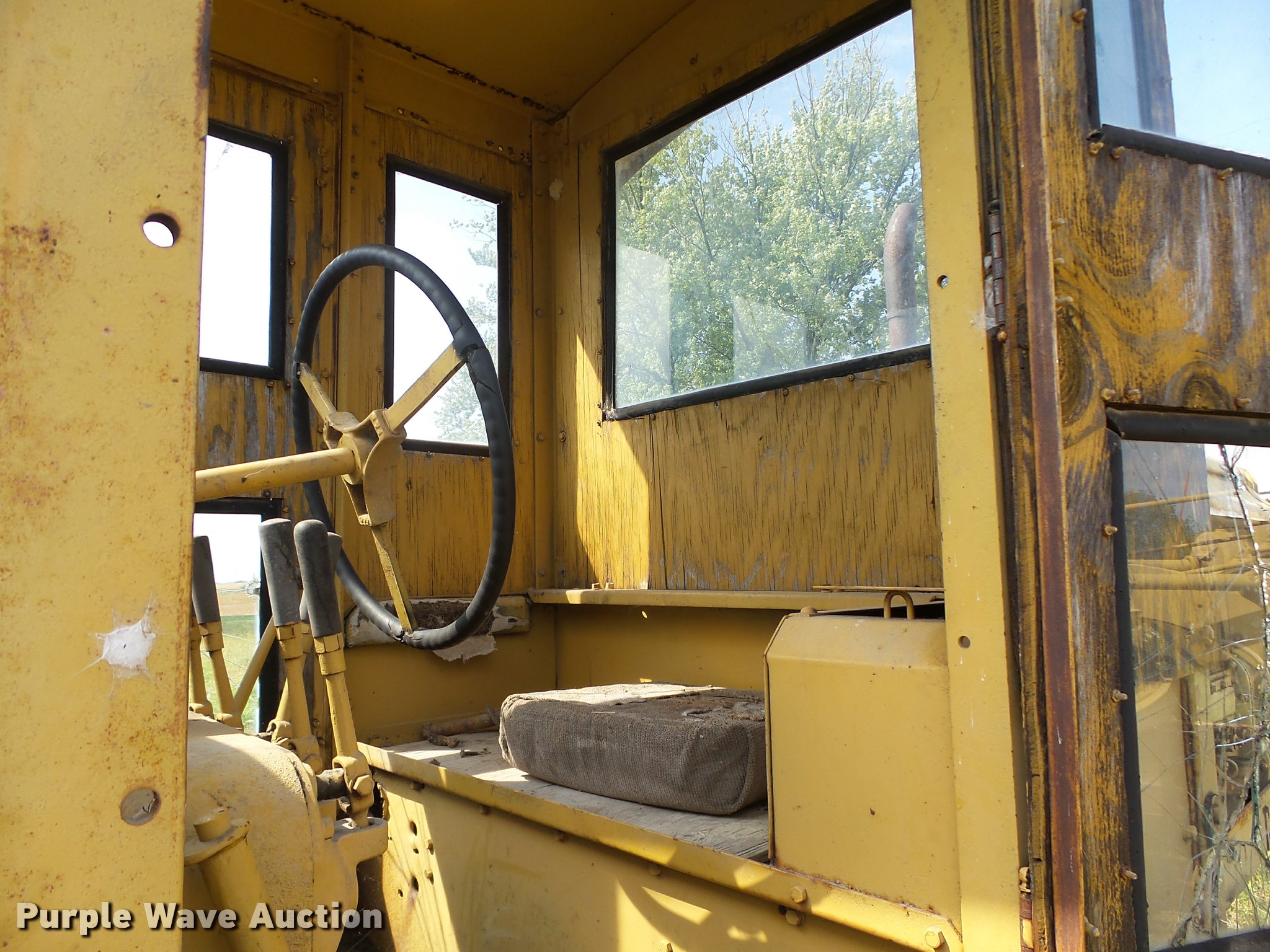 Caterpillar rigid frame motor grader. Caterpillar three cylinder diesel engine, Direct-drive transmission 4F-1R gears, Enclosed cab Steel frame with wood enclosure, 14'W moldboard Side shift, 7.00-20 front tires, 10.00-24 dual rear tires, Left and right side cab door glass cracked, Must be pull started, Serial 78837. Clinton, IA 52732