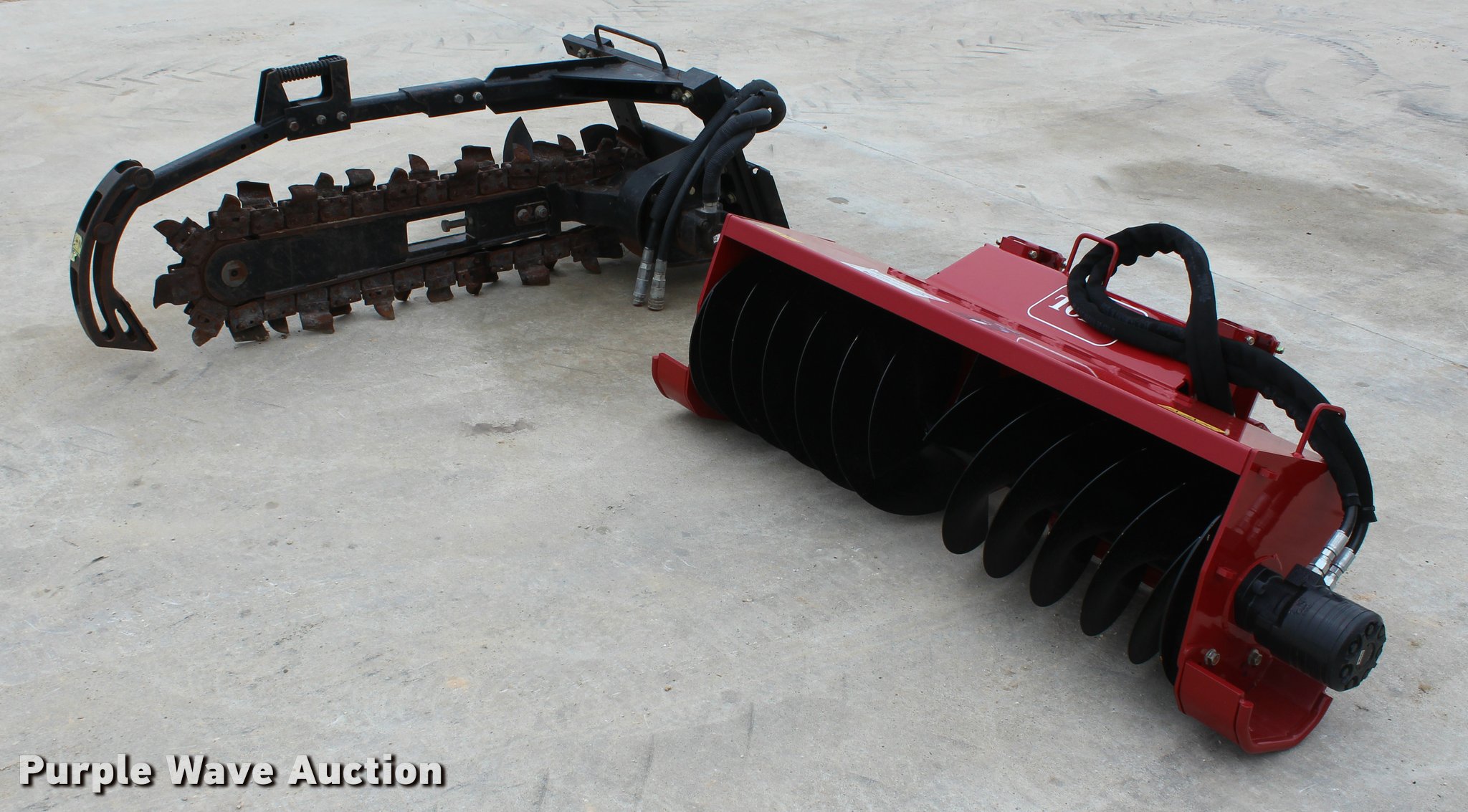 Purple Wave is selling a used Skid Steer Attach. in Texas. This item is a Trencher attachments with the following: 3'L boom, Serial 22474-314000175, Toro trench filler, 4'W, Serial 22472-314000113, Unused