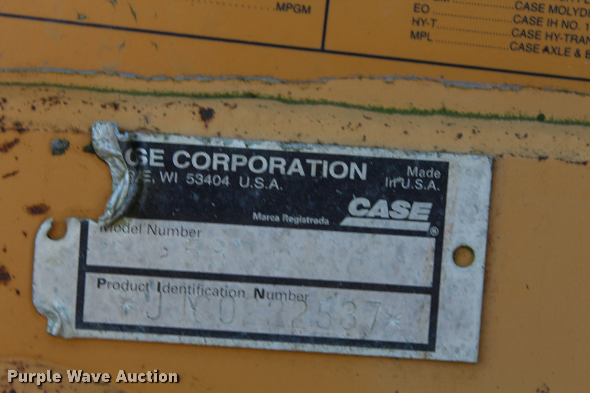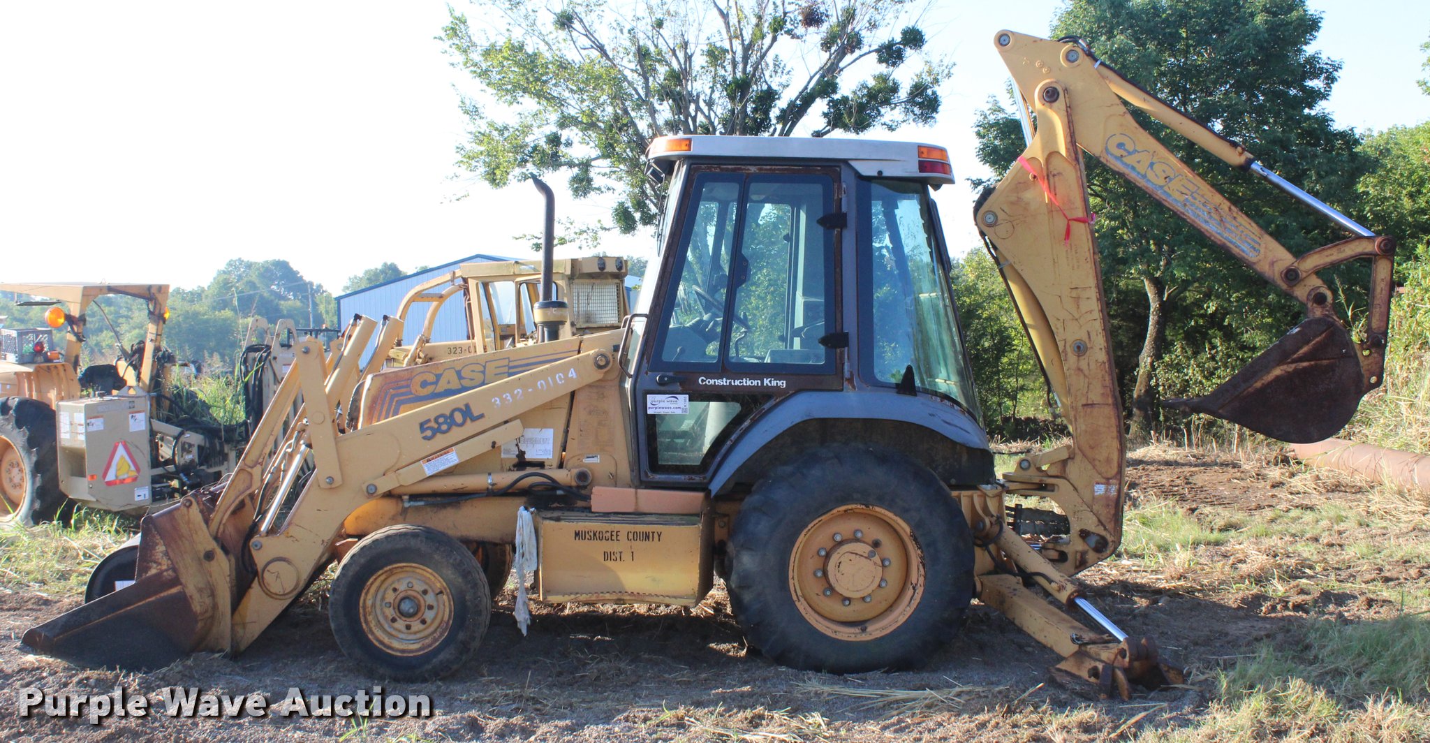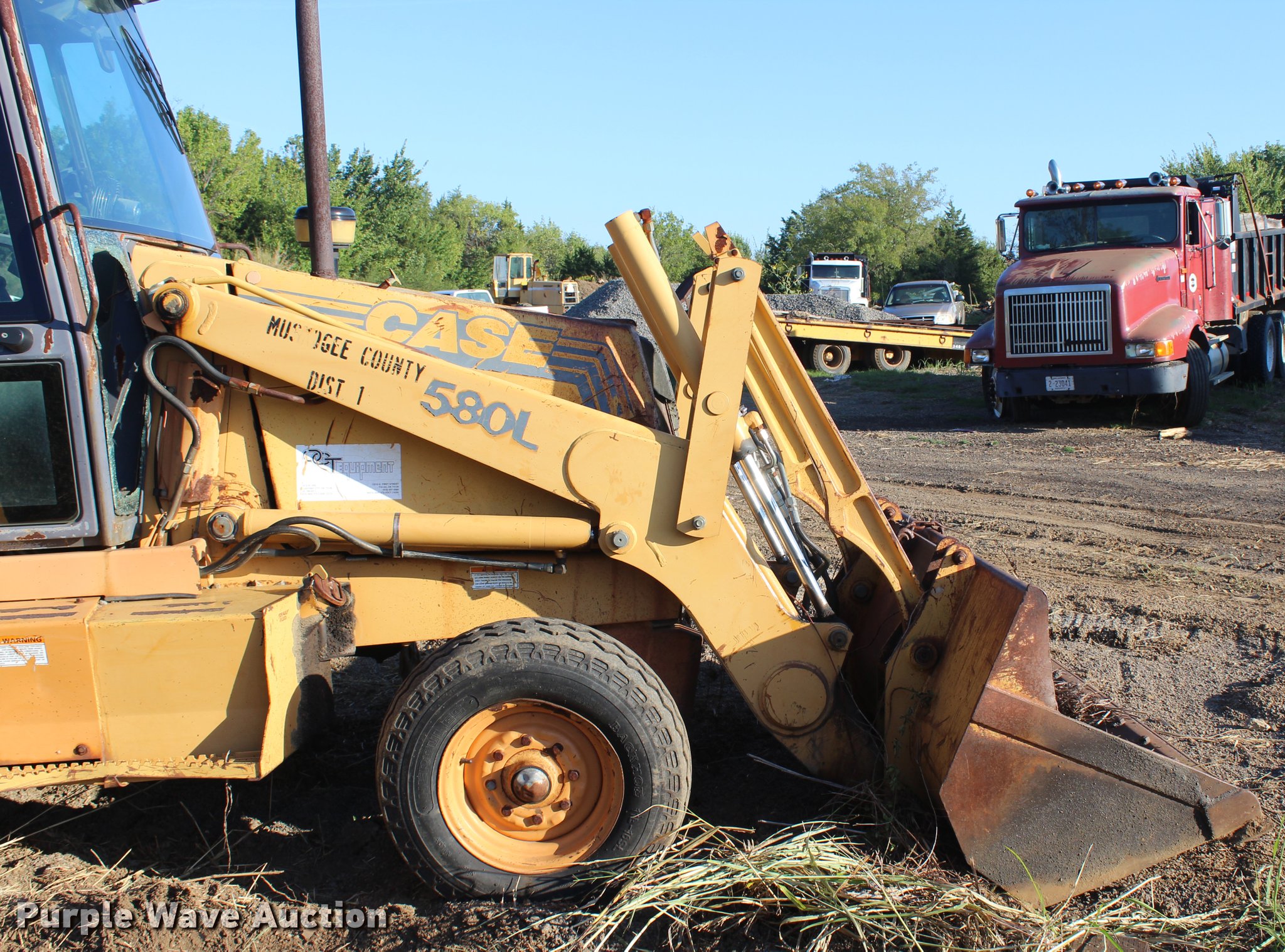 Case 580L backhoe. 4,266 hours on meter, Four cylinder diesel engine, Powershift transmission 4F-4R, EROPS, AC and heat, Three stick backhoe controls, Front and rear work lights, 80"W loader bucket Bolt-on cutting edge, 24"W backhoe bucket (5) teeth, 11L-16 front tires, 17.5-24 rear tires, Unknown operating condition, Glass broken and missing, Rust, Serial J1G0222537. Muskogee County D1. 3000 North Street. Muskogee, OK 74403