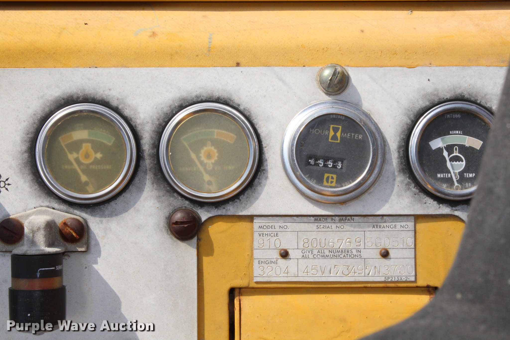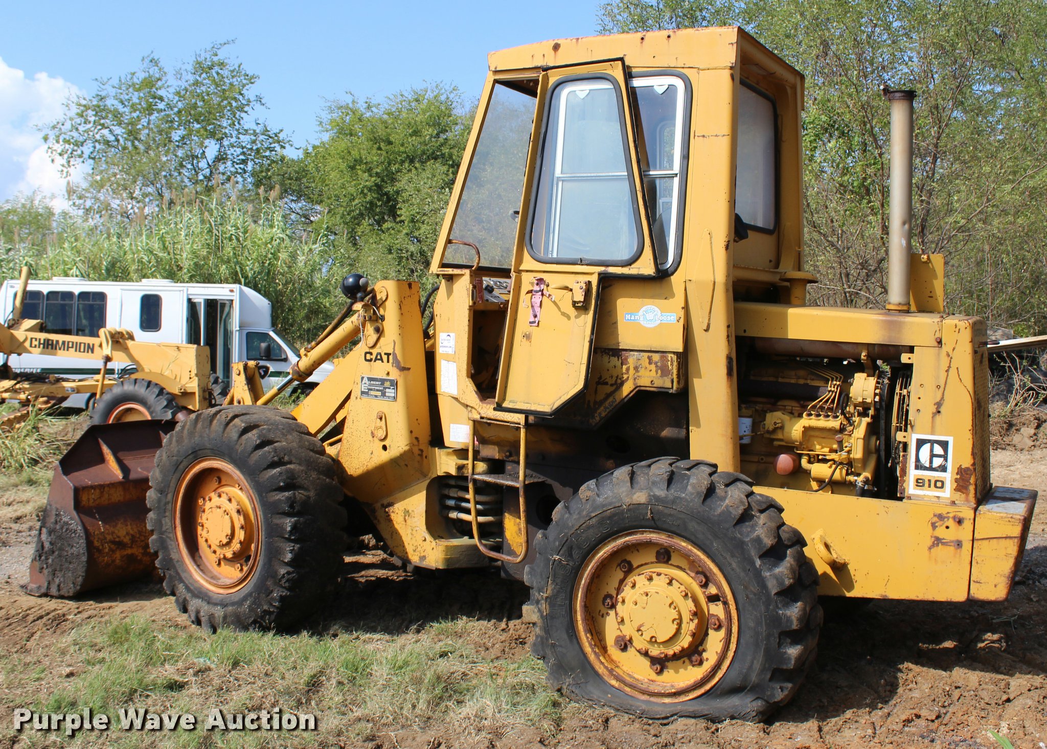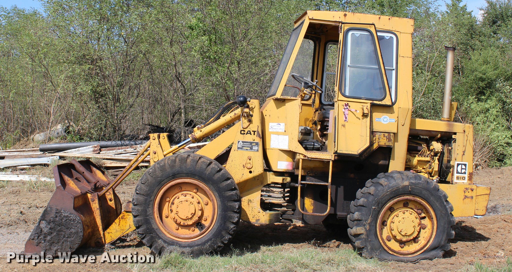 Purple Wave is selling a used Wheel Loader in Oklahoma. This item is a 1978 Caterpillar 910 wheel loader with the following: 4,553 hours on meter, Caterpillar 3204D-1 four cylinder diesel engine, Serial 7N3700, Powershift transmission, 3F-1R gears, EROPS, Suspension seat, Front work lights, Joystick loader control, 81"W general purpose bucket, Model 6S8657X, Weld-on cutting edge, 15.5-25 tires, Unknown operating condition, Glass broken and cracked, Door hinge broken, Serial 80U6769