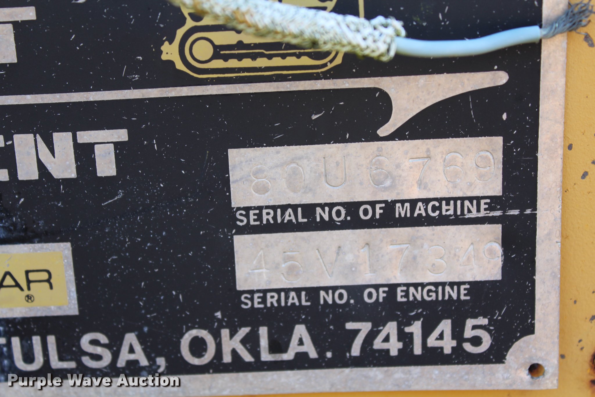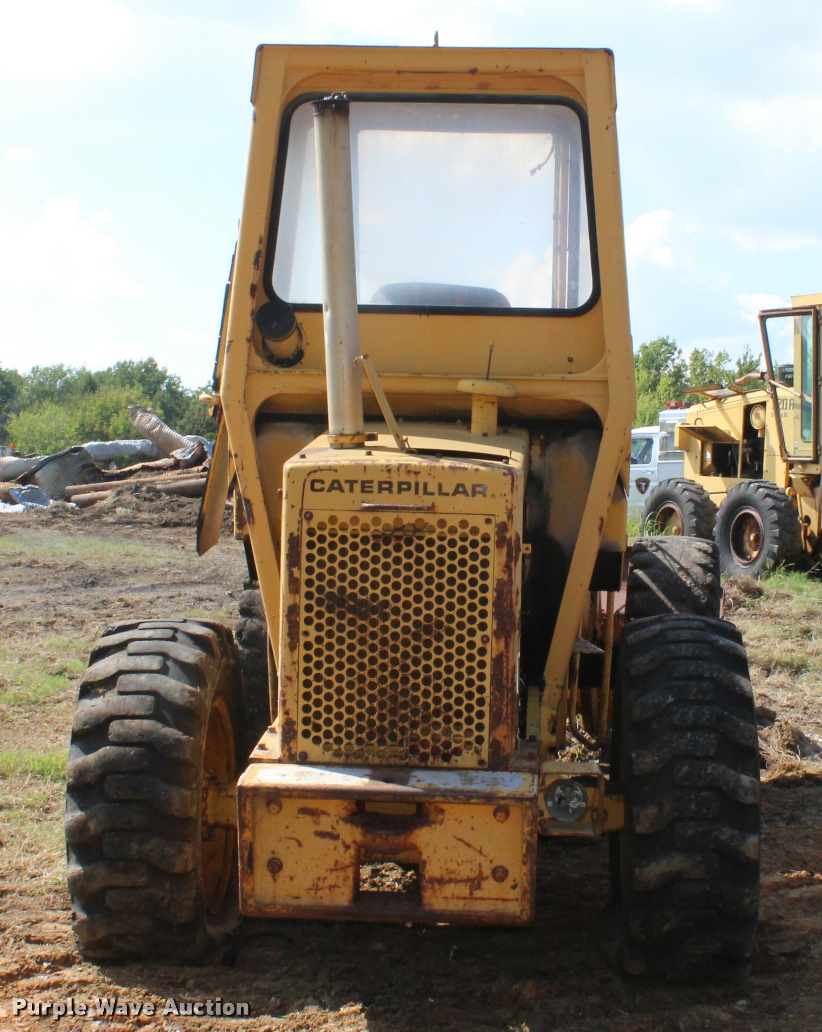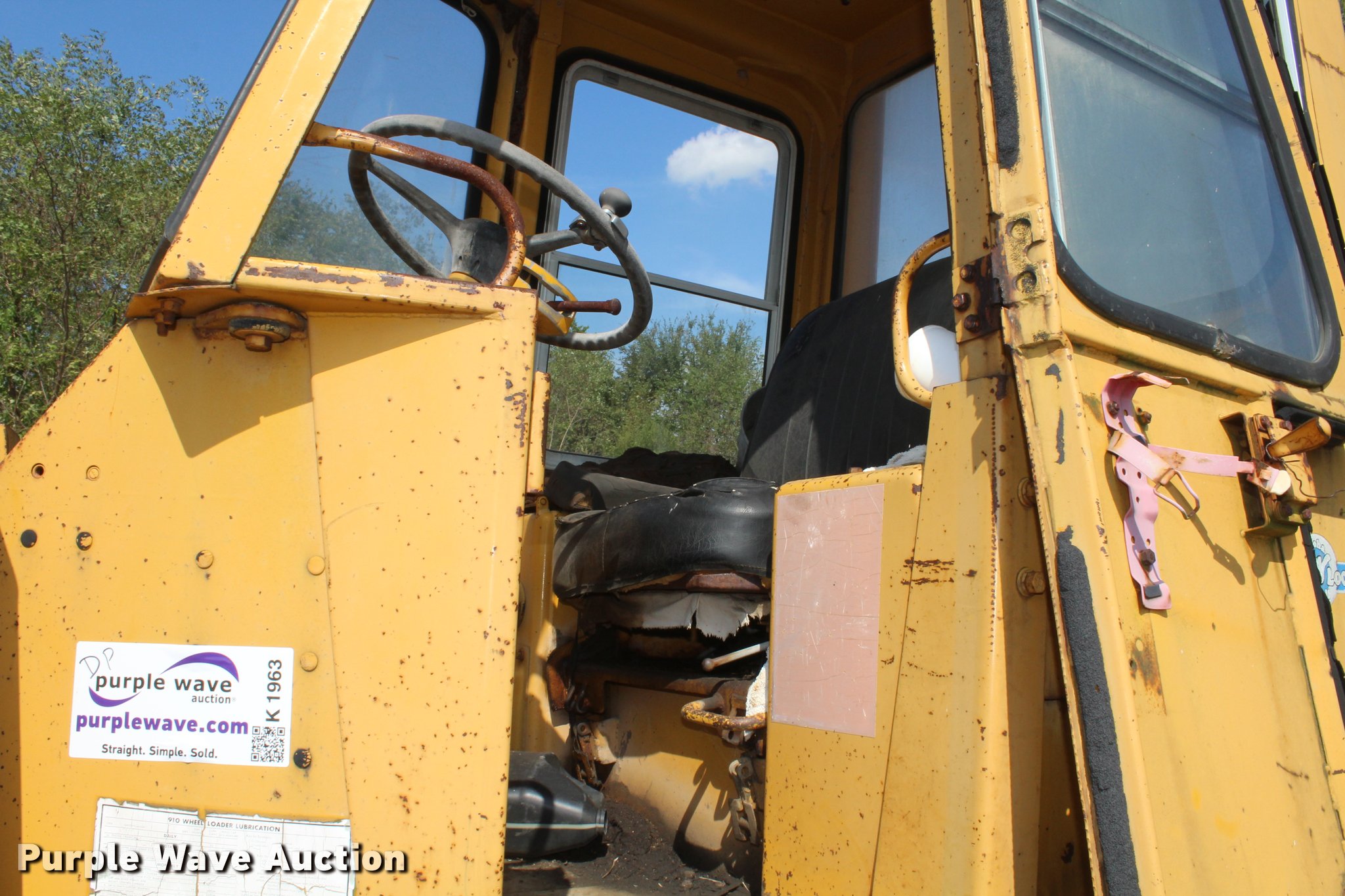 Purple Wave is selling a used Wheel Loader in Oklahoma. This item is a 1978 Caterpillar 910 wheel loader with the following: 4,553 hours on meter, Caterpillar 3204D-1 four cylinder diesel engine, Serial 7N3700, Powershift transmission, 3F-1R gears, EROPS, Suspension seat, Front work lights, Joystick loader control, 81"W general purpose bucket, Model 6S8657X, Weld-on cutting edge, 15.5-25 tires, Unknown operating condition, Glass broken and cracked, Door hinge broken, Serial 80U6769