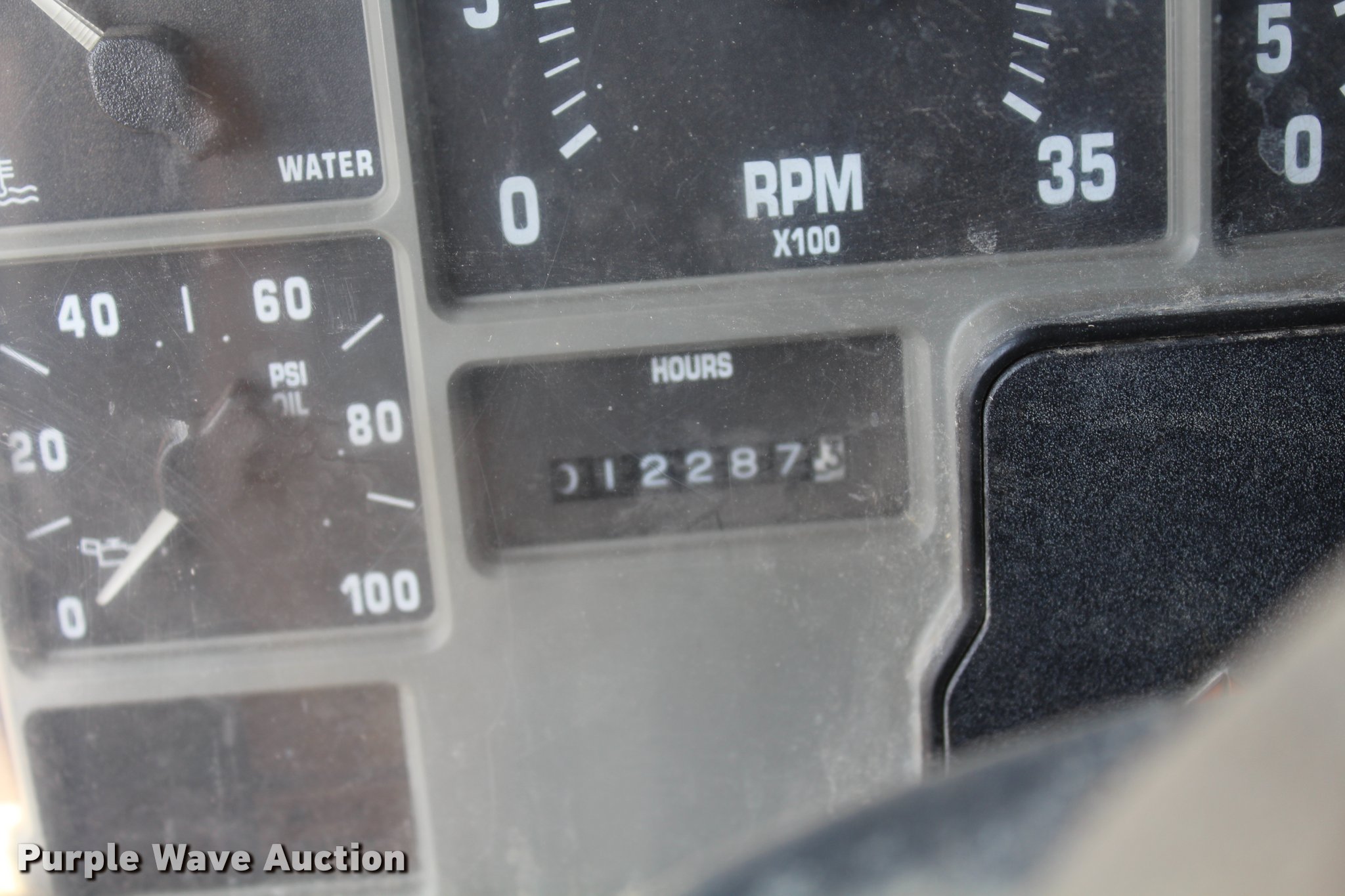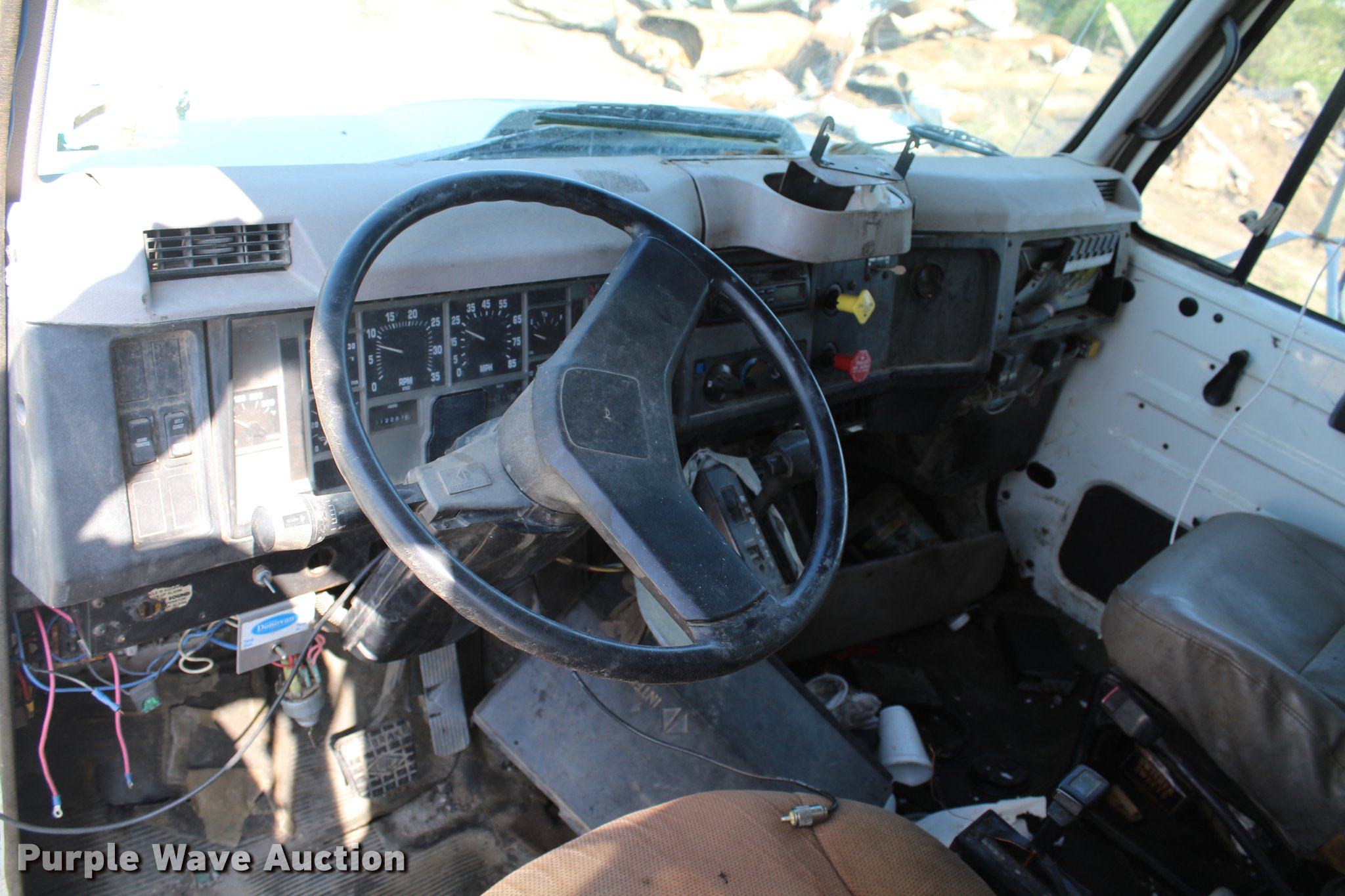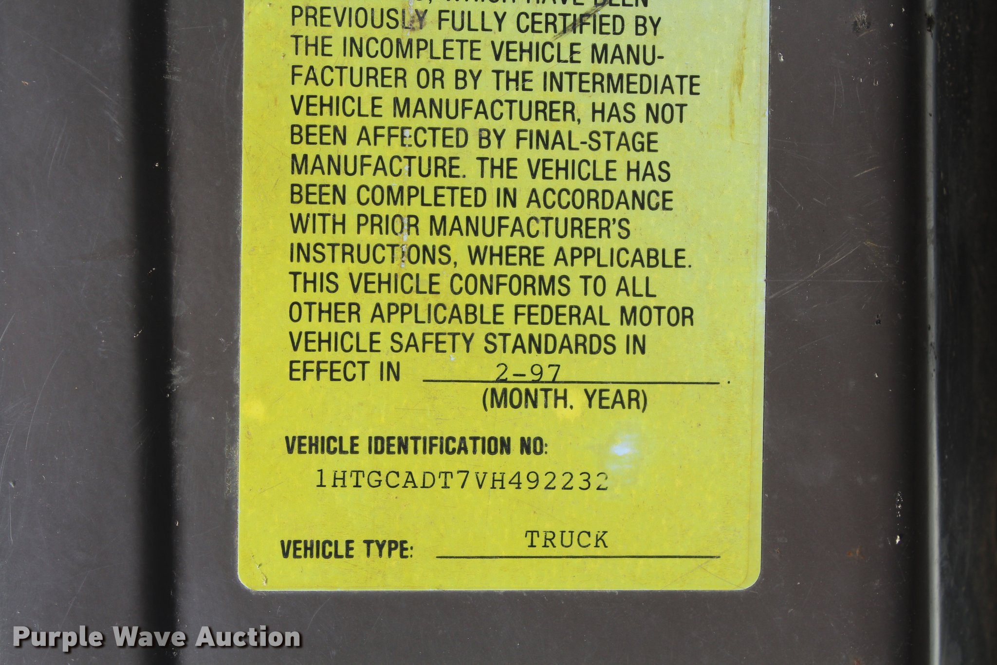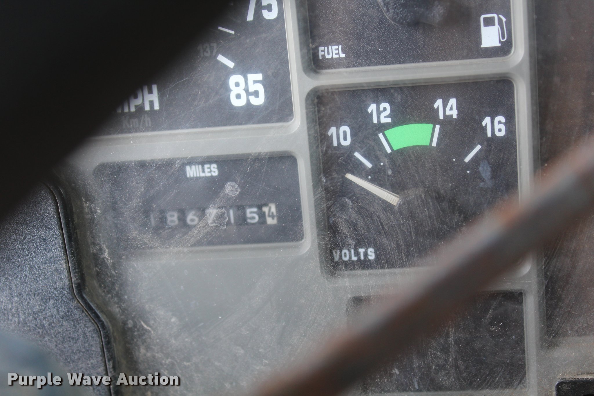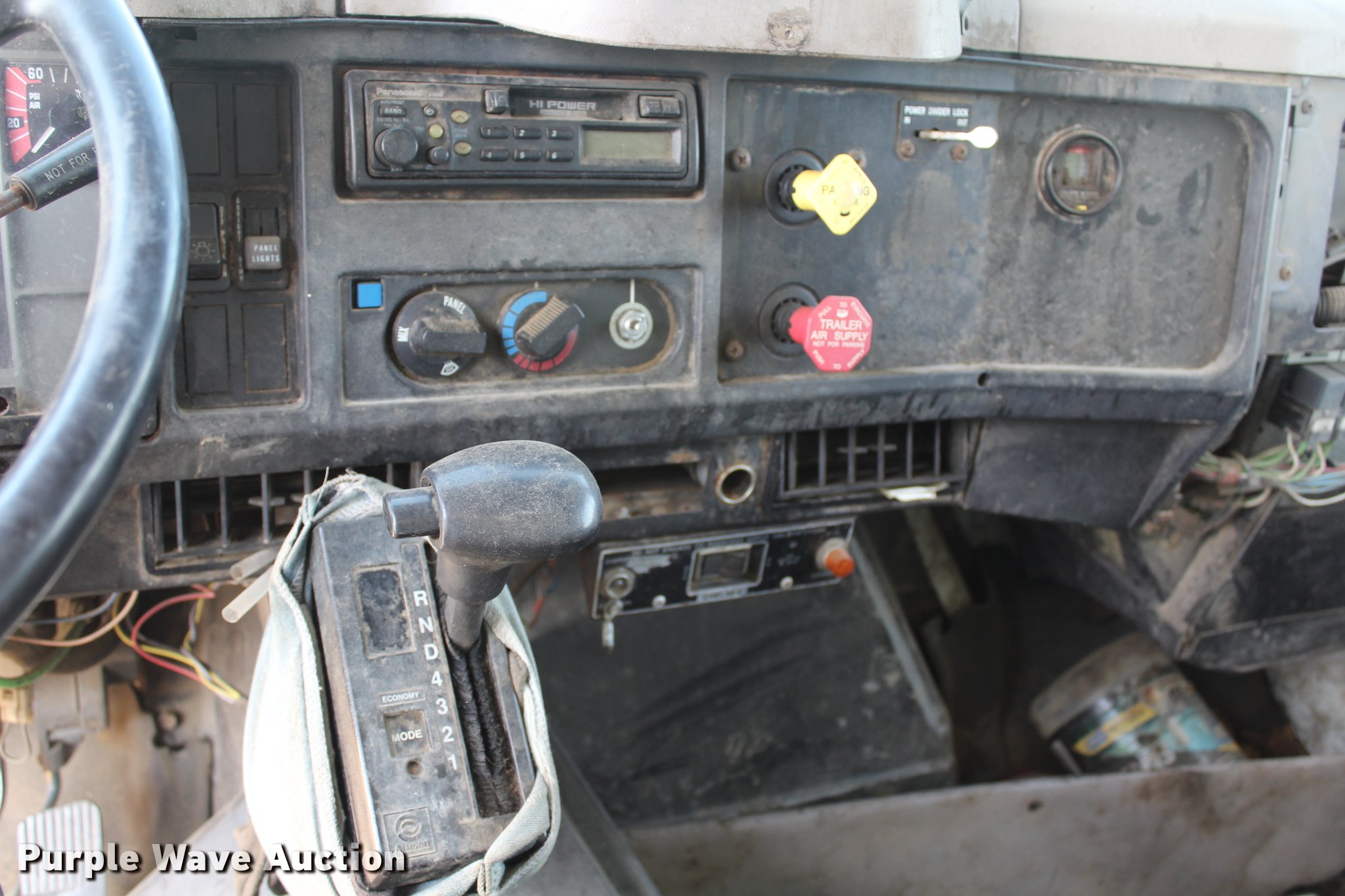 Purple Wave is selling a used Construction Dump Truck in Oklahoma. This item is a 1997 International 2554 dump truck with the following: 186,715 miles on odometer, 12,287 hours on meter, International DT530 8.7L L6 turbo diesel engine, Automatic transmission, Tandem axle, AC and heat, Cruise, AM/FM/cassette, Air suspension seat, Steel dump bed, 14'L x 8'W, 36" side height, 8" side board height, Single ram hoist, Manual operated end gate, Rollover tarp, 200" wheelbase, Spring over walking beam suspension, Air brakes, 11R22.5 tires, GVWR 58,000 lbs, FAWR 12,000 lbs, IAWR 23,000 lbs, RAWR 23,000 lbs, Unknown operating condition, Headliner damaged, Loose wires, Dash panels missing, Interior/exterior cosmetic damage, Unit# 302-149