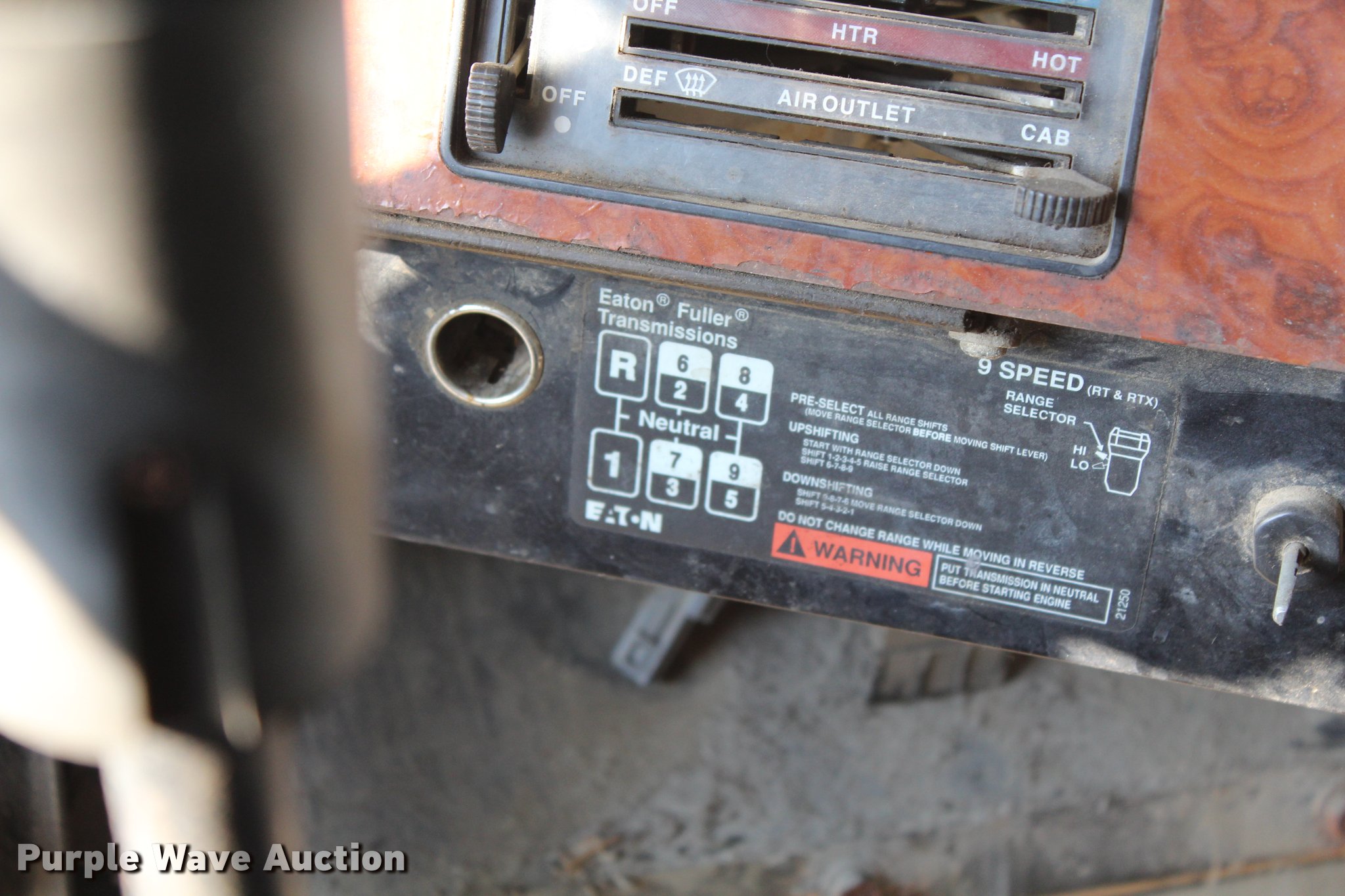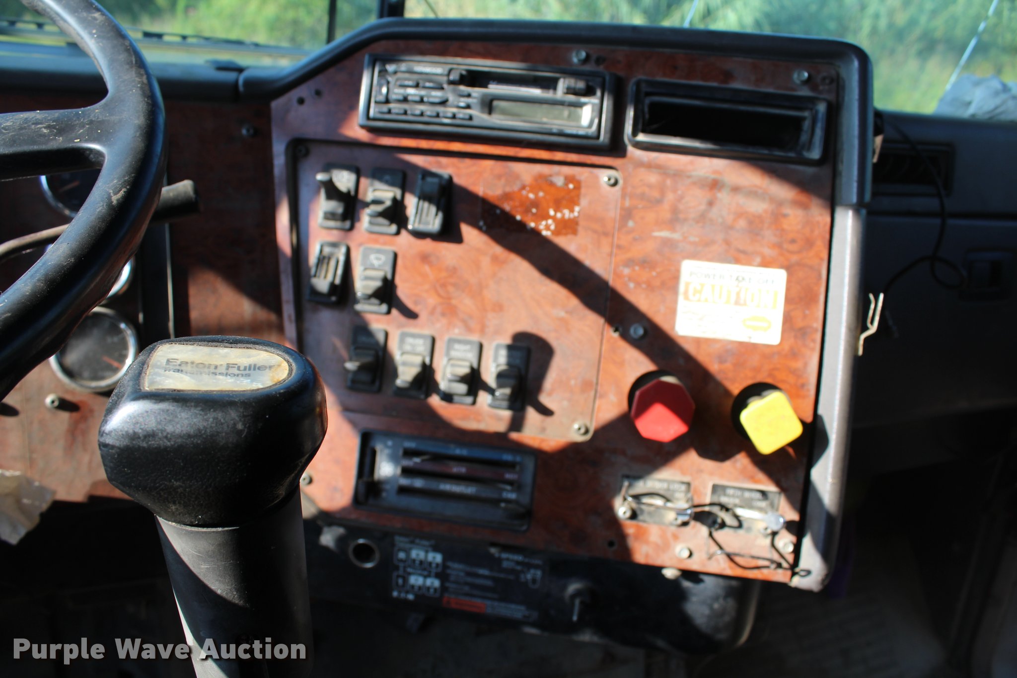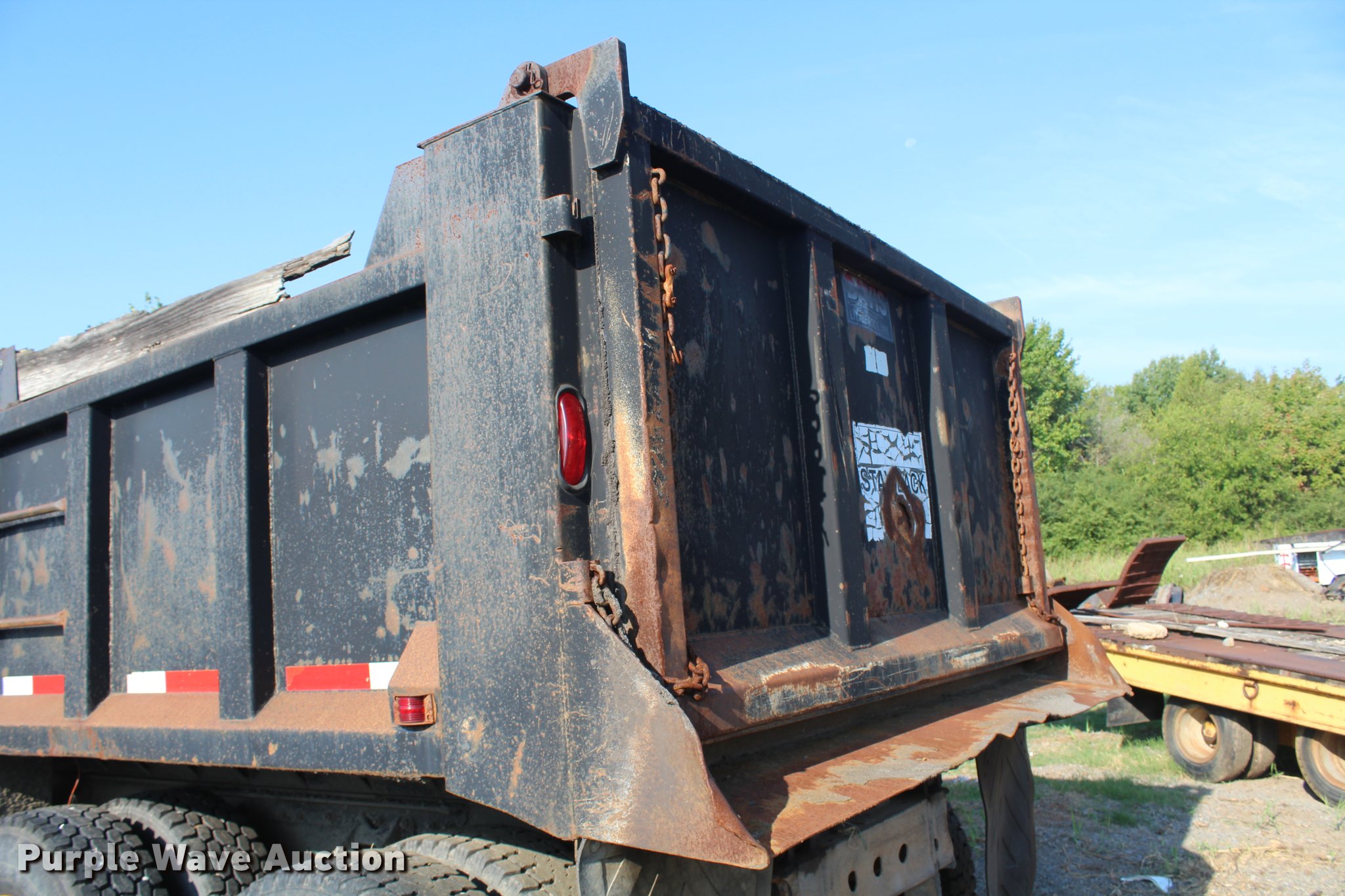 Purple Wave is selling a used Construction Dump Truck in Oklahoma. This item is a 1995 International 9200 dump truck with the following: 717,018 miles on odometer, Caterpillar 3176 10.3L L6 turbo diesel engine, Serial 9CK11784, Eaton Fuller nine speed manual transmission, Tandem axle, AC and heat, Cruise, AM/FM/cassette, Air suspension seat, Exterior visor, PTO, Davis steel dump bed, 15'L x 8'W, 36" side height, 11" side board height, Single ram hoist, Manual operated end gate, Rollover tarp, Toolboxes, 214" wheelbase, Spring suspension, Air brakes, 295/75R22.5 tires, GVWR 46,000 lbs, FAWR 12,000 lbs, IAWR 17,000 lbs, RAWR 17,000 lbs, Unknown operating condition, Windshield cracked, Wires loose, Light damage, Tires flat, Side boards rotten, Portions missing, Unit# 302-0139