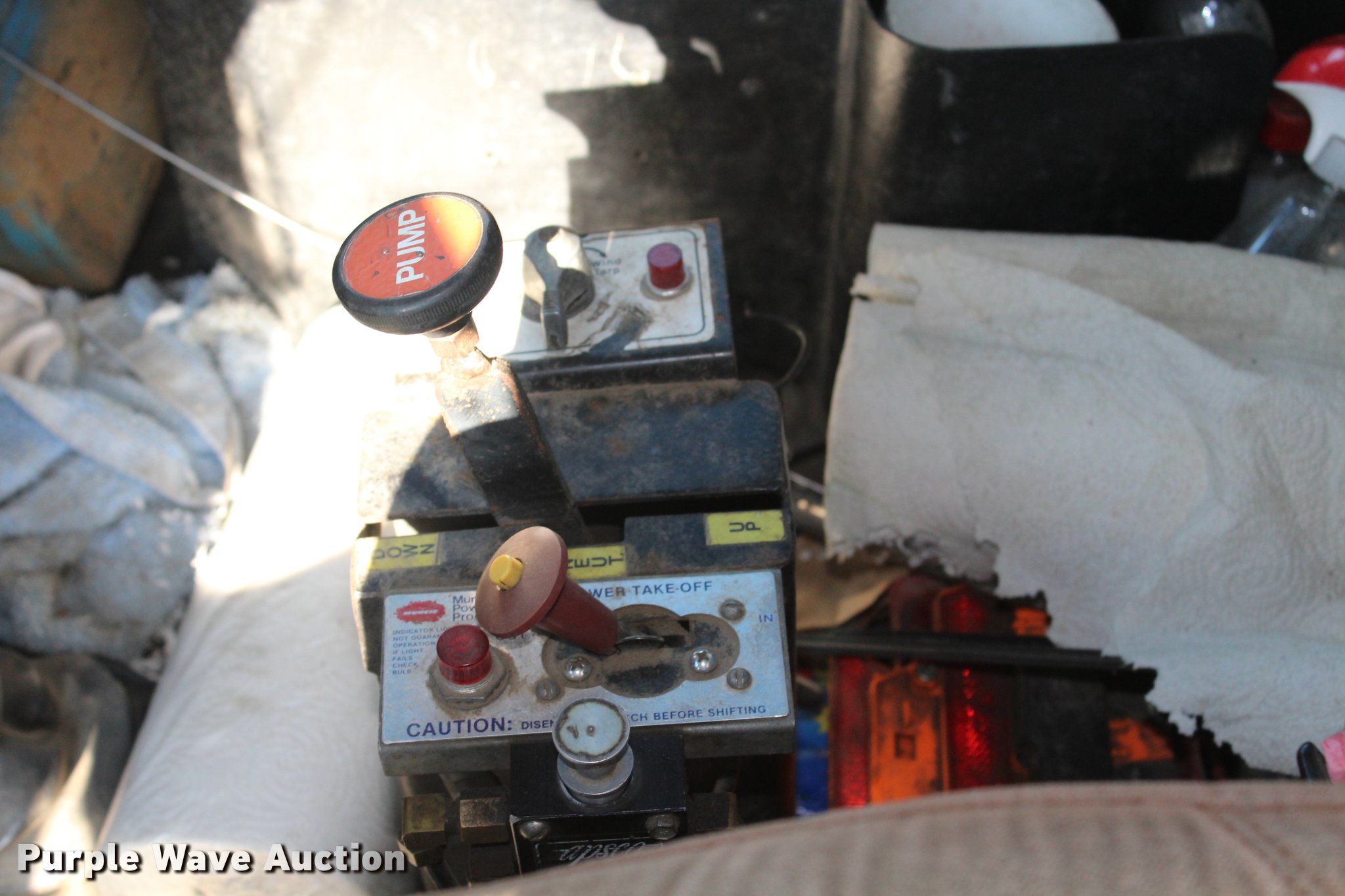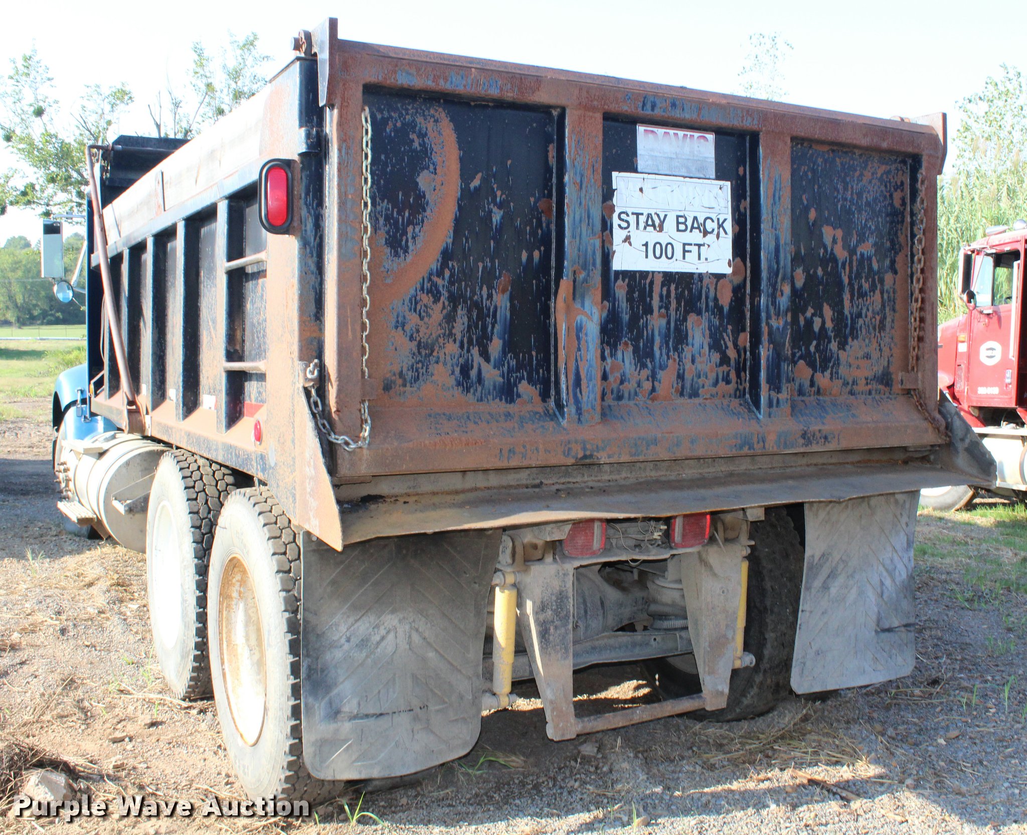 Purple Wave is selling a used Construction Dump Truck in Oklahoma. This item is a 1995 International 9400 dump truck with the following: 822,949 miles on odometer, Caterpillar 3406 14.6L L6 turbo diesel engine, 355 HP, Spicer 10 speed manual transmission, Tandem axle, AC and heat, Cruise, AM/FM/cassette, Air suspension seat, Exterior visor, PTO, Davis steel dump bed, 15'L x 8'W, 36" side height, 9" side board height, Single ram hoist, Manual operated end gate, Rollover tarp, Dual fuel tanks, 208" wheelbase, Air suspension, Air brakes, 11R22.5 tires, GVWR 52,000 lbs, FAWR 12,000 lbs, IAWR 20,000 lbs, RAWR 20,000 lbs, Unknown operating condition, Hood damage, Wires loose, No batteries, Rust, Unit# 302-0138