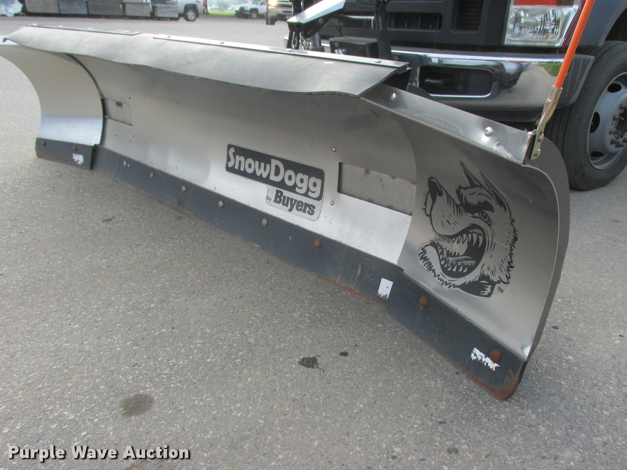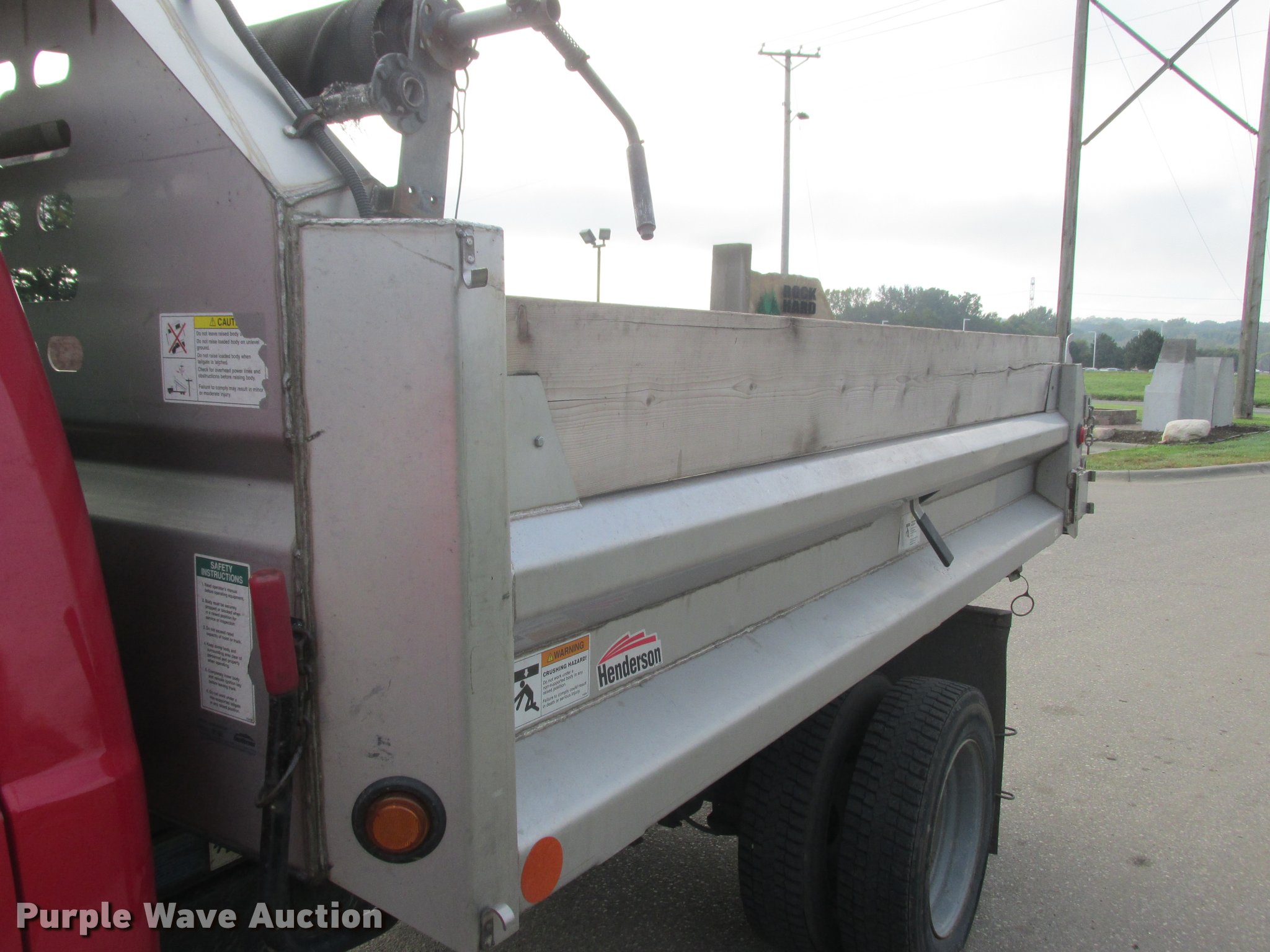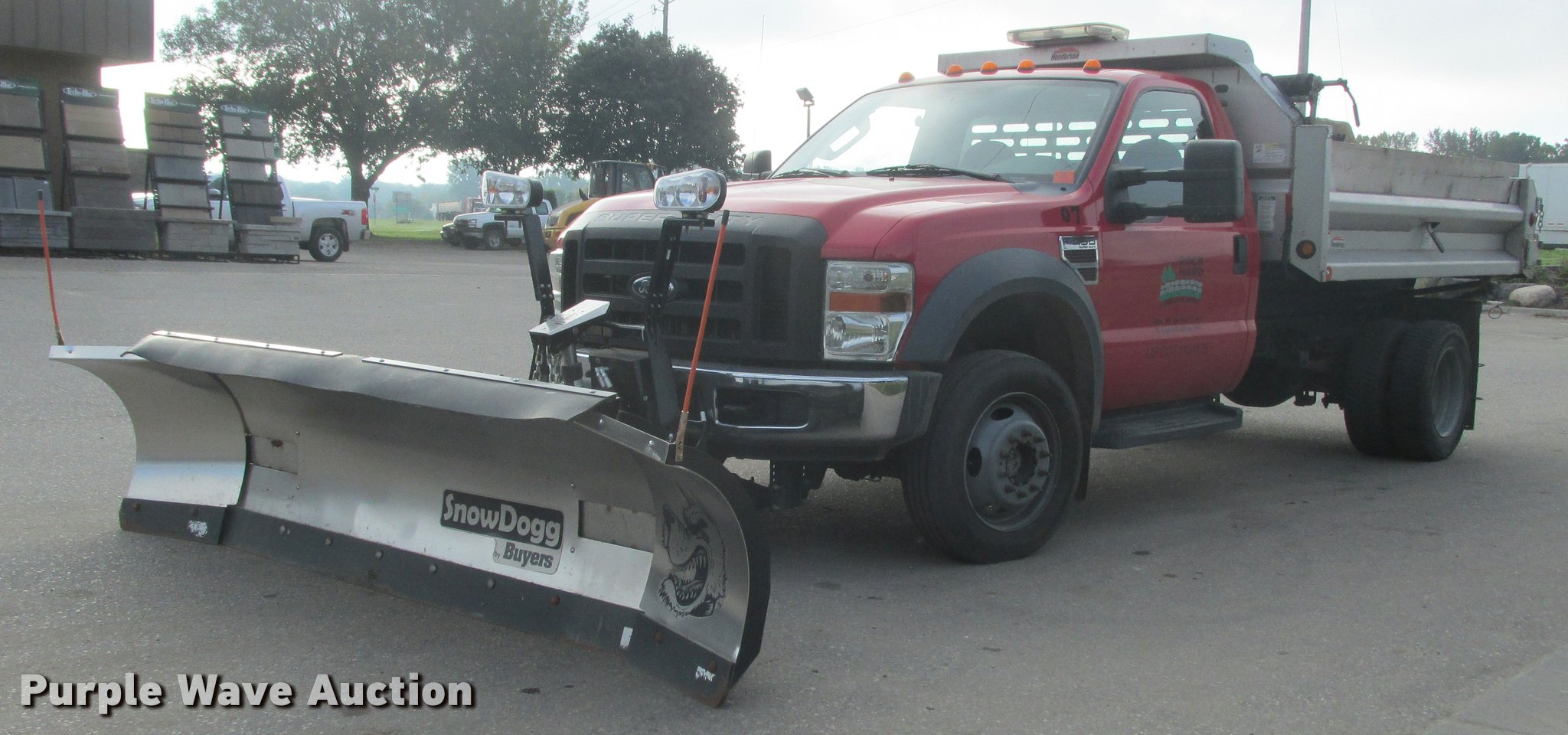 Purple Wave is selling a used Construction Dump Truck in Minnesota. This item is a 2008 Ford F450 Super Duty XL dump truck with the following: 95,545 miles on odometer, 6.4L V8 OHV 32V turbo diesel engine, Automatic transmission, Four wheel drive, Single axle, AC and heat, Tilt, Cruise, AM/FM, Spring suspension seat, Cloth interior, Beacon light, Brake controller, Chrome bumper, Henderson aluminum dump bed, 11'L x 8'W, 16" side height, 10"H side boards, Rollover tarp, Fold down side and end gates, Manual end gate, Single ram hoist, Snow Dogg XP810 plow, 8'W to 10'W, Salt Dogg spreader, 8'W, Unused, VMC air compressor, Pintle hitch, Trailer wiring, Spring suspension, Hydraulic brakes, 165" wheelbase, 225/75R19.5 tires, GVWR 16,000 lbs