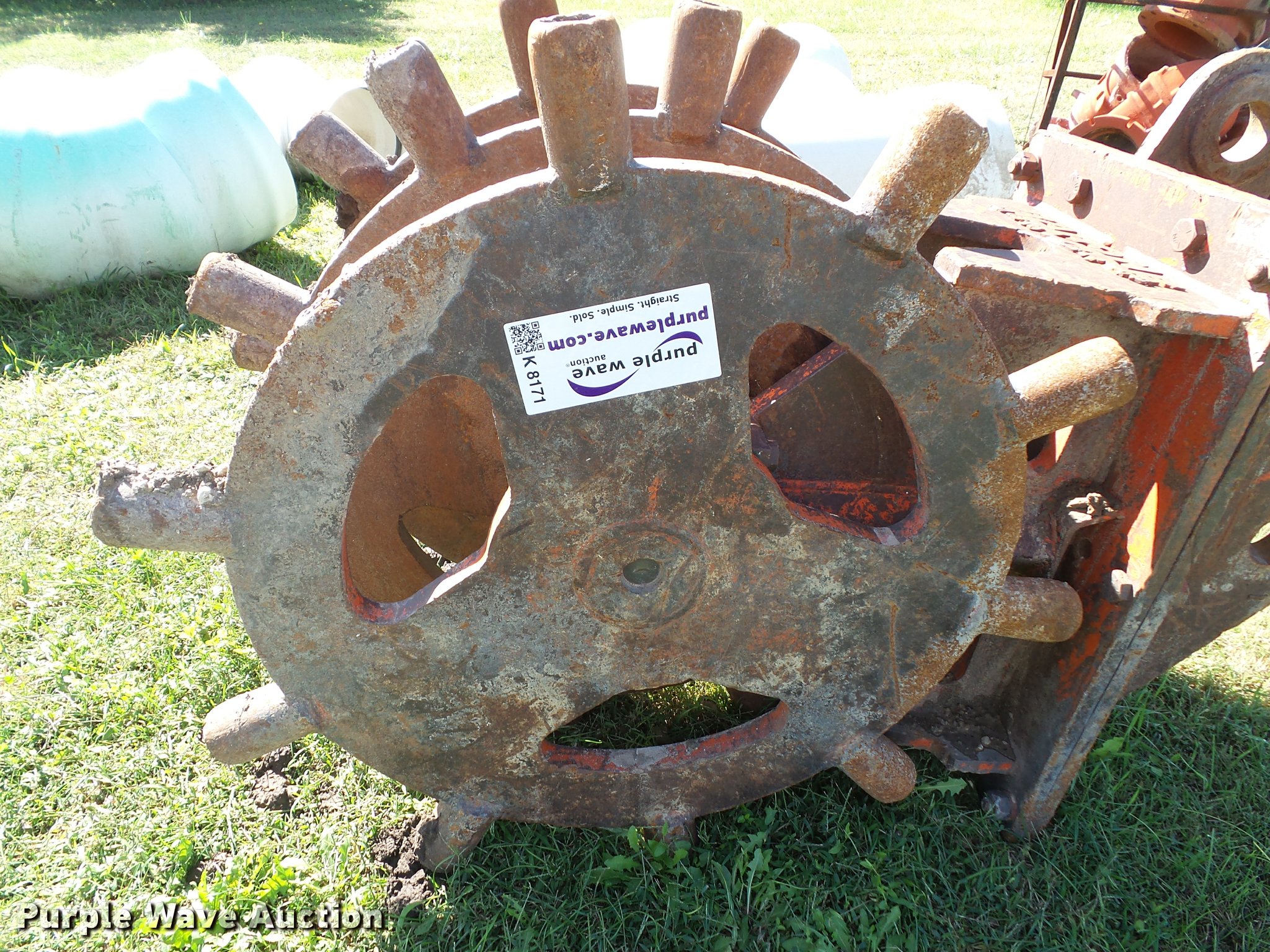 Purple Wave is selling a used Compaction Wheel in Kansas. This item is a Barone excavator wedge/spike roller attachment with the following: 22"W, 35.5" diameter, 4.5" spikes/knobs, Fits Komatsu PC200 excavators