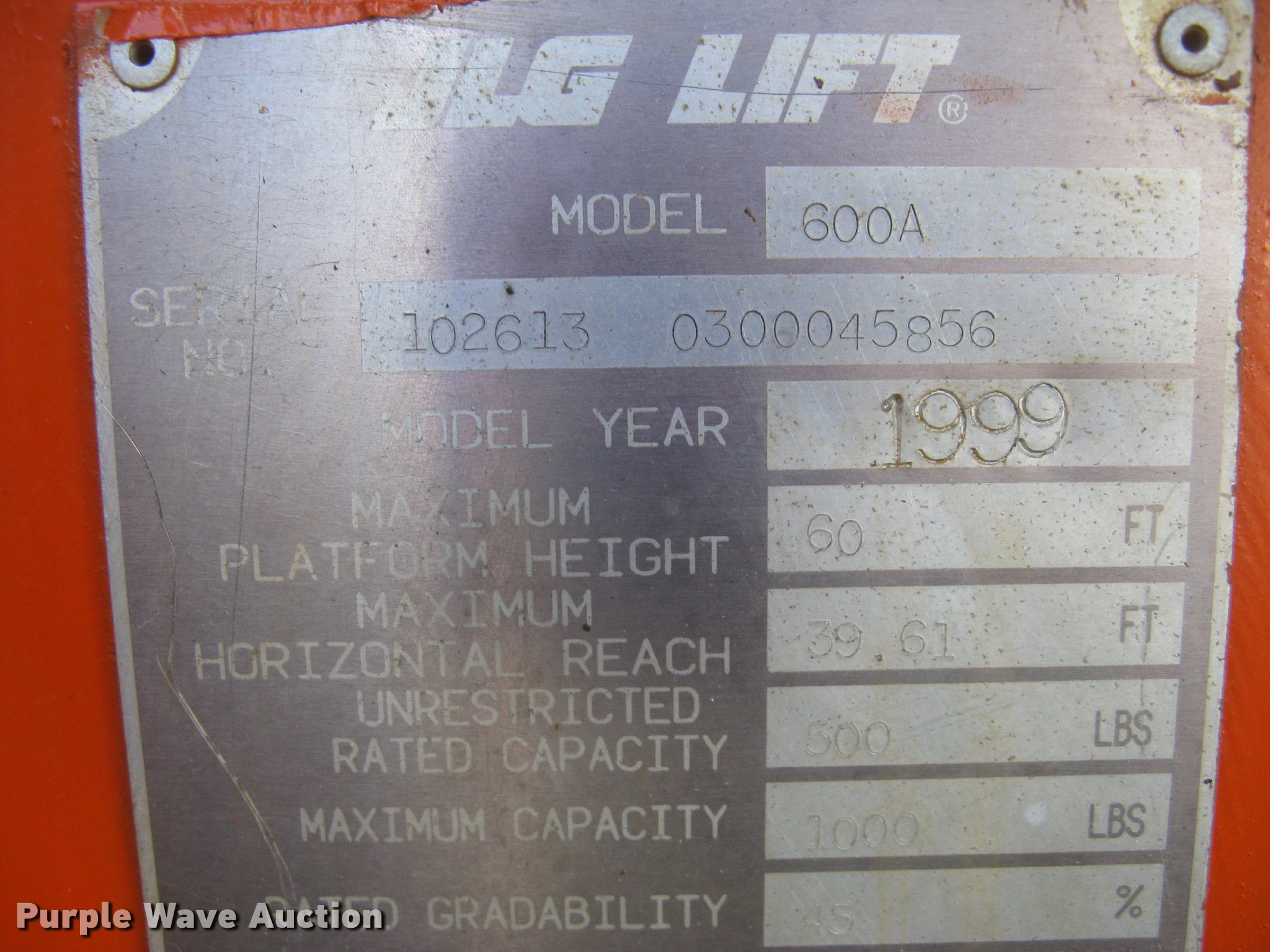 Purple Wave is selling a used Boom Lift in Kansas. This item is a 1999 JLG 600A boom lift with the following: 948 hours on meter, Four cylinder dual fuel engine, Four wheel drive, 1,000 maximum lift capacity, 39.6' maximum reach, 60' maximum lift height, 8'L x 3'W platform, AC power outlet, Platform and ground controls, Hydraulic platform rotation, 14-17.5 NHS tires, Serial 1026130300045856