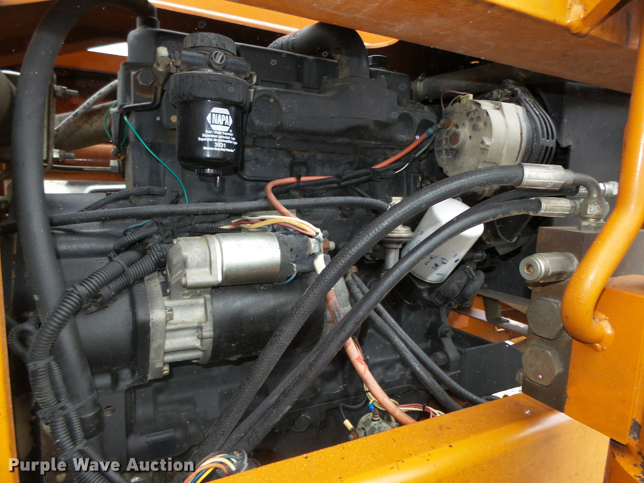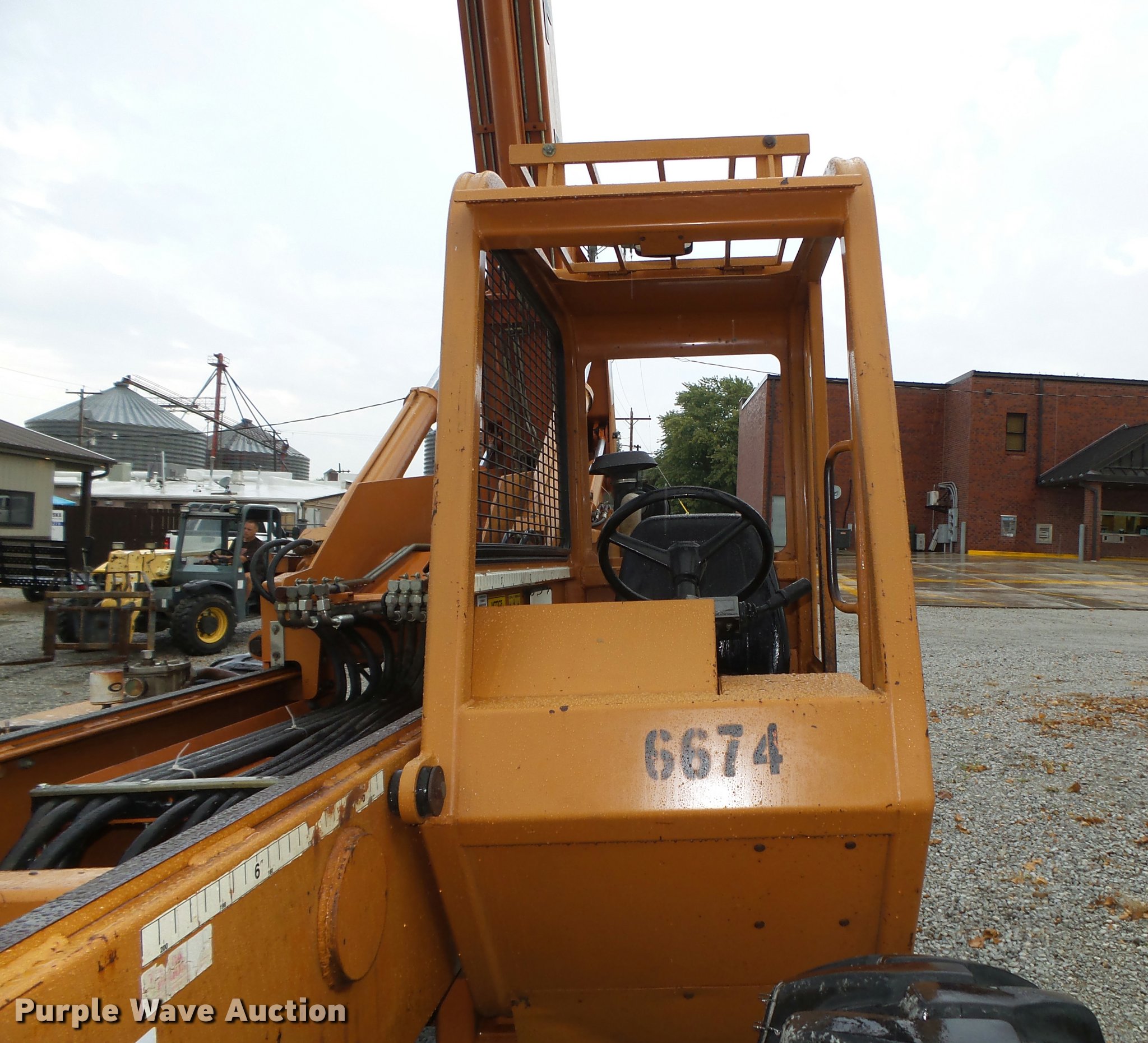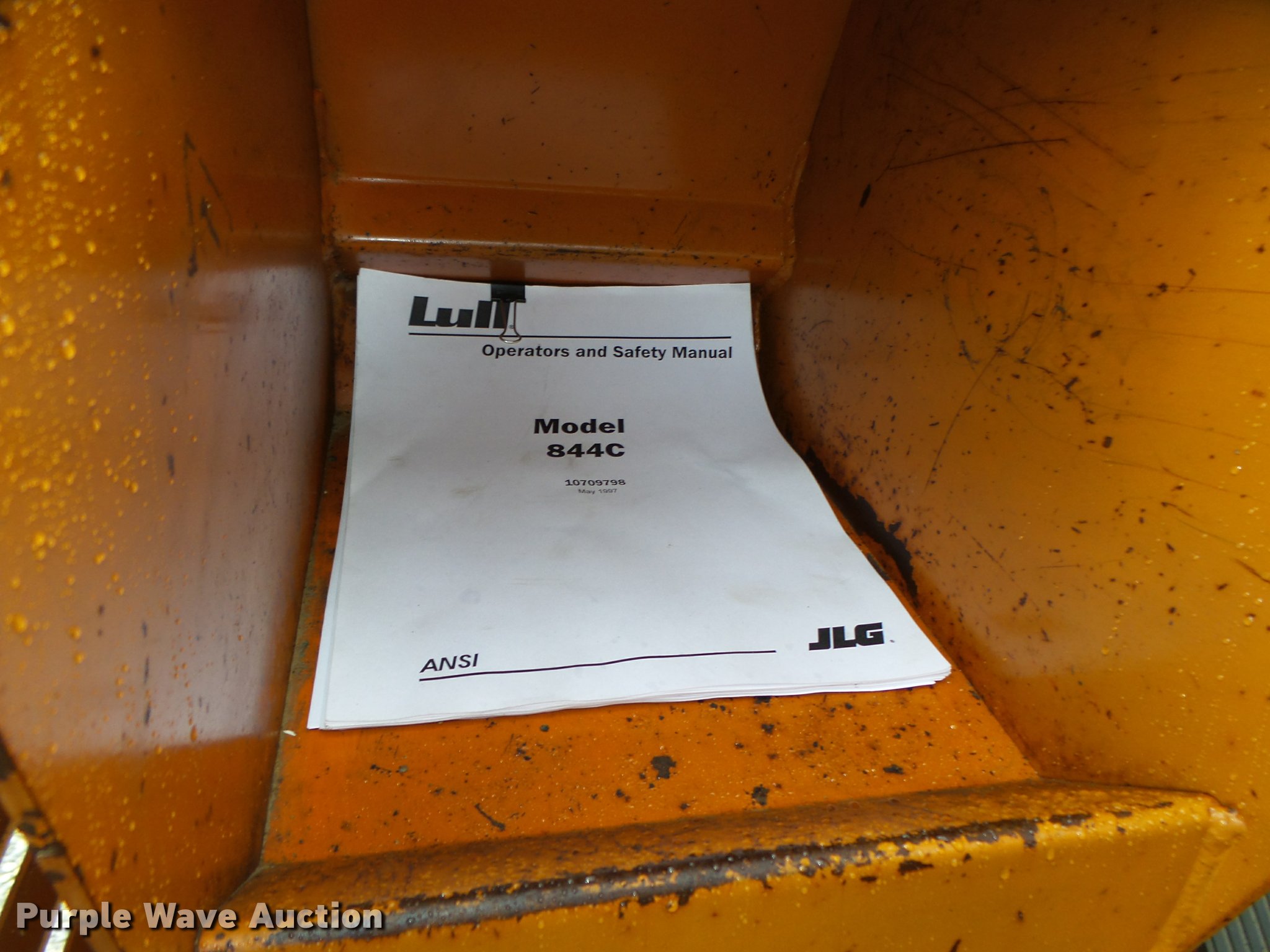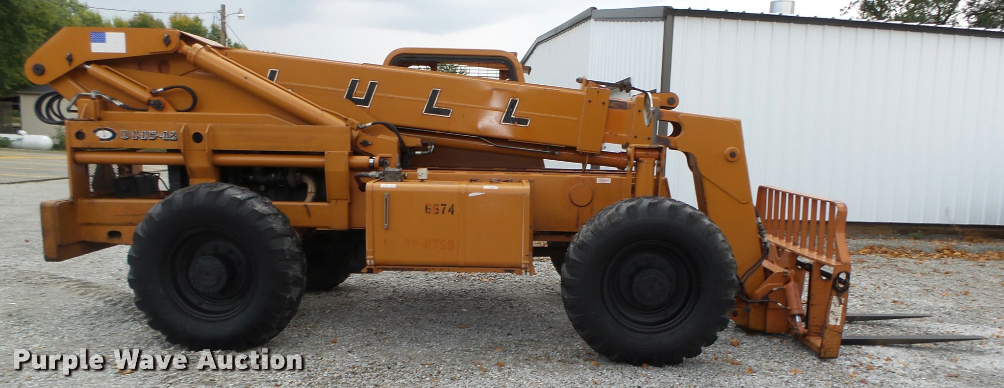 Purple Wave is selling a used Telehandler in Nebraska. This item is a Lull 844C-42 Highlander telehandler with the following: 4,194 hours on meter, John Deere four cylinder turbo diesel engine, Serial T04039T568945, Powershift transmission, 3F-3R gears, Four wheel drive, OROPS, Serial CP1144-10-776, Crab steering, Four wheel steering, Two wheel steering, Backup alarm, Non-operational, 8,000 lbs max lift capacity, 31' max reach length, 42' max lift height, Three stage mast, 60"L x 4"W forks, Hydraulic leveling, Tilt carriage, 74"W x 48"H rotating carriage, Load chart, Magnetic pan heater included, 13.00-24 calcium filled tires, 24,200 lbs. base operating weight, Operators manual, Right mirror glass missing, Serial 97W16P22-730