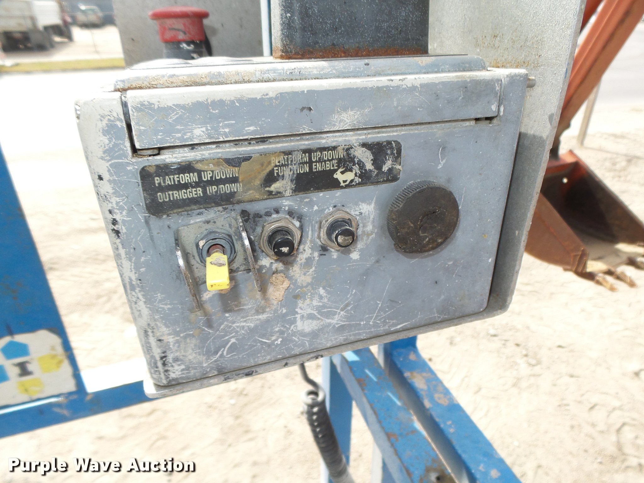 Purple Wave is selling a used Scissor or Vertical Lift in Nebraska. This item is a 2002 Genie GS-3268 scissor lift with the following: 2,575 hours on meter, Three cylinder dual fuel engine, Four wheel drive, 1,000 lbs maximum lift capacity, 32' maximum lift height, 8'L x 4'W platform, 36" manual platform extensions, Platform and ground controls, Propane bottle brackets, 26 x 12 foam filled tires, 8,090 lbs tare weight, No propane bottle included, Serial GS68-41213