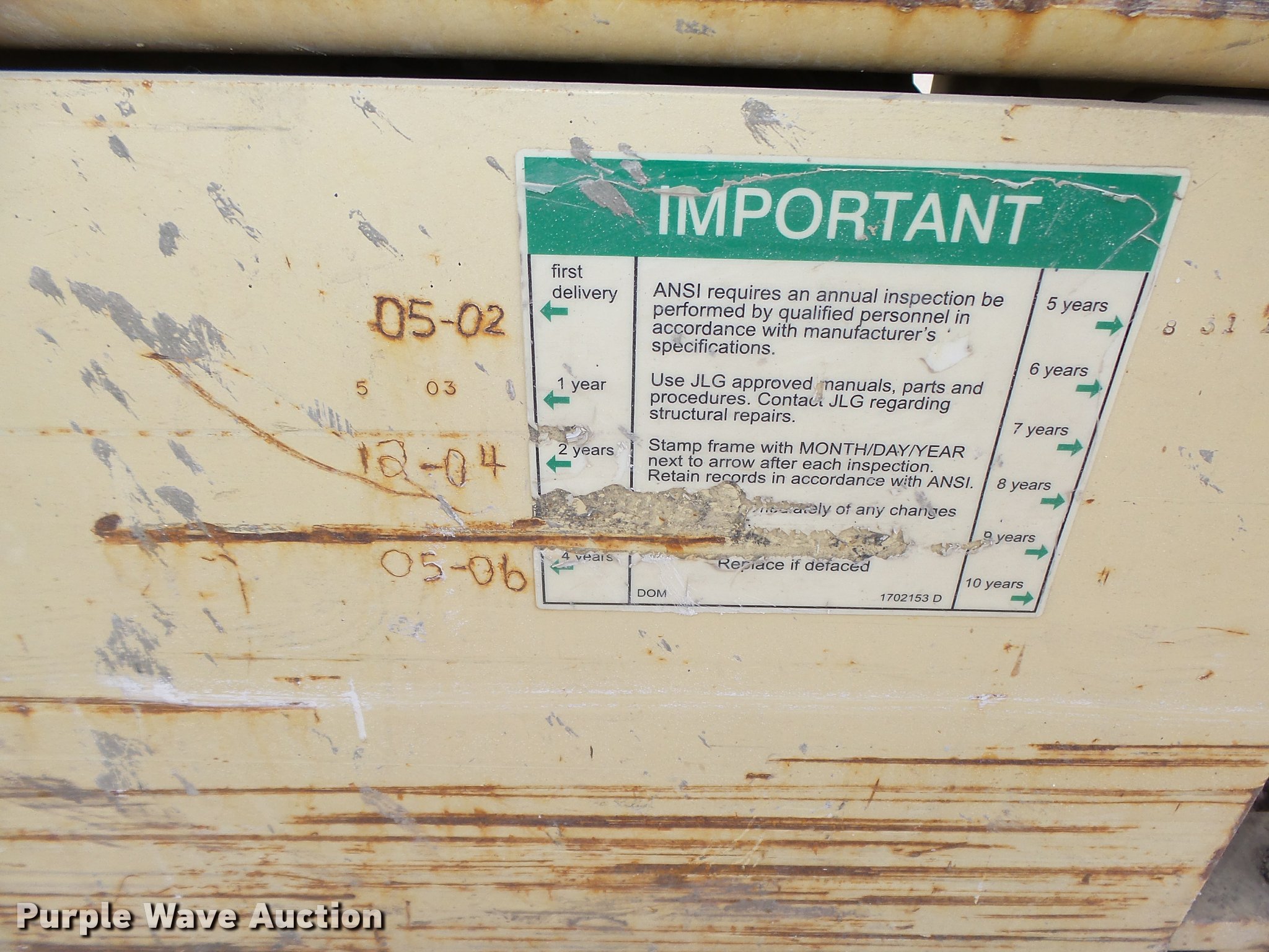 JLG 2632E2 scissor lift. 24V electric operation, 500 lbs maximum lift capacity, 26' maximum lift height, 84"L x 31"W platform AC power outlet, 36" manual platform extensions, Free wheeling valve, 16 x 5 non-marking tires, JLG SCR242037B1 battery charger Serial 02128617, Operator and ANSI manual, Unknown operating condition, Batteries dead, Serial 0200105861, Unit# RN02-132. TL Sund Inc.. 707 N. Ontario. Lexington, NE 68850