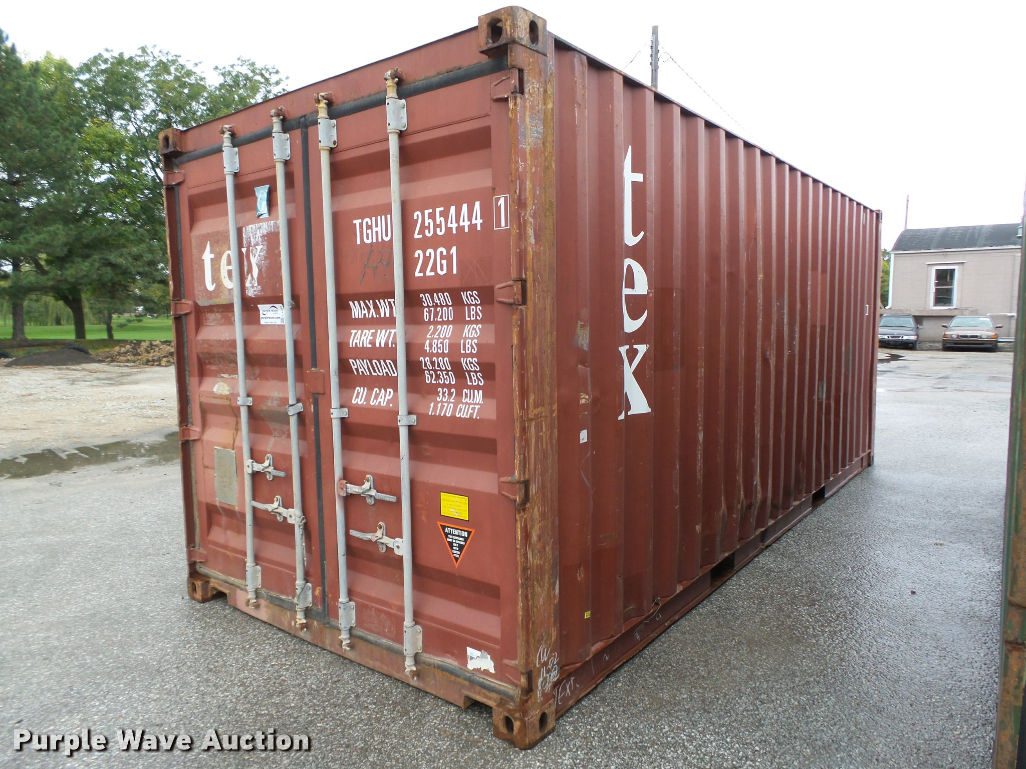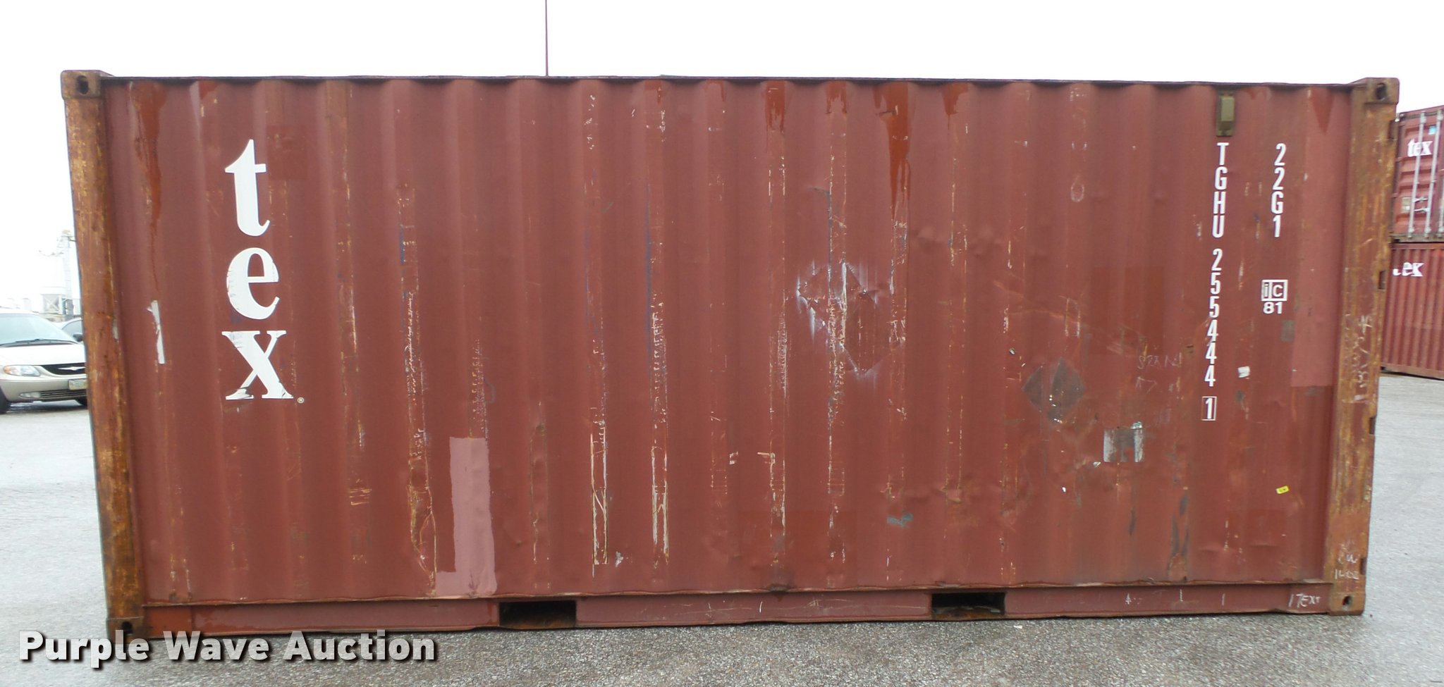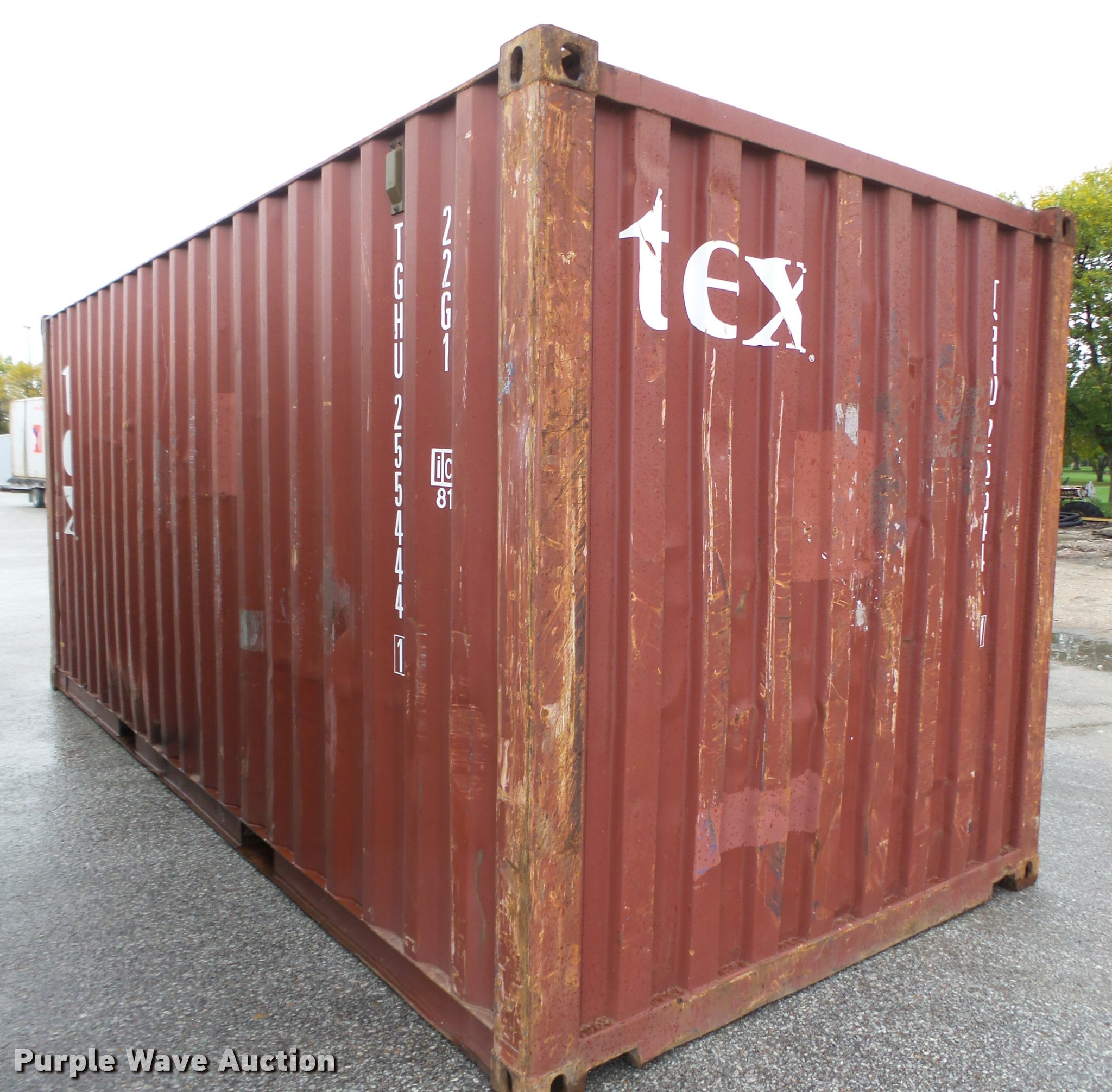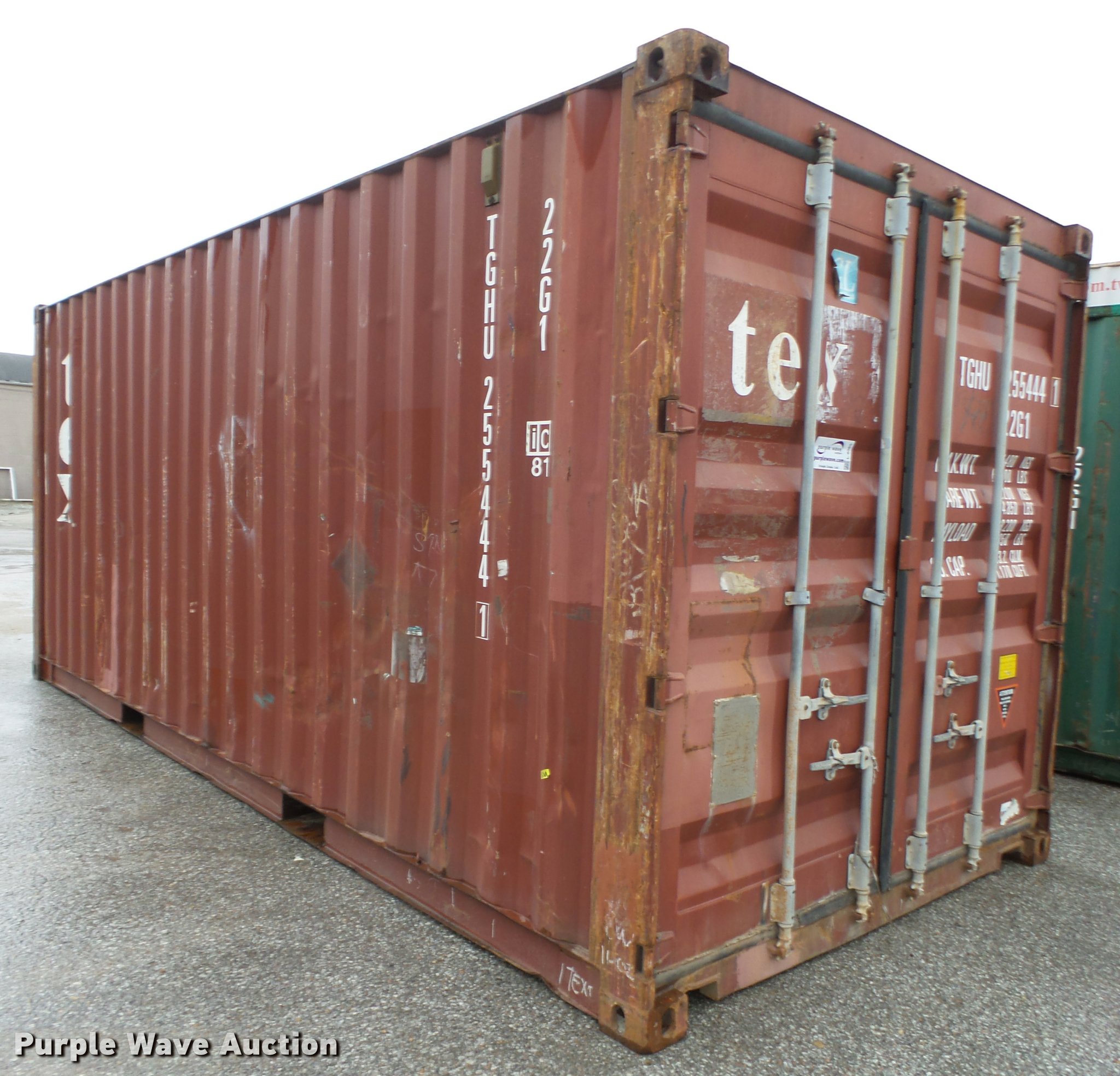 Purple Wave is selling a used Storage or Shipping Container in Nebraska. This item is a 2002 TEX container with the following: 19'10"L x 8'W x 8.5'H O.D., Lifting eyes, Fork pockets, Wood floor, 1,170 cu. ft. capacity, Locking door handles, 67,200 lbs maximum gross weight, 4,850 lbs tare weight, Serial TGHU2554441