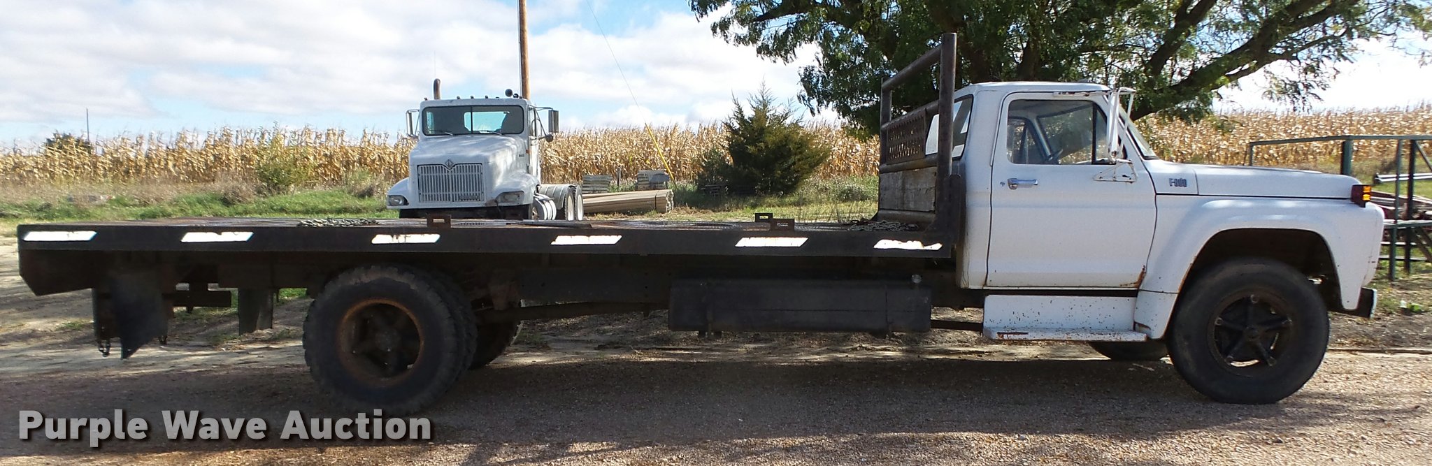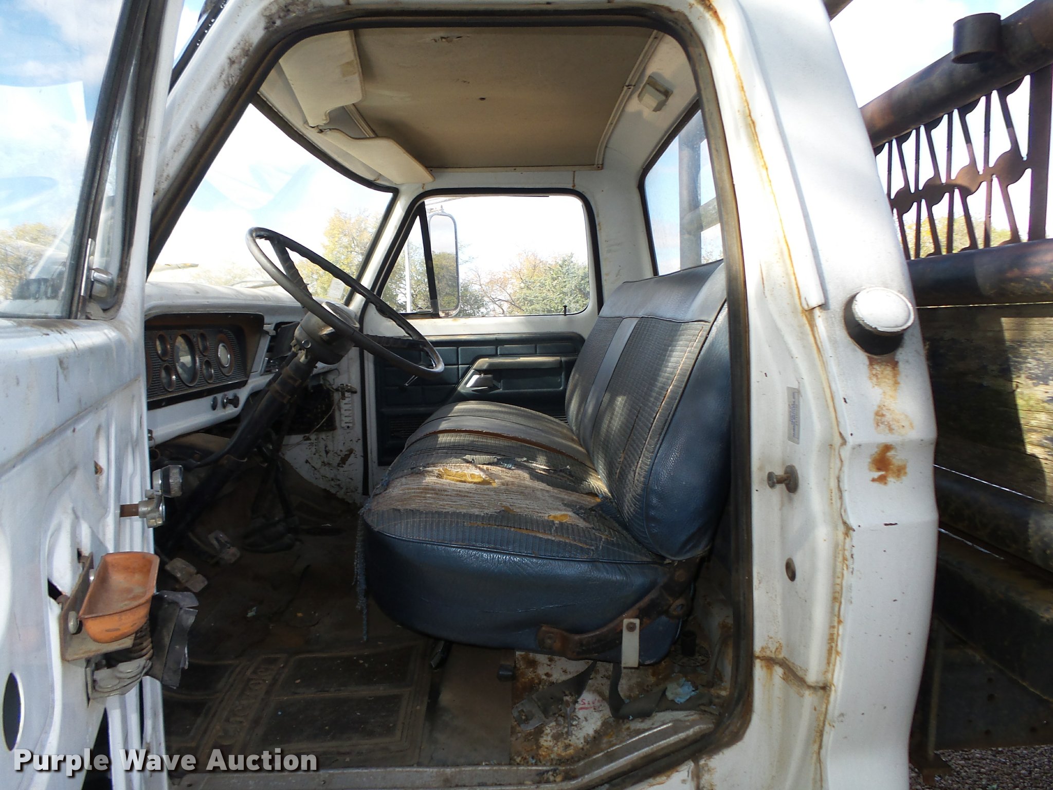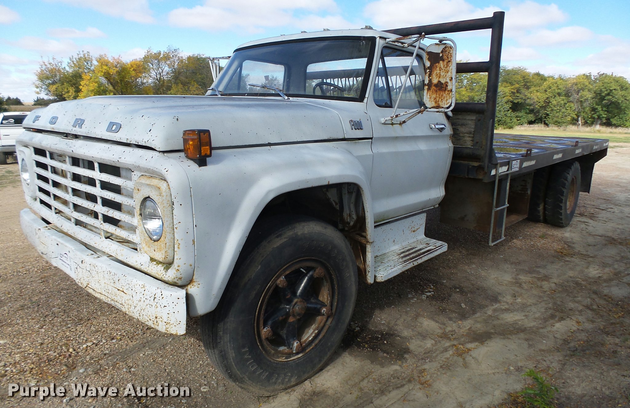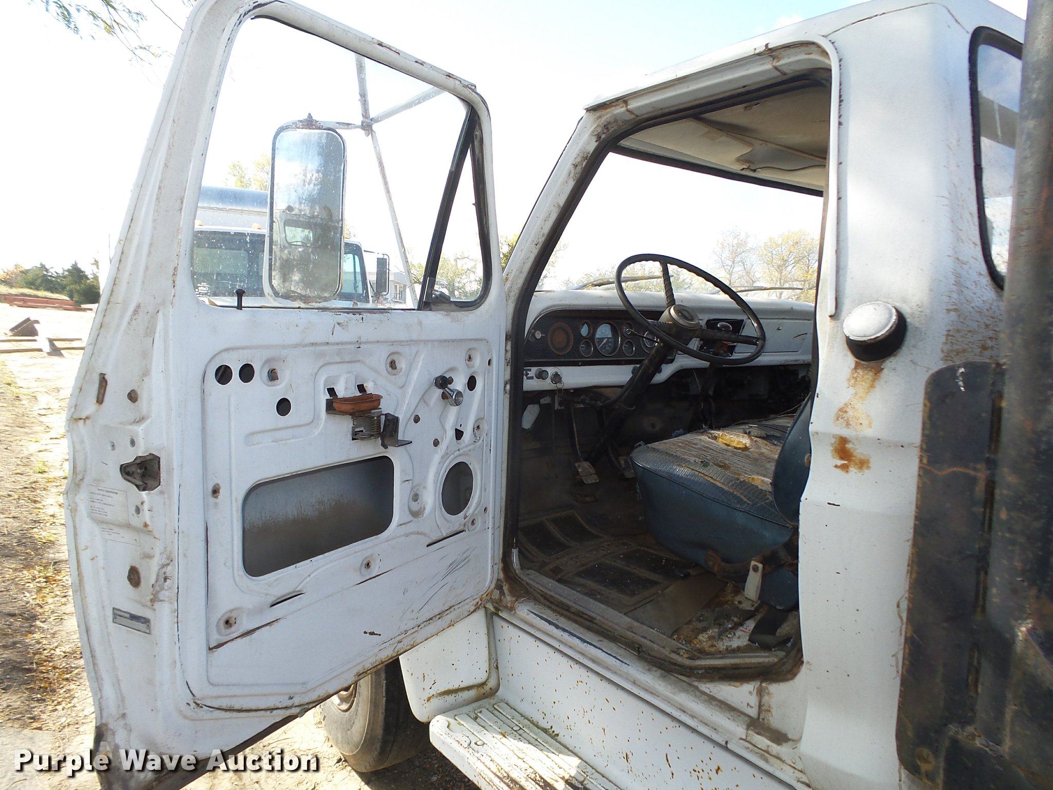 Purple Wave is selling a used Truck Chassis in Nebraska. This item is a 1977 Ford F600 truck cab and chassis with the following: 69,677 miles on odometer, Ford 361 C.I.D. eight cylinder gas engine, Four barrel carbeurator, Four speed manual transmission, Two speed rear end, Single axle, Heat, Spring suspension seat, Dual fuel tanks, Factory tank and 60 gallon saddle tank, 222" wheelbase, Spring suspension, Vacuum hydraulic brakes, 9.00R20 front tires tires, 9.00-20 rear tires, GVWR 24,000 lbs, FAWR 7,000 lbs, RAWR 17,000 lbs, Bed is not included and will be removed prior to auction