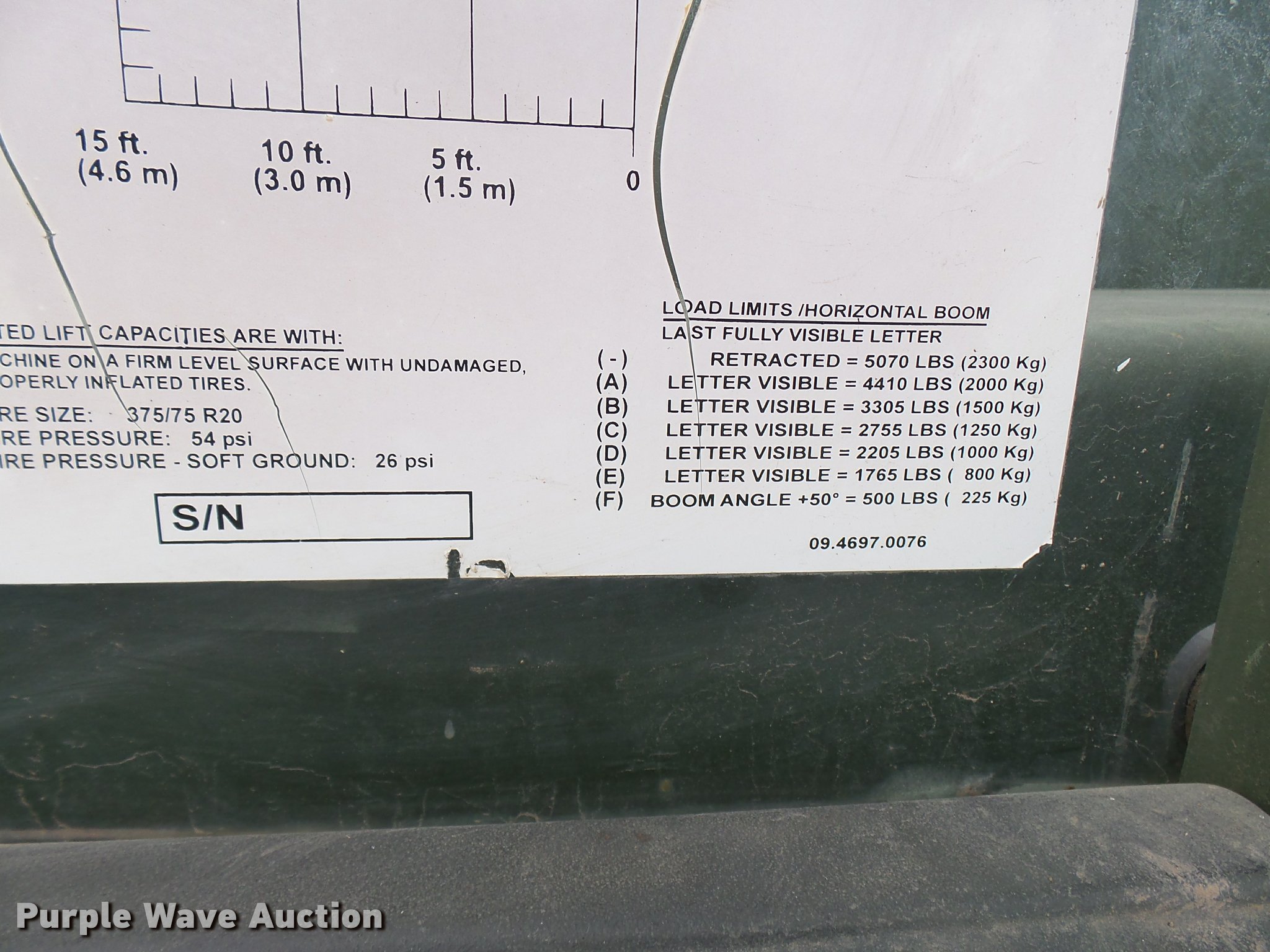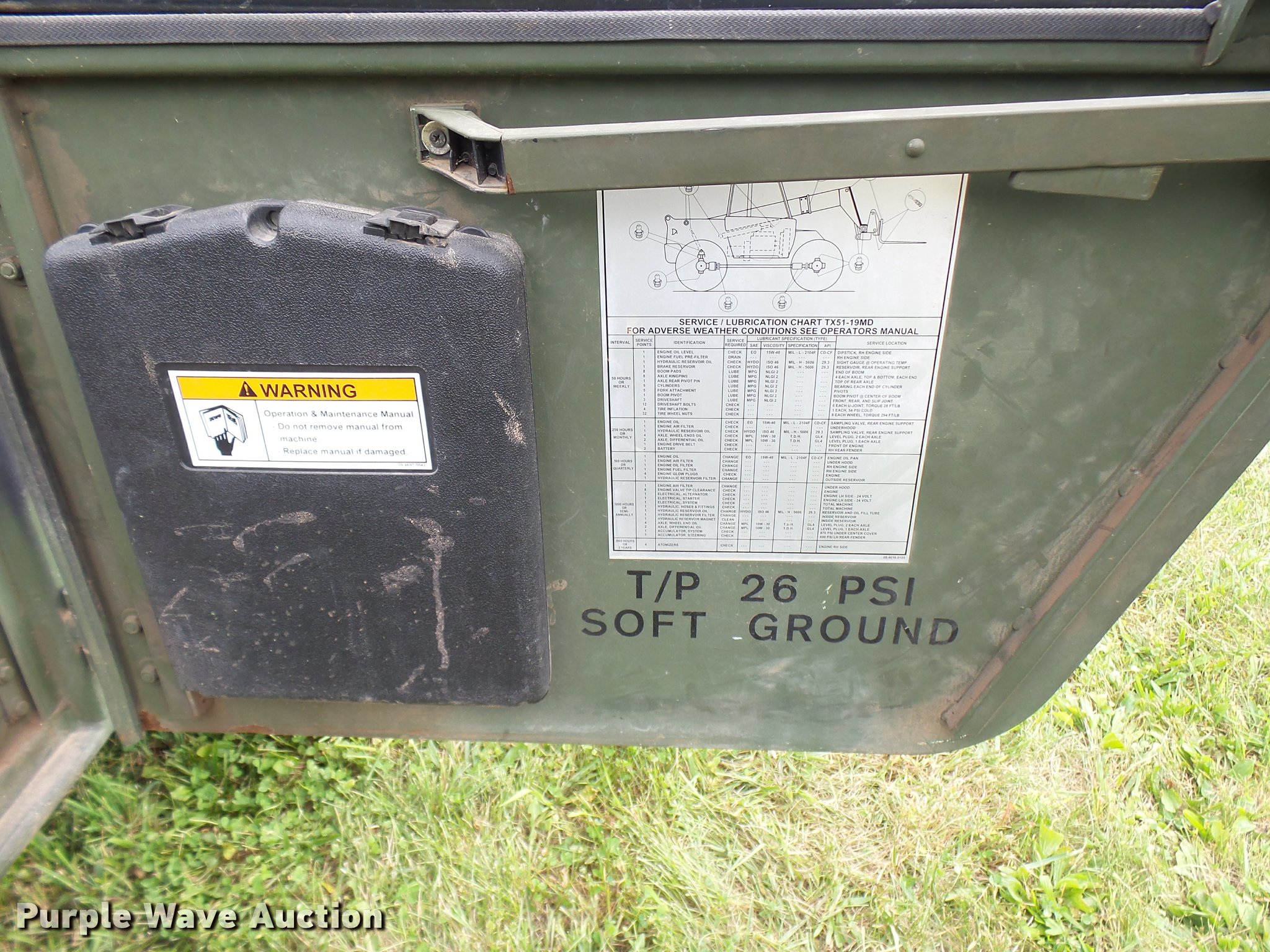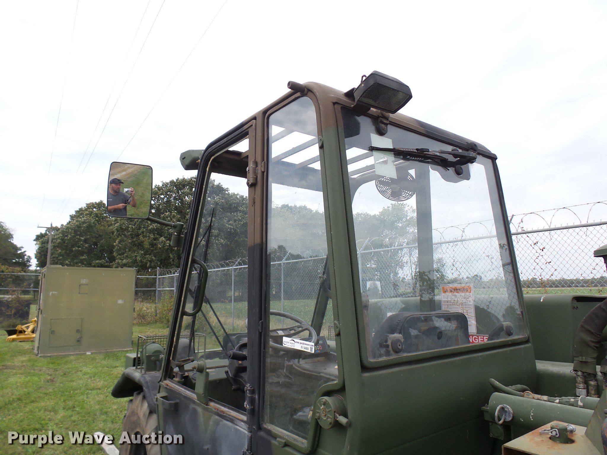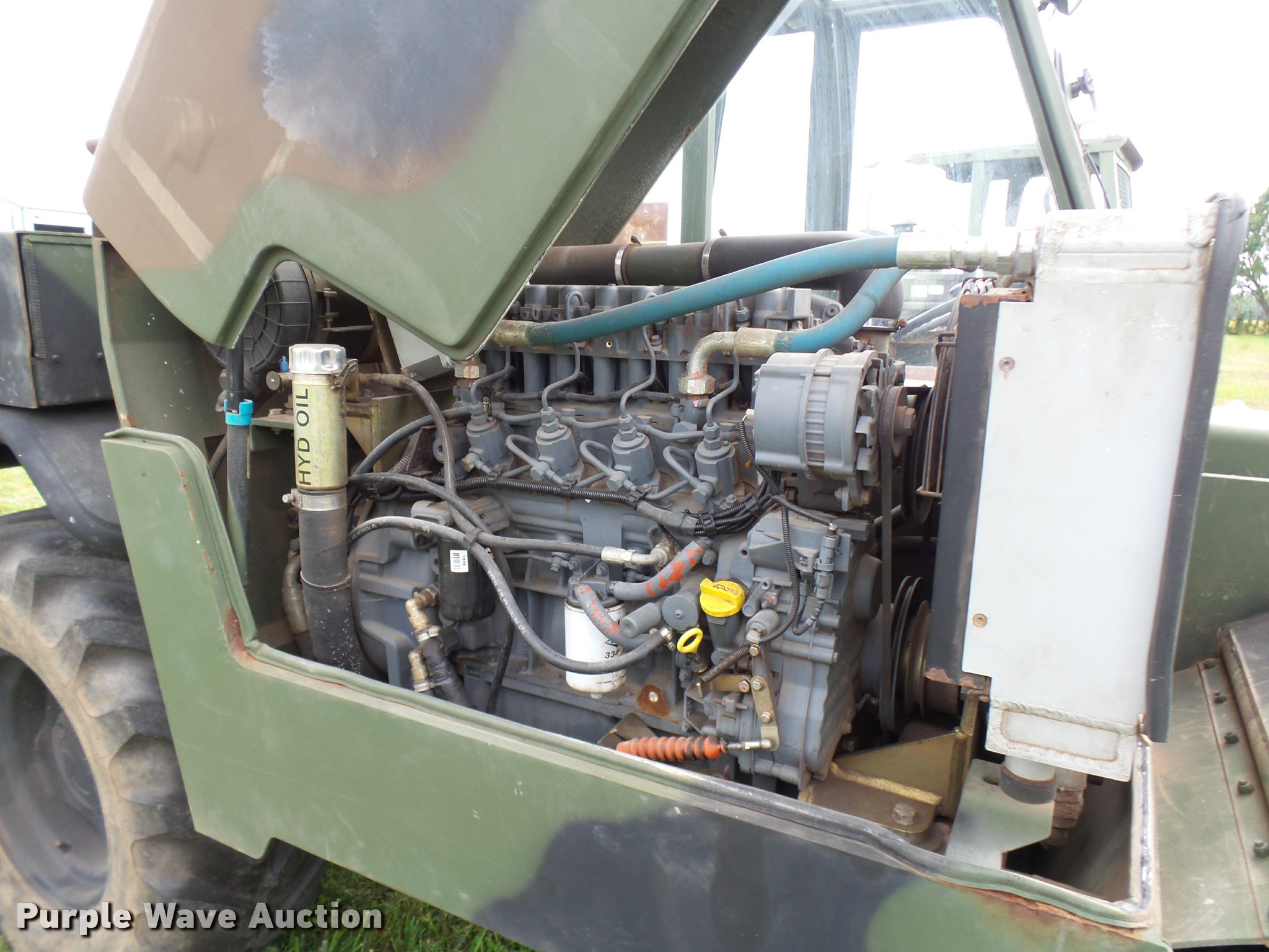 Purple Wave is selling a used Telehandler in Missouri. This item is a 2007 Terex TX5119MD Military telehandler with the following: 435 hours on meter, Deutz BF4M2011 four cylinder diesel engine, 81 HP, Serial 10464032, Hydrostatic transmission, Four wheel drive, Cab, Heat, Spring suspension seat, Front and rear wipers, Crab steering, Circle steering, 5,000 lbs max lift capacity, 19' reach length, Two boom sections, 44"L forks, Side shift, Auxiliary hydraulics, Tilt carriage, Rotating carriage, Hydraulic leveling, Pintle hitch, Trailer spotter, 375/75R20 tires, 13,500 lbs. base operating weight, Door glass missing, Serial 628069