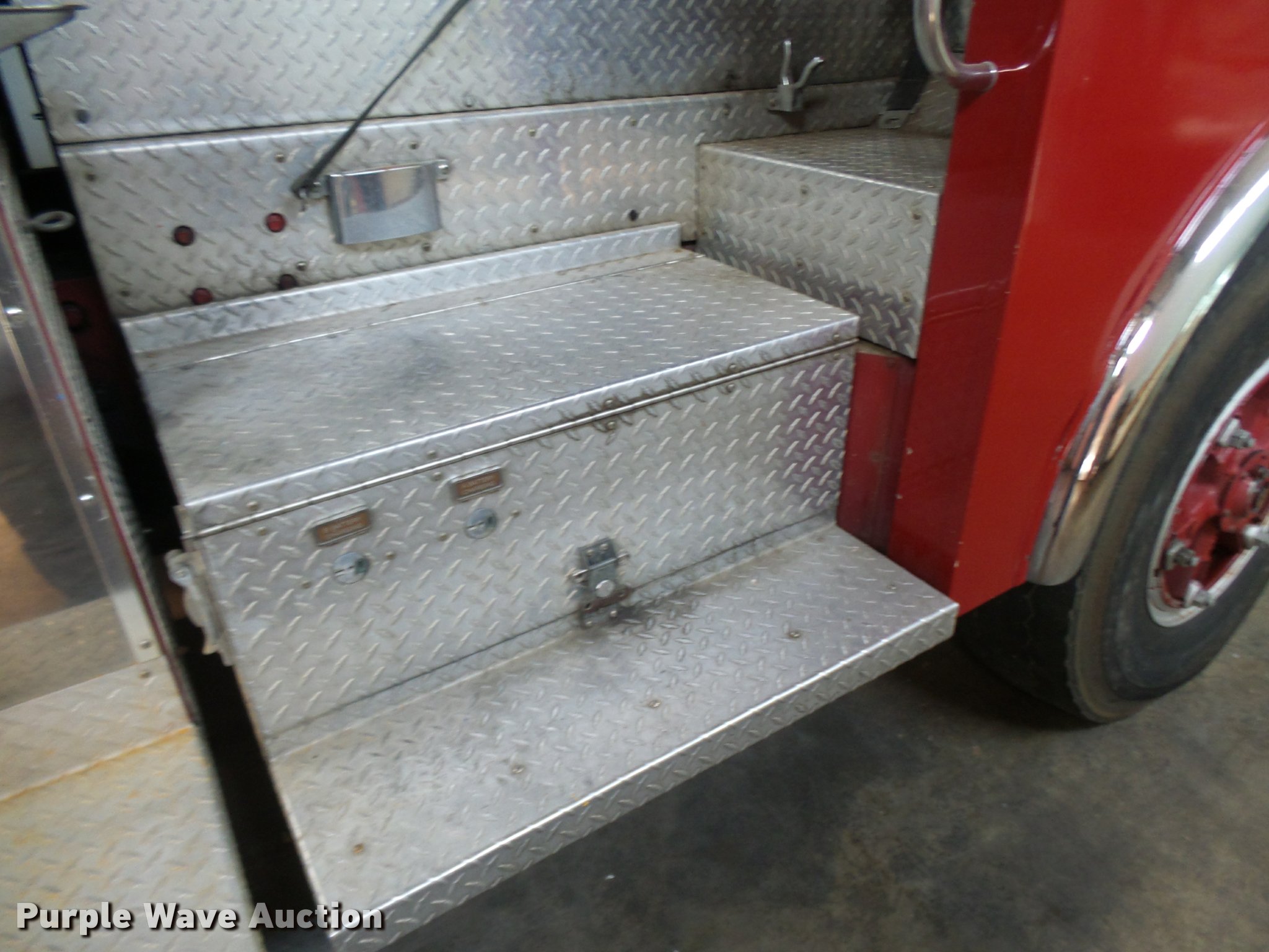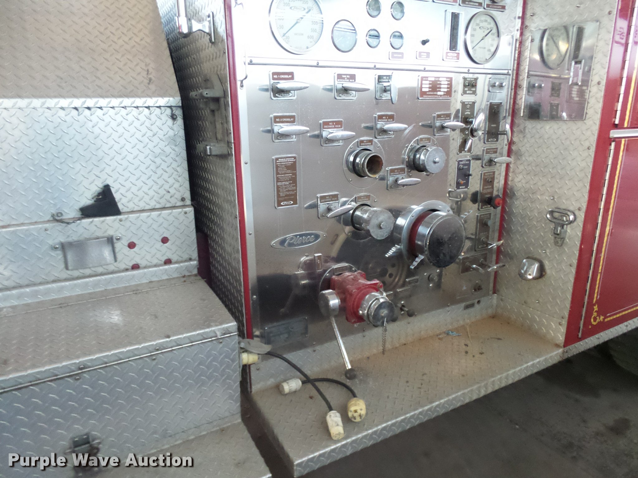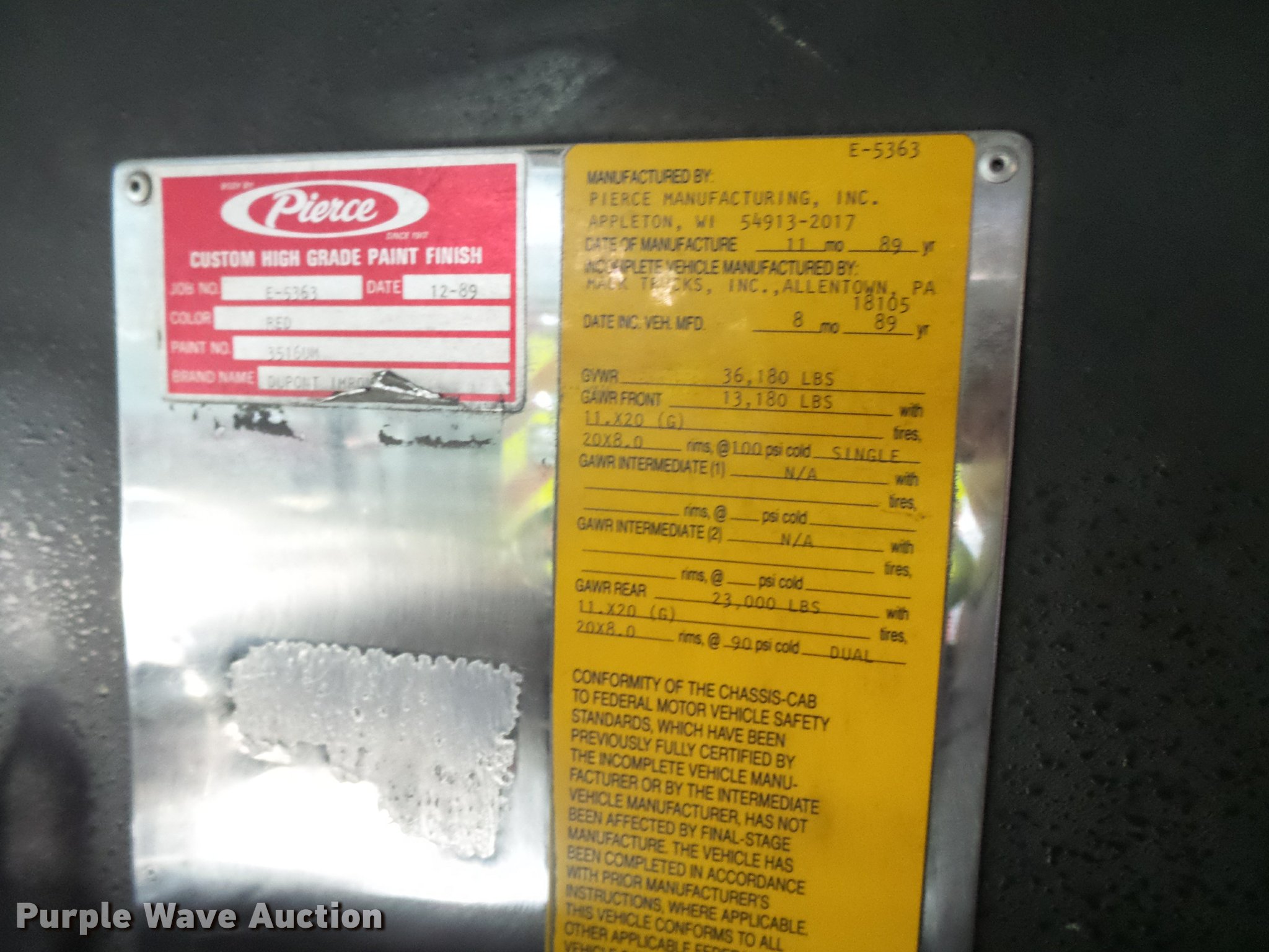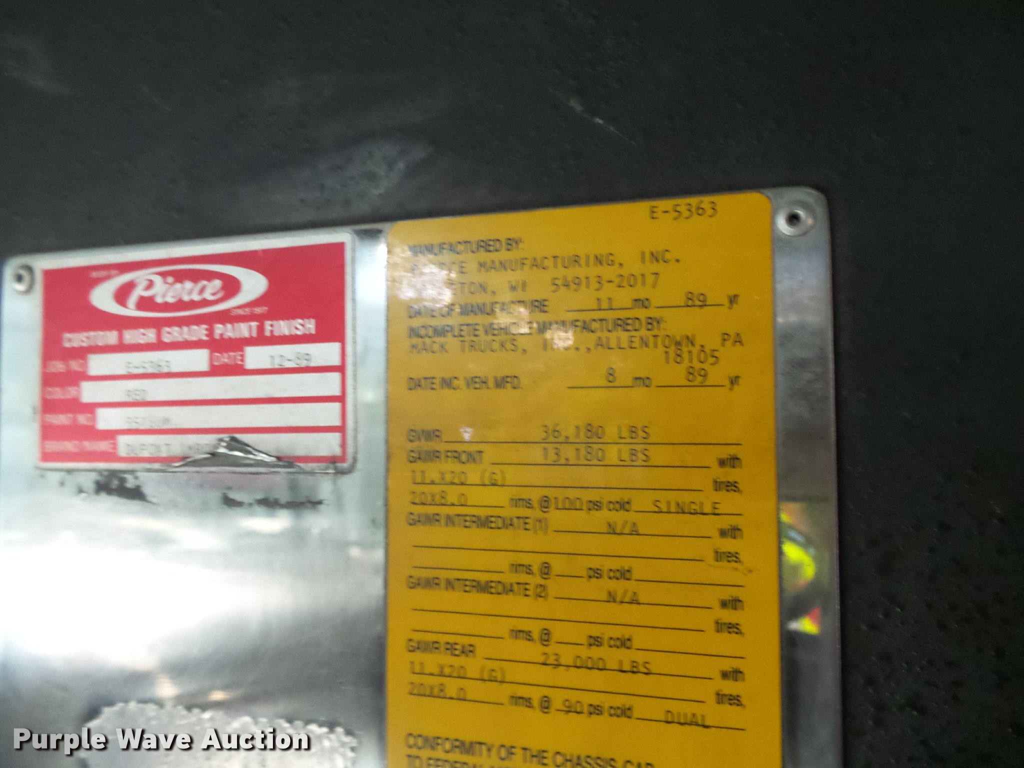 Purple Wave is selling a used Fire Truck or Emergency Vehicle in Kansas. This item is a 1990 Mack Pierce fire truck with the following: 3,909 miles on odometer, 2,938 hours on meter, Mack E6 11.0L L6 diesel engine, Automatic transmission, Manual windows and locks, Waterous pump, Model CM, 1,250 gpm, 600 max psi, Onan generator, Model 6DJBFJ30632C, 120/240V, Single phase, 6 kW, 11.00R20 tires