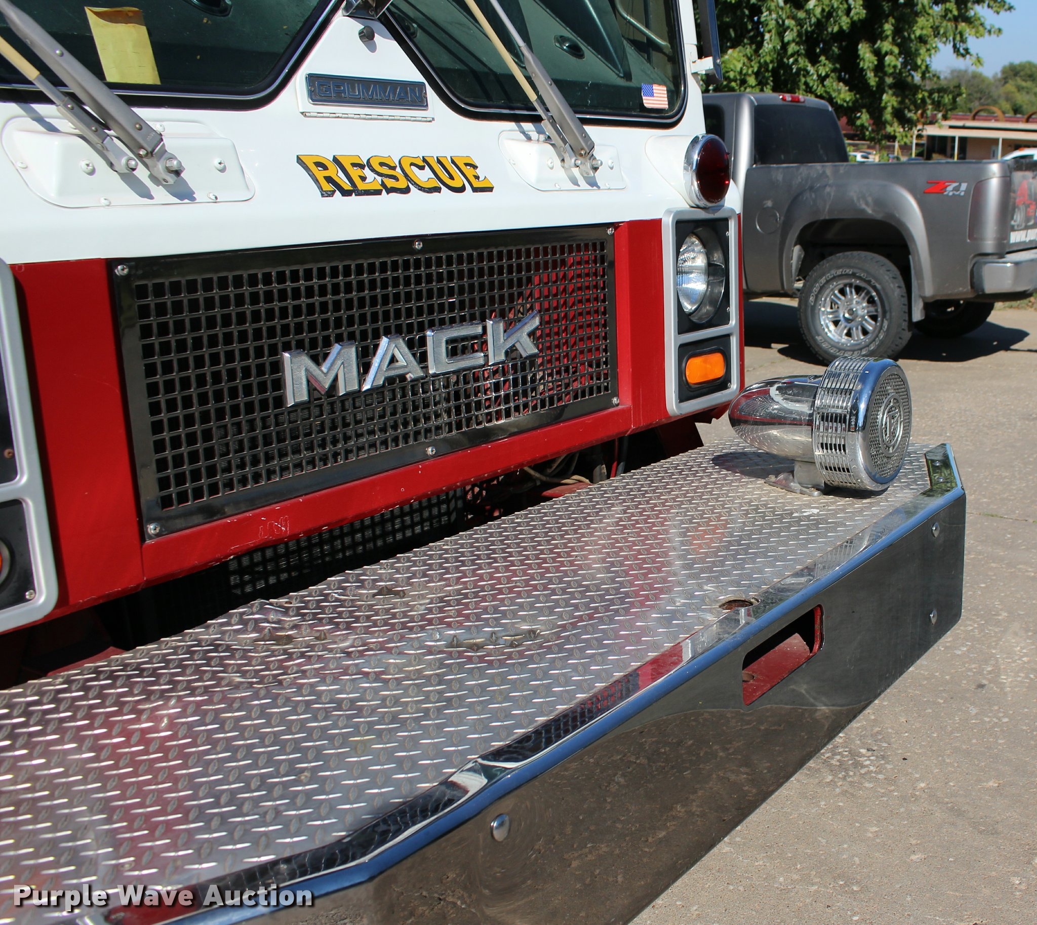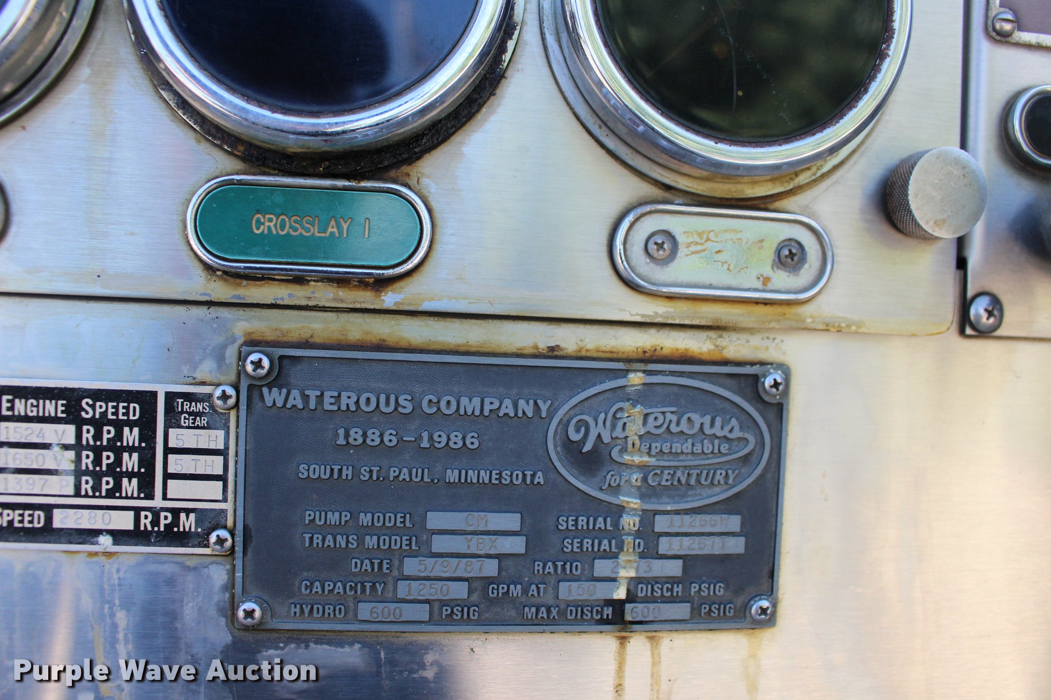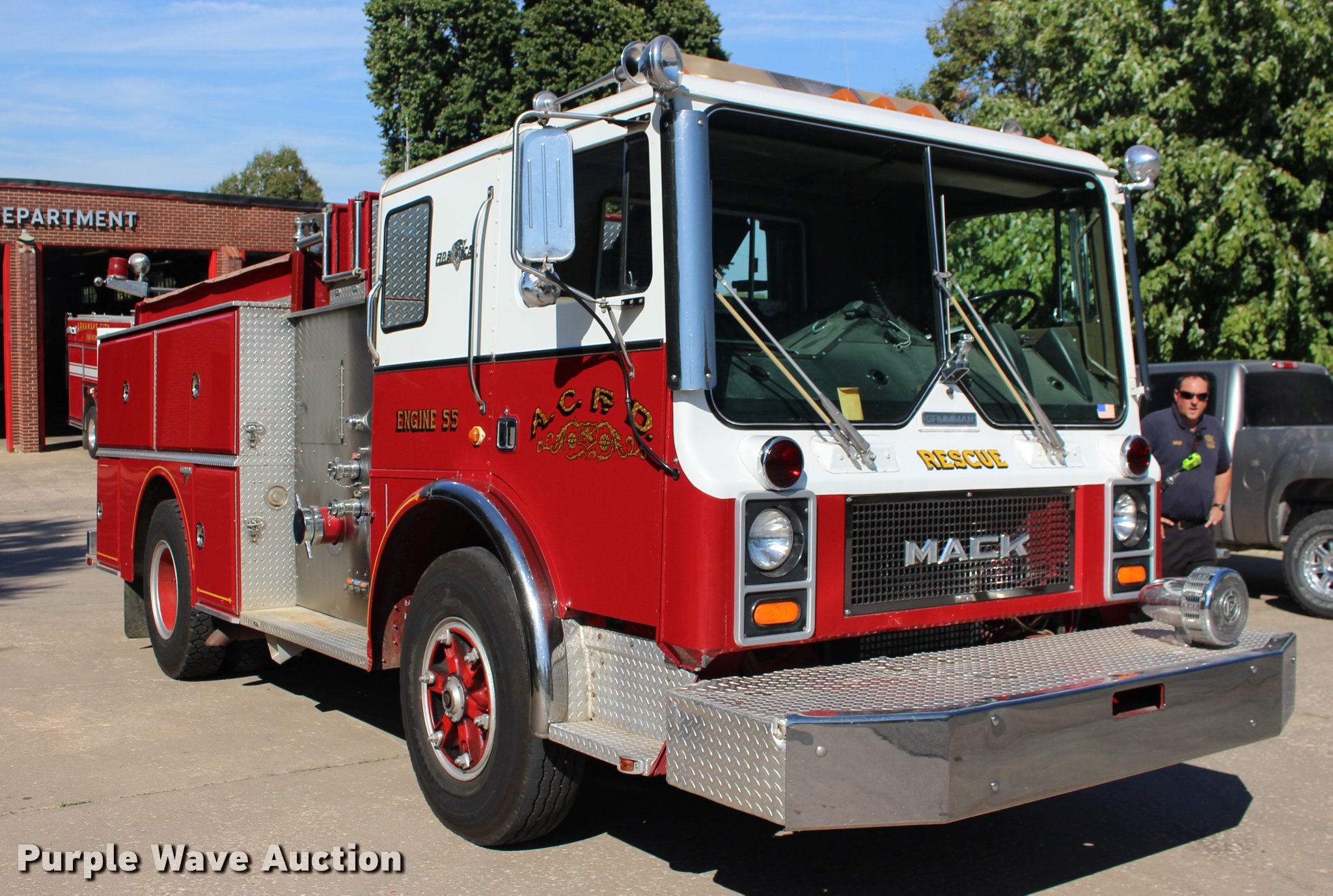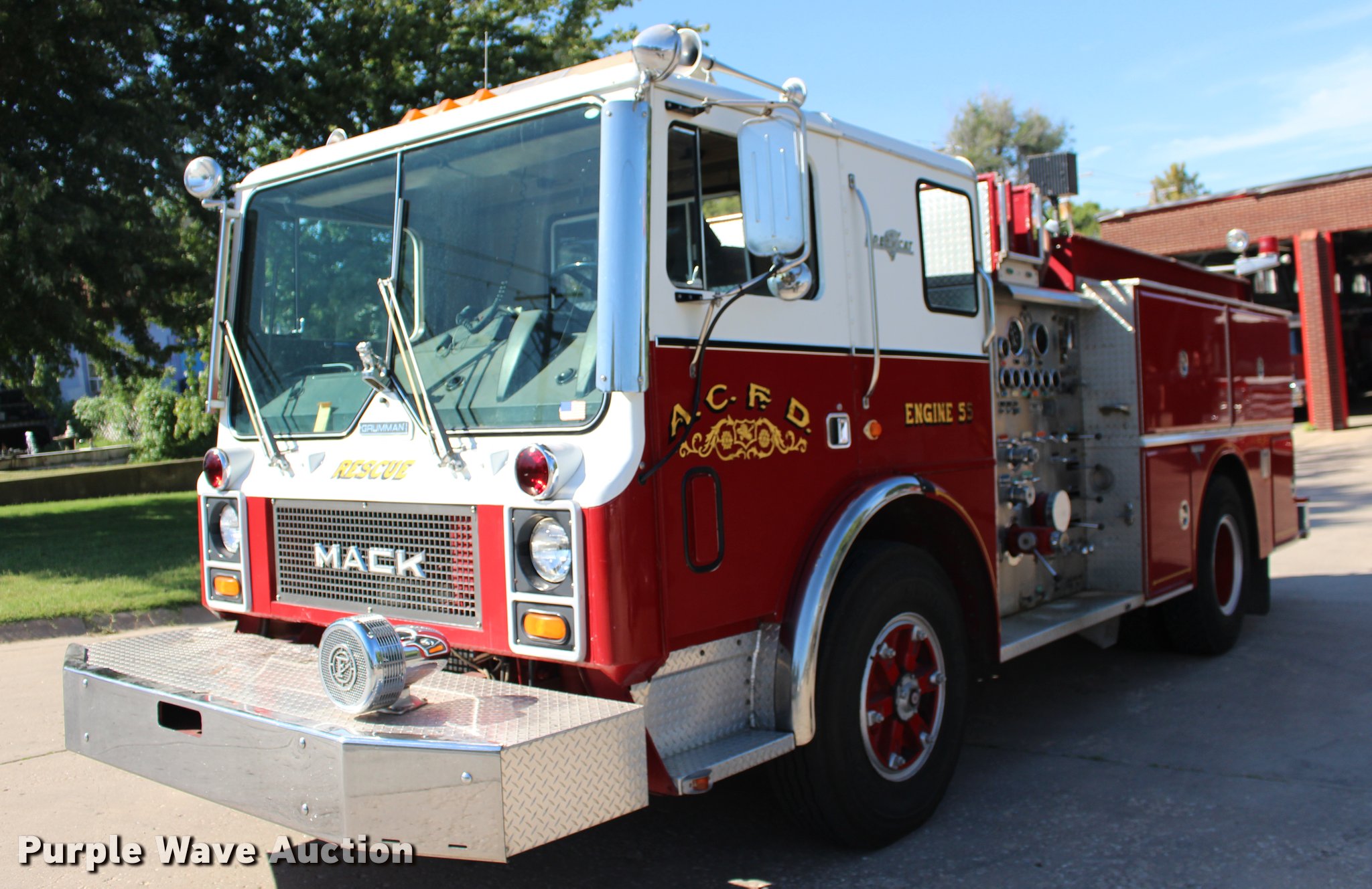 Purple Wave is selling a used Fire Truck or Emergency Vehicle in Kansas. This item is a 1987 Mack FC600 Firecat fire engine with the following: 4,310 miles on odometer, Mack E6 11.0L L6 diesel engine, Maxitorque five speed manual transmission, Manual windows and locks, Waterous pump, Model CM, 2:73 ratio, 1,250 gpm, 600 max psi, Dynamic power inverter, Air brakes, 11.00R20 tires, Dead battery