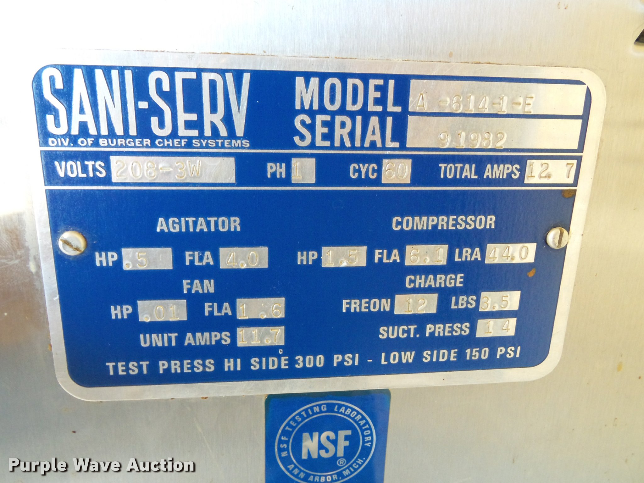 Purple Wave is selling a used Restaurant Equip. in Kansas. This item is a Sani Serv A-614-1-E soft serve ice cream machine with the following: 208-3W volts, Single phase, 5 HP agitator, .01 HP fan, 1.6 FLA, 11.7 amps, 1.5 HP compressor, 6.1 FLA, 44.0 LRA, Freon-12, 14 suct press, Serial 91982