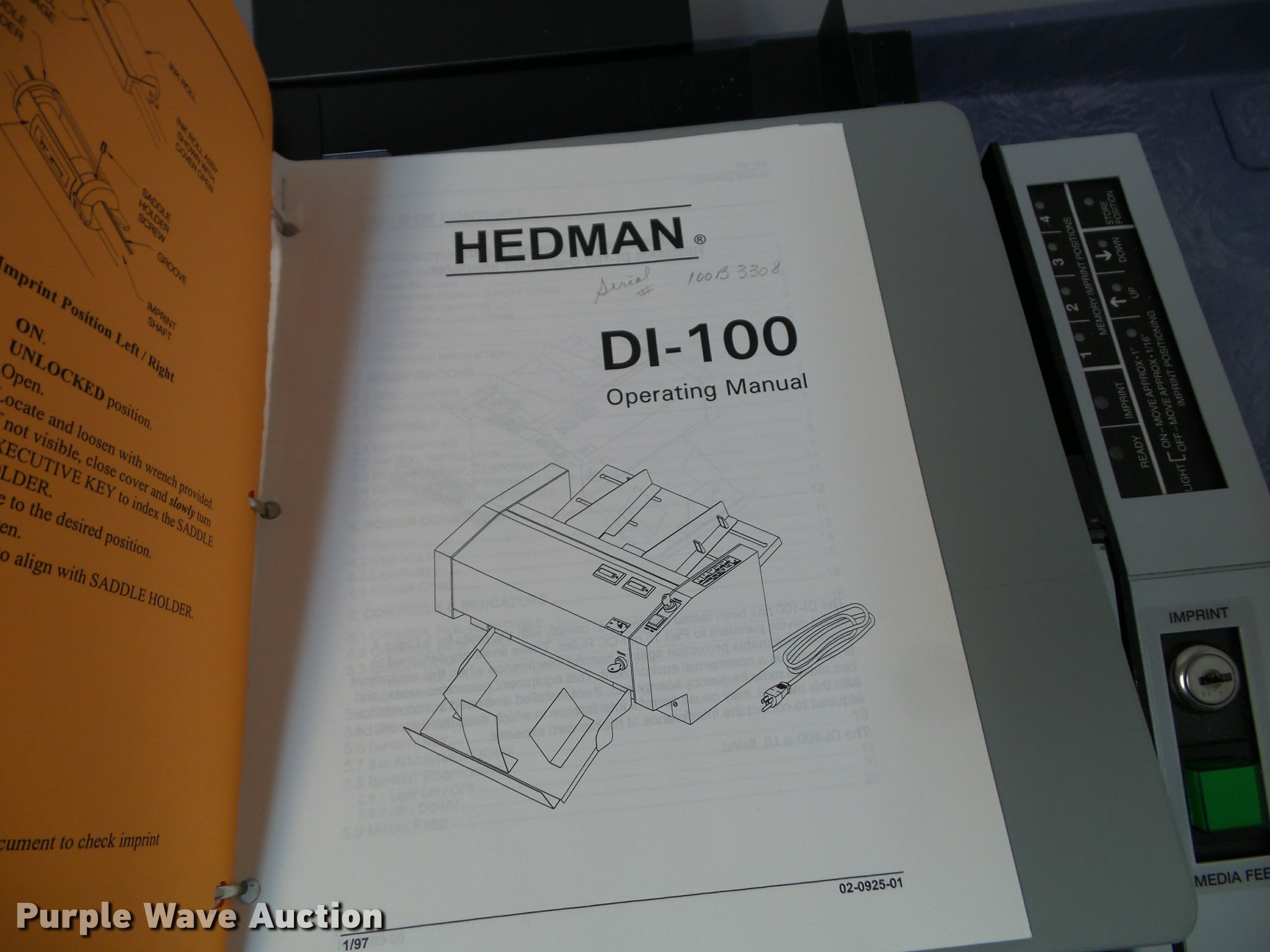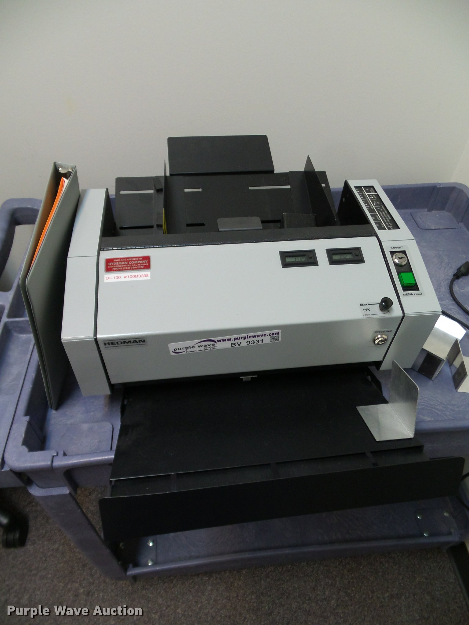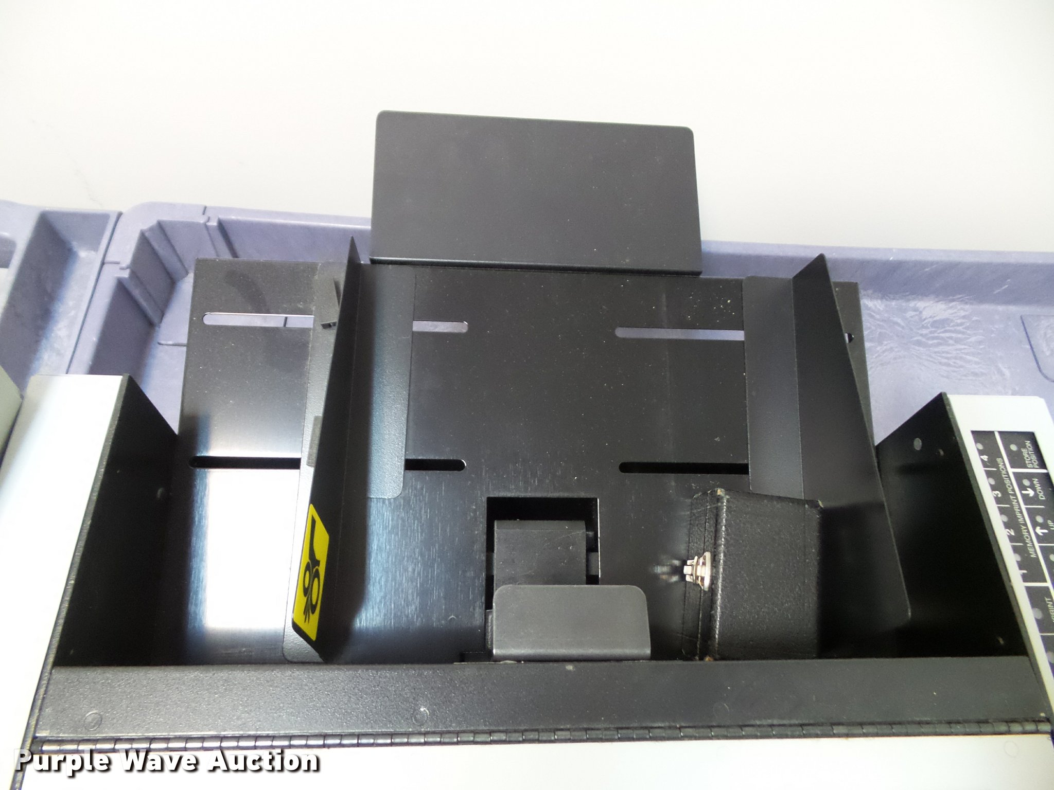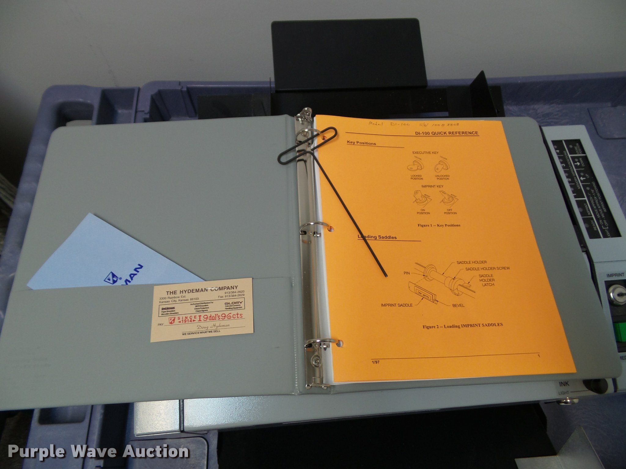 Purple Wave is selling a used Office Supplies and Equip. in Kansas. This item is a Hedman check signer with the following: Key, Tray, Manuals