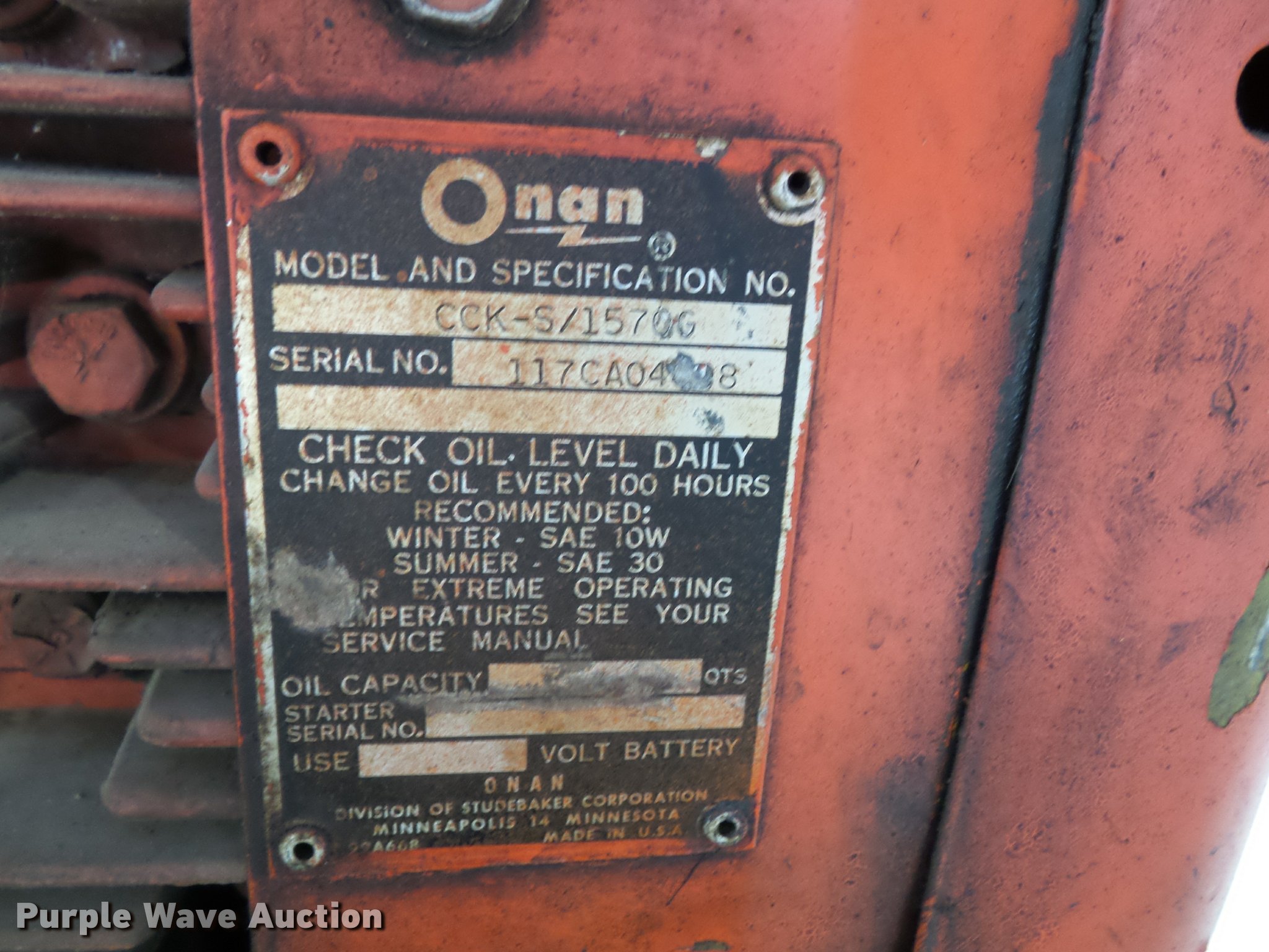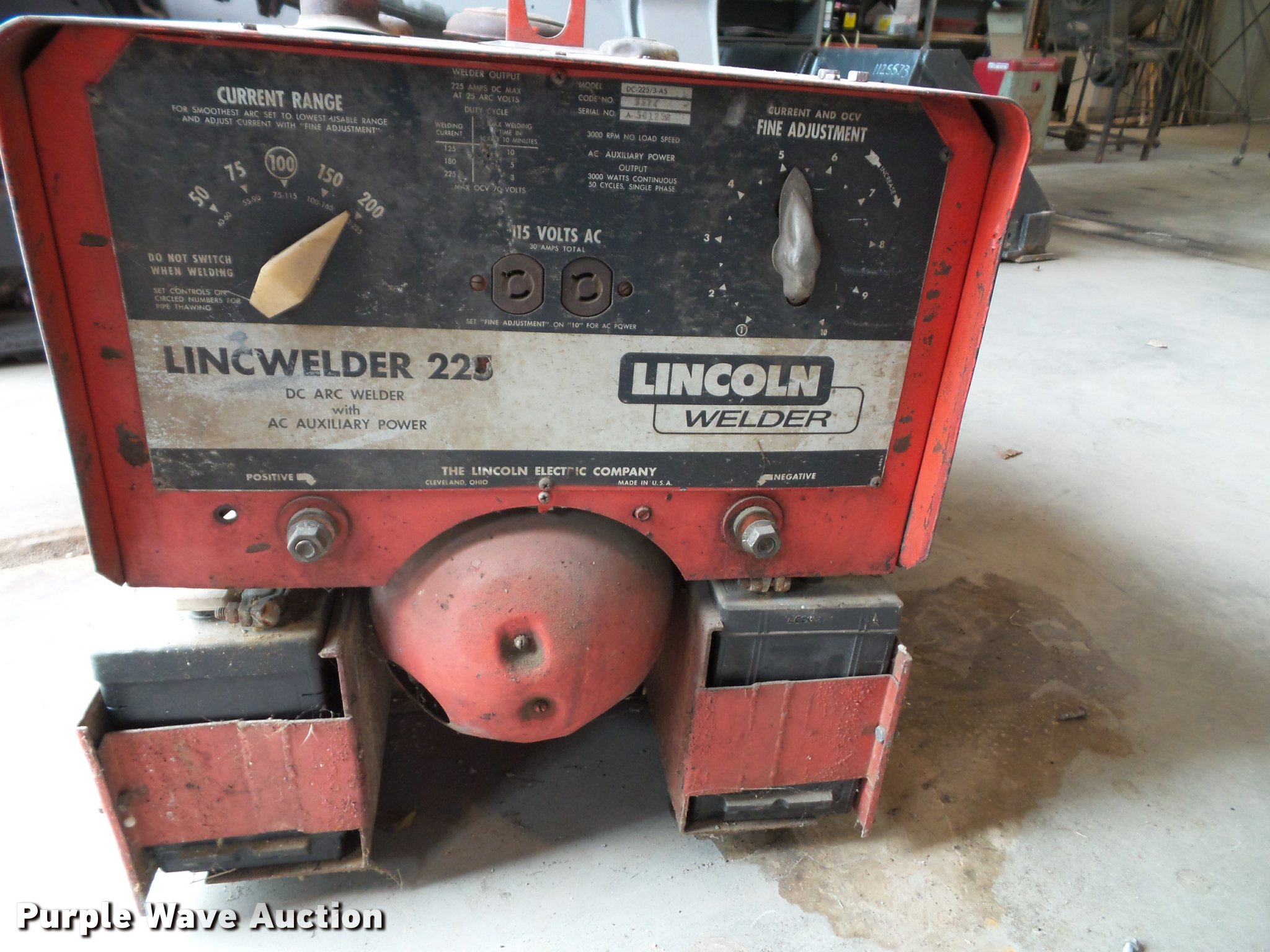 Purple Wave is selling a used Welder (Manual) in Kansas. This item is a Lincoln 225 welder with the following: Model DC-225/3-AS, DC arc welder with AC auxiliary power, Code# 5574, Serial A-501253, Onan engine, Model CCK-S11570G, Unknown operating condition, Serial 117CA0408,, 24V starting unit