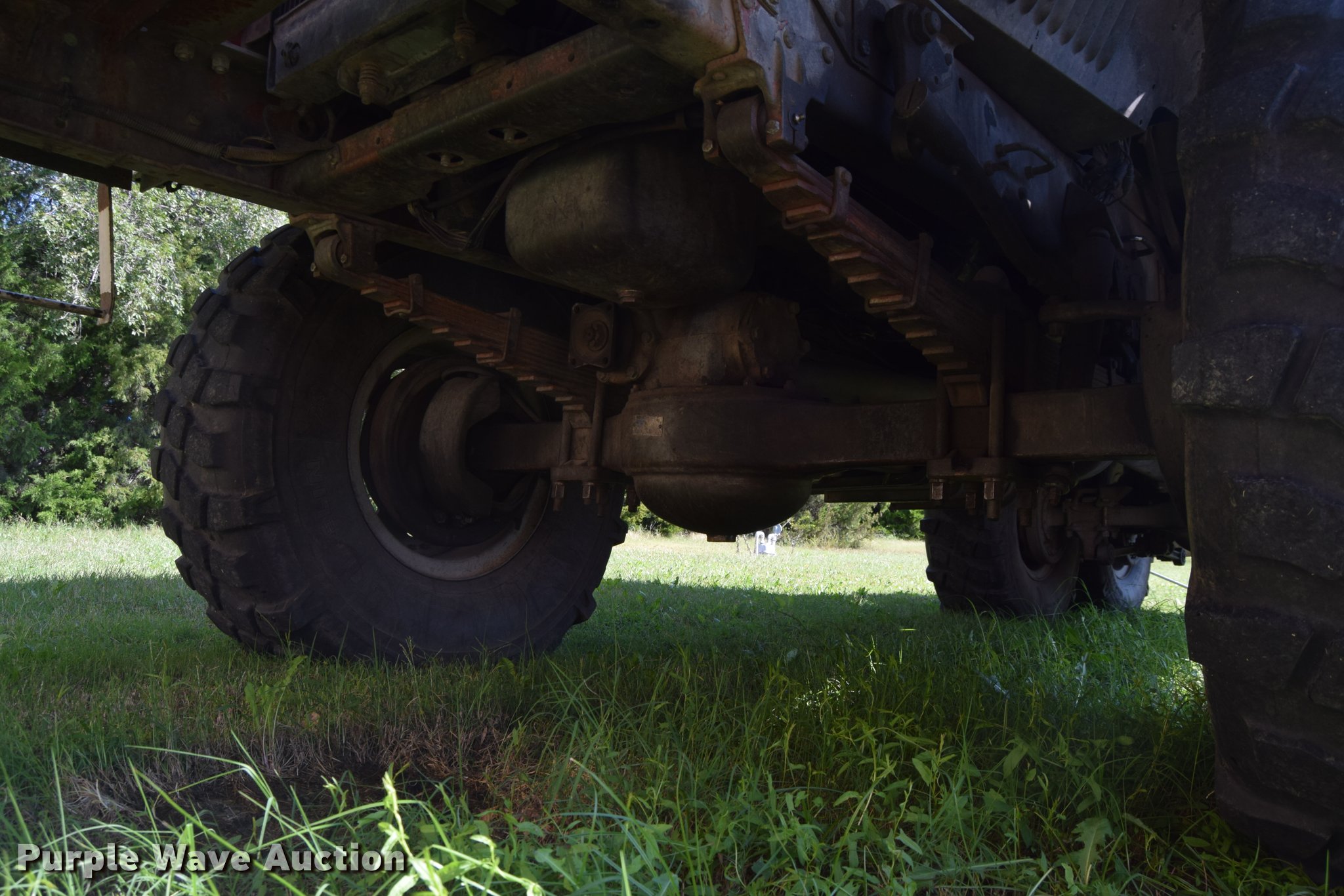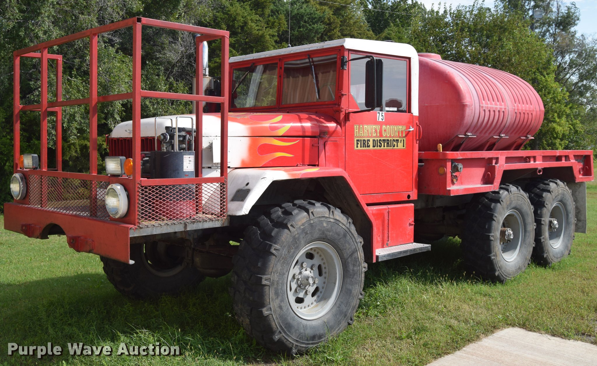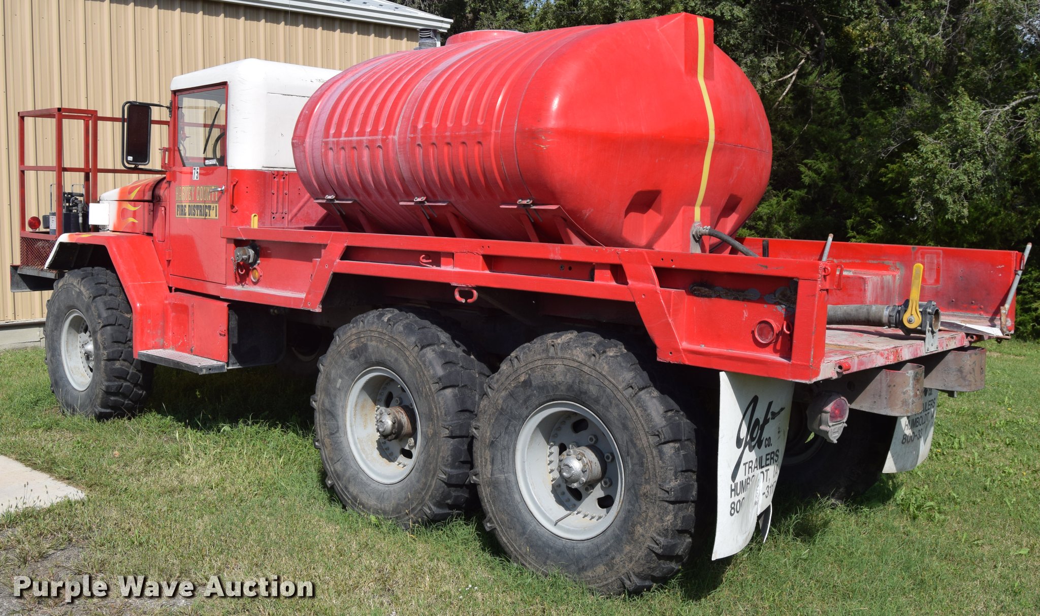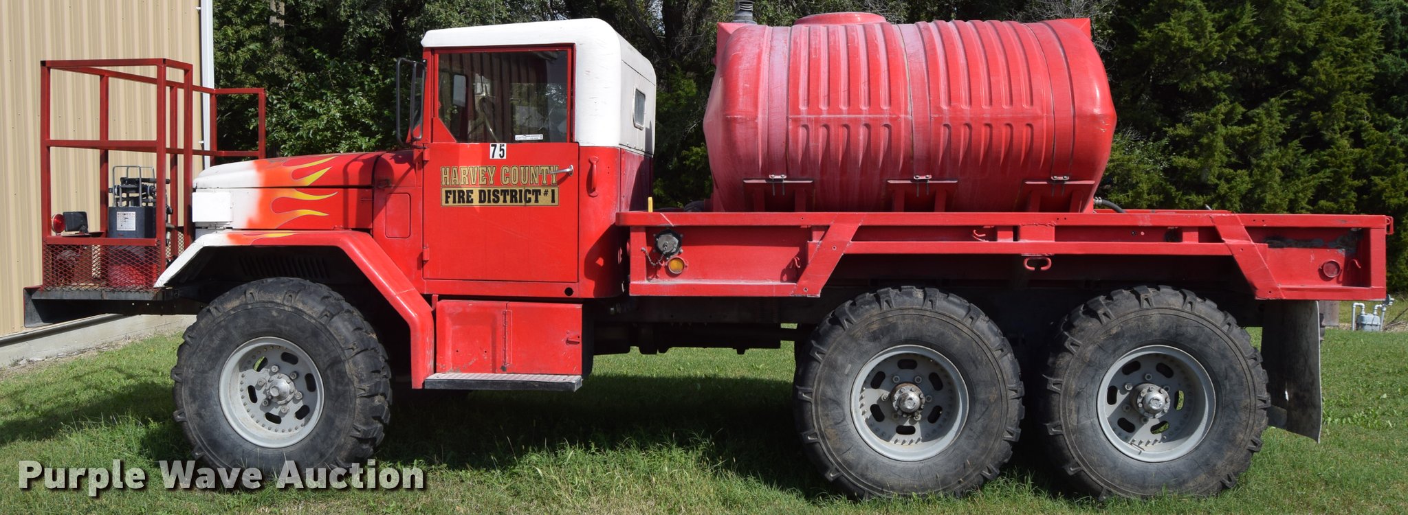 1968 Kaiser Jeep M35 flatbed truck. 7,177 miles on odometer, 1,119 hours on meter, Six cylinder multi-fuel engine, Five speed manual transmission, Two speed rear end, Six wheel drive, Lights, 147"L x 7'W bed, 1,000 gallon poly tank, Foam inducer, 5,000 lbs max payload capacity, 50 gallon fuel tank, Spring suspesion, 160" wheelbase, Selectable front end, Custom wheels, 395/85R20 tires, Passenger window broken. Kansas title. 35310468033210170. Harvey County Fire District #1. 122 Main. Walton, KS 67151