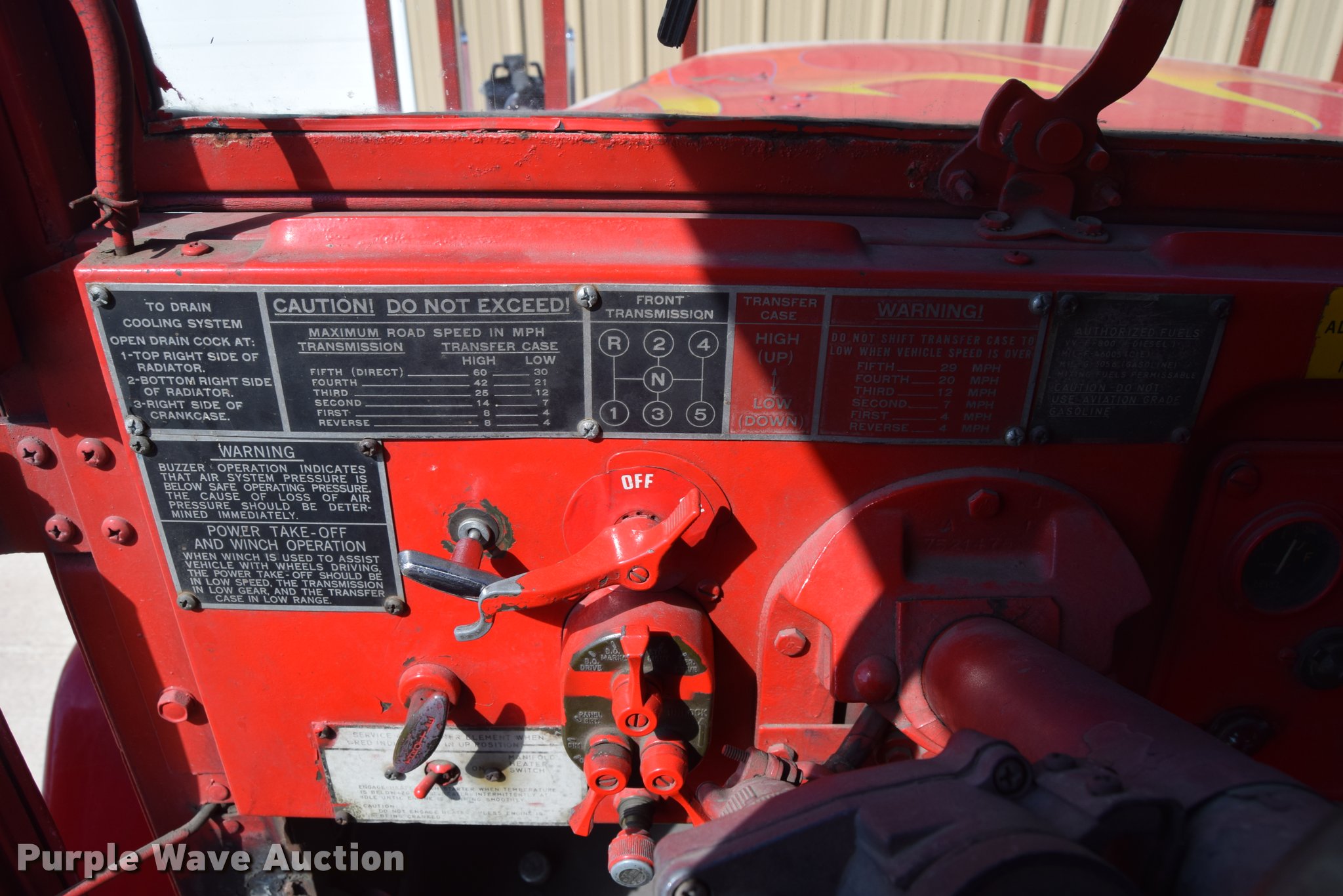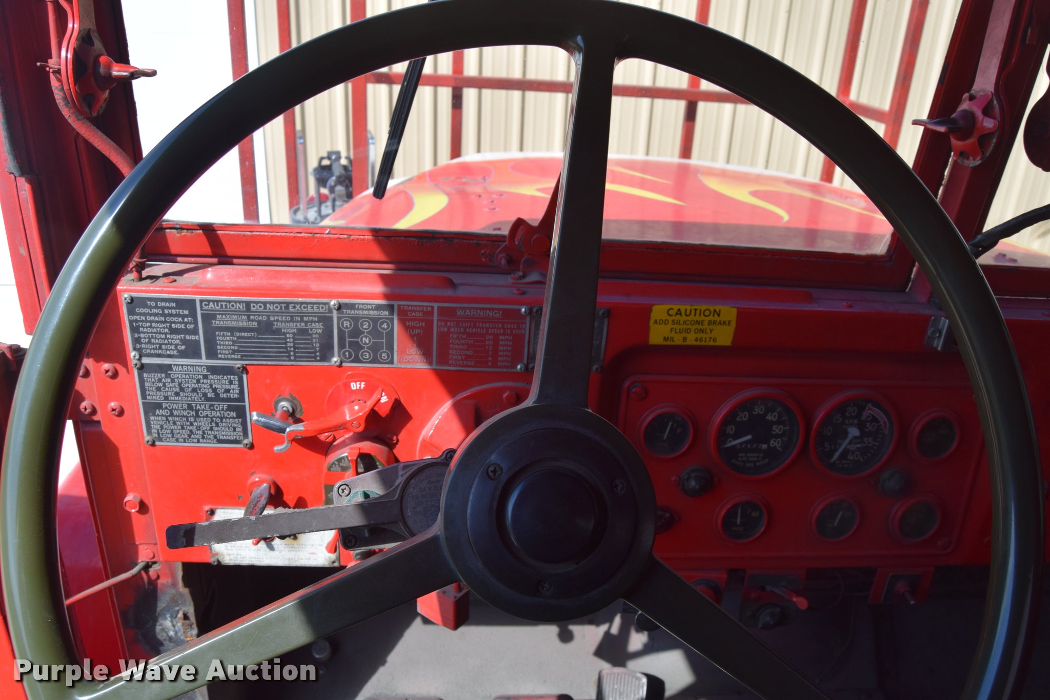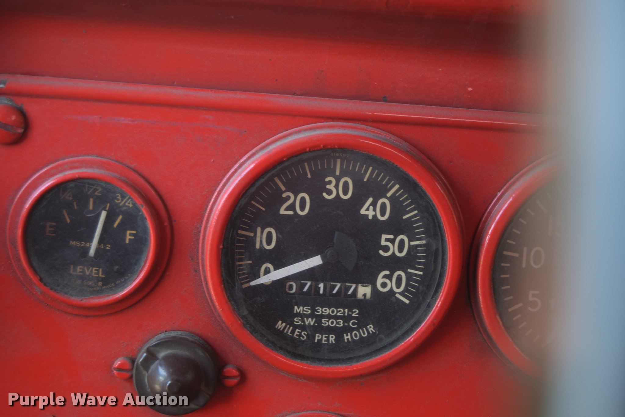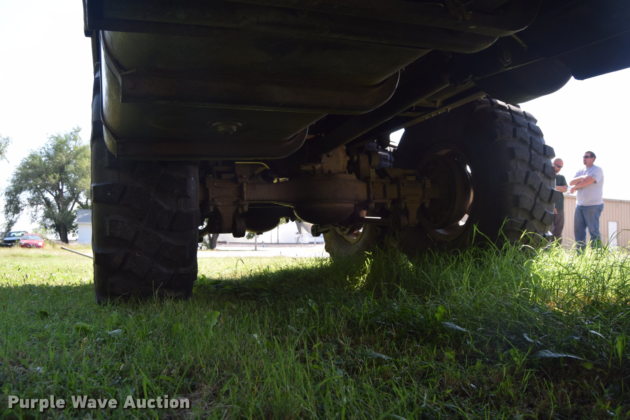 1968 Kaiser Jeep M35 flatbed truck. 7,177 miles on odometer, 1,119 hours on meter, Six cylinder multi-fuel engine, Five speed manual transmission, Two speed rear end, Six wheel drive, Lights, 147"L x 7'W bed, 1,000 gallon poly tank, Foam inducer, 5,000 lbs max payload capacity, 50 gallon fuel tank, Spring suspesion, 160" wheelbase, Selectable front end, Custom wheels, 395/85R20 tires, Passenger window broken. Kansas title. 35310468033210170. Harvey County Fire District #1. 122 Main. Walton, KS 67151
