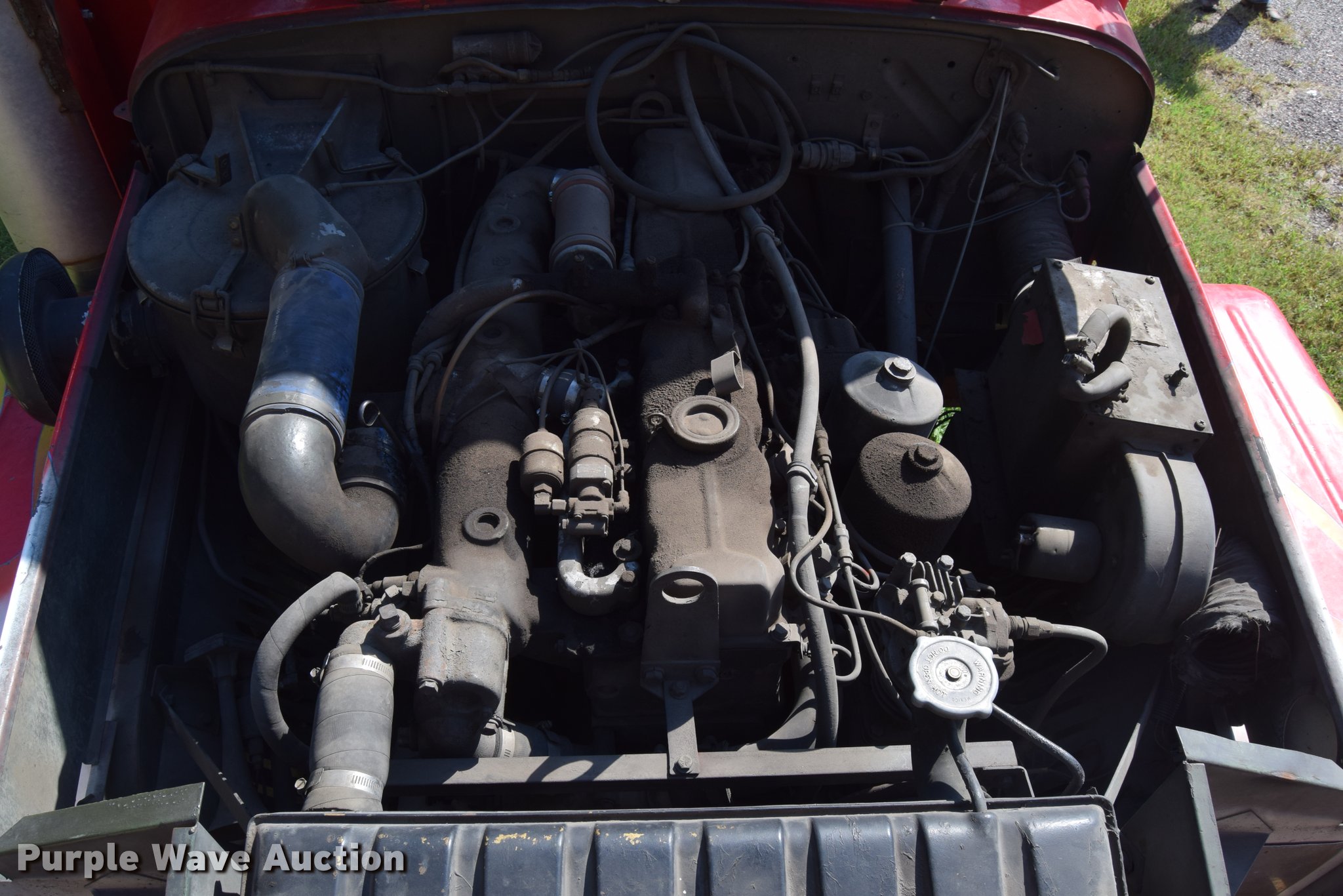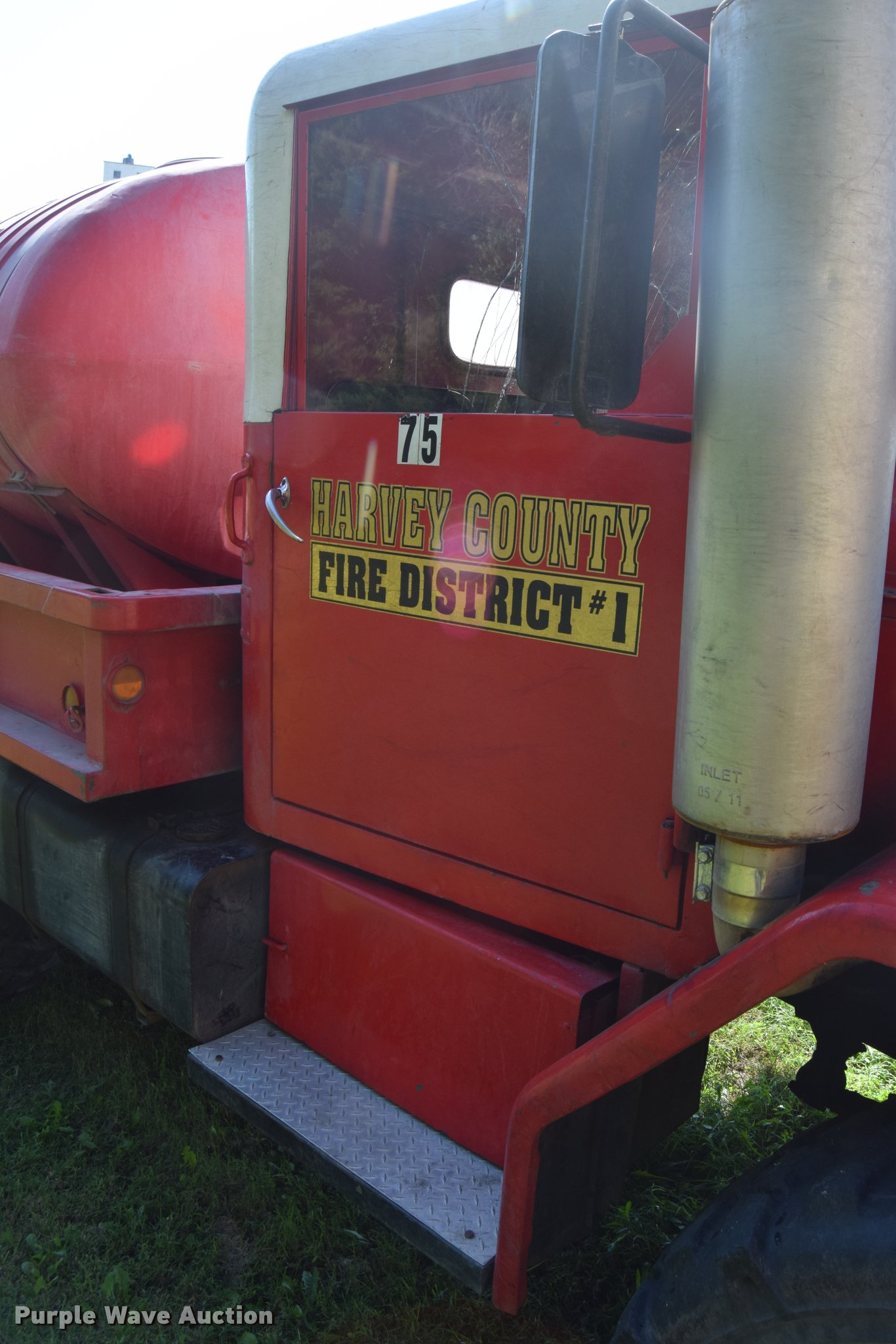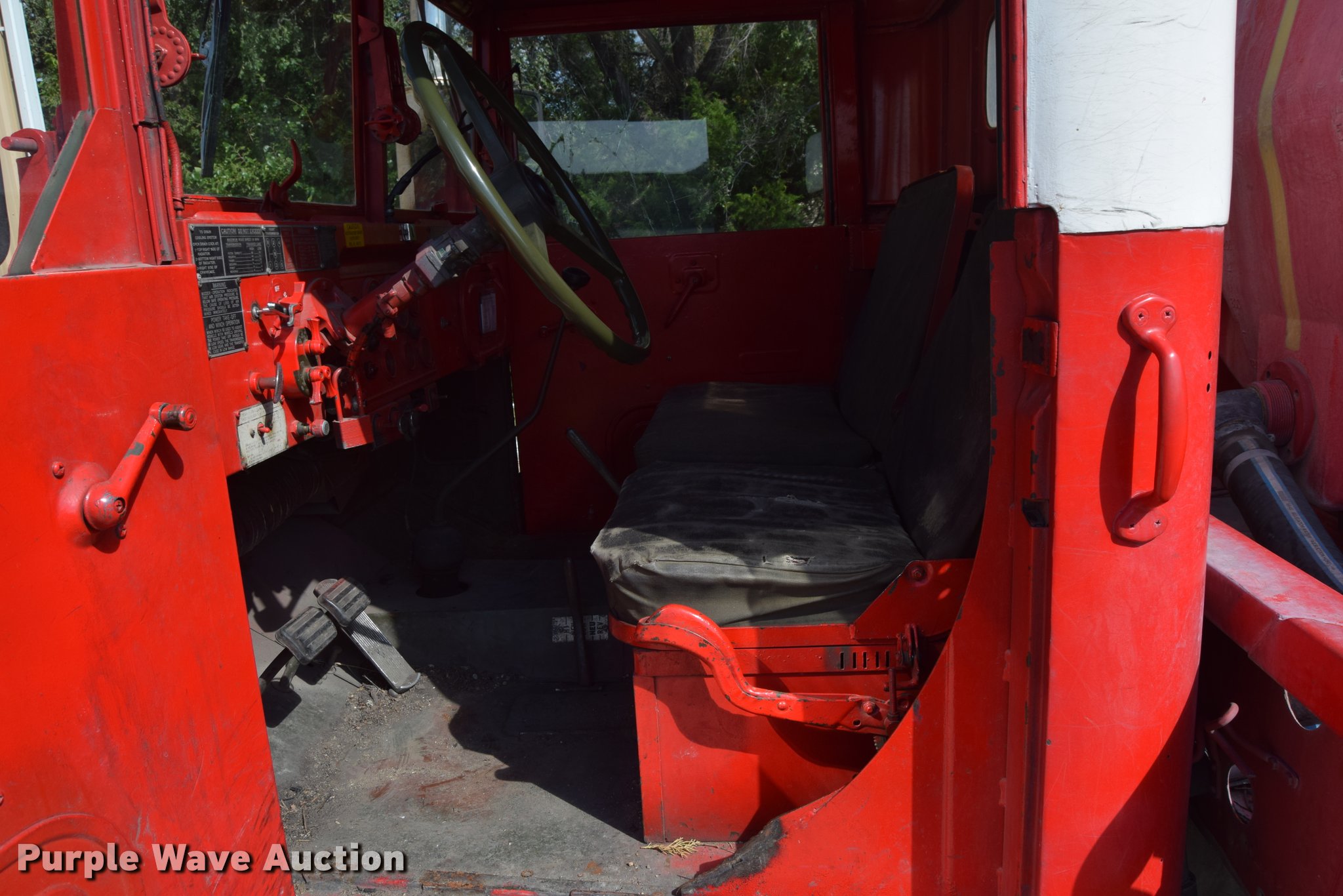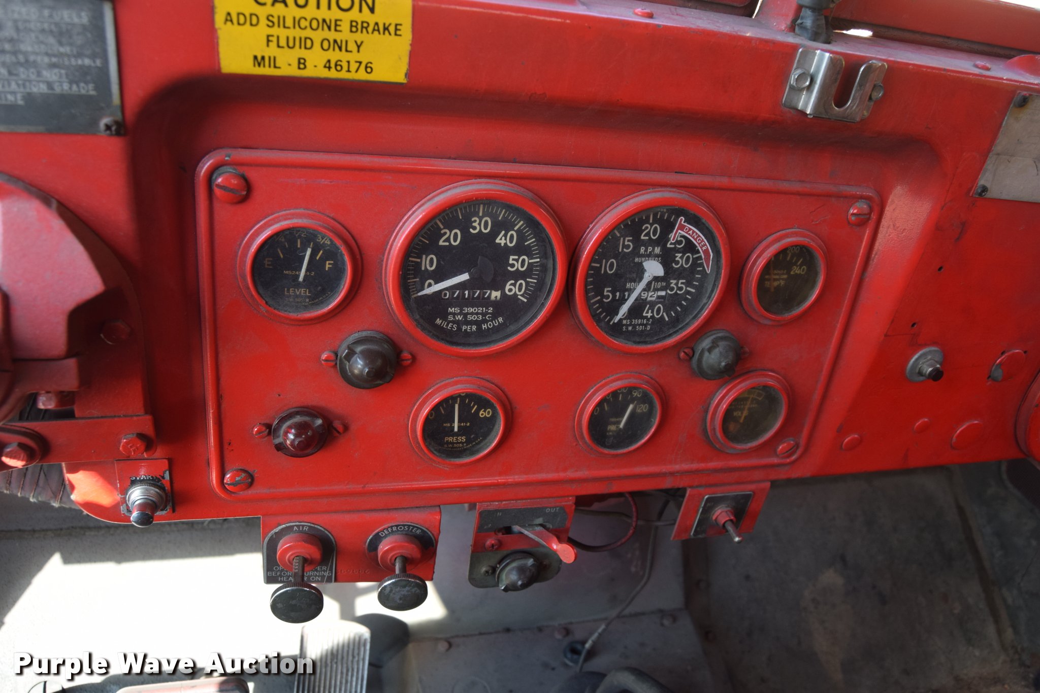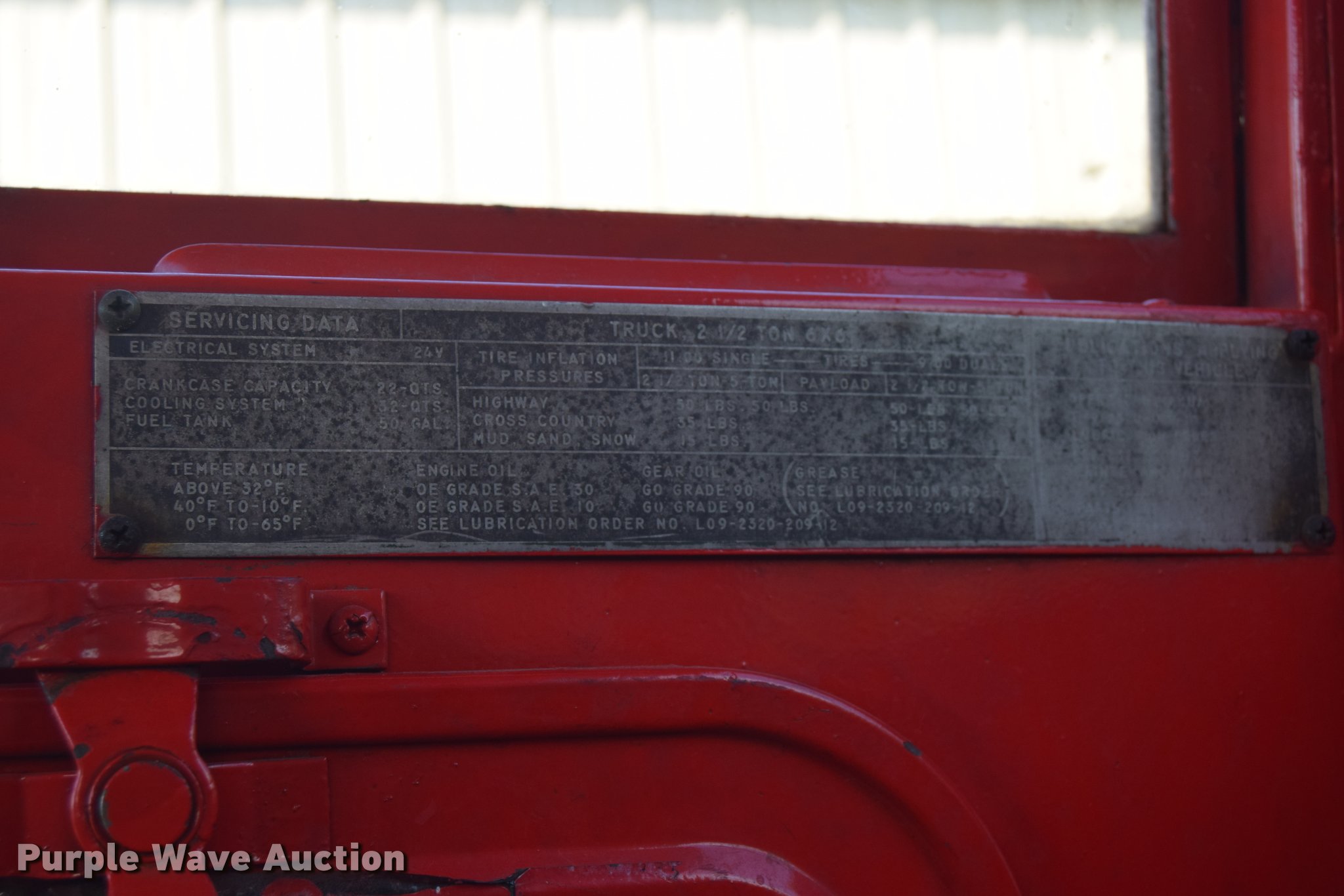 1968 Kaiser Jeep M35 flatbed truck. 7,177 miles on odometer, 1,119 hours on meter, Six cylinder multi-fuel engine, Five speed manual transmission, Two speed rear end, Six wheel drive, Lights, 147"L x 7'W bed, 1,000 gallon poly tank, Foam inducer, 5,000 lbs max payload capacity, 50 gallon fuel tank, Spring suspesion, 160" wheelbase, Selectable front end, Custom wheels, 395/85R20 tires, Passenger window broken. Kansas title. 35310468033210170. Harvey County Fire District #1. 122 Main. Walton, KS 67151