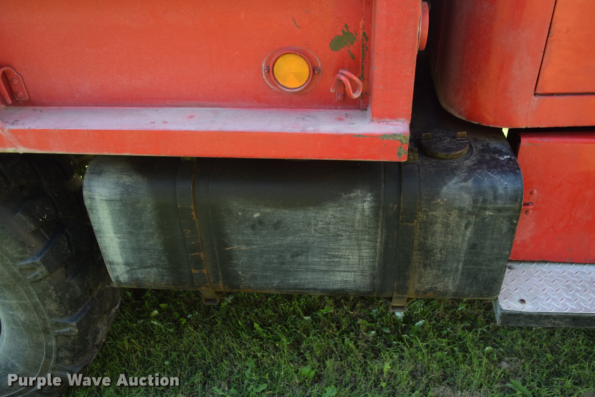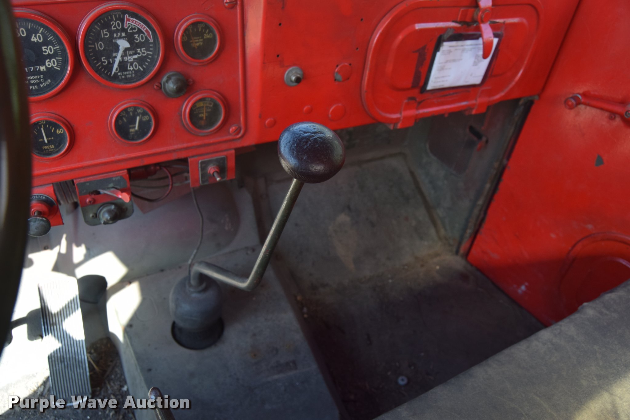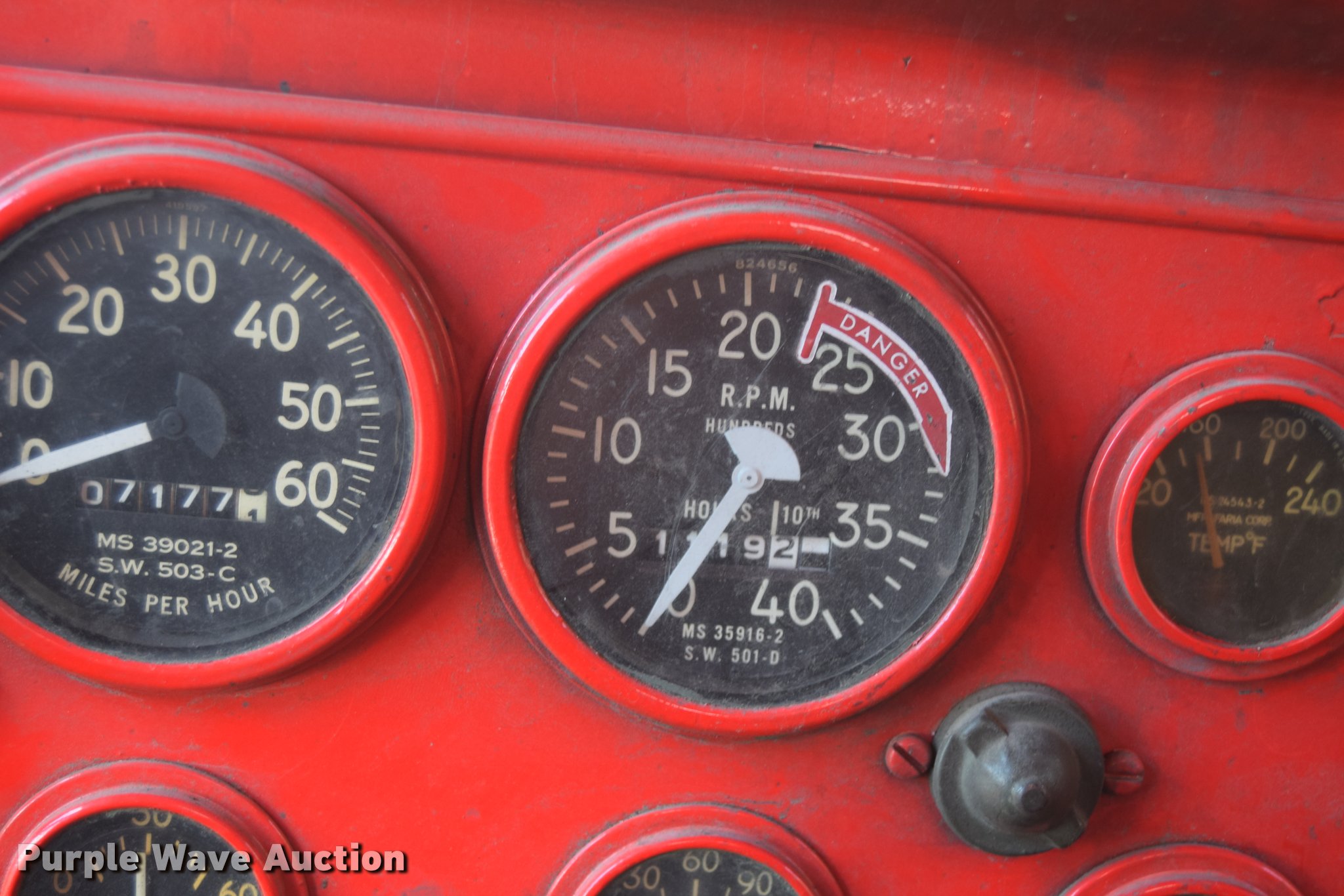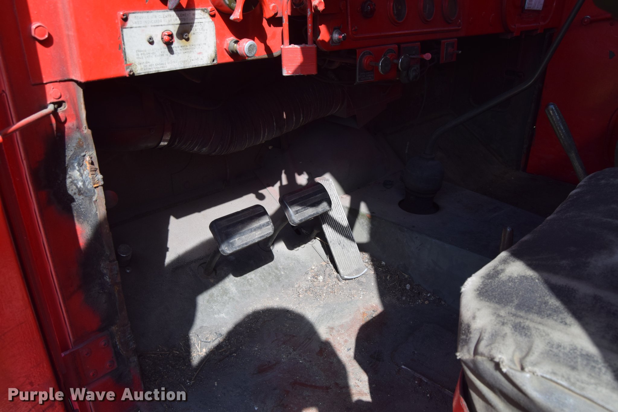 1968 Kaiser Jeep M35 flatbed truck. 7,177 miles on odometer, 1,119 hours on meter, Six cylinder multi-fuel engine, Five speed manual transmission, Two speed rear end, Six wheel drive, Lights, 147"L x 7'W bed, 1,000 gallon poly tank, Foam inducer, 5,000 lbs max payload capacity, 50 gallon fuel tank, Spring suspesion, 160" wheelbase, Selectable front end, Custom wheels, 395/85R20 tires, Passenger window broken. Kansas title. 35310468033210170. Harvey County Fire District #1. 122 Main. Walton, KS 67151