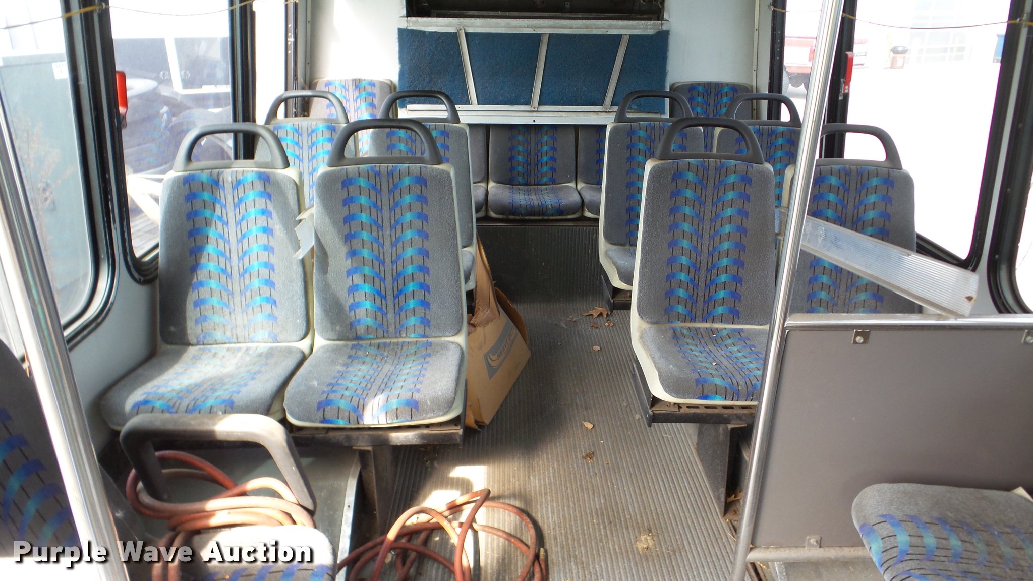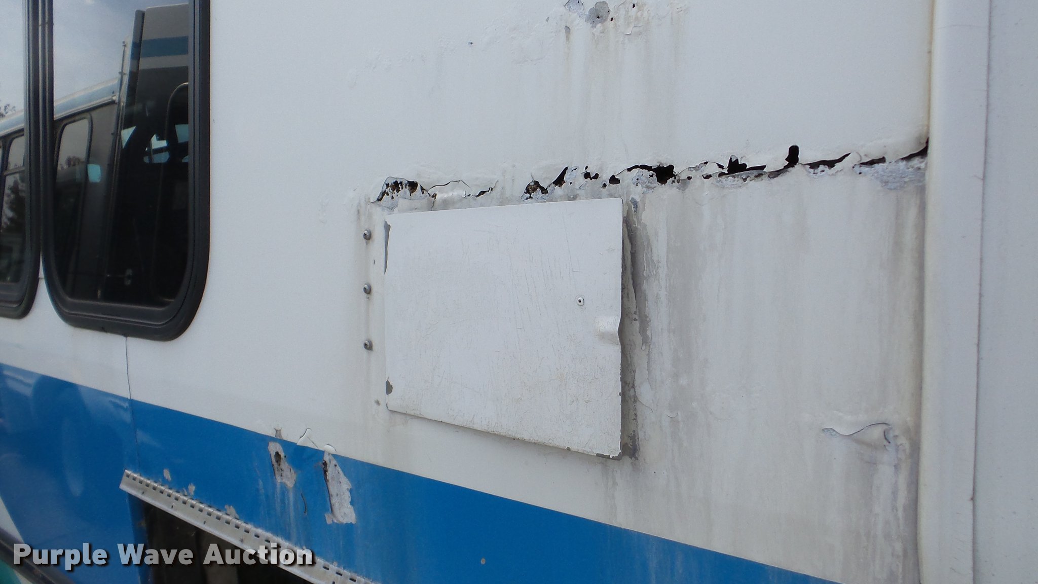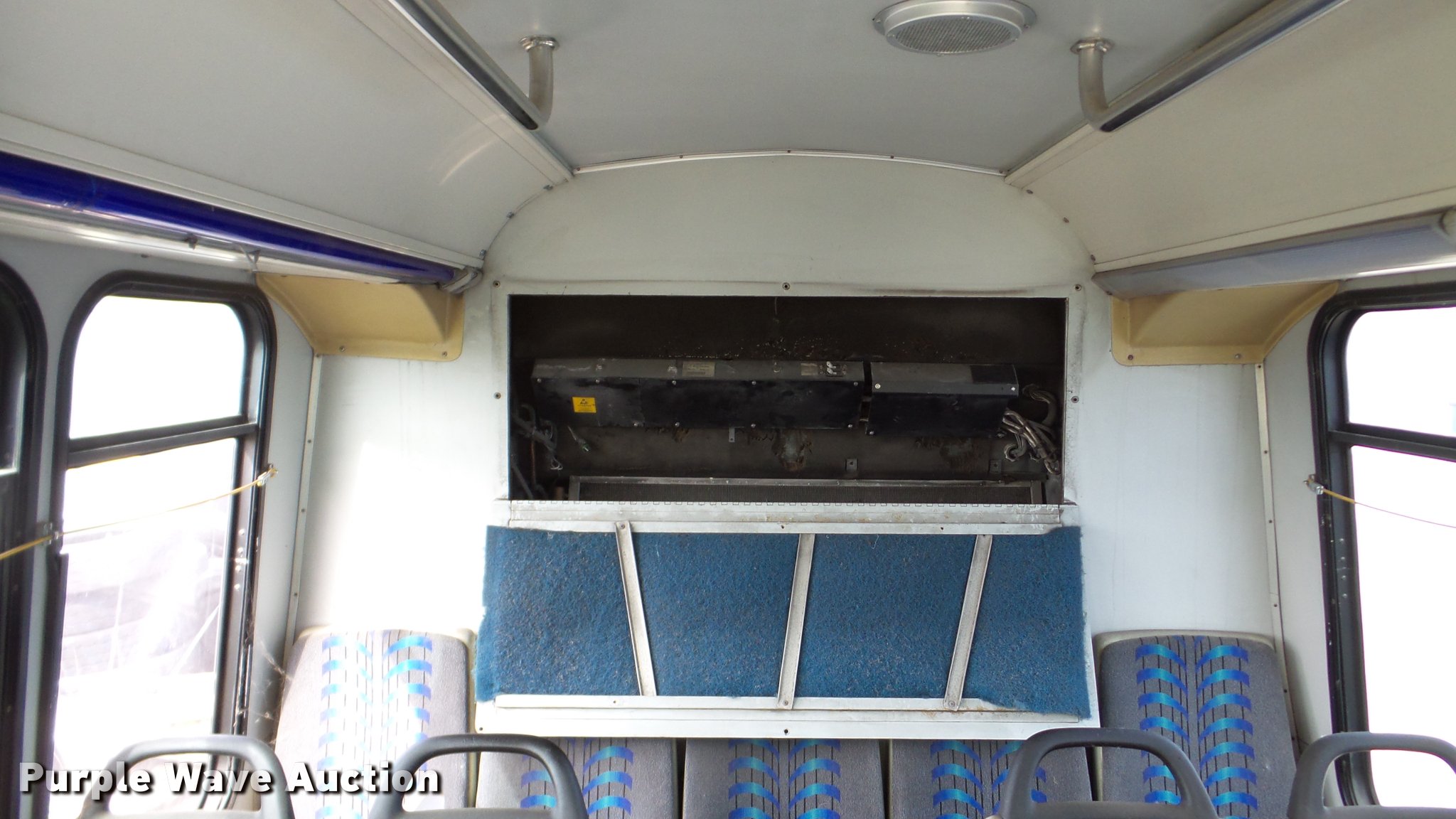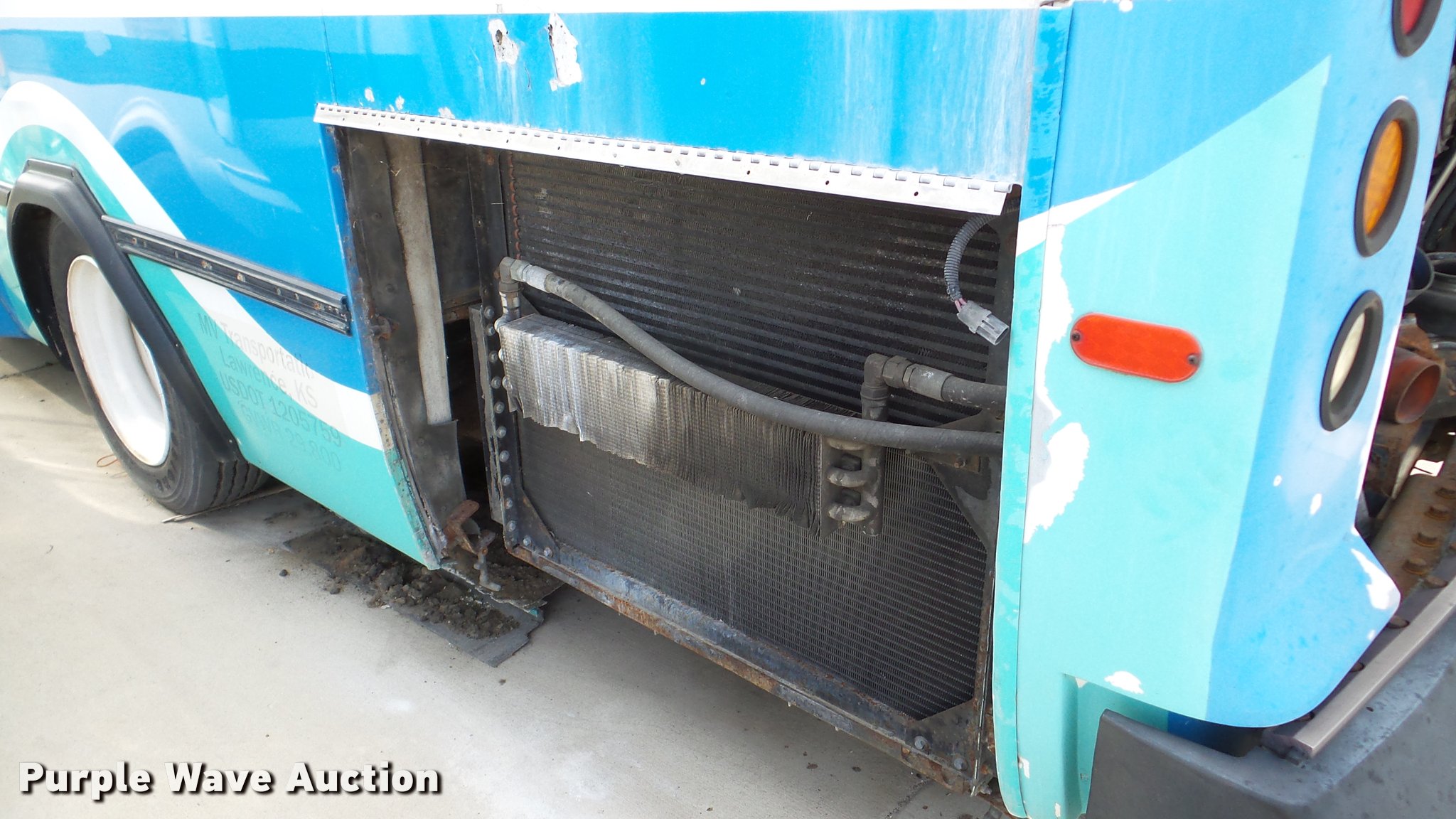 Purple Wave is selling a used Bus in Kansas. This item is a 2002 Neoplan Eldorado National shuttle bus with the following: 30,479 miles on odometer, Actual mileage unknown, 22,595 miles on hubodometer, 2,607 hours on meter, Cummins 5.9L L6 diesel engine, Automatic transmission, Single axle, AC and heat, Air suspension seat, Ceiling handrail, 25 passenger capacity, Ceiling, rear, and side emergency egress, Air suspension, Air brakes, 138" wheelbase, 255/70R22.5 tires, GVWR 29,800 lbs, Non-operational unit, parts missing