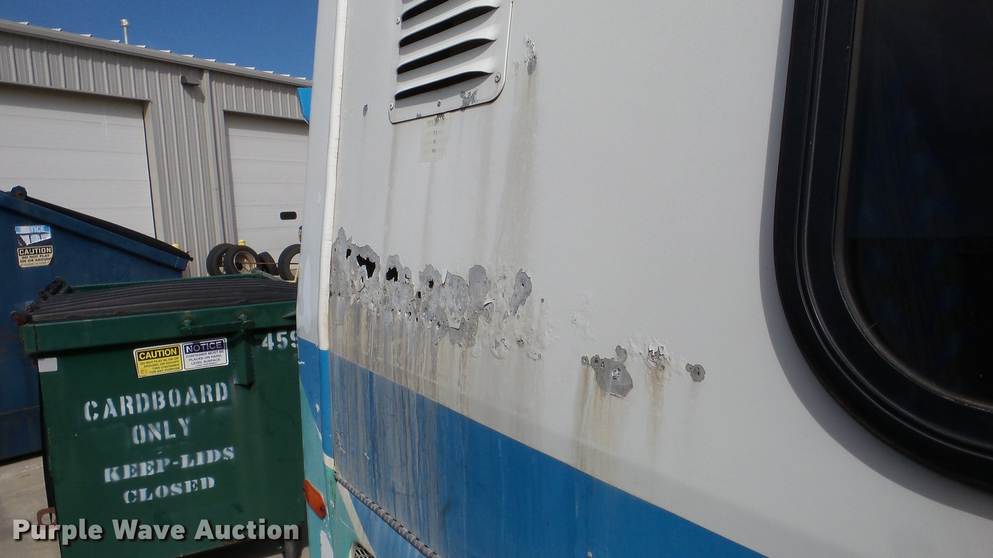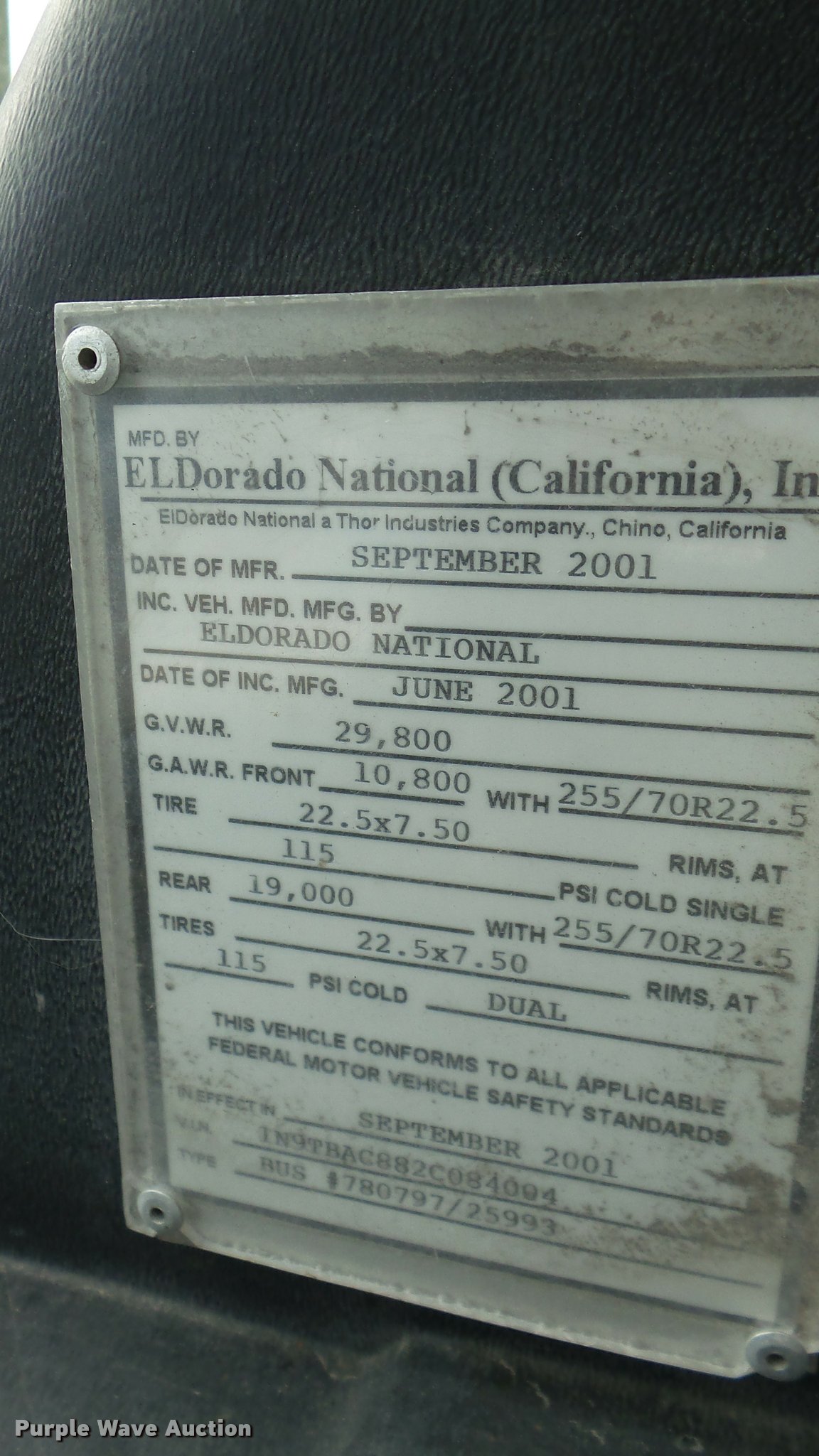 2002 Neoplan Eldorado National shuttle bus. 30,479 miles on odometer Actual mileage unknown, 22,595 miles on hubodometer, 2,607 hours on meter, Cummins 5.9L L6 diesel engine, Automatic transmission, Single axle, AC and heat, Air suspension seat, Ceiling handrail, 25 passenger capacity, Ceiling, rear, and side emergency egress, Air suspension, Air brakes, 138" wheelbase, 255/70R22.5 tires, GVWR 29,800 lbs, Non-operational unit, parts missing. Kansas title. Seller is a government entity who will be assigning and distributing the title. Please contact the seller for distribution questions. 1N9TBAC882C084004. 1260 Timberedge Rd. Lawrence, KS 66046