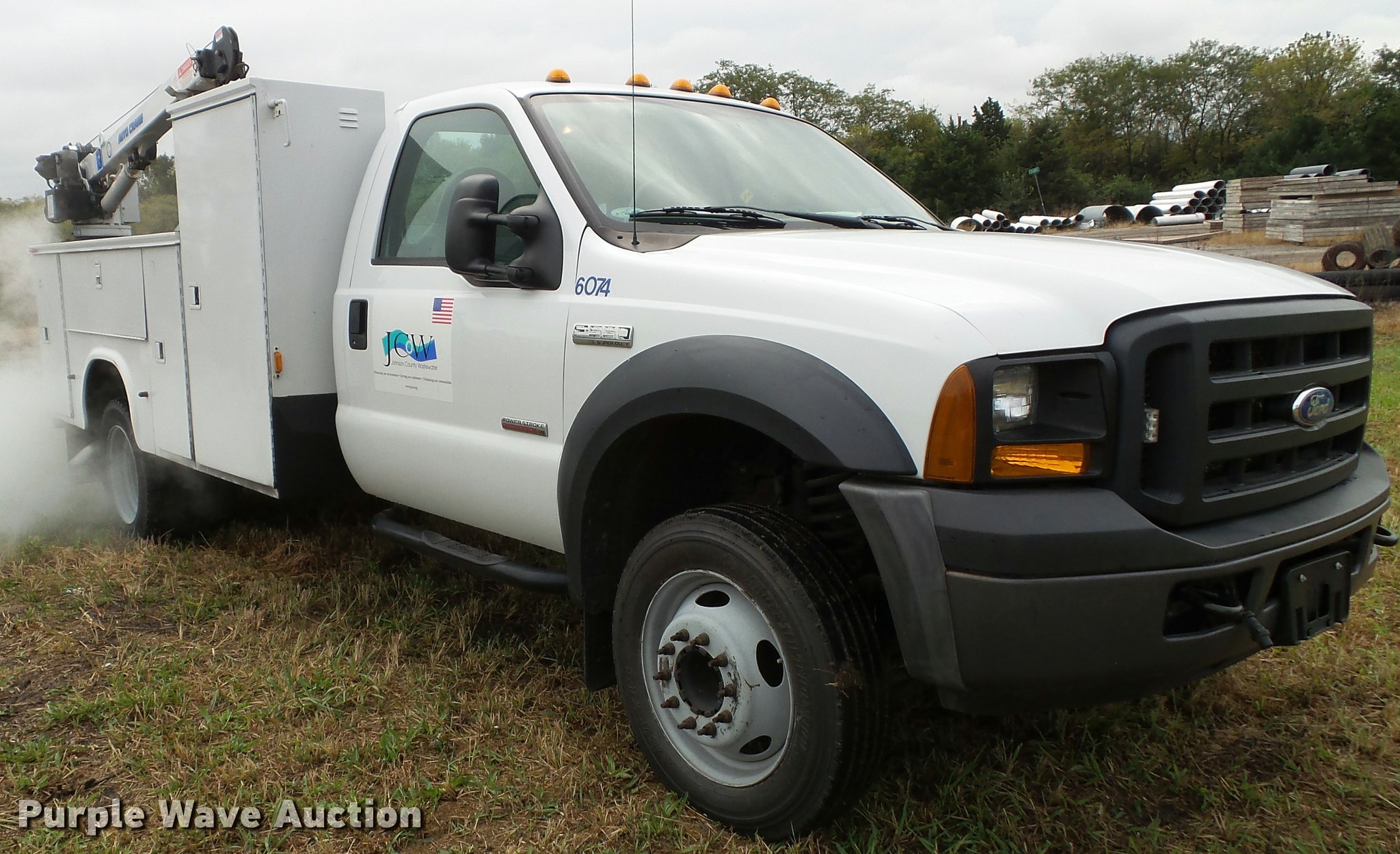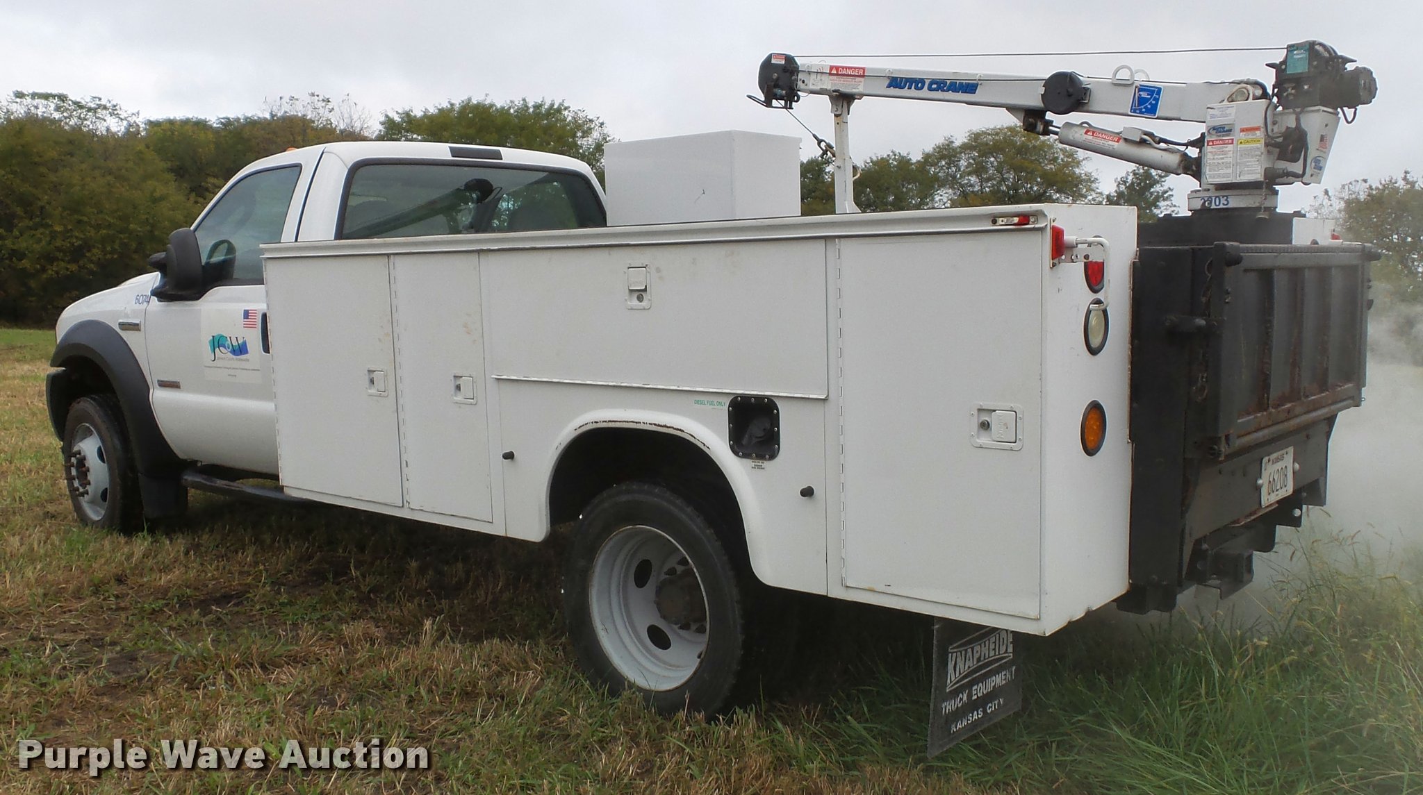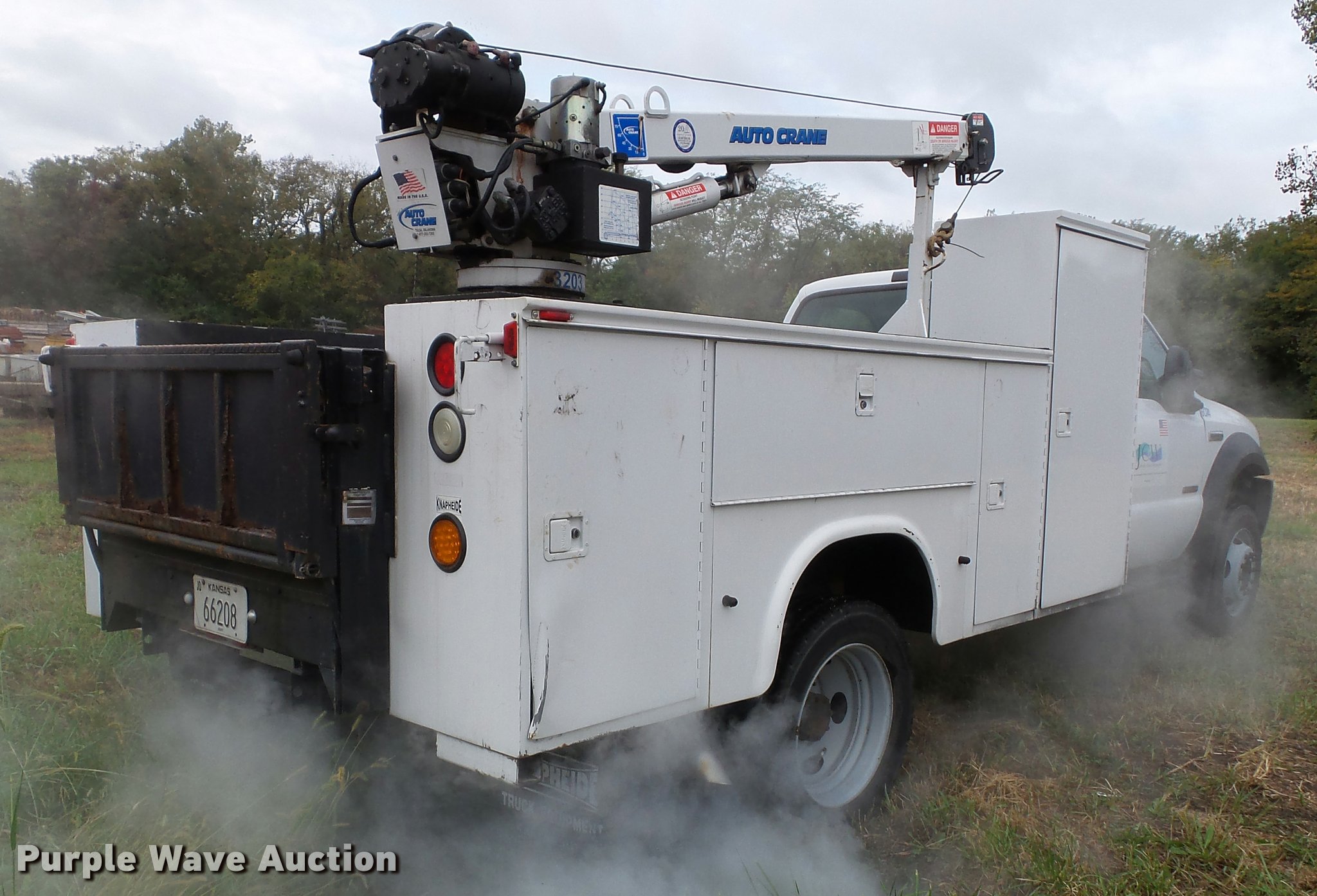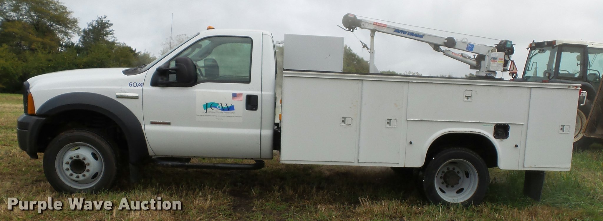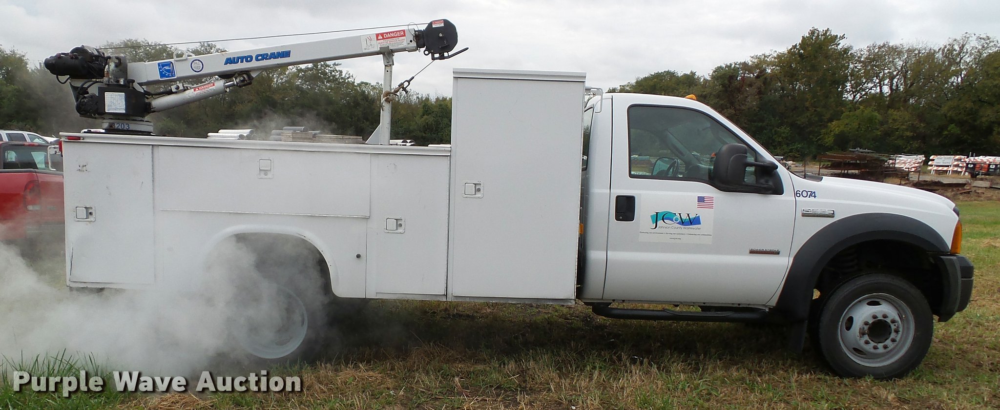 Purple Wave is selling a used Service Truck in Kansas. This item is a 2006 Ford F550 service truck with crane with the following: 130,426 miles on odometer, 4,483 hours on meter, 6.0L V8 OHV 32V turbo diesel engine, Automatic transmission, Single axle, AC and heat, AM/FM, Auxiliary controls, Front tow hooks, Knapheide service bed, 11'L, Shelving, Slide-out drawers, Torch bottle rack, Tommy Gate lift gate, Autocrane 3203PRX crane, 15' boom length, 3,200 lbs max lift capacity, Remote control,, Single fuel tank, Receiver hitch, Spring suspension, Hydraulic brakes, 225/70R19.5 tires, GVWR 17,950 lbs, Dead batteries, Possible EGR cooler or head gasket issues, Unit# JCW5074