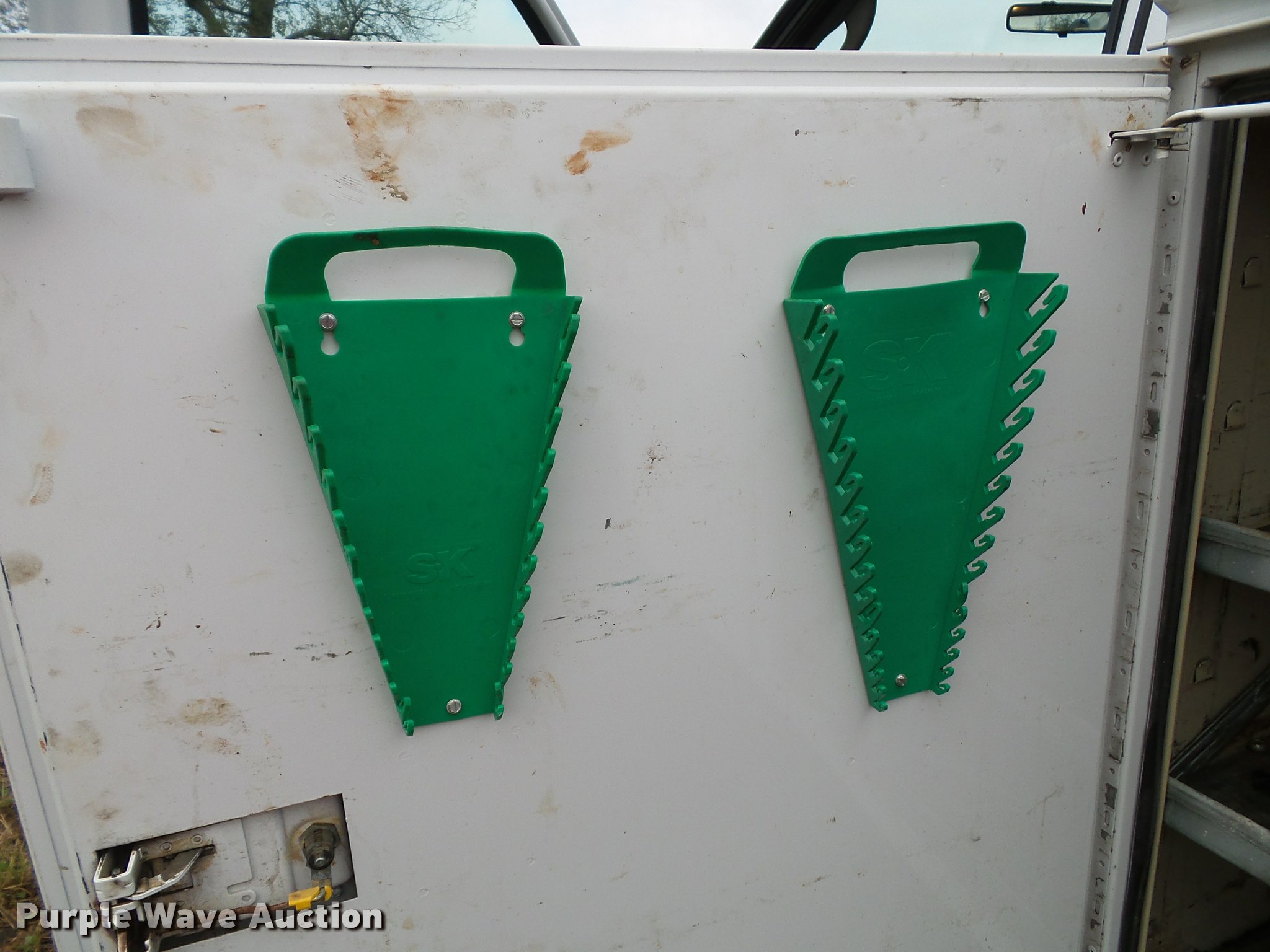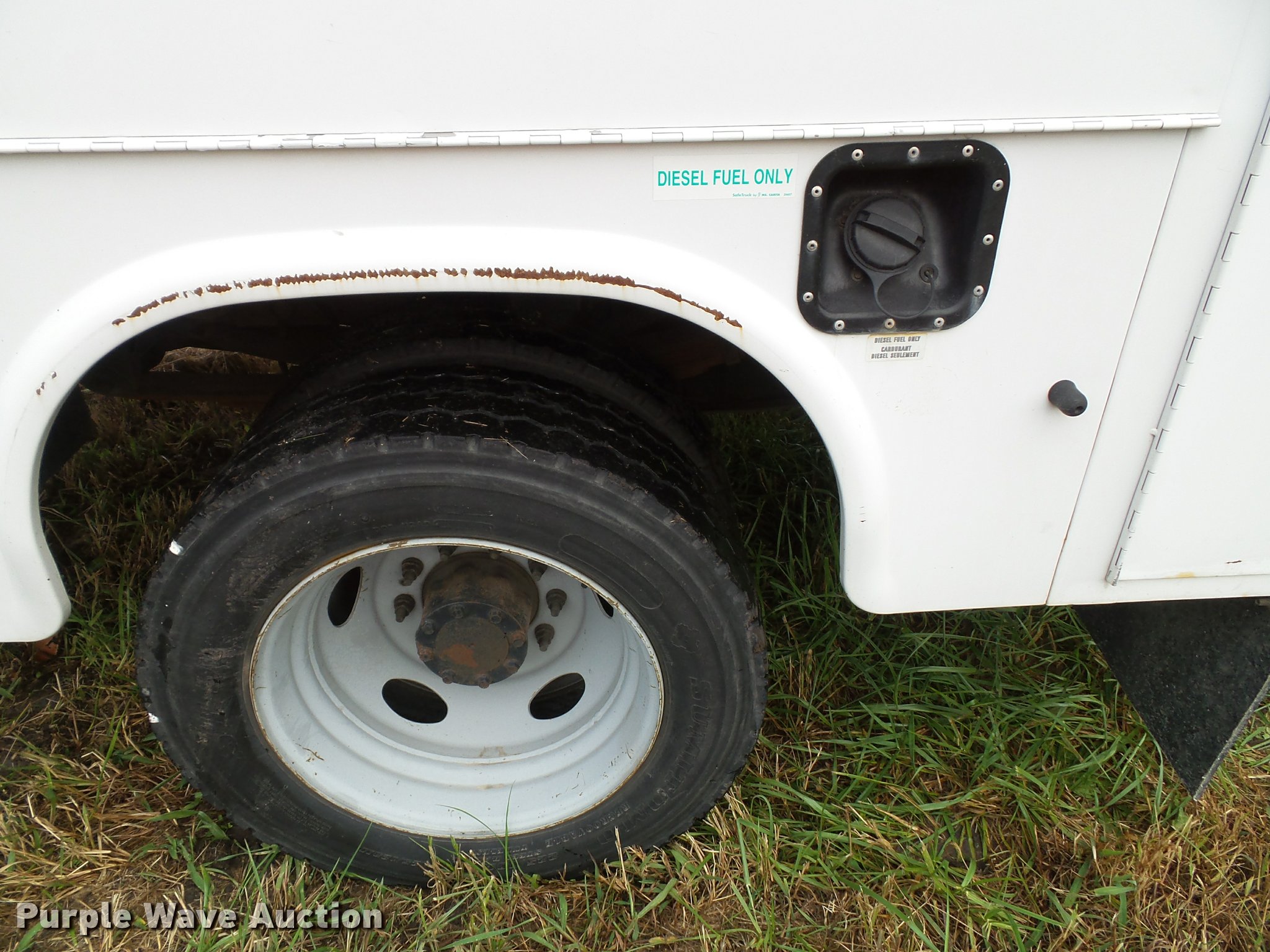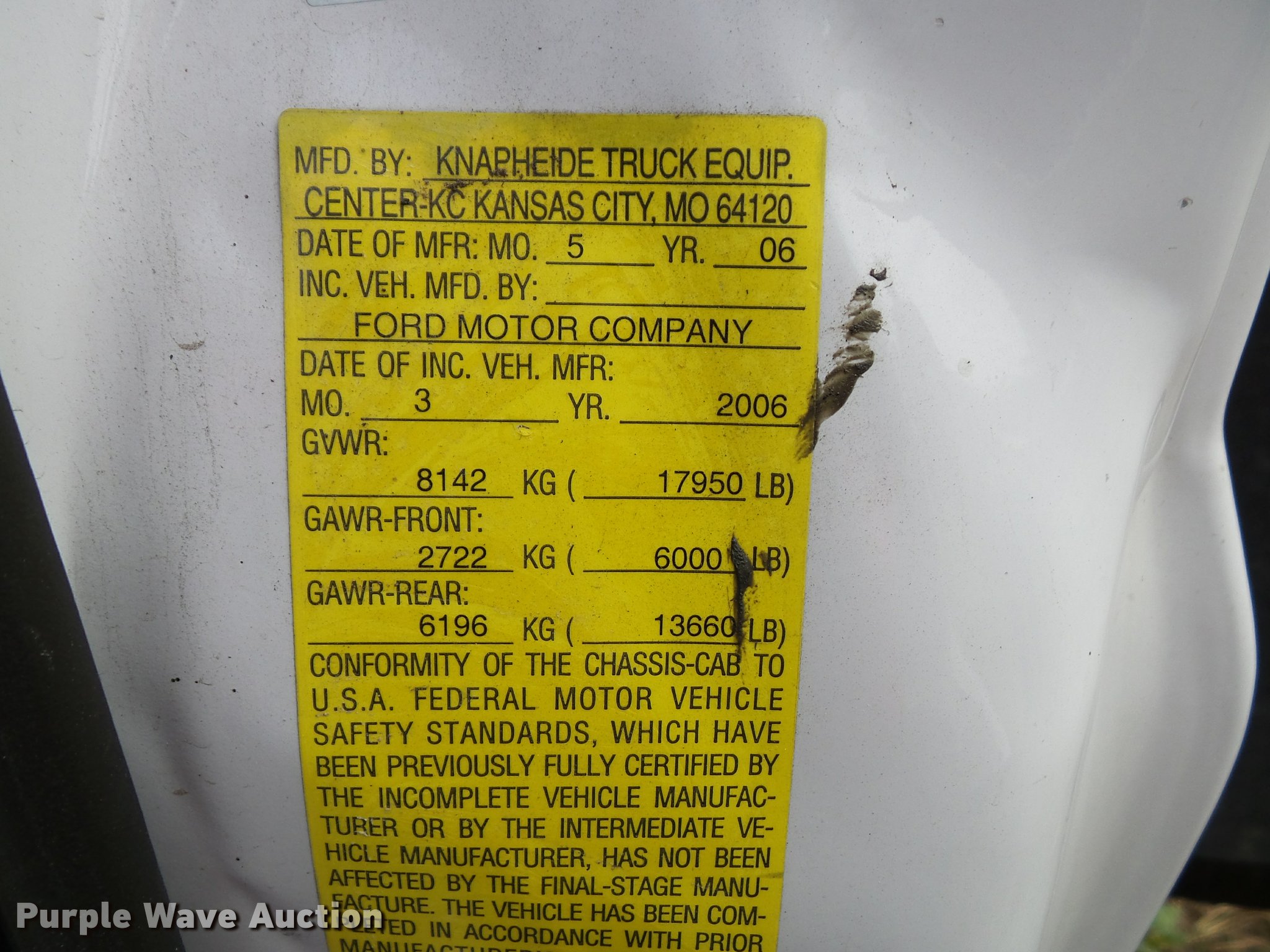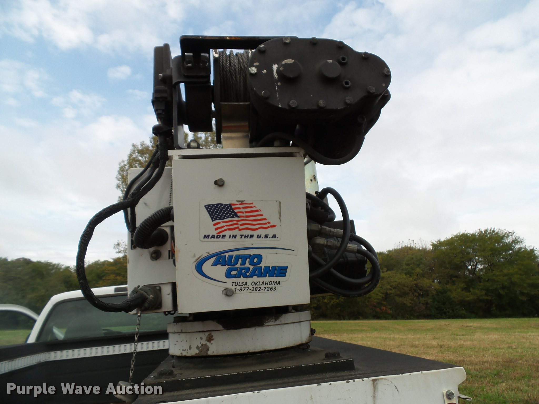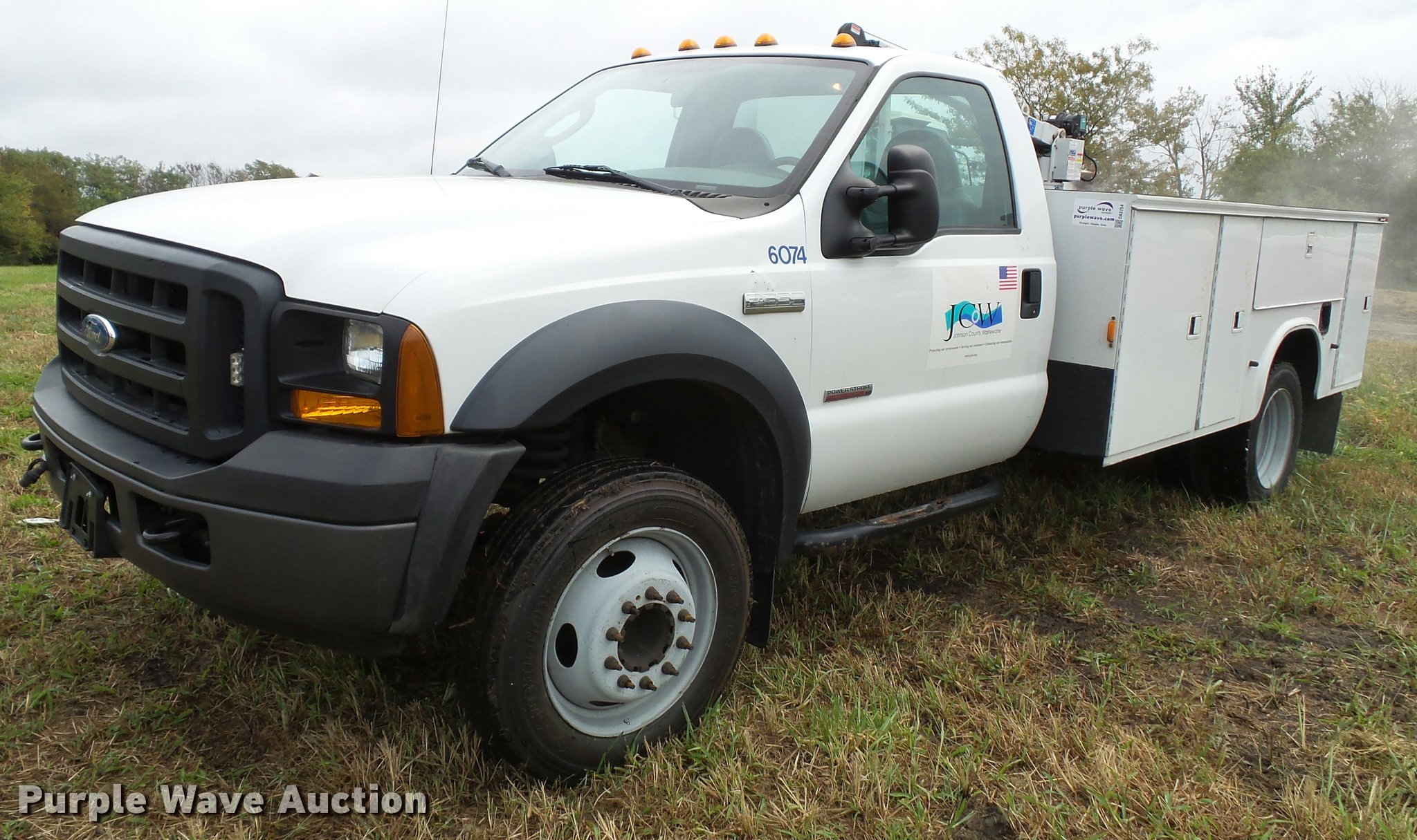 Purple Wave is selling a used Service Truck in Kansas. This item is a 2006 Ford F550 service truck with crane with the following: 130,426 miles on odometer, 4,483 hours on meter, 6.0L V8 OHV 32V turbo diesel engine, Automatic transmission, Single axle, AC and heat, AM/FM, Auxiliary controls, Front tow hooks, Knapheide service bed, 11'L, Shelving, Slide-out drawers, Torch bottle rack, Tommy Gate lift gate, Autocrane 3203PRX crane, 15' boom length, 3,200 lbs max lift capacity, Remote control,, Single fuel tank, Receiver hitch, Spring suspension, Hydraulic brakes, 225/70R19.5 tires, GVWR 17,950 lbs, Dead batteries, Possible EGR cooler or head gasket issues, Unit# JCW5074
