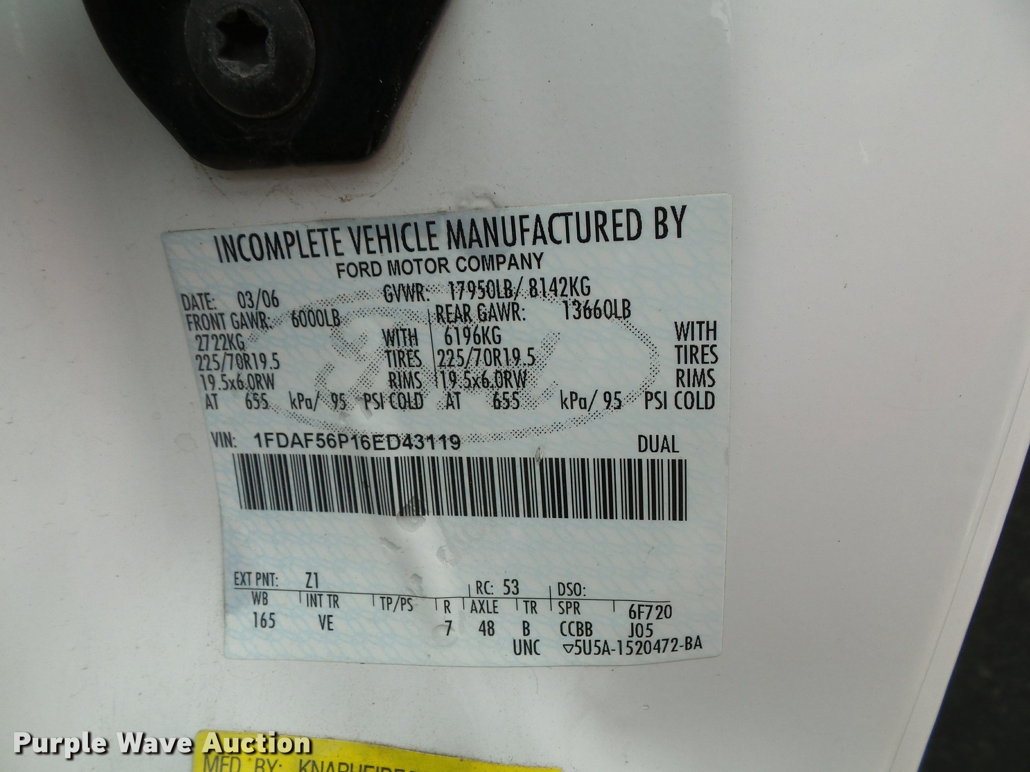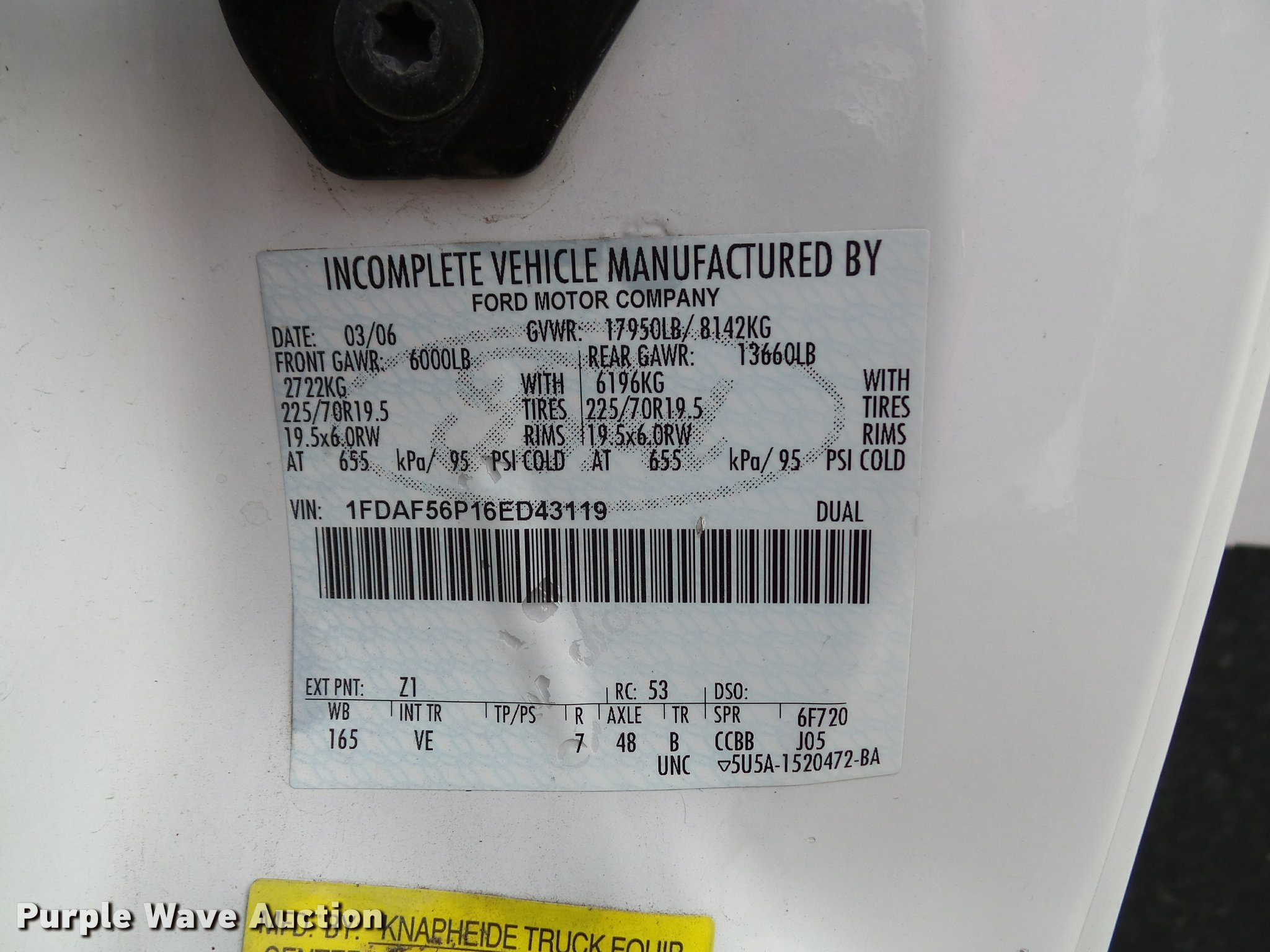 2006 Ford F550 service truck with crane. 130,426 miles on odometer, 4,483 hours on meter, 6.0L V8 OHV 32V turbo diesel engine, Automatic transmission, Single axle, AC and heat, AM/FM, Auxiliary controls, Front tow hooks, Knapheide service bed 11'L, Shelving, Slide-out drawers, Torch bottle rack, Tommy Gate lift gate, Autocrane 3203PRX crane 15' boom length, 3,200 lbs max lift capacity, Remote control, Single fuel tank, Receiver hitch, Spring suspension, Hydraulic brakes, 225/70R19.5 tires, GVWR 17,950 lbs, Dead batteries, Possible EGR cooler or head gasket issues, Unit# JCW5074. Kansas title. 1FDAF56P16ED43119. Johnson County. 1810 W Old Hwy 56. Olathe, KS 66061