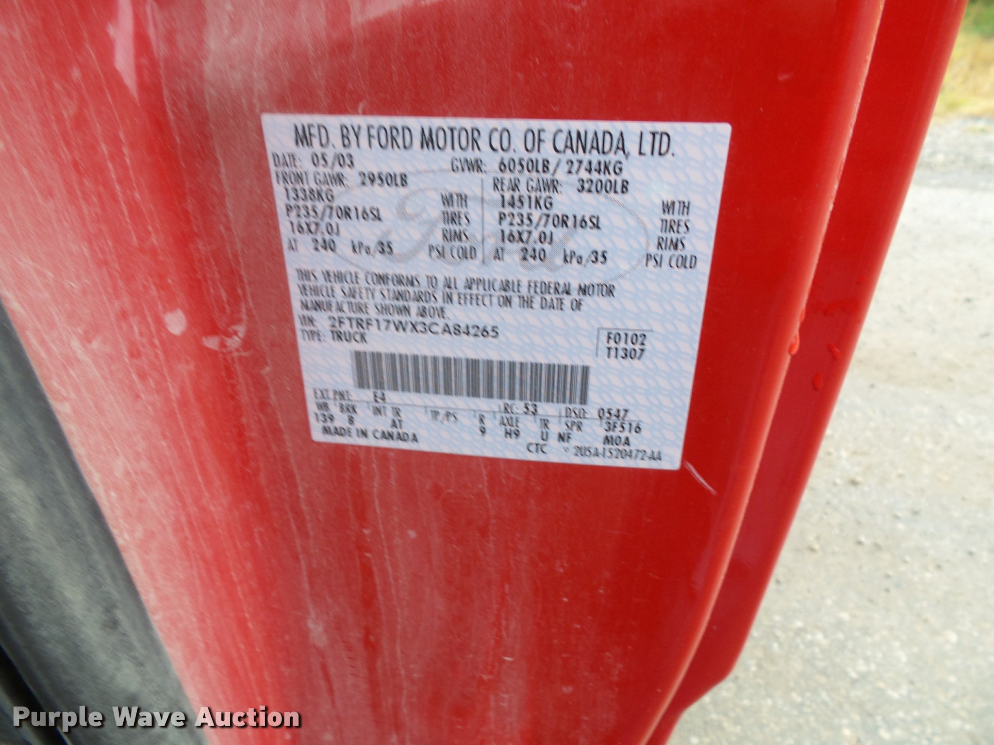 Purple Wave is selling a used 1/2 Ton Pickup or Van in Kansas. This item is a 2003 Ford F150 pickup truck with the following: 107,073 miles on odometer, 4.6L V8 SOHC 16V gas engine, Automatic transmission, AC and heat, Tilt, AM/FM/cassette, Manual windows and locks, Vinyl interior, Long bed, Toolbox, 235/70R16 tires, Unit# PWK-3434