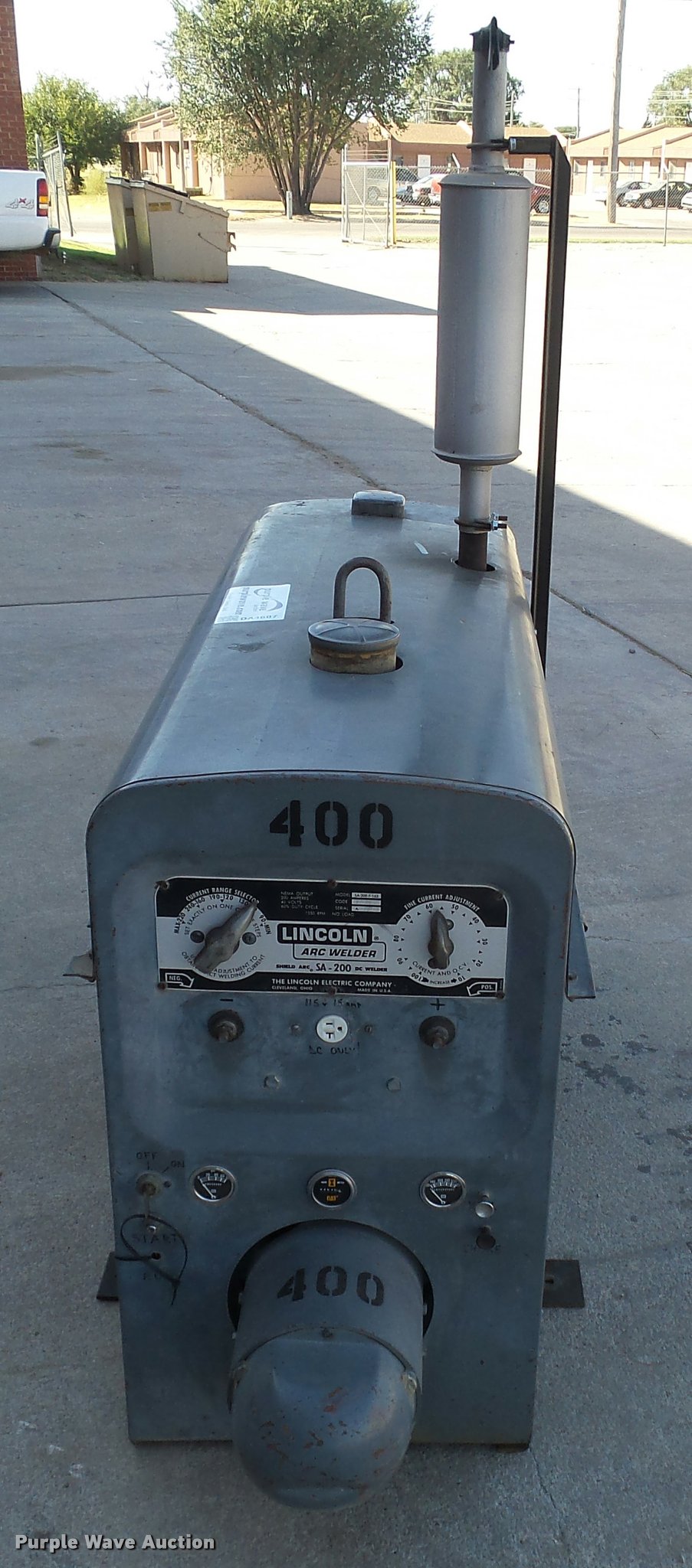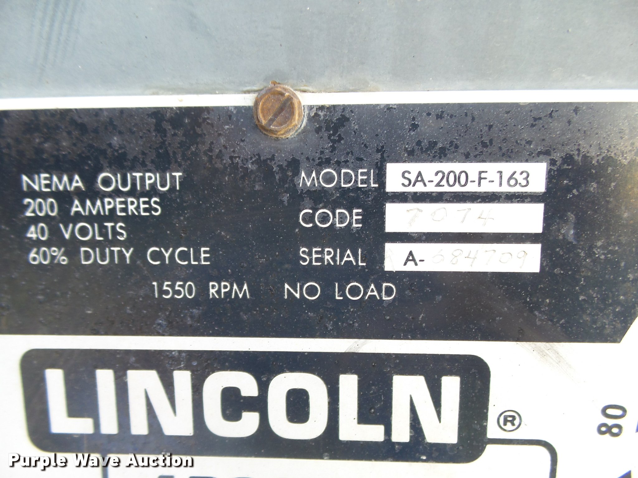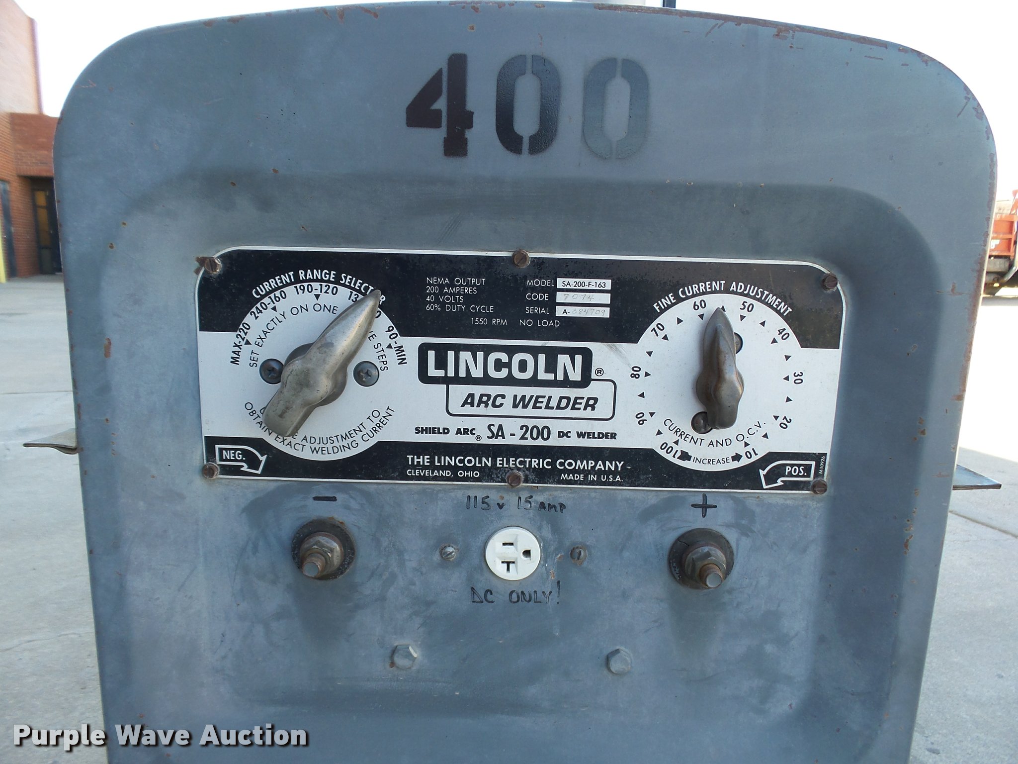 Purple Wave is selling a used Welder (Manual) in Kansas. This item is a Lincoln SA-200-F-163 arc welder with the following: 63 hours on meter, Meter has been replaced, Lincoln four cylinder gas engine, Serial 148206, Leads, Serial A-684709
