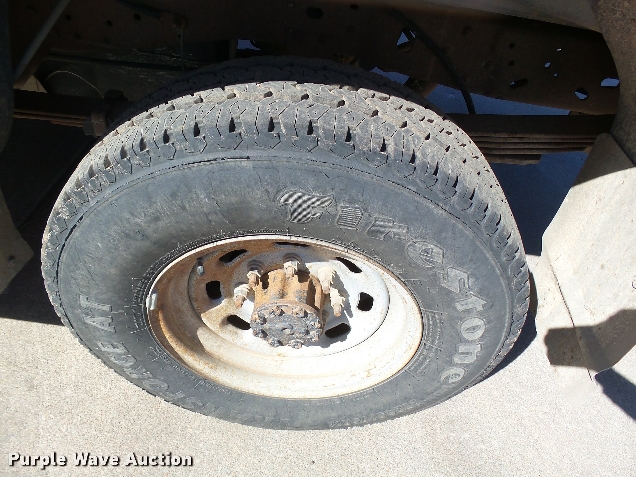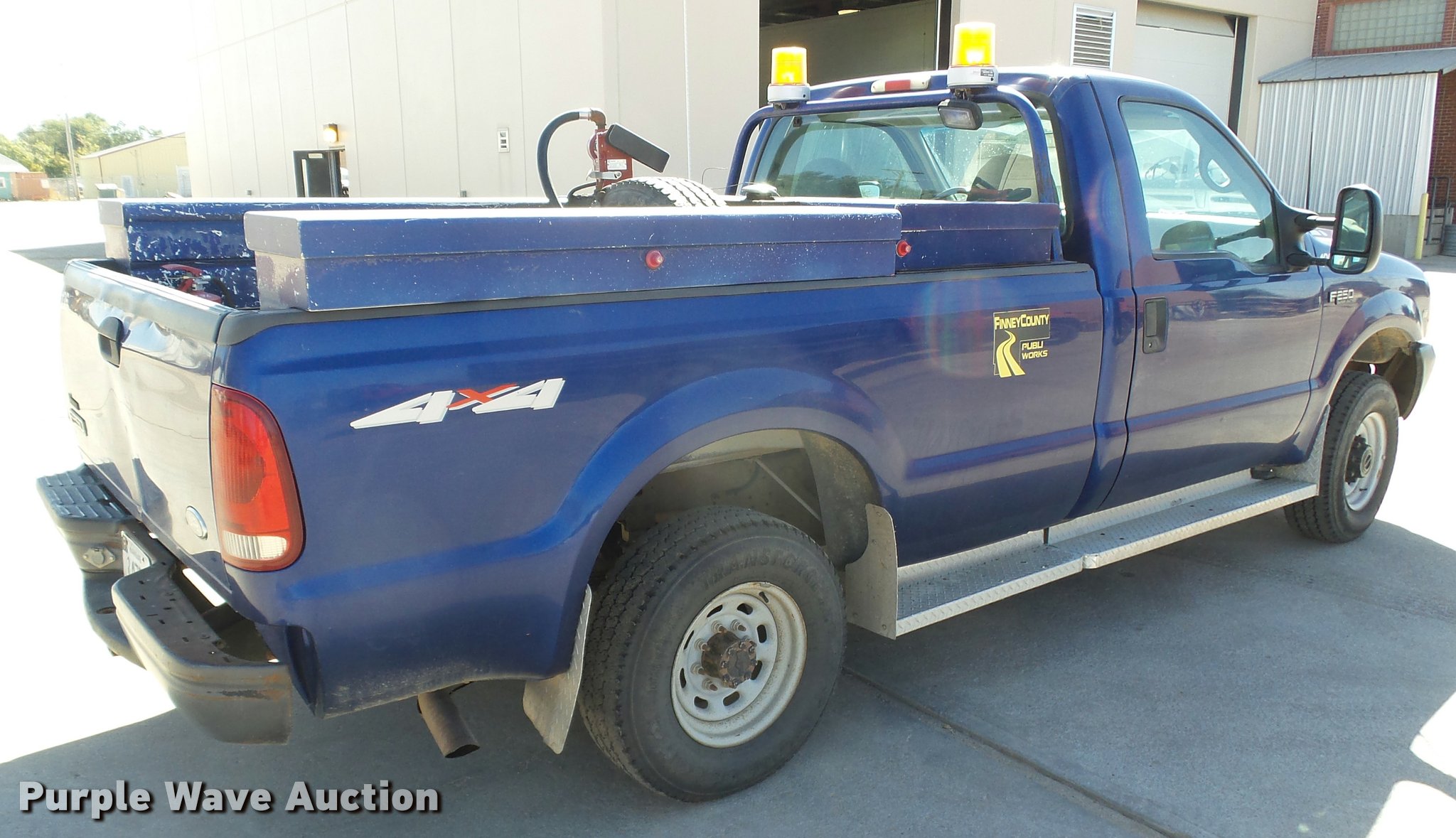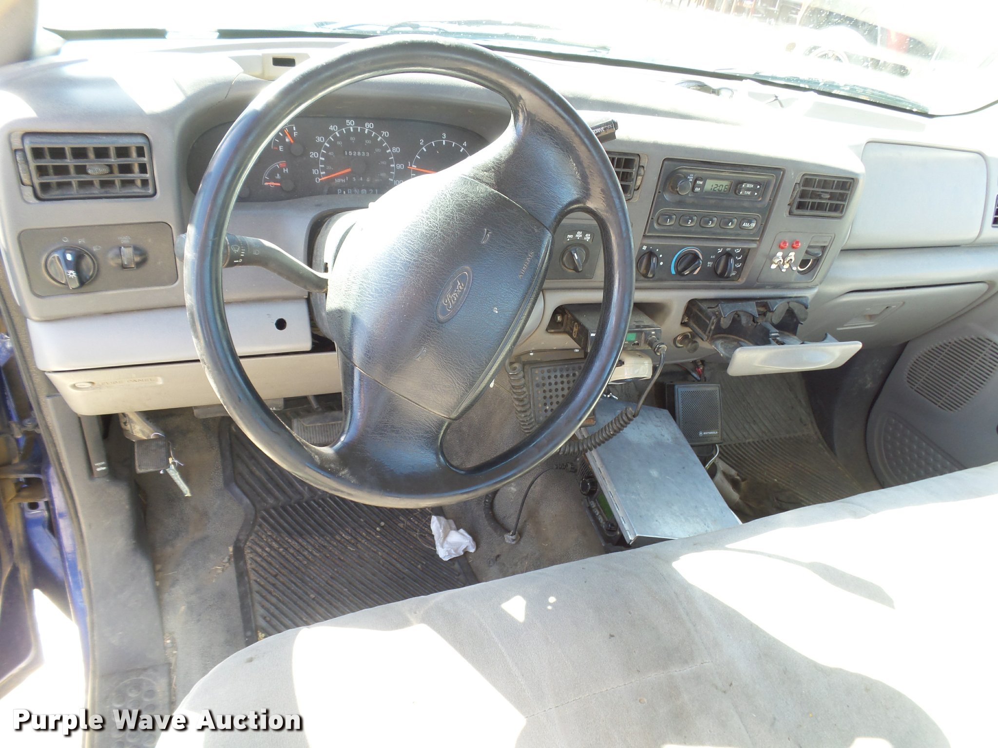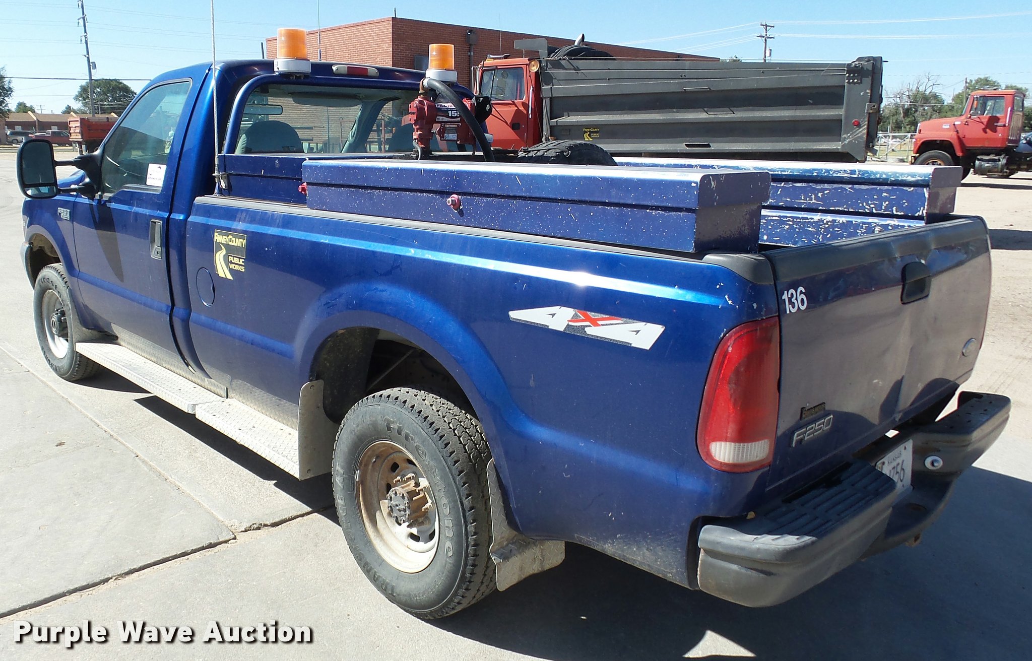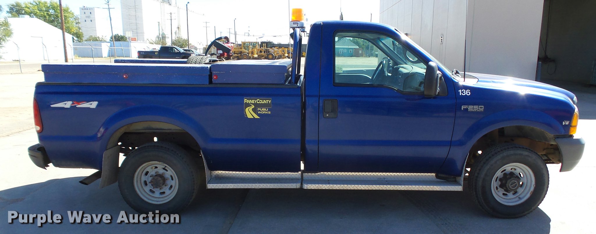 1999 Ford F250 Super Duty pickup truck. 152,833 miles on odometer, 5.4L V8 SOHC 16V gas engine, Automatic transmission, Four wheel drive, AC and heat, AM/FM, Manual windows and locks, Cloth interior, Front tow hooks, Running boards, Toolboxes, Receiver hitch, LT245/75R16 tires, Hail damage, Two-way radio, speakers, fuel tank, beacon lights, and tools not included Will be removed prior to auction, Unit# 136. Kansas title. 1FTNF21L0XEB25764. Finney County. 101 W Maple St. Garden City, KS 67846