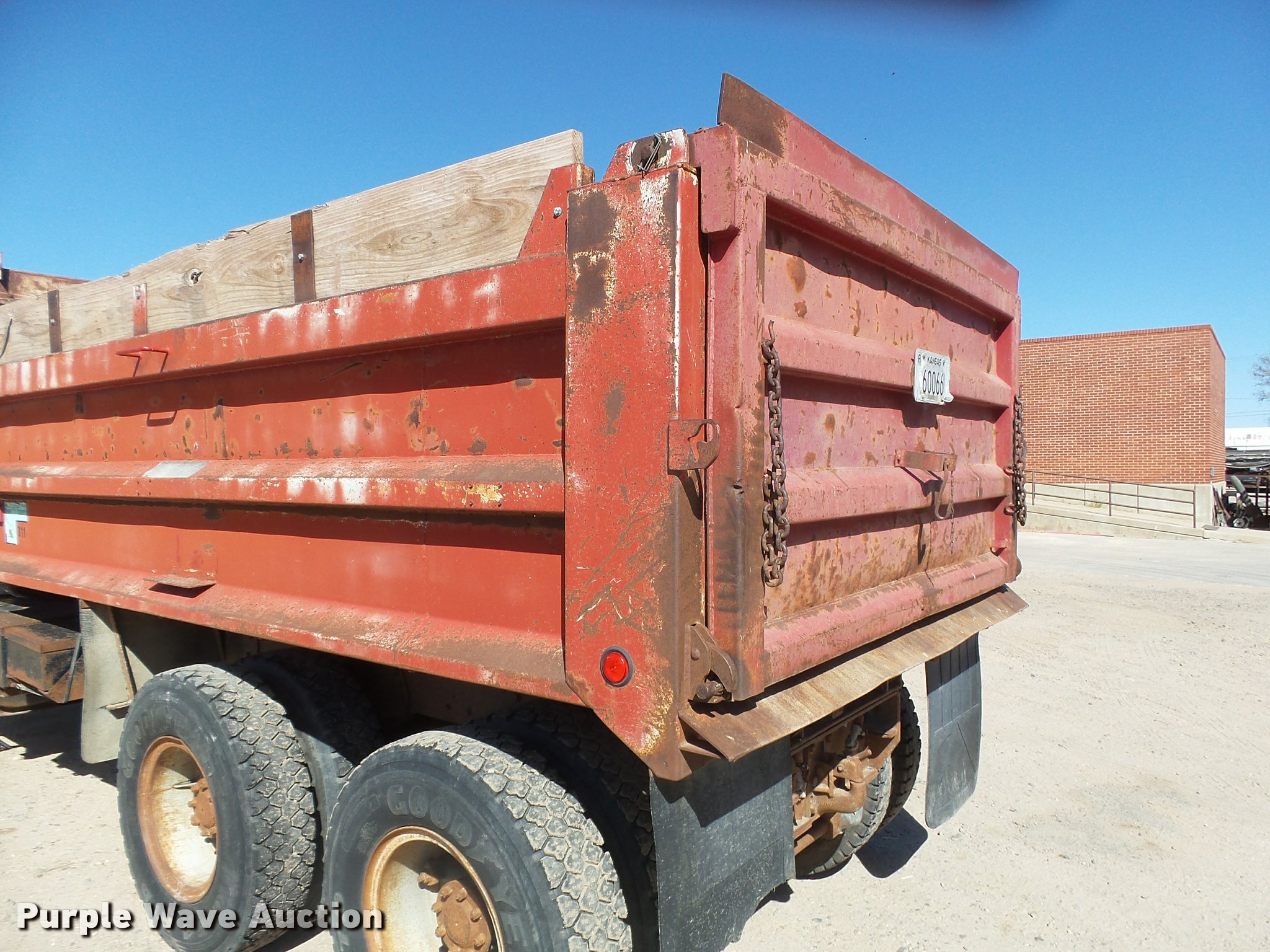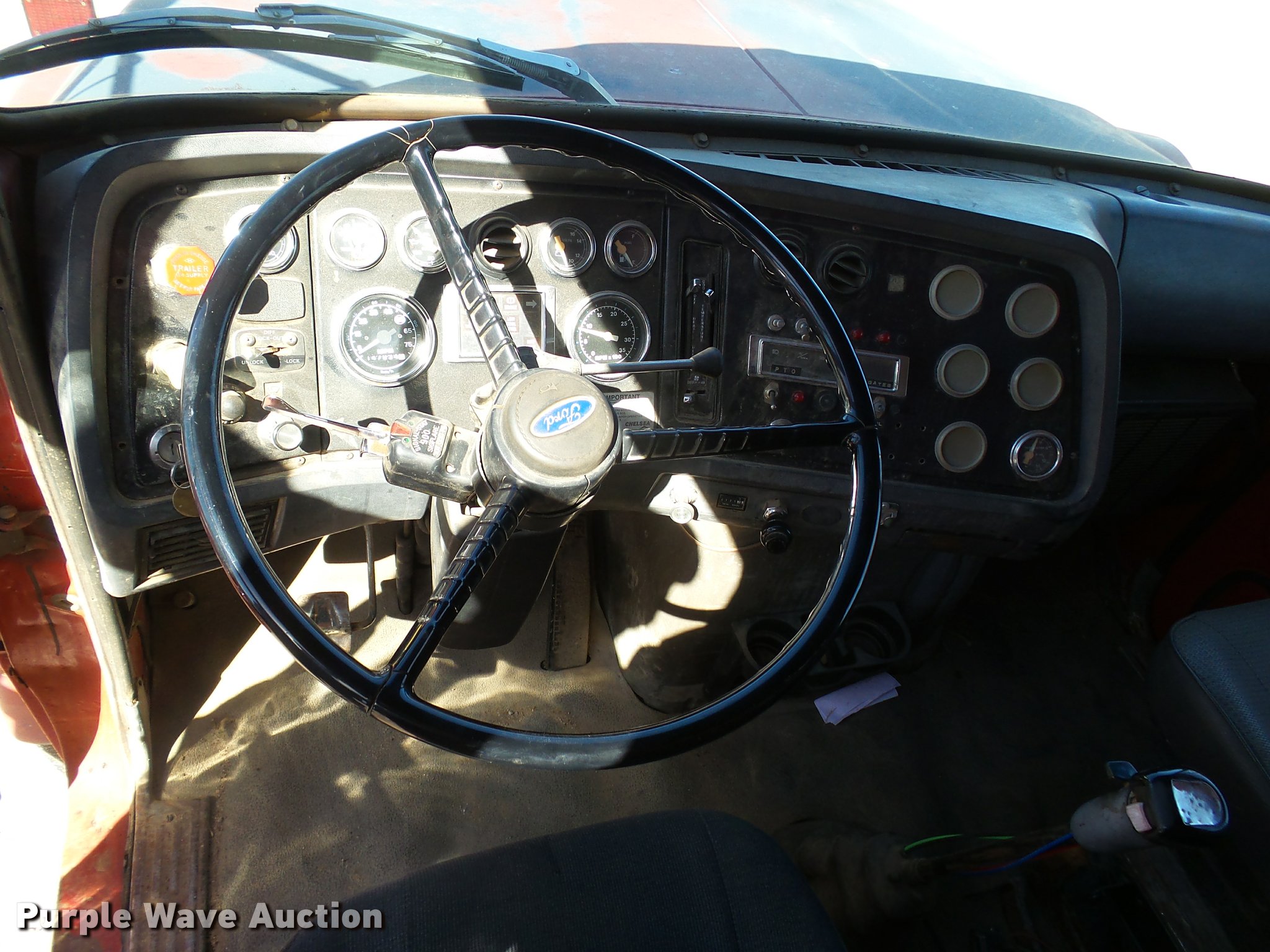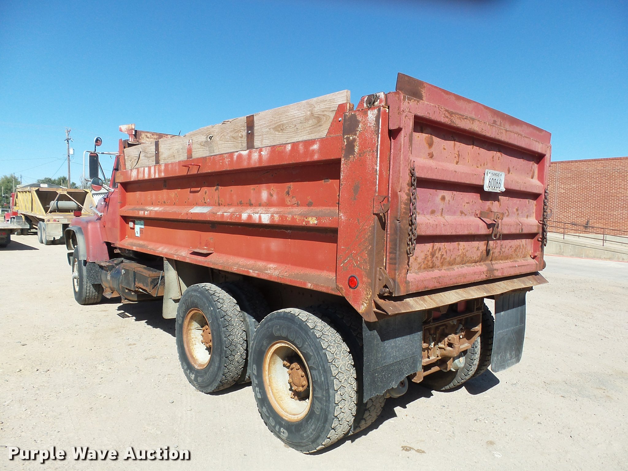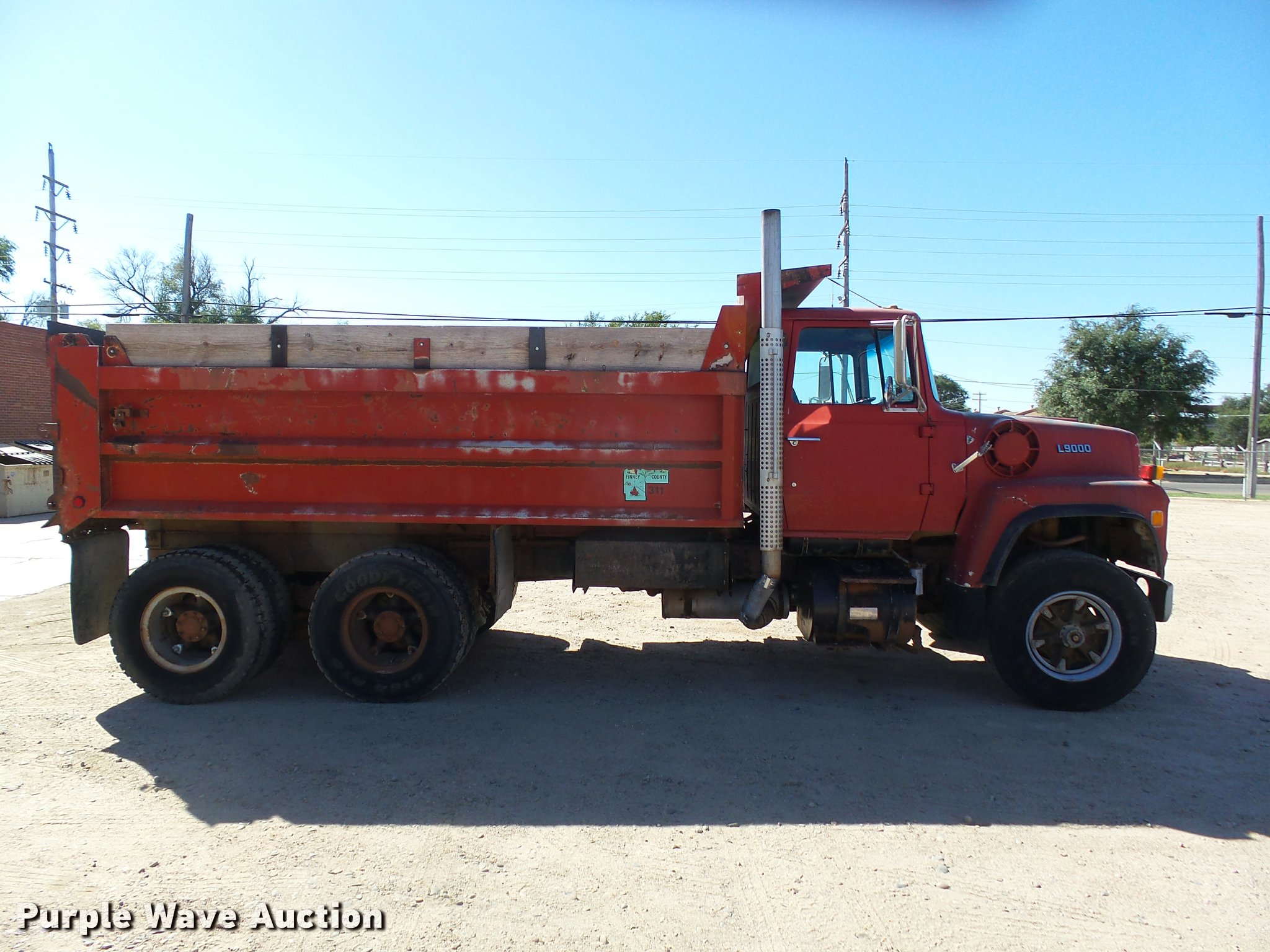 Purple Wave is selling a used Construction Dump Truck in Kansas. This item is a 1987 Ford L9000 dump truck with the following: 147,234 miles on odometer, 2,171 hours on meter, Caterpillar 3406 14.6L L6 turbo diesel engine, Eaton Fuller eight speed manual transmission, Tandem axle, Heat, AM/FM, Air suspension seat, Block heater, PTO, 15'L x 96"W steel dump bed, Model 15KCSP, 36" side height, 12" side board height, Manual end gate, Single ram hoist, Dual fuel tanks, Pintle hitch, Trailer wiring, Air suspension, Air brakes, 204" wheelbase, 385/65R22.5 front tires, 10.00R20 rear tires, GVWR 55,000 lbs, Unit# 311