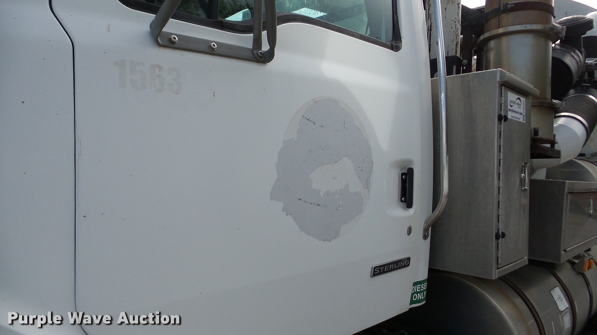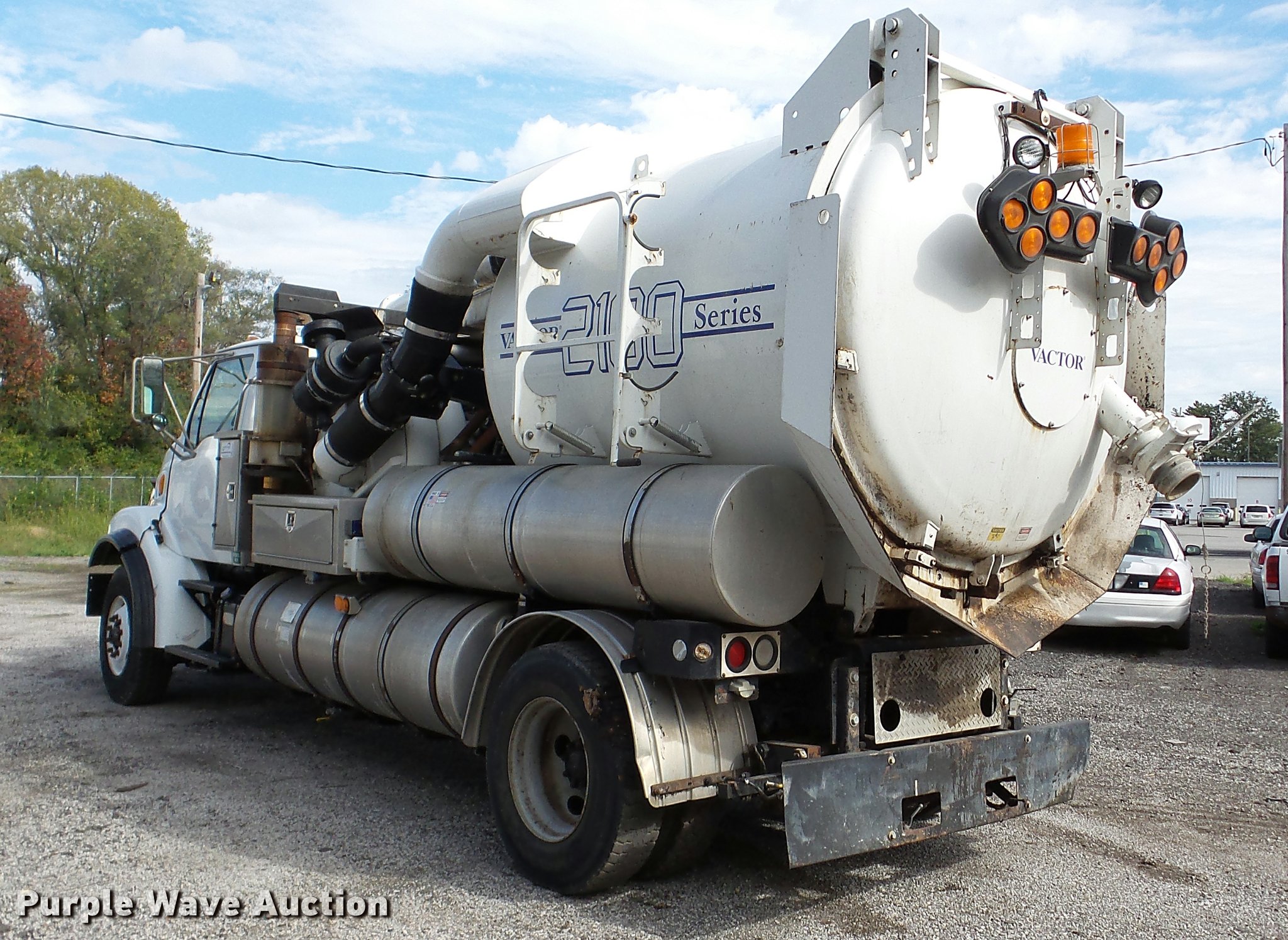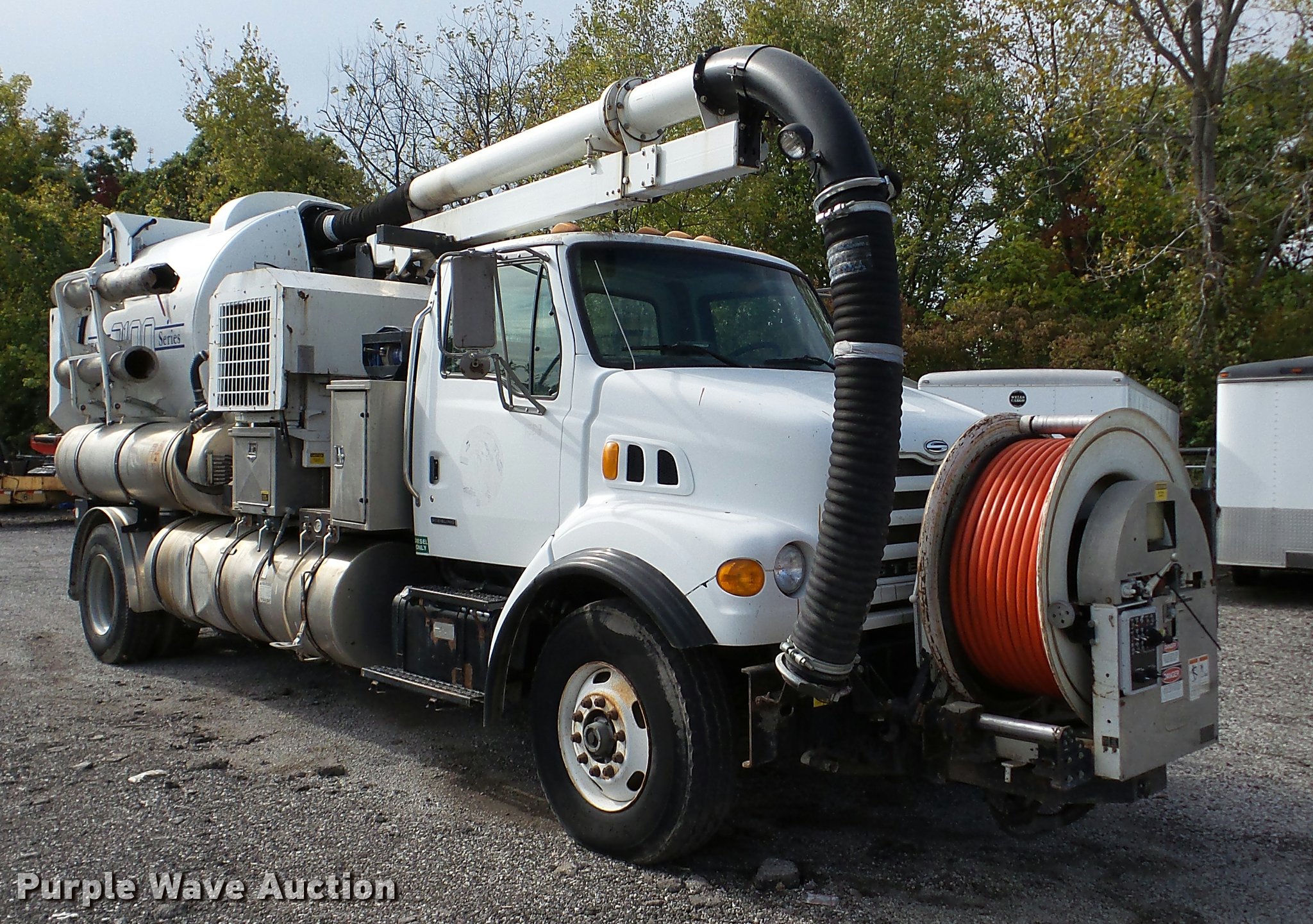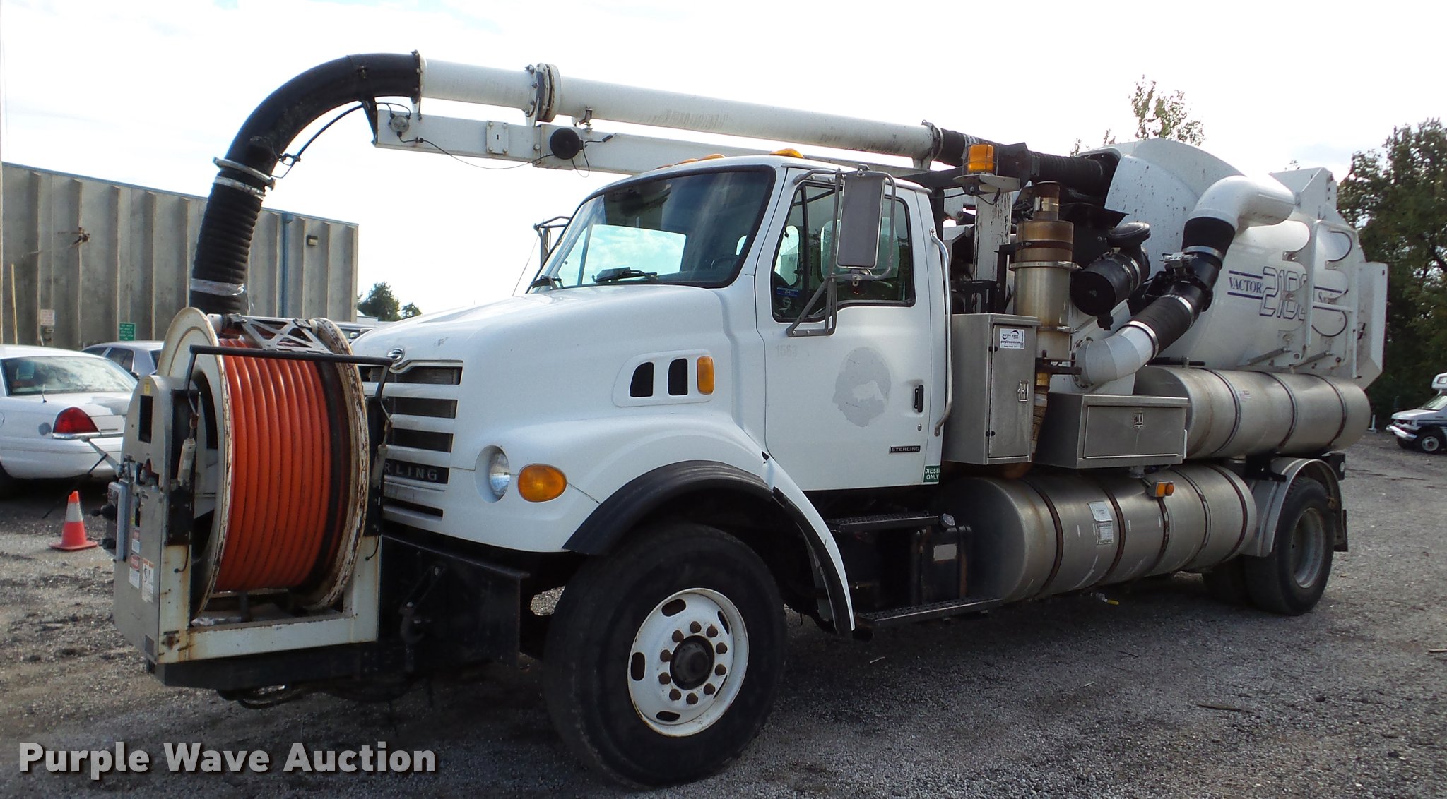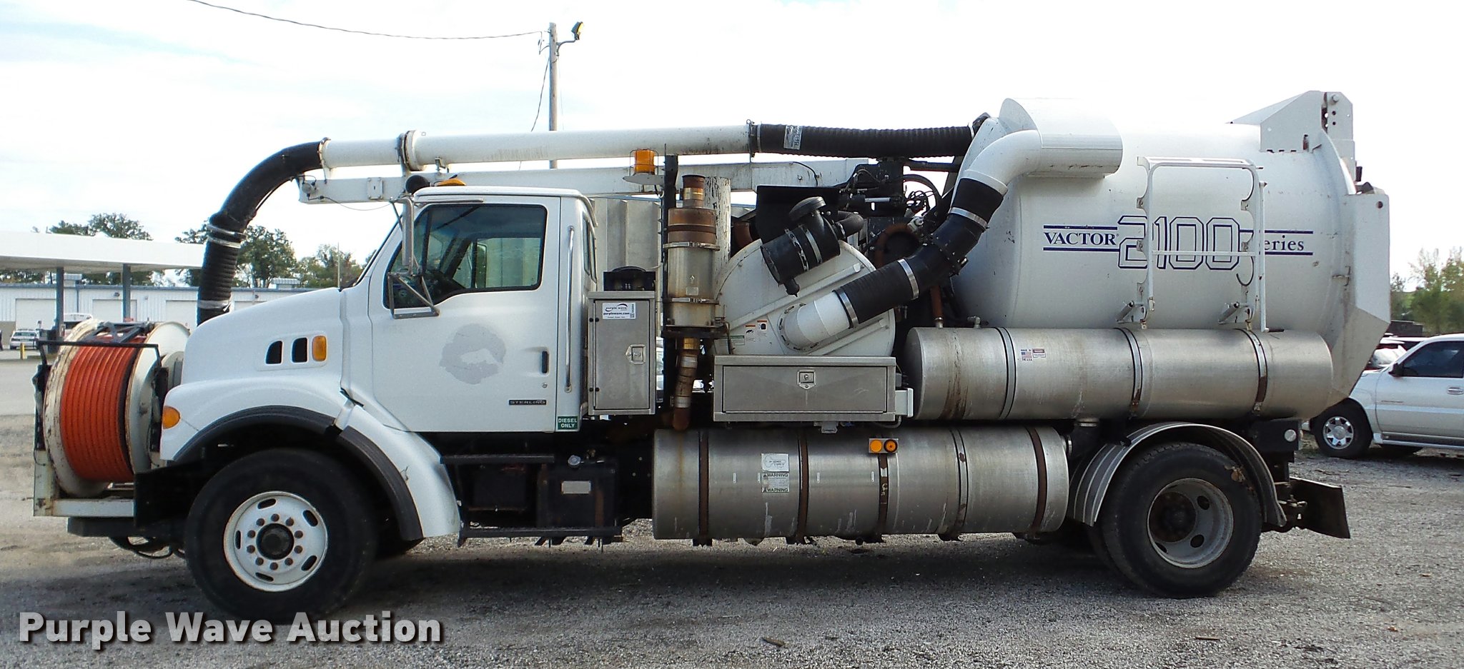 Purple Wave is selling a used Vacuum Truck in Kansas. This item is a 2003 Sterling L7500 vacuum truck with the following: 73,840 miles on odometer, 12,887 hours on meter, Caterpillar 3126 7.2L L6 diesel engine, Automatic transmission, Single axle, AC and heat, Cruise, AM/FM, Air suspension seat, Vactor 2100 series vacuum bed, 17'L, John Deere PE6068T234205 turbo diesel engine, Rodder hose, Vactor thermoplastic, 1", 2,500 psi, Dual engine design, Hand gun, Hydraulic dump, Hydraulic door lock, 4' telescoping boom, 10 cu. yd. debris tank, Serial 02-11V-8373, Spring suspension, Air brakes, 224" wheelbase, 315/80R22.5 front tires, 11R22.5 rear tires, GVWR 41,000 lbs, GAWR 18,000 lbs, Weak batteries, Unit# 21-1563