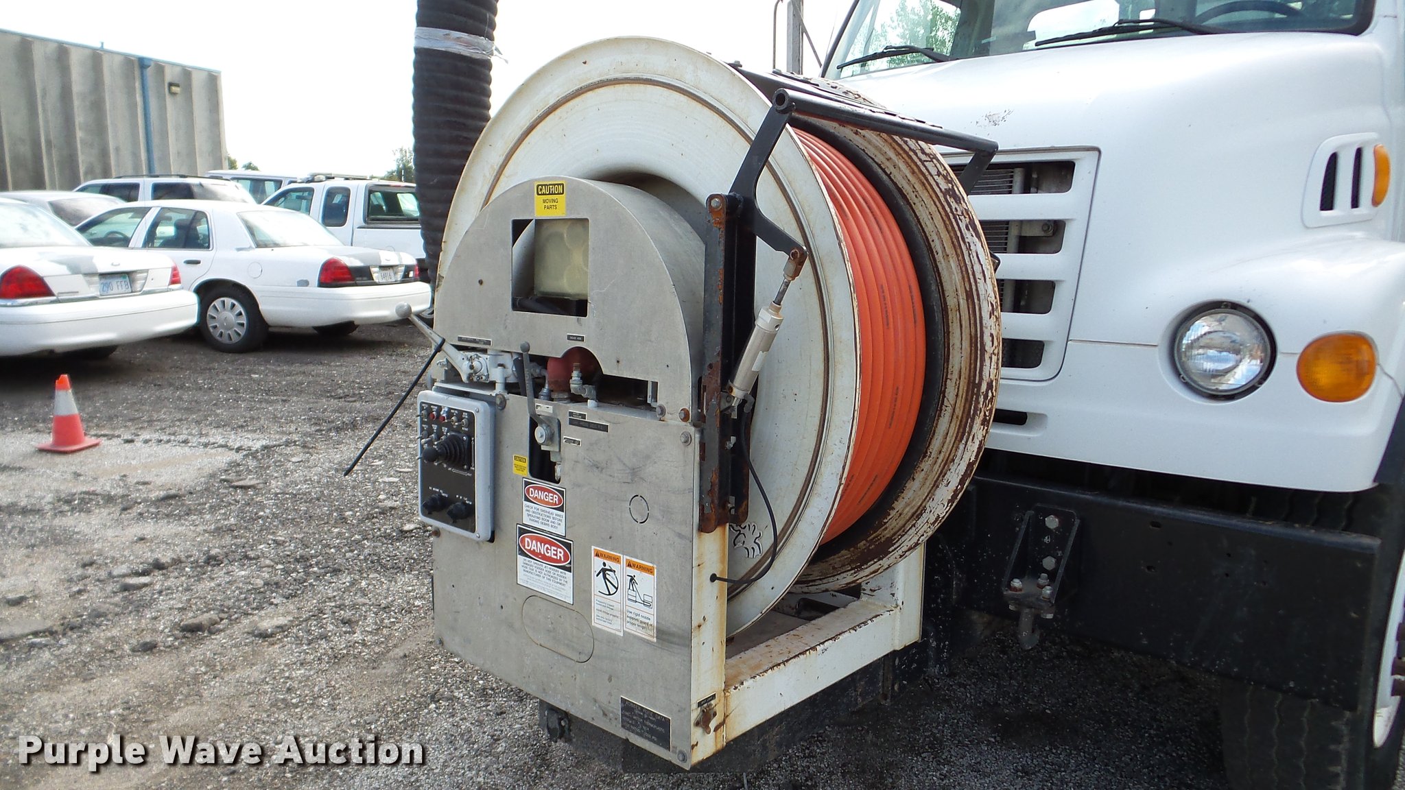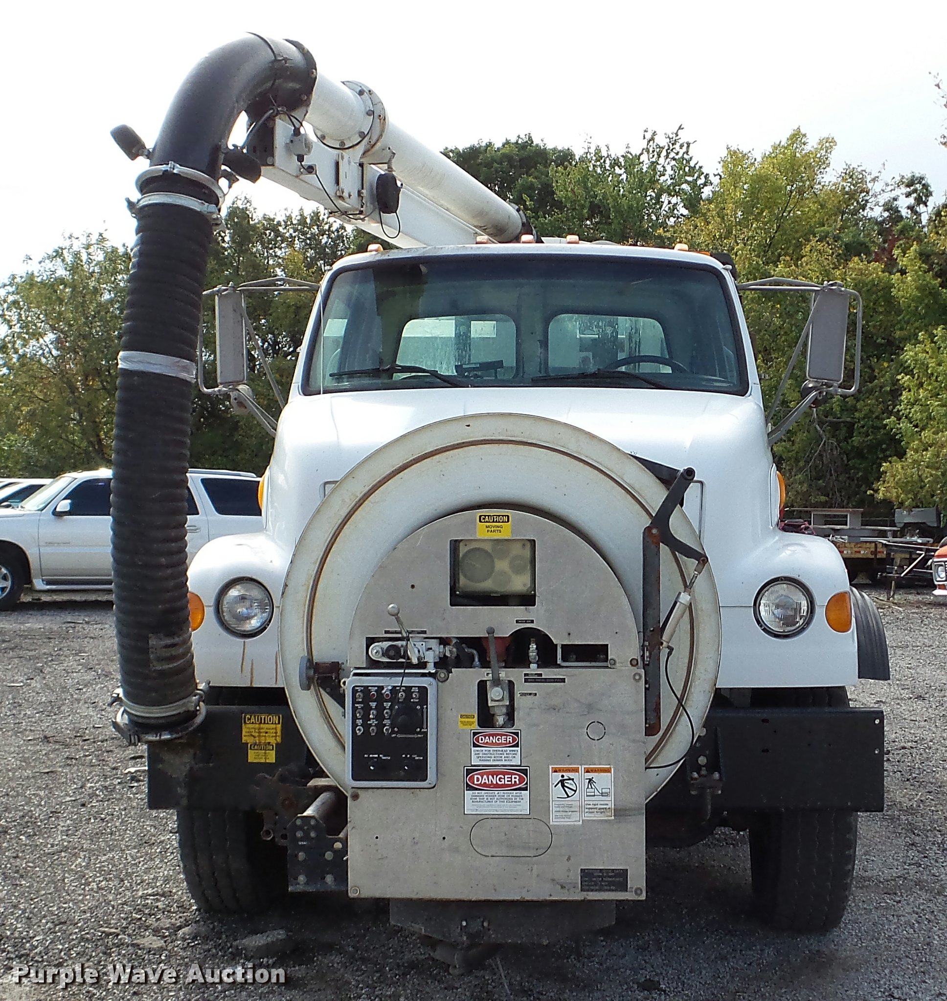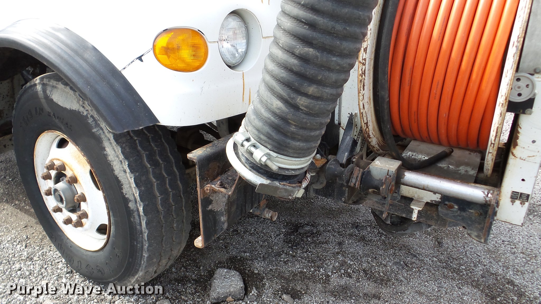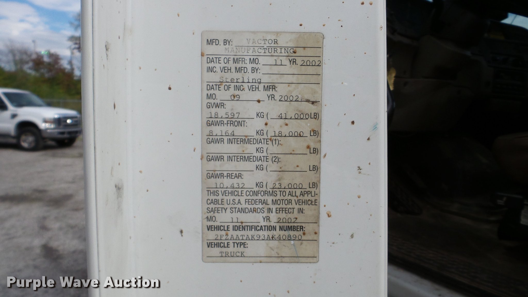 Purple Wave is selling a used Vacuum Truck in Kansas. This item is a 2003 Sterling L7500 vacuum truck with the following: 73,840 miles on odometer, 12,887 hours on meter, Caterpillar 3126 7.2L L6 diesel engine, Automatic transmission, Single axle, AC and heat, Cruise, AM/FM, Air suspension seat, Vactor 2100 series vacuum bed, 17'L, John Deere PE6068T234205 turbo diesel engine, Rodder hose, Vactor thermoplastic, 1", 2,500 psi, Dual engine design, Hand gun, Hydraulic dump, Hydraulic door lock, 4' telescoping boom, 10 cu. yd. debris tank, Serial 02-11V-8373, Spring suspension, Air brakes, 224" wheelbase, 315/80R22.5 front tires, 11R22.5 rear tires, GVWR 41,000 lbs, GAWR 18,000 lbs, Weak batteries, Unit# 21-1563