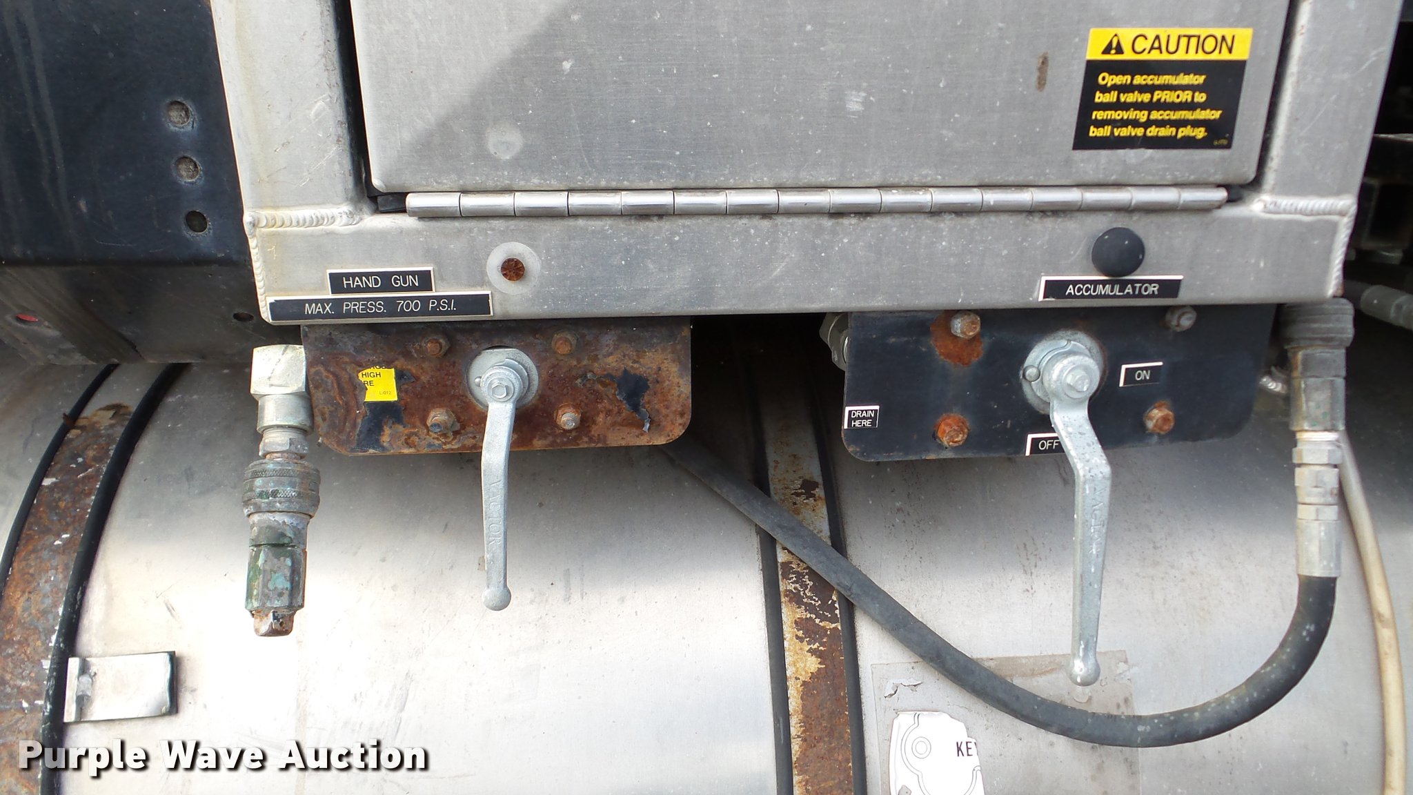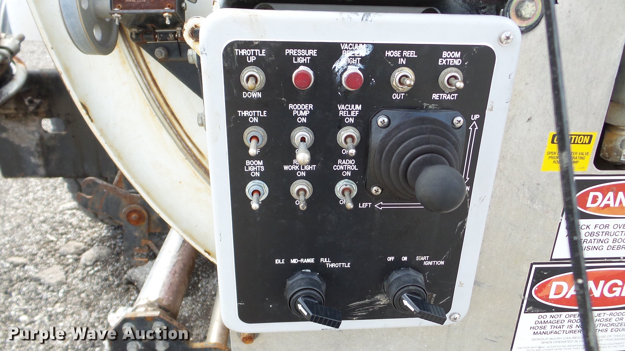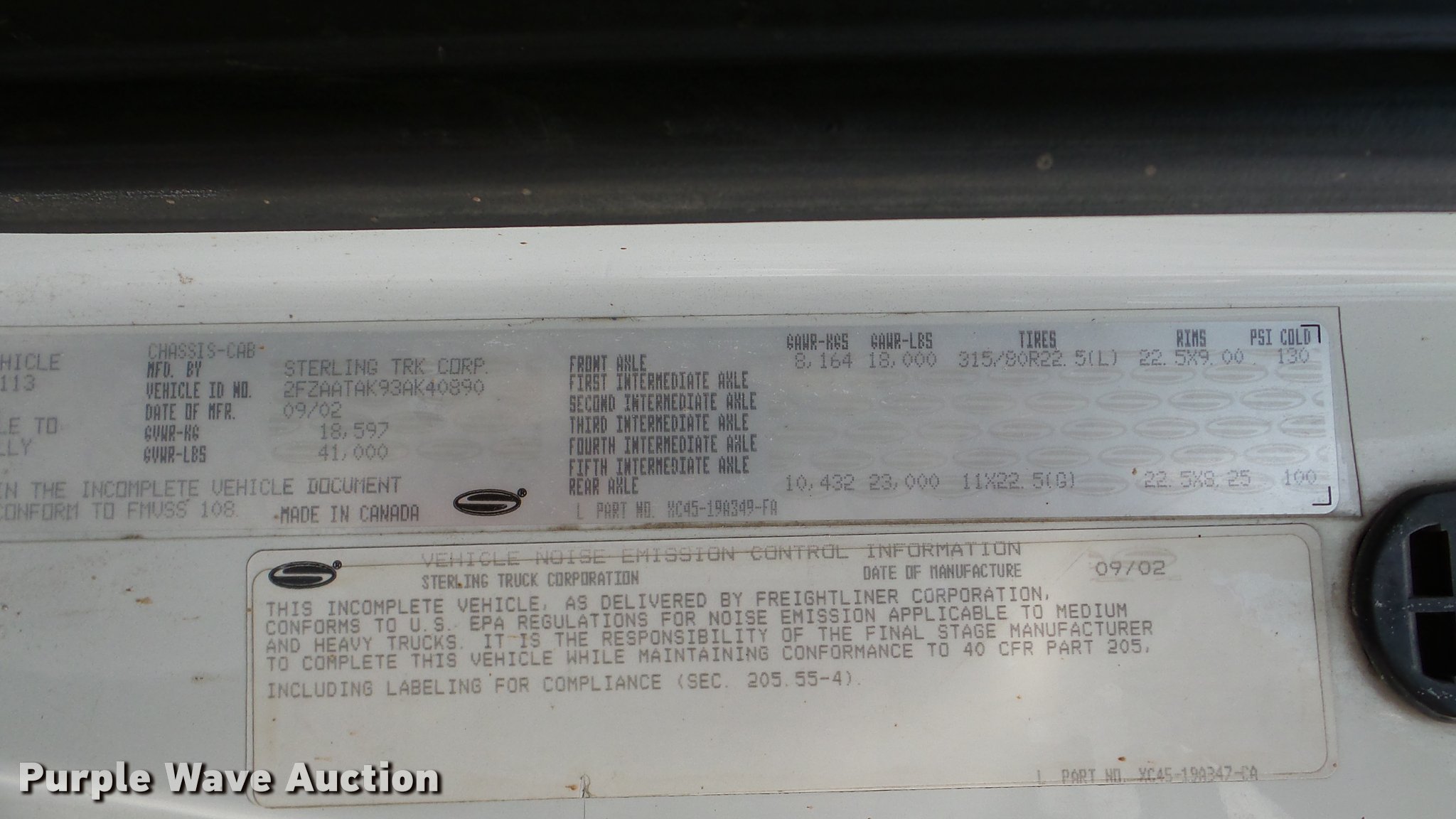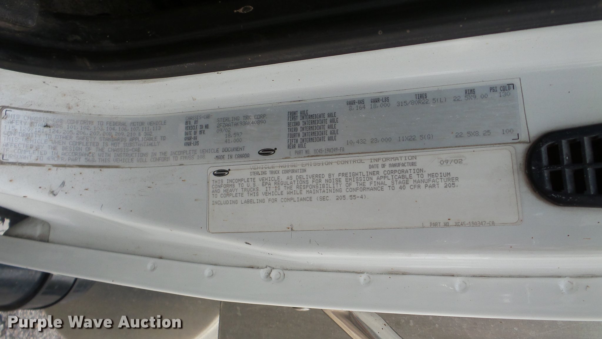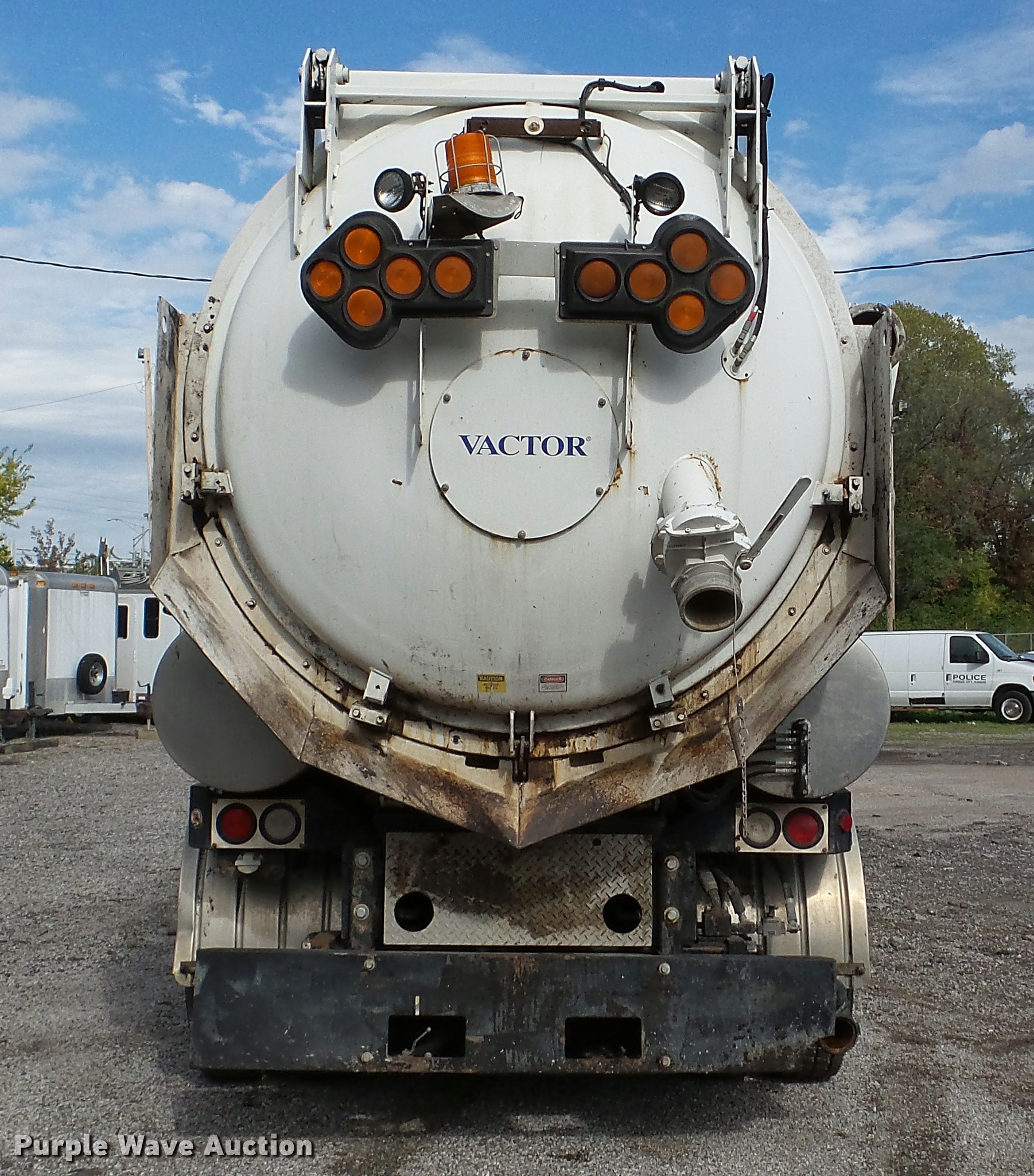Purple Wave is selling a used Vacuum Truck in Kansas. This item is a 2003 Sterling L7500 vacuum truck with the following: 73,840 miles on odometer, 12,887 hours on meter, Caterpillar 3126 7.2L L6 diesel engine, Automatic transmission, Single axle, AC and heat, Cruise, AM/FM, Air suspension seat, Vactor 2100 series vacuum bed, 17'L, John Deere PE6068T234205 turbo diesel engine, Rodder hose, Vactor thermoplastic, 1", 2,500 psi, Dual engine design, Hand gun, Hydraulic dump, Hydraulic door lock, 4' telescoping boom, 10 cu. yd. debris tank, Serial 02-11V-8373, Spring suspension, Air brakes, 224" wheelbase, 315/80R22.5 front tires, 11R22.5 rear tires, GVWR 41,000 lbs, GAWR 18,000 lbs, Weak batteries, Unit# 21-1563