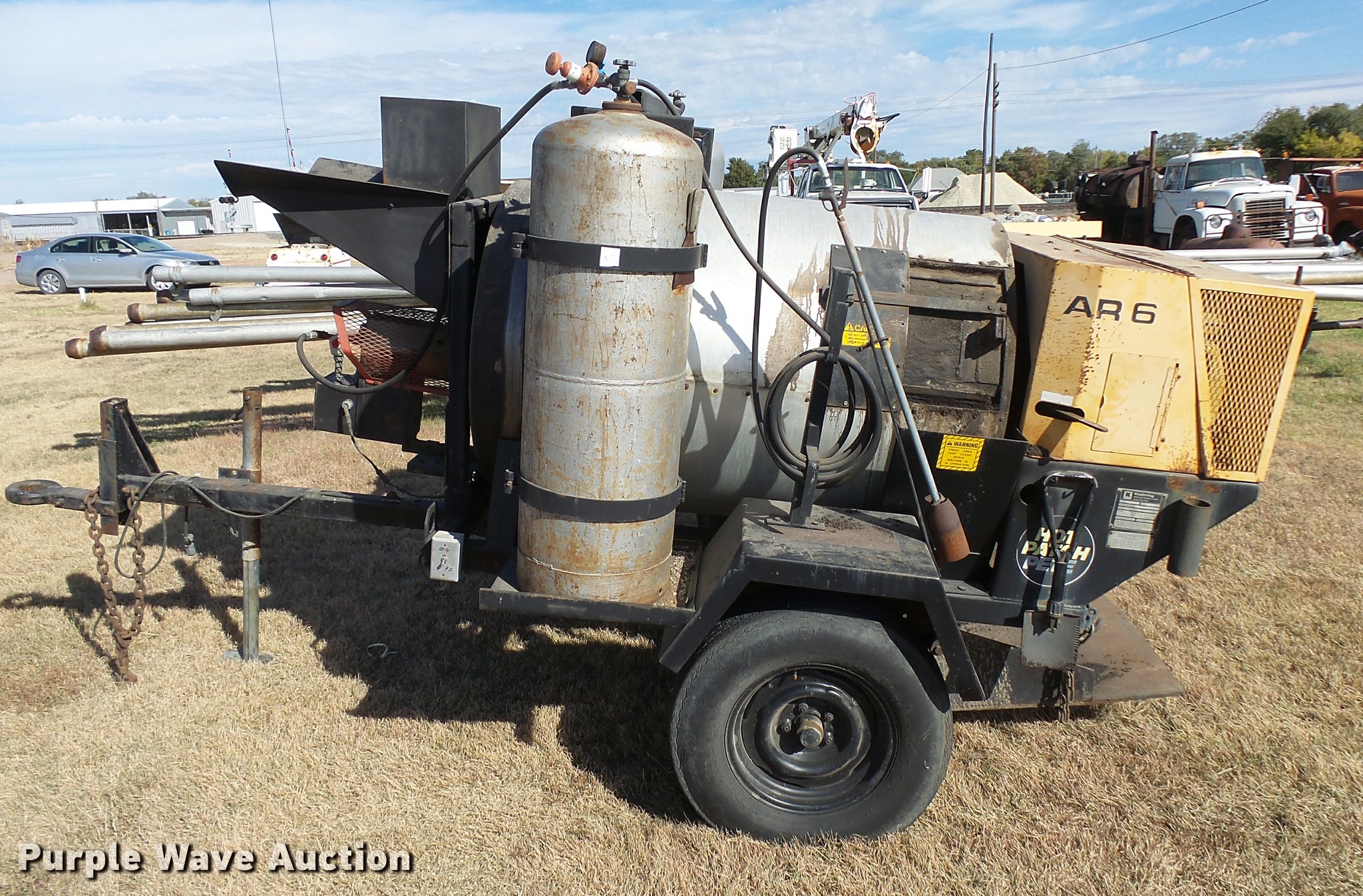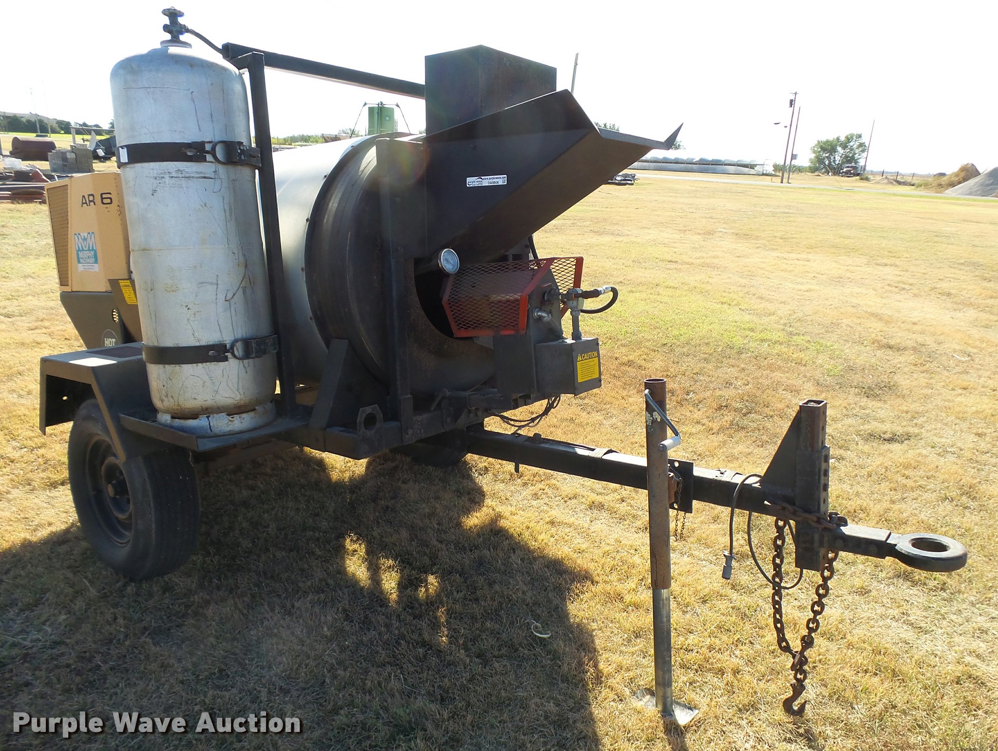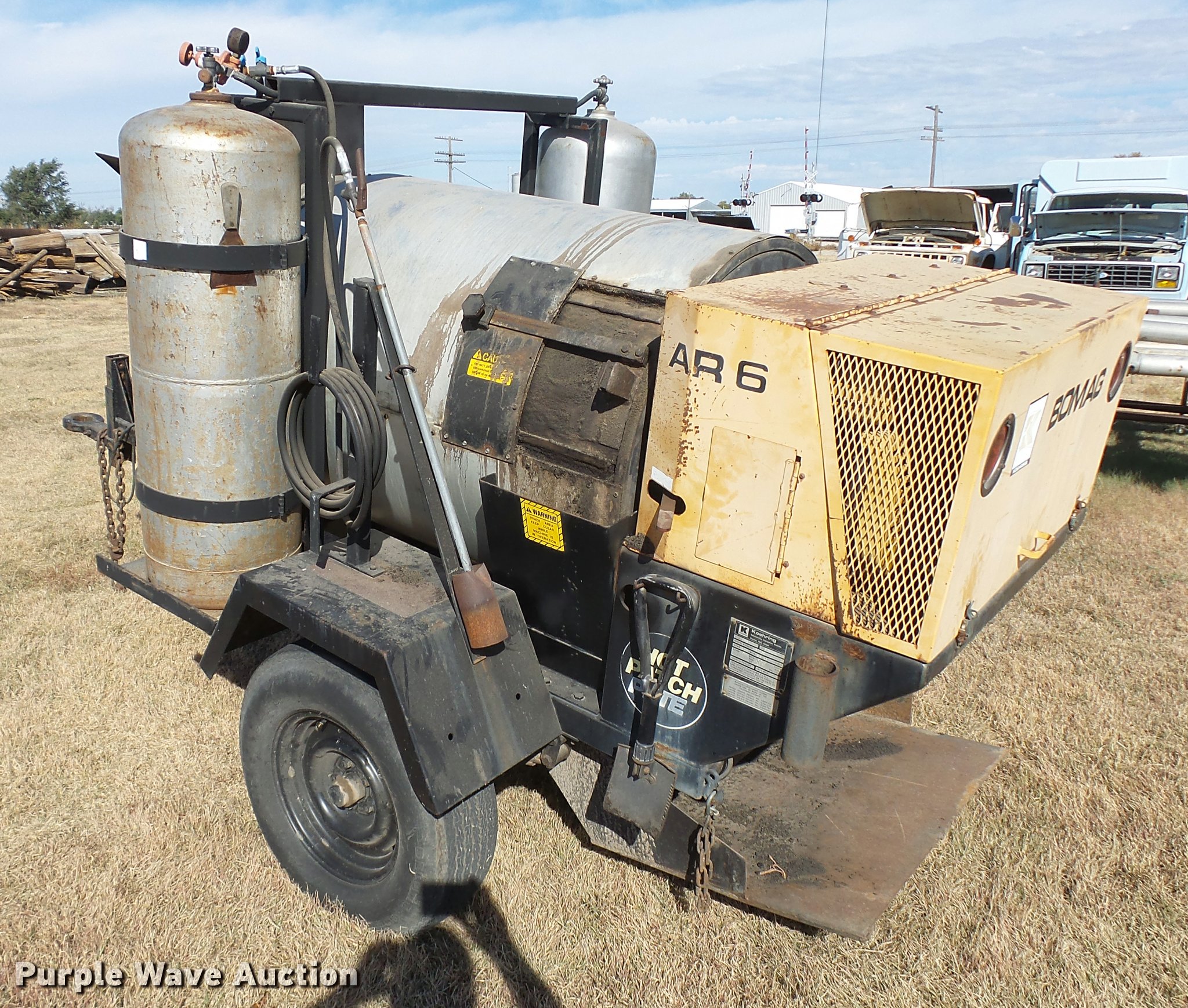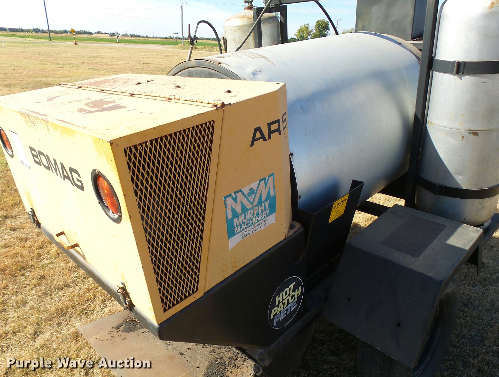 Purple Wave is selling a used Chip Spreader in Kansas. This item is a Bomag AR6 hot patch chip spreader with the following: Winsconsin gas engine, (2) 100 lbs propane bottles, Pintle hitch, 678-15 tires, Used, Serial 300238