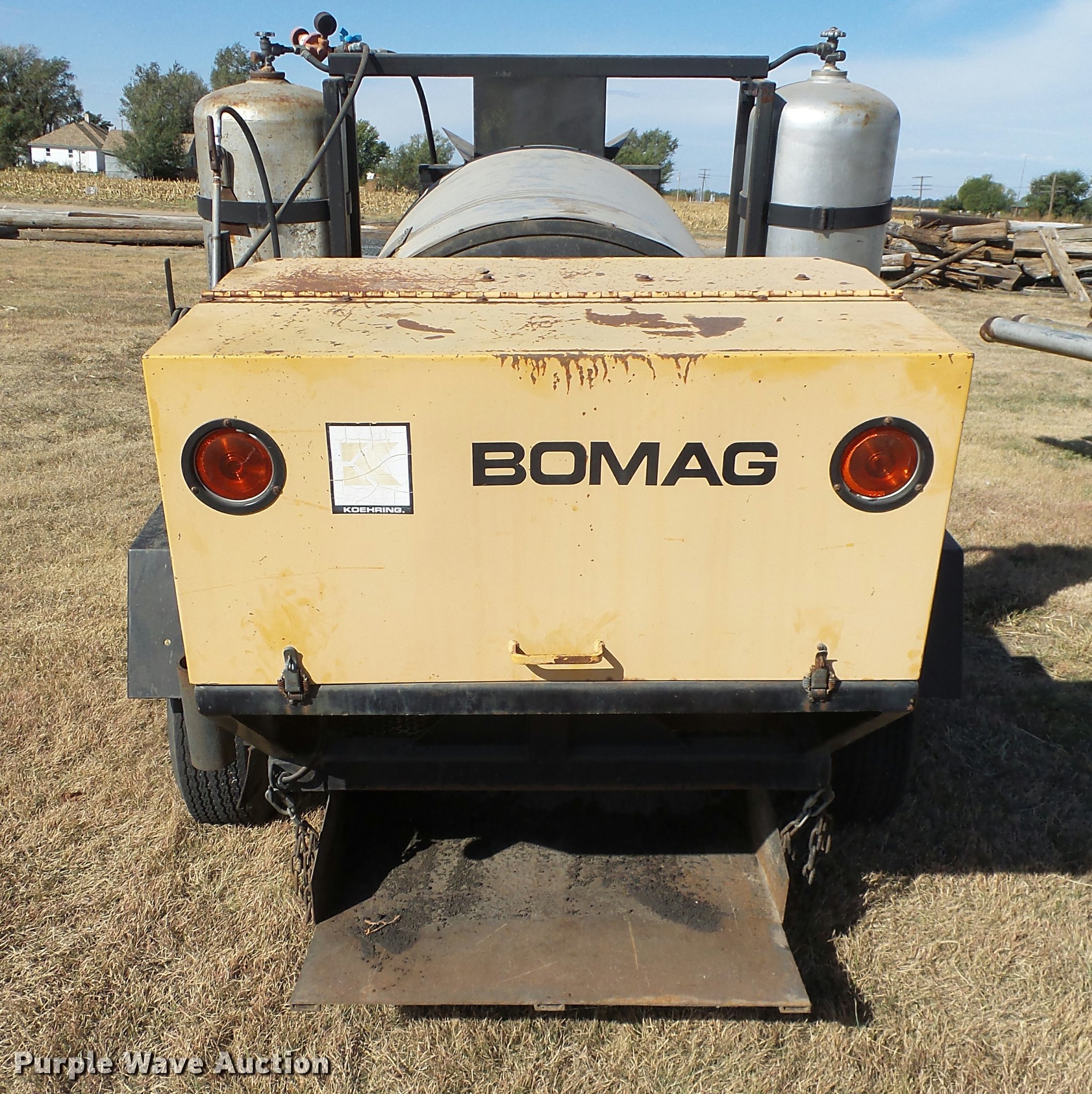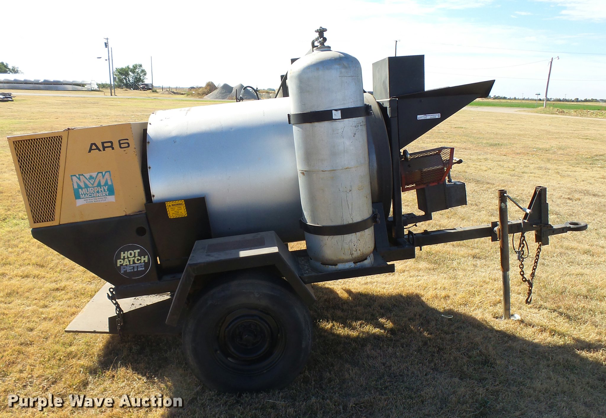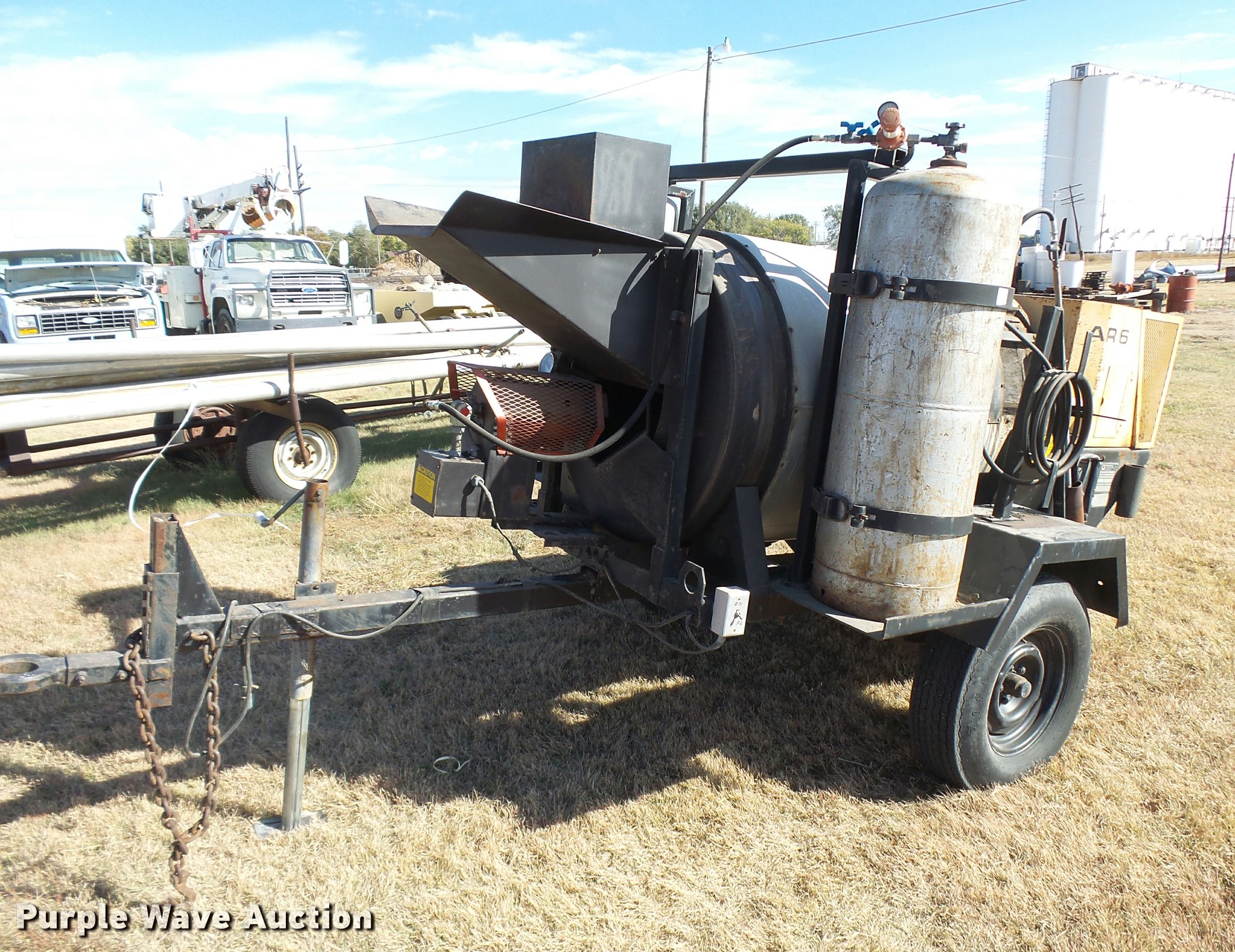 Purple Wave is selling a used Chip Spreader in Kansas. This item is a Bomag AR6 hot patch chip spreader with the following: Winsconsin gas engine, (2) 100 lbs propane bottles, Pintle hitch, 678-15 tires, Used, Serial 300238