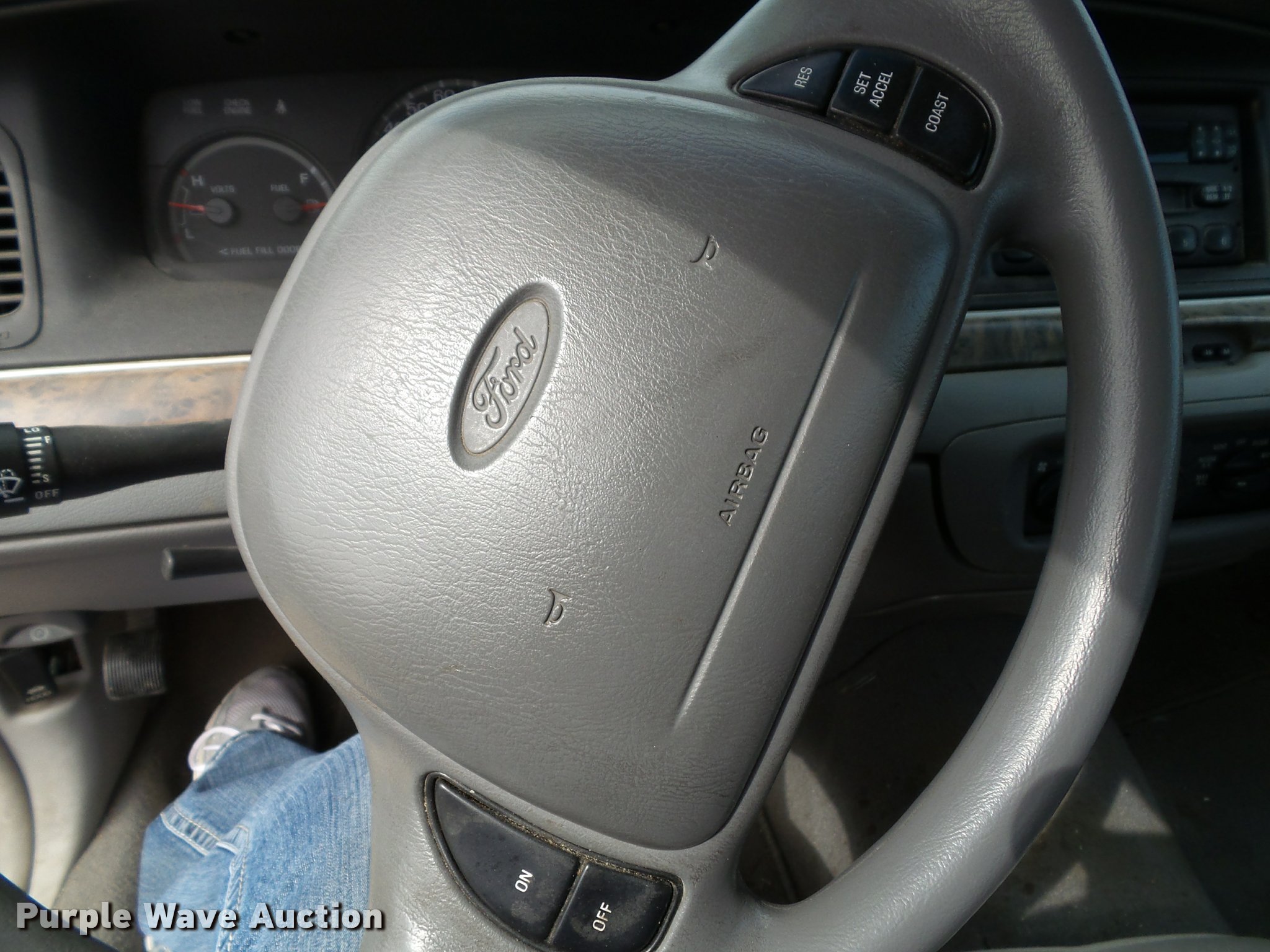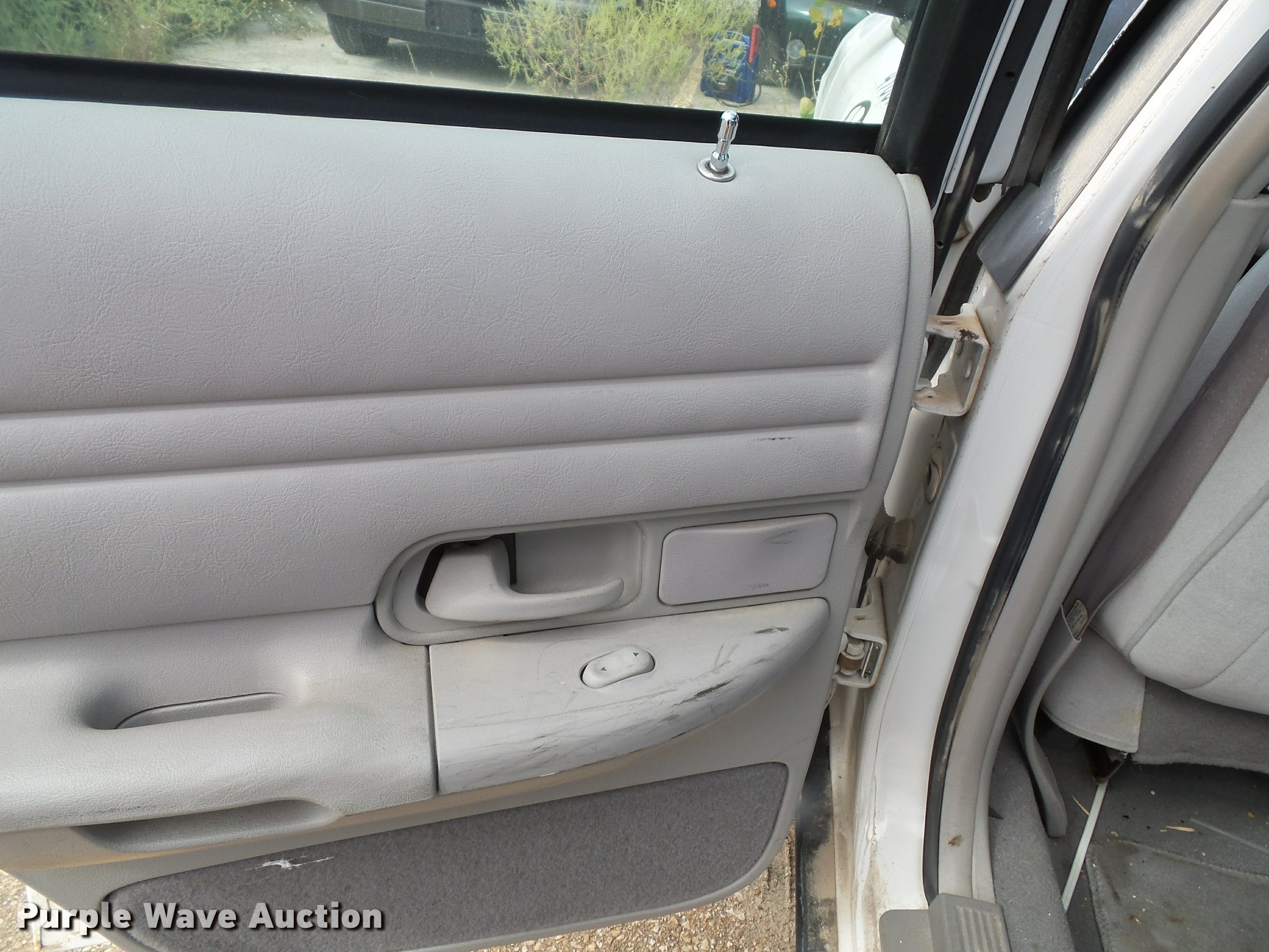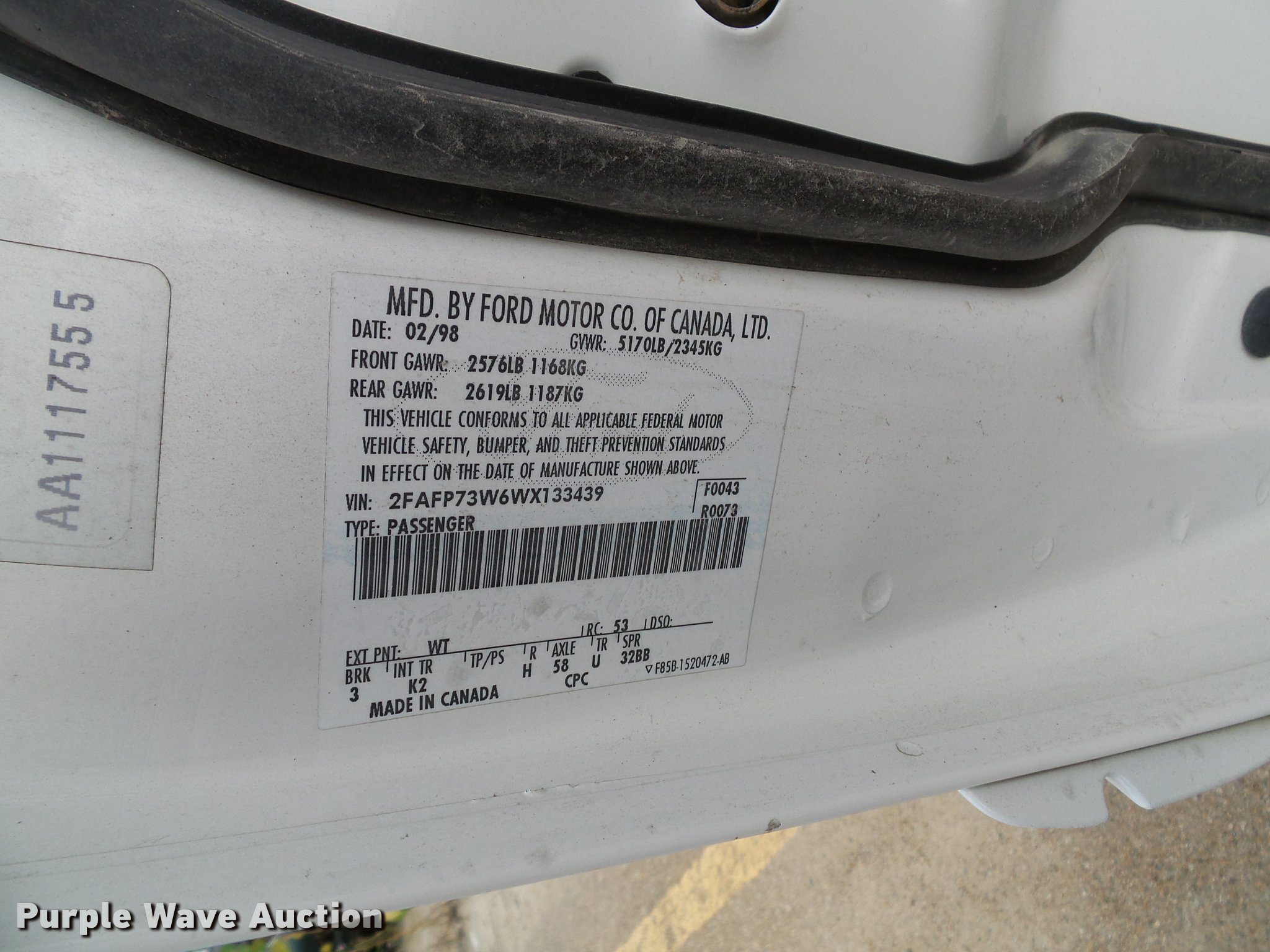 Purple Wave is selling a used Passenger Vehicle in Kansas. This item is a 1998 Ford Crown Victoria with the following: 128,939 miles on odometer, 4.6L V8 SOHC 16V gas engine, Automatic transmission, AC and heat, Tilt, Cruise, AM/FM/cassette, Power windows, locks, mirrors, and seat, Cloth interior, 225/60R16 tires, Front tires flat, Dead battery, Rust, Decals will be painted over