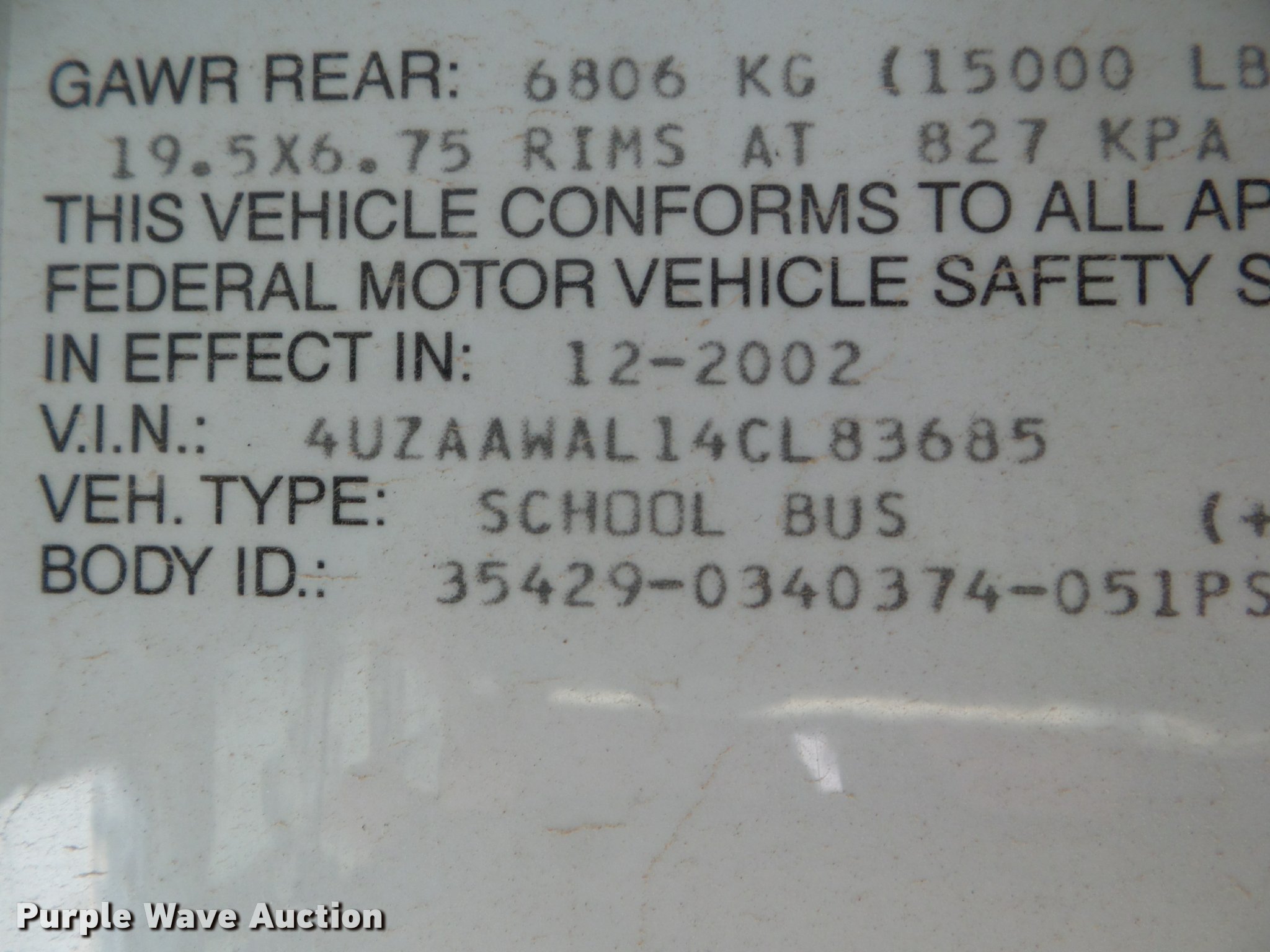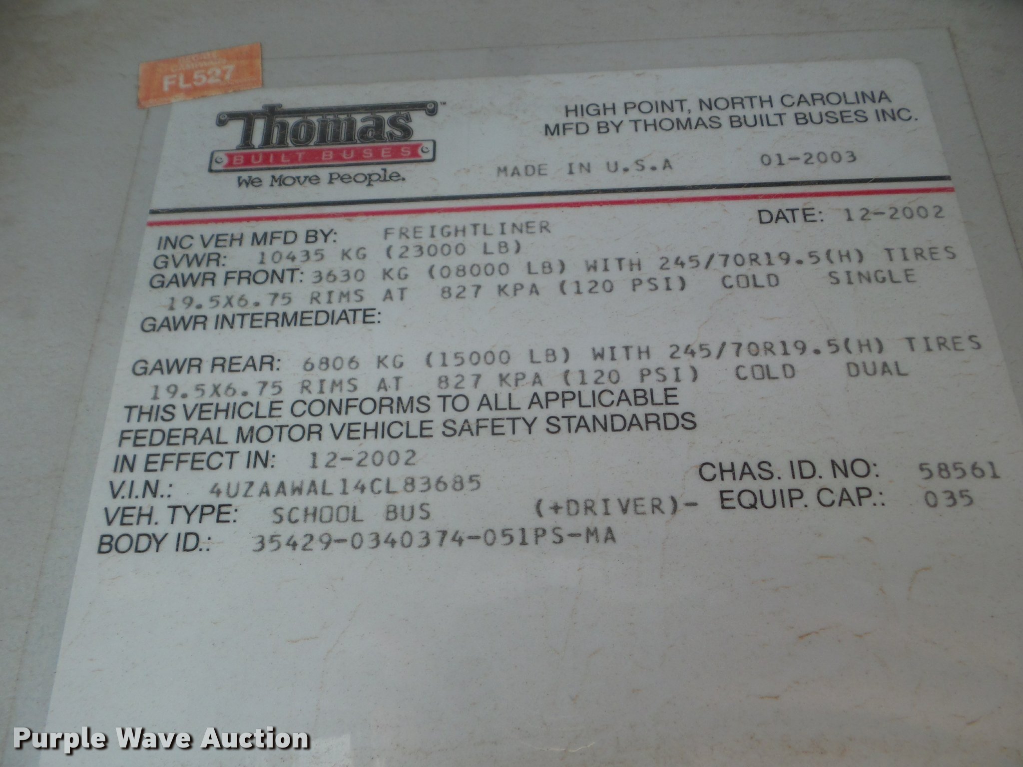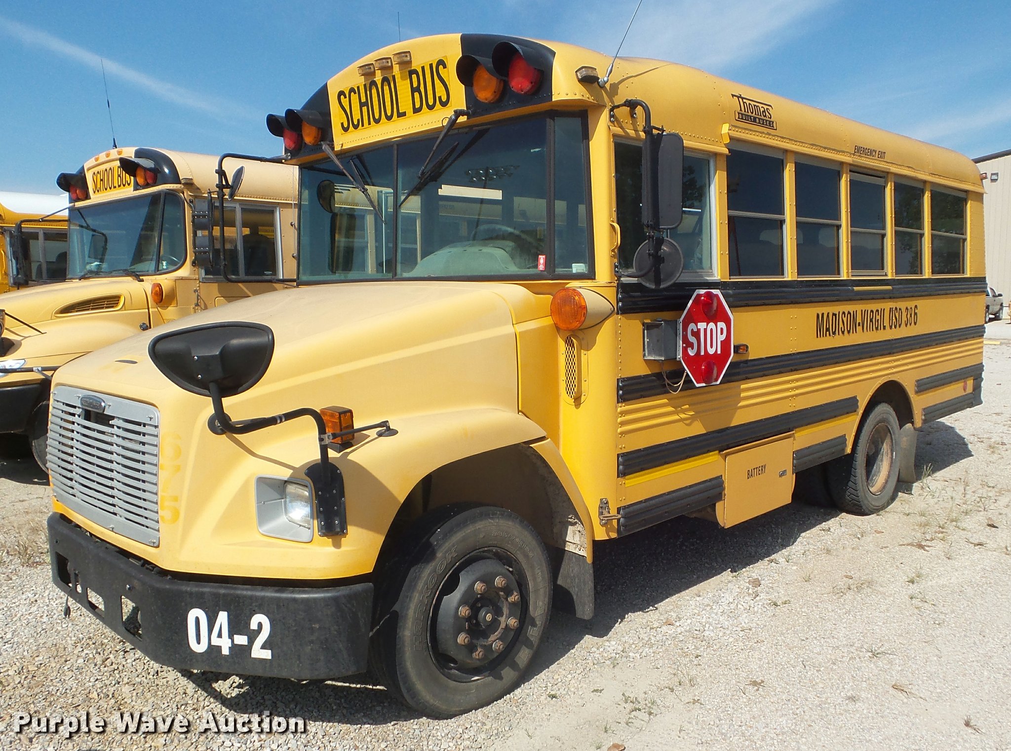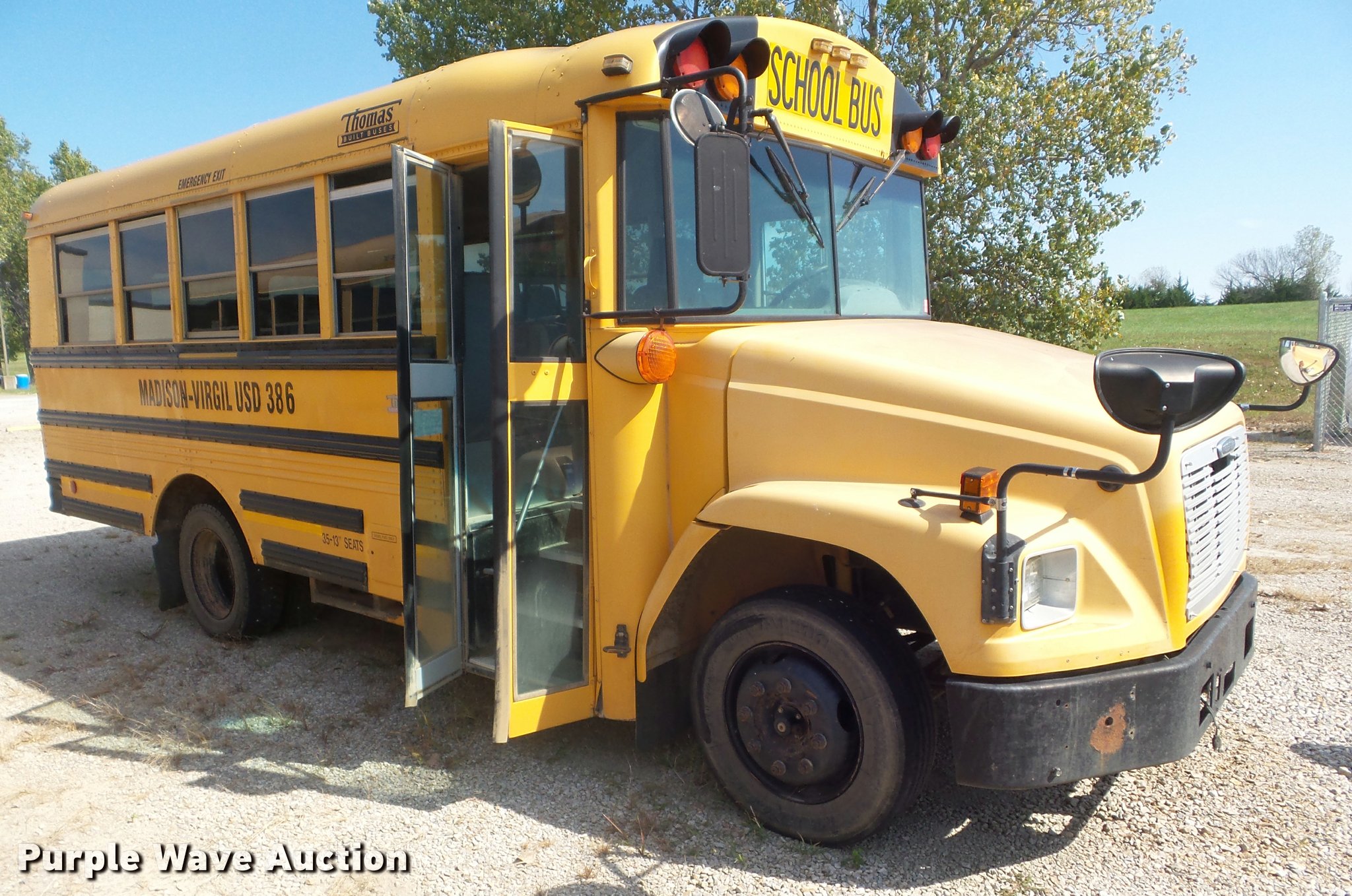 Purple Wave is selling a used Bus in Kansas. This item is a 2004 Freightliner FS65 school bus with the following: 117,954 miles on odometer, 6,093 hours on meter, Caterpillar 3126 7.2L L6 turbo diesel engine, Automatic transmission, Single axle, Heat, Cruise, AM/FM/CD, Suspension seat, 35 passenger capacity, Ceiling, rear, and side emergency egress, Lighted stop sign, Block heater, Front and rear tow hooks, Spring suspension, Hydraulic brakes, 245/70R19.5 tires, GVWR 23,000 lbs, CB not included