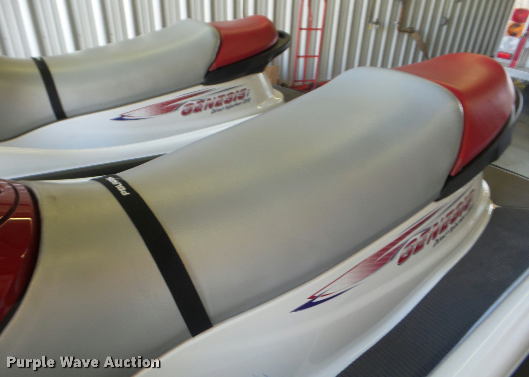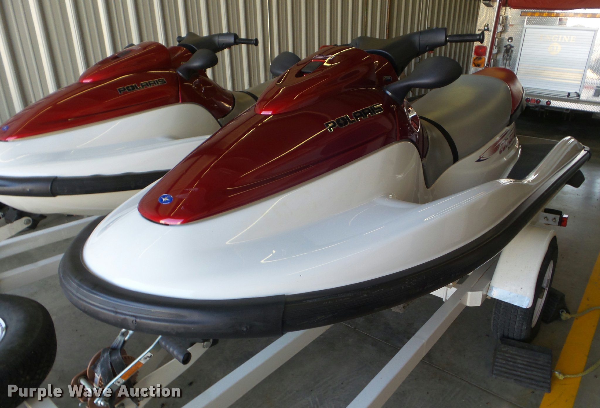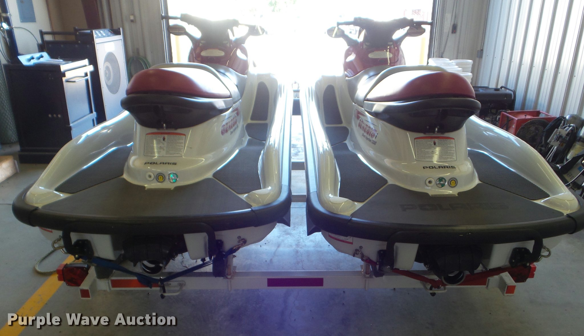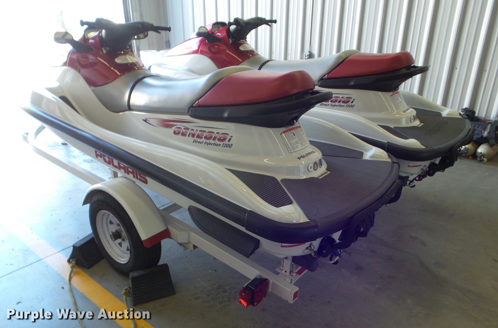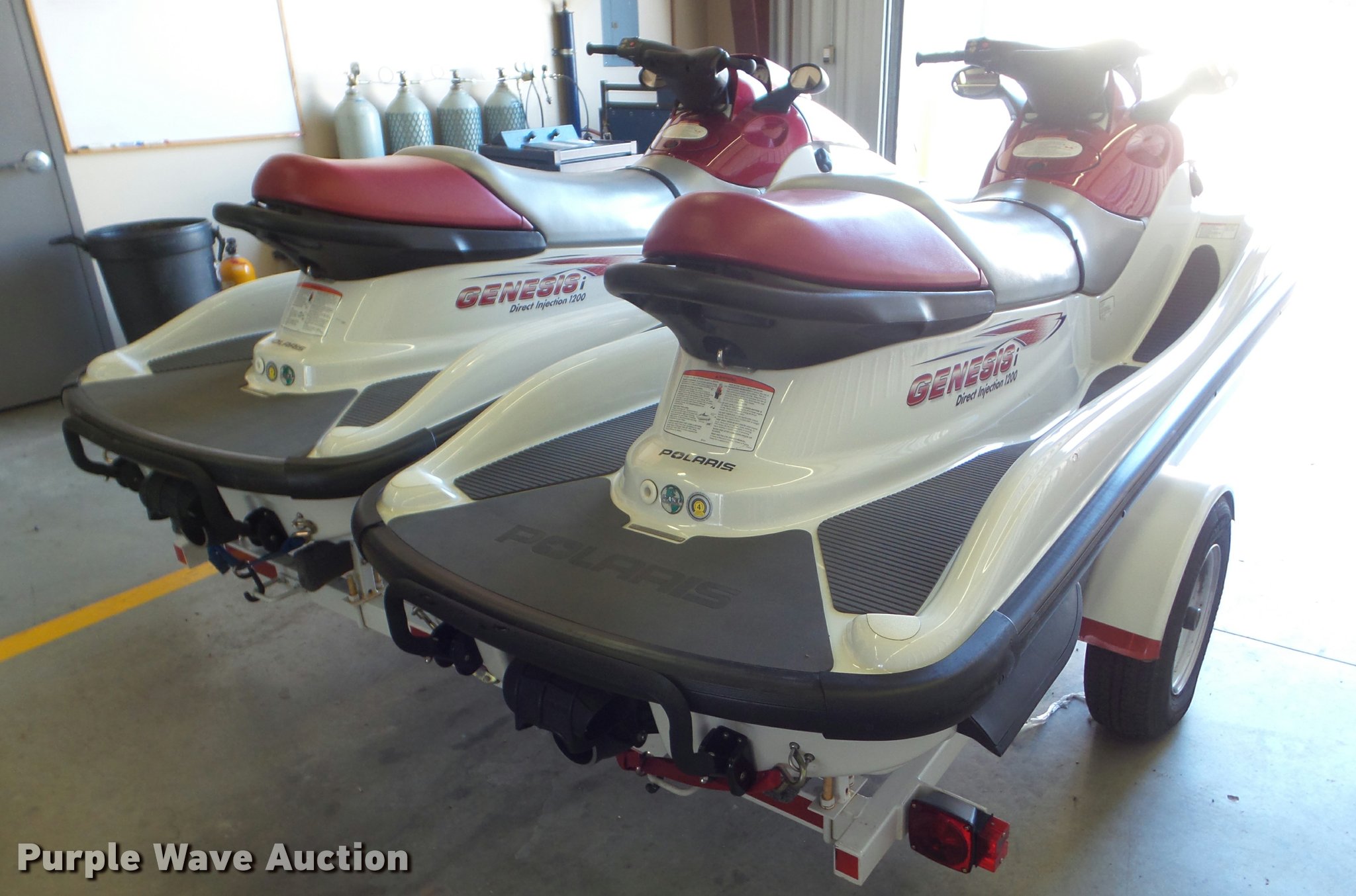 Purple Wave is selling a used Boat in Kansas. This item is a (2) 2003 Polaris Genesis I personal watercrafts with the following: 28 hours on meter for first unit, 926 hours on meter for second unit, Hour meter incorrect due to replacement of circuit board, 1,169cc gas engines, Automatic transmission, Hull IDs PLE20764I203, PLE24896A303, Trailer, 2" ball hitch, 175/80R12 tires, VIN 4RGET1212S1000381